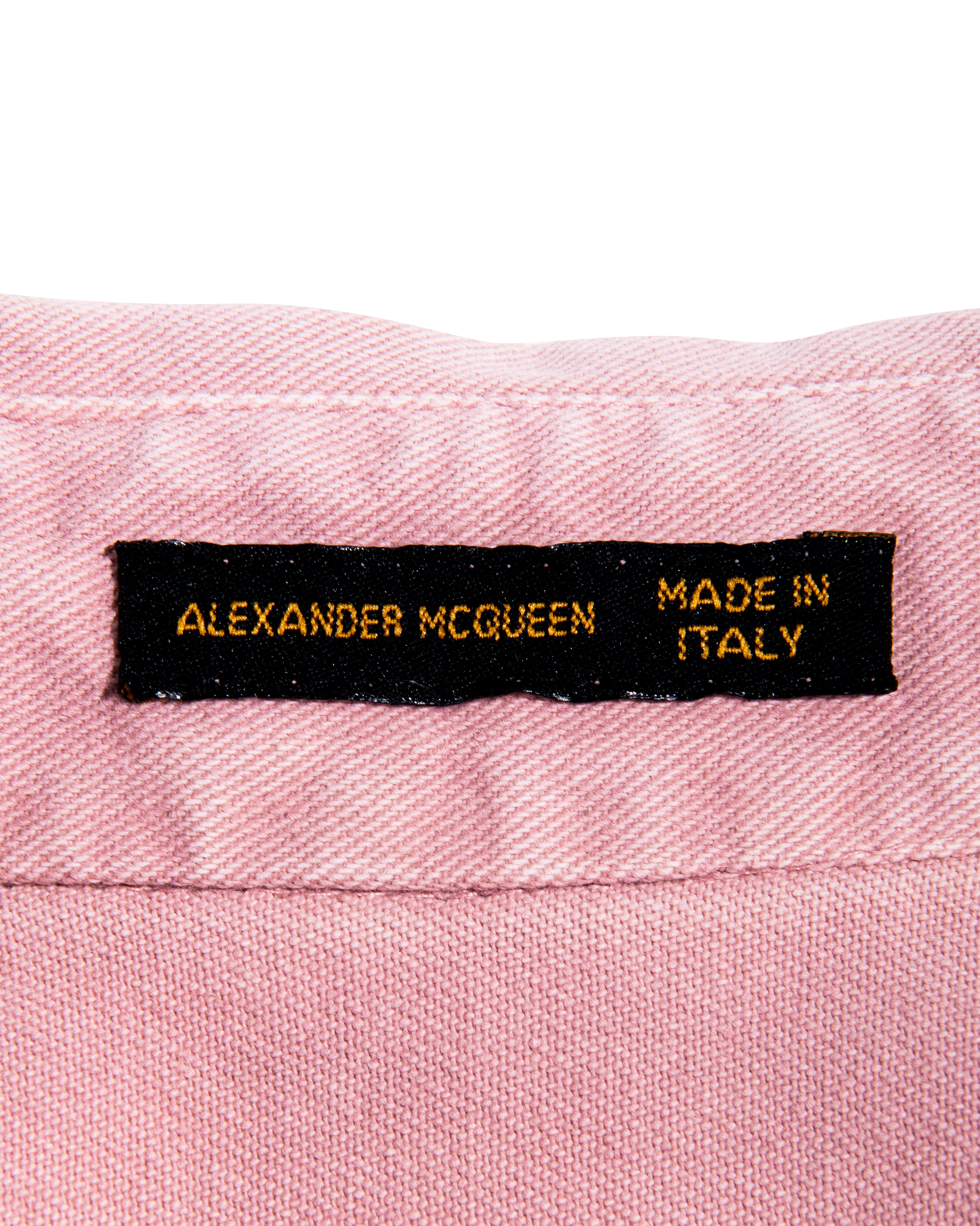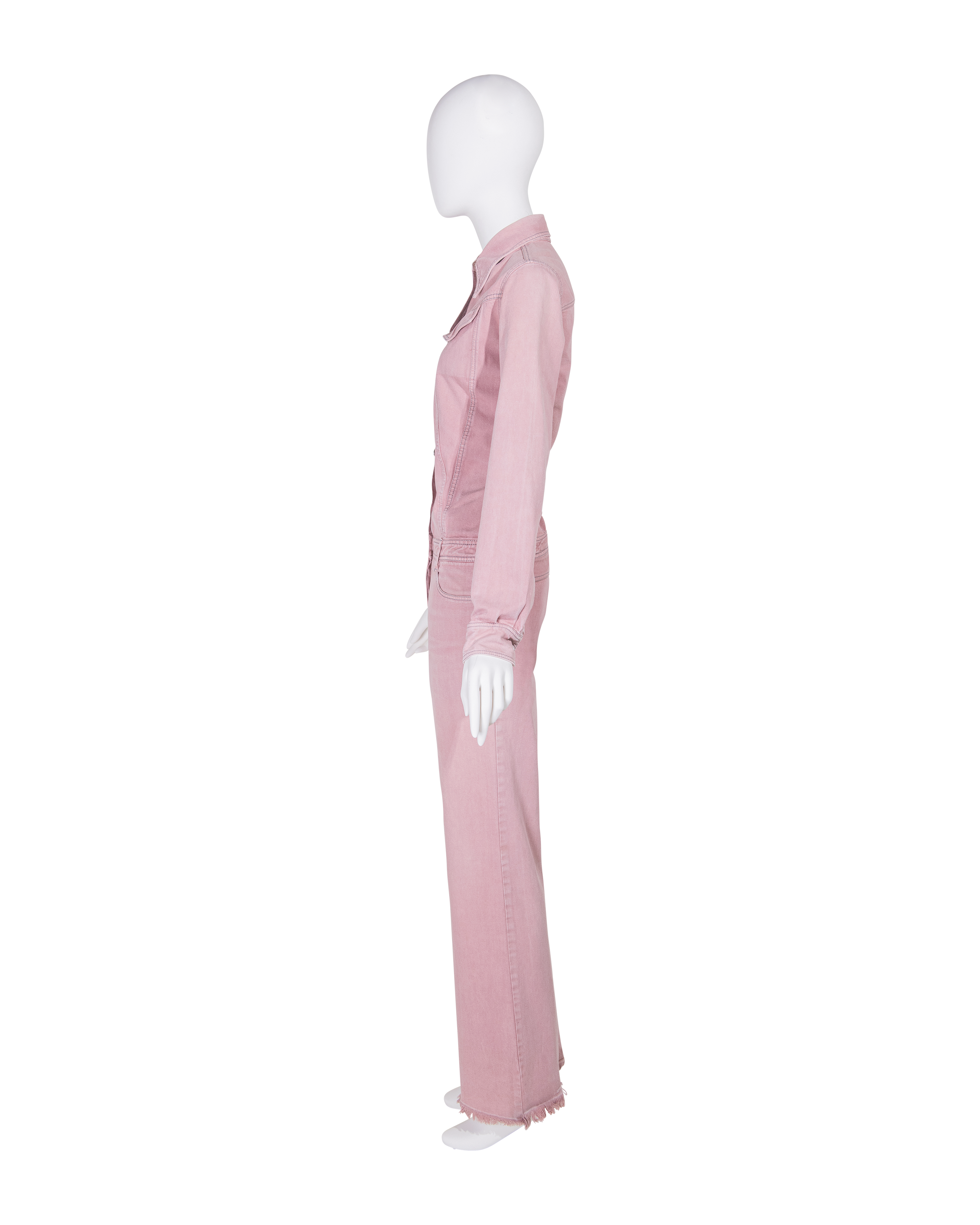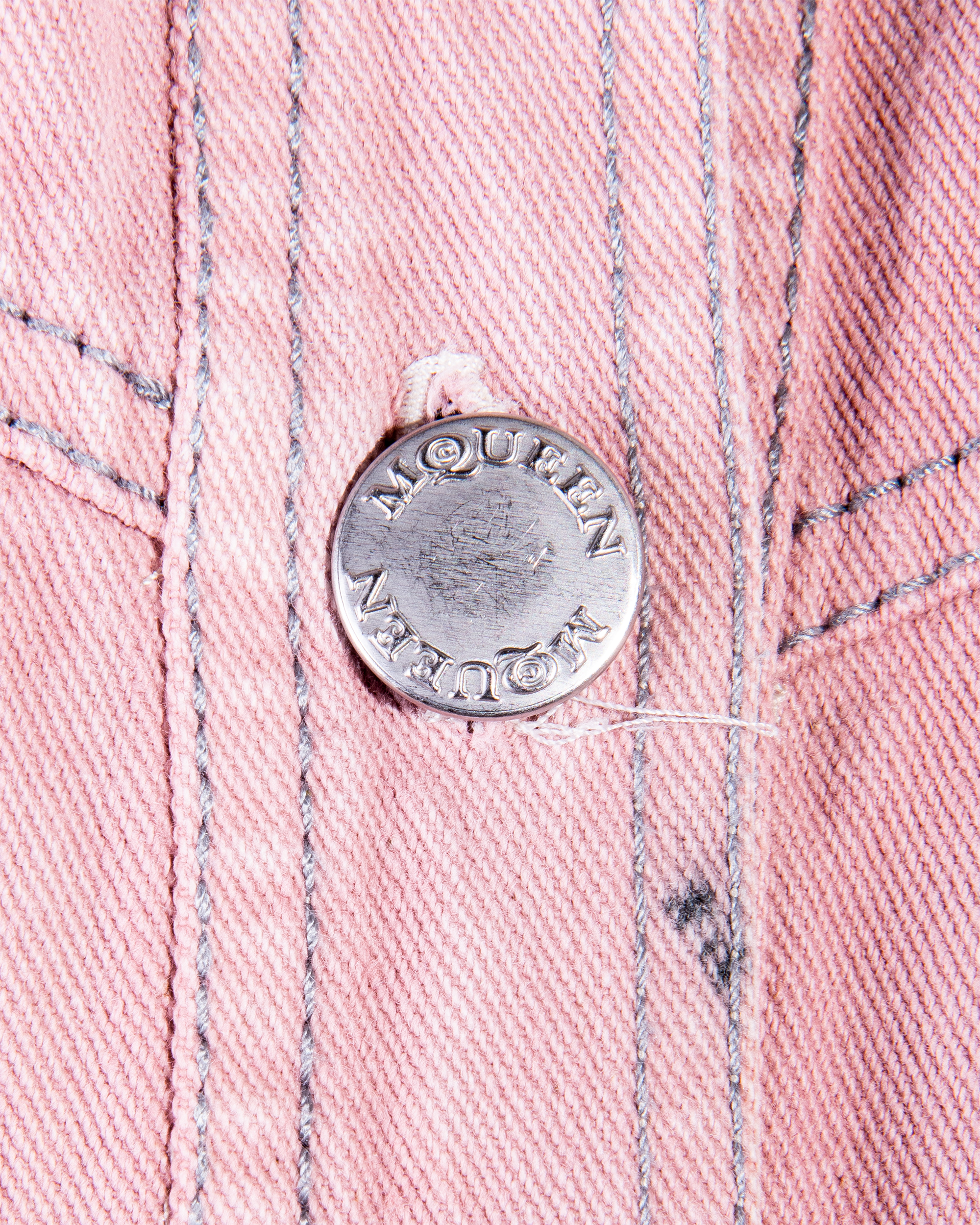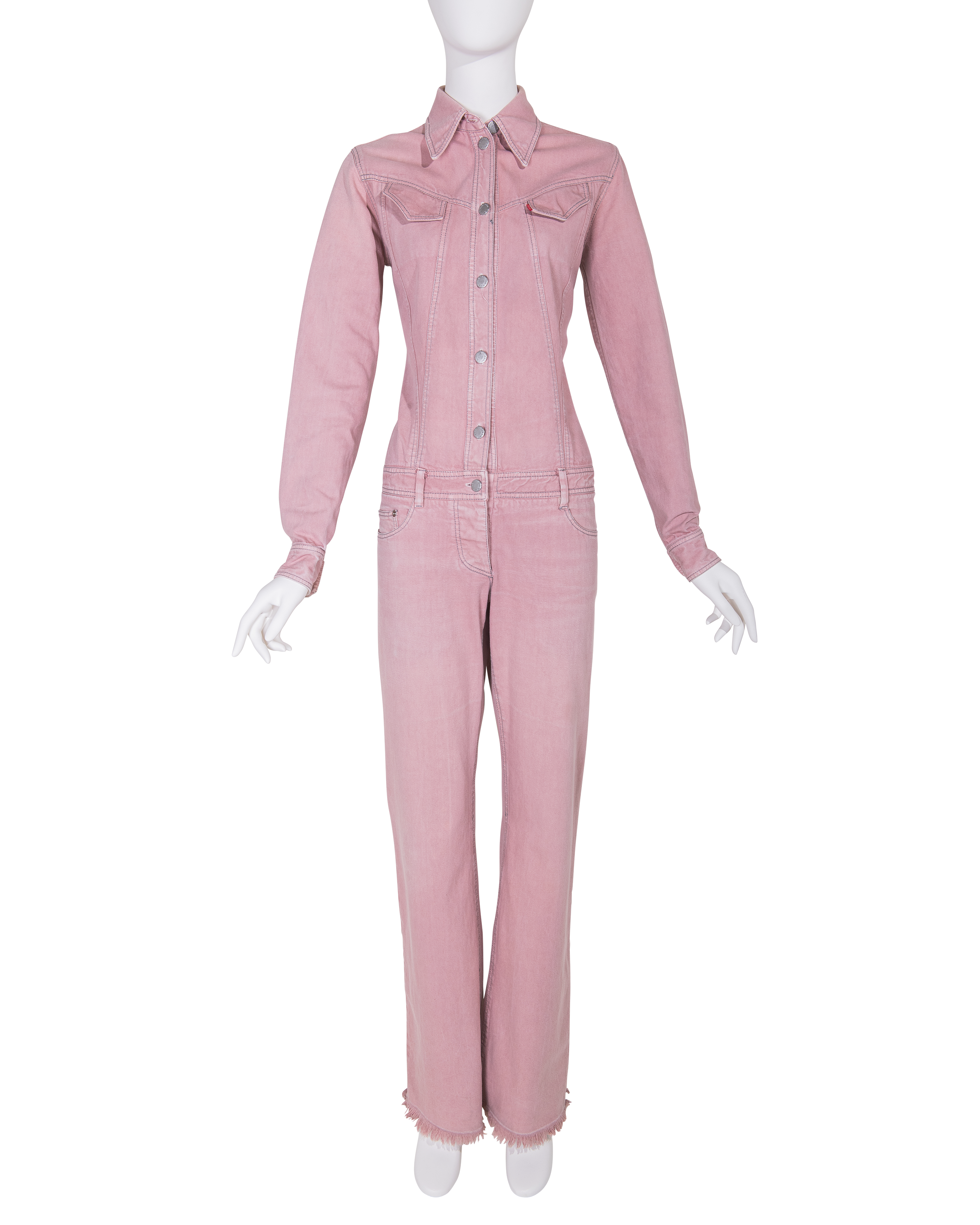 A/W 1999 Alexander McQueen by Lee Alexander McQueen "The Overlook" Collection RUNWAY SAMPLE pink denim jumpsuit. Long sleeve collared denim jumpsuit in pale baby pink, with intentionally frayed, unfinished hemline. Drop-waist design with silver-tone stamped 'McQueen' button closures. Contrasting light gray stitching throughout. As seen on the runway (Look 15). Has been taken to couture cleaner and arrives ready to wear. In good vintage condition with spotting throughout (likely intentional to design); small split at base of crotch; has been taken to couture cleaner and arrives ready to wear.