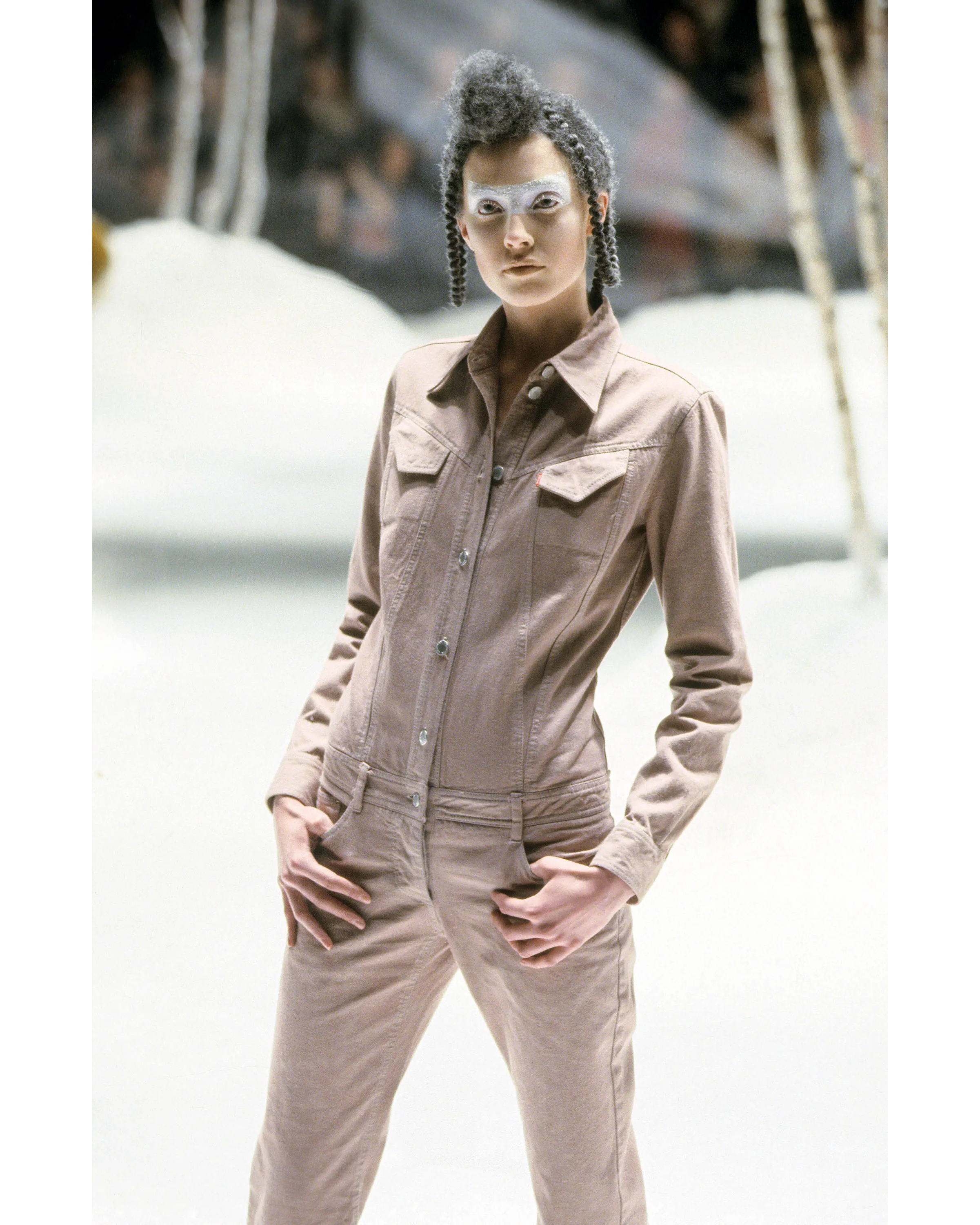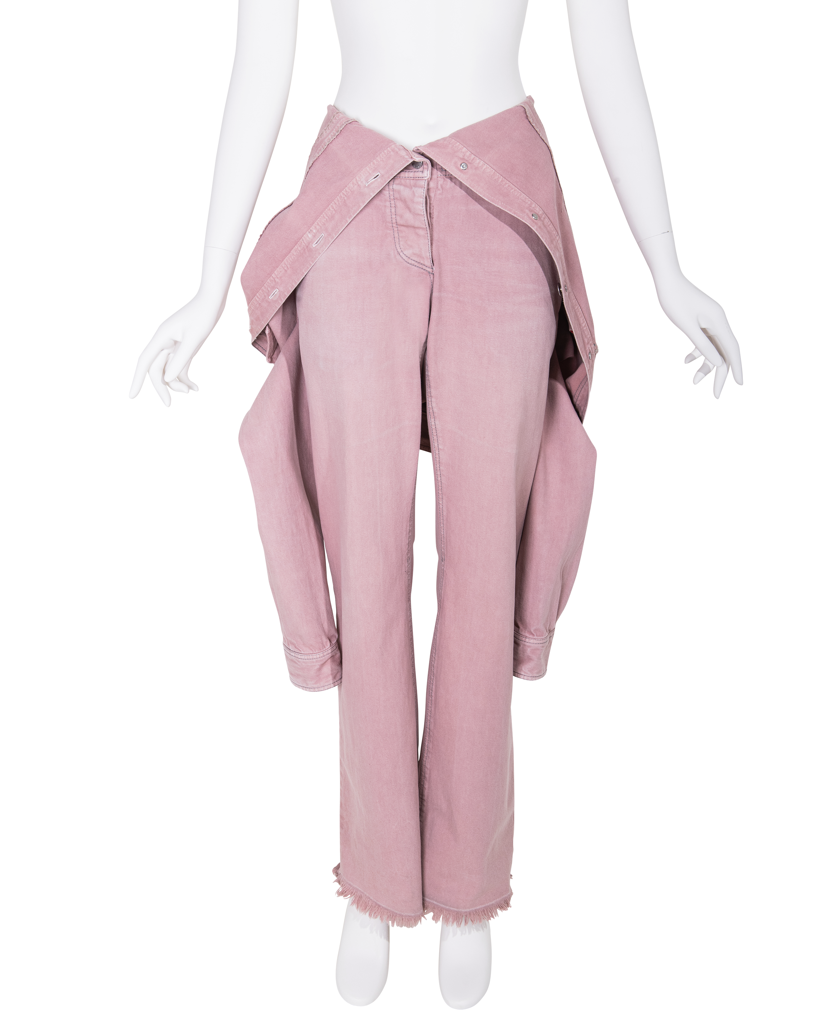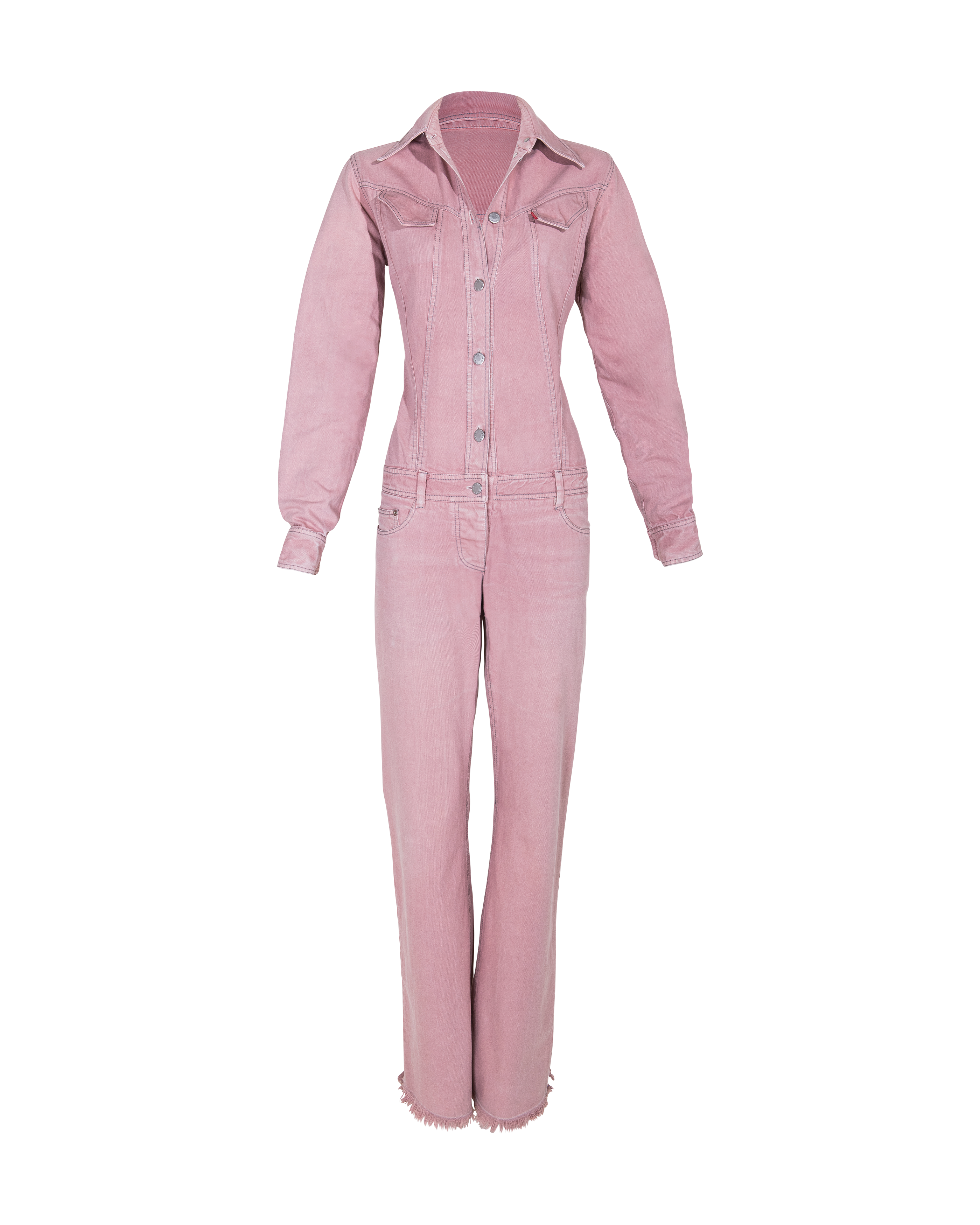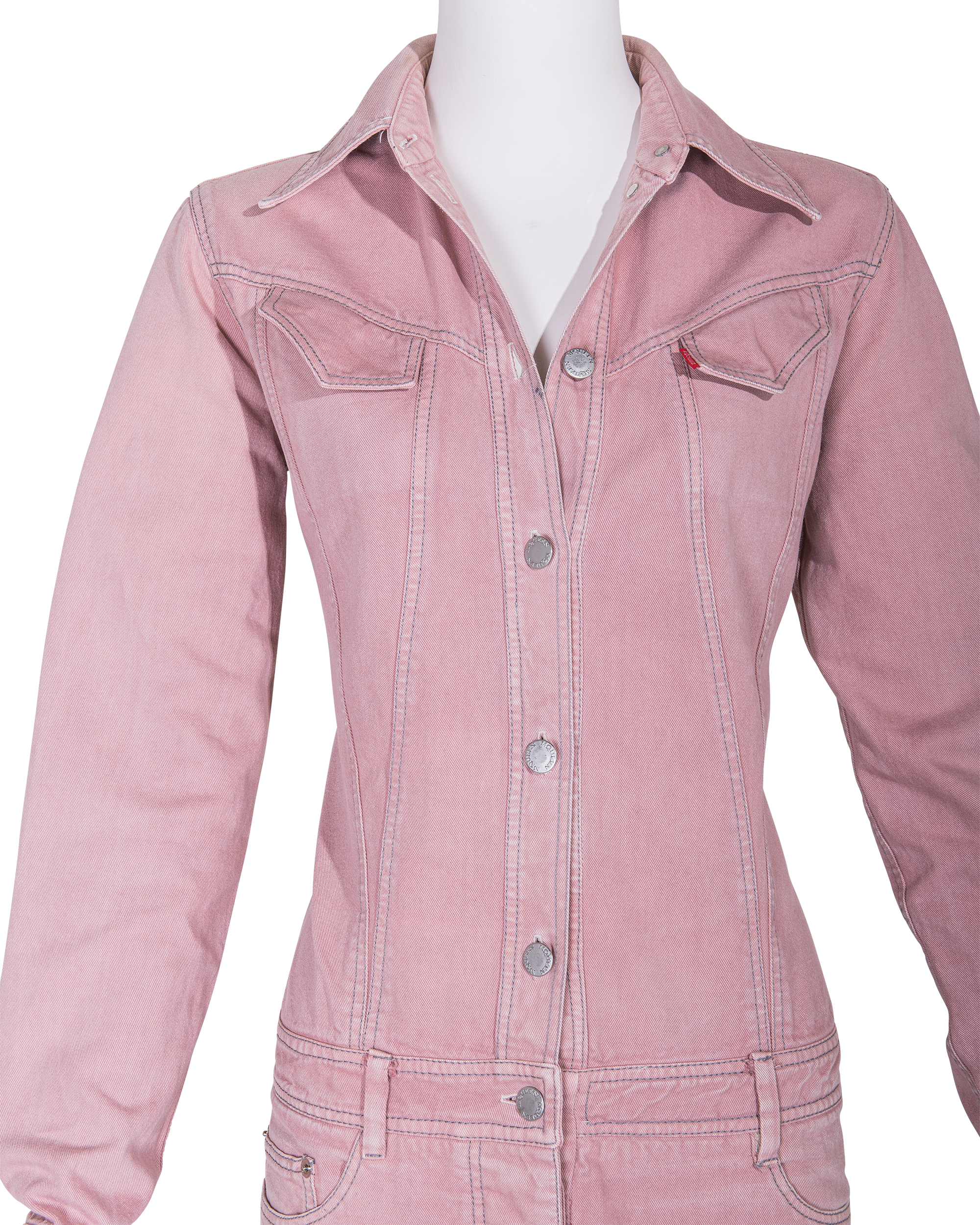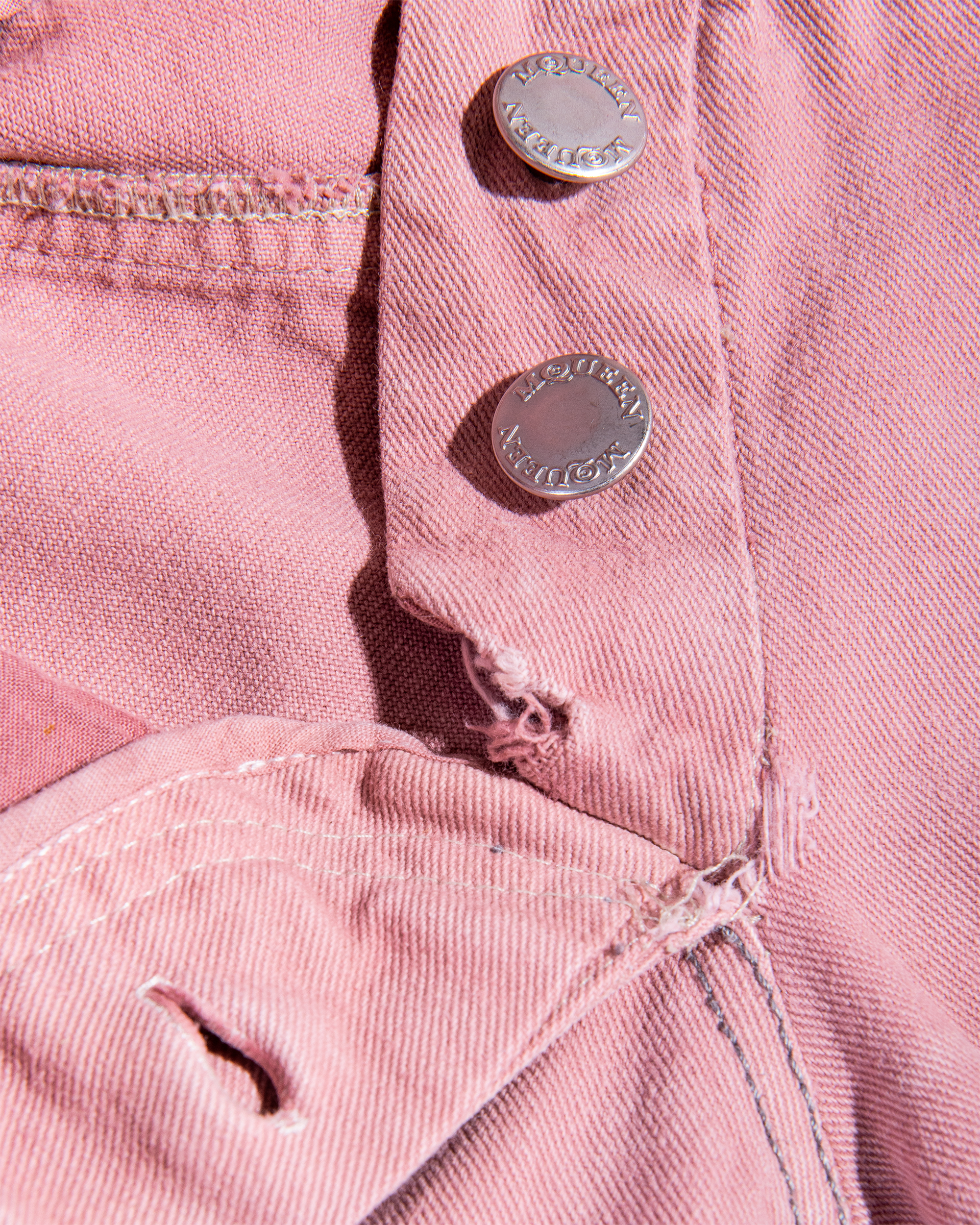 A/W 1999 Alexander McQueen by Lee Alexander McQueen "The Overlook" Collection RUNWAY SAMPLE pink denim jumpsuit. Long sleeve collared denim jumpsuit in pale baby pink, with intentionally frayed, unfinished hemline. Drop-waist design with silver-tone stamped 'McQueen' button closures. Contrasting light gray stitching throughout. As seen on the runway (Look 15). Has been taken to couture cleaner and arrives ready to wear. In good vintage condition with spotting throughout (likely intentional to design); small split at base of crotch; has been taken to couture cleaner and arrives ready to wear.