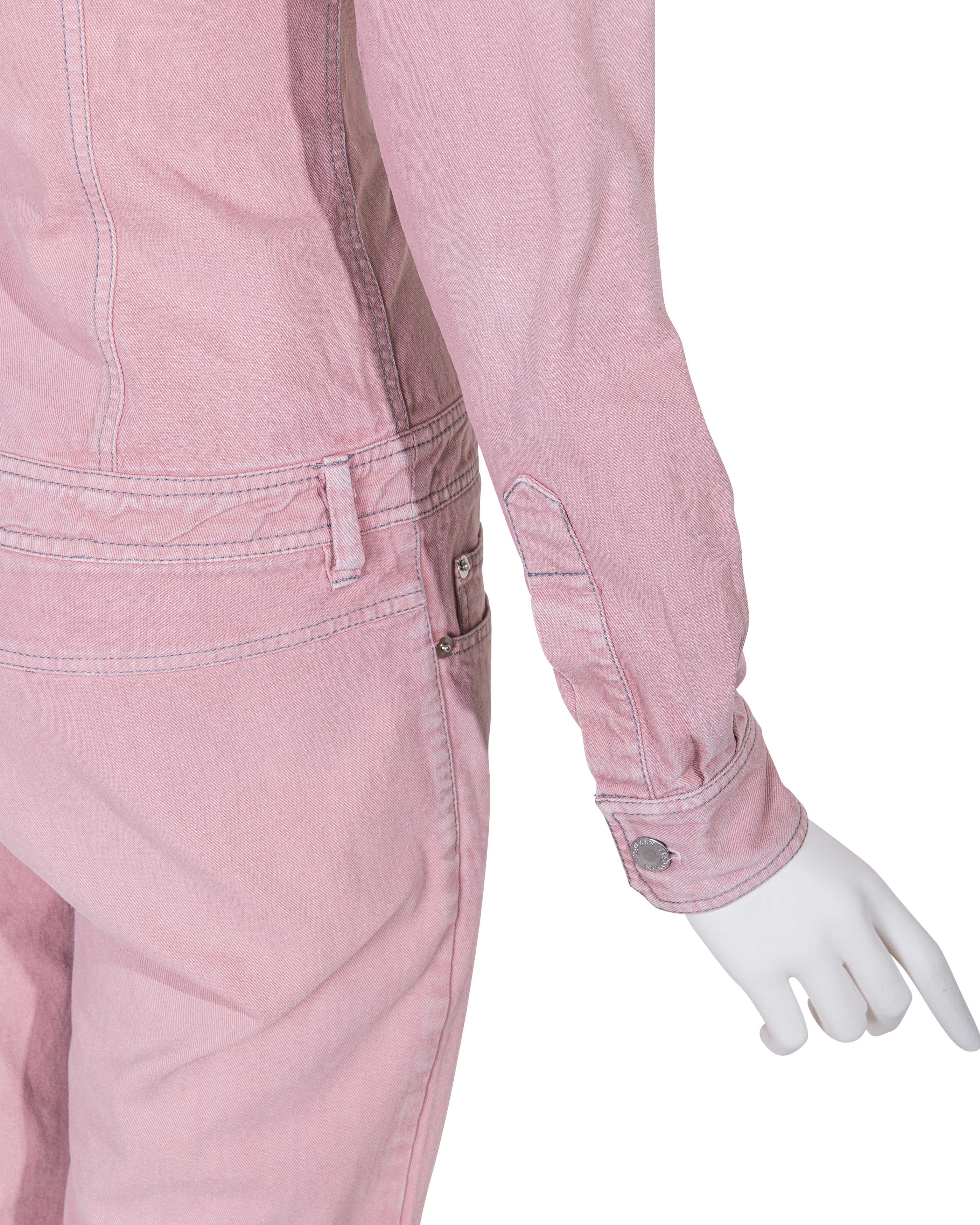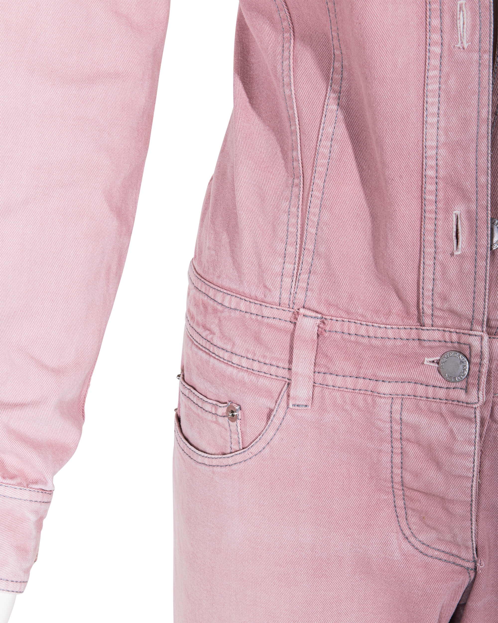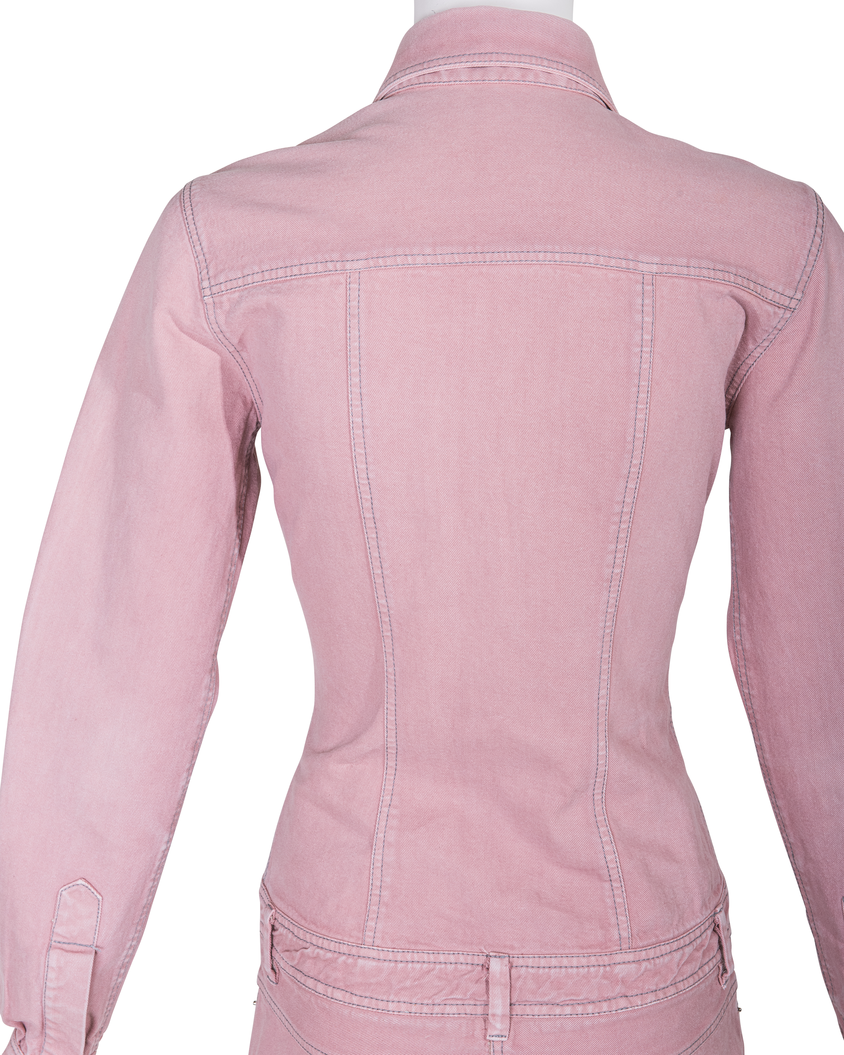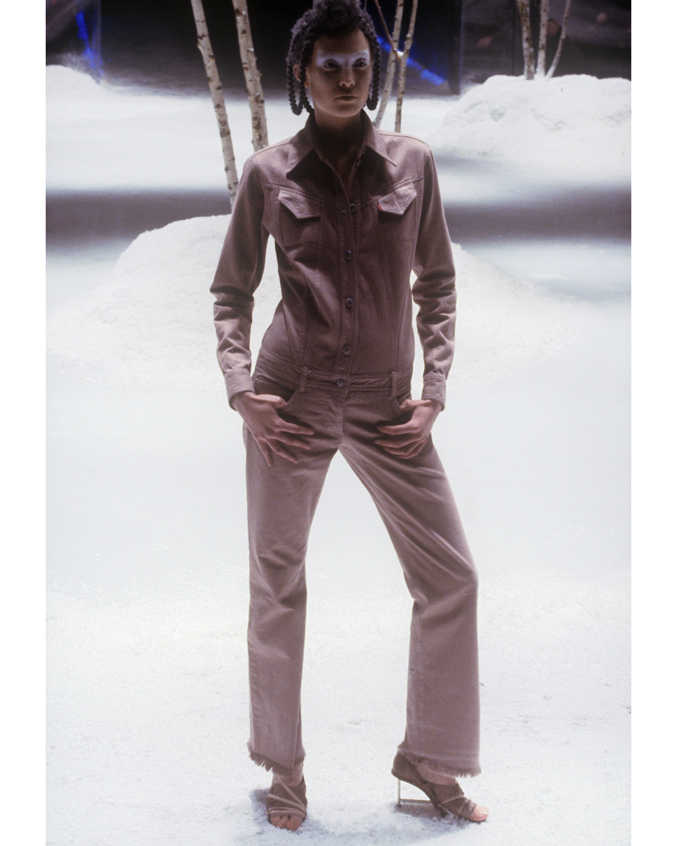 A/W 1999 Alexander McQueen by Lee Alexander McQueen "The Overlook" Collection RUNWAY SAMPLE pink denim jumpsuit. Long sleeve collared denim jumpsuit in pale baby pink, with intentionally frayed, unfinished hemline. Drop-waist design with silver-tone stamped 'McQueen' button closures. Contrasting light gray stitching throughout. As seen on the runway (Look 15). Has been taken to couture cleaner and arrives ready to wear. In good vintage condition with spotting throughout (likely intentional to design); small split at base of crotch; has been taken to couture cleaner and arrives ready to wear.