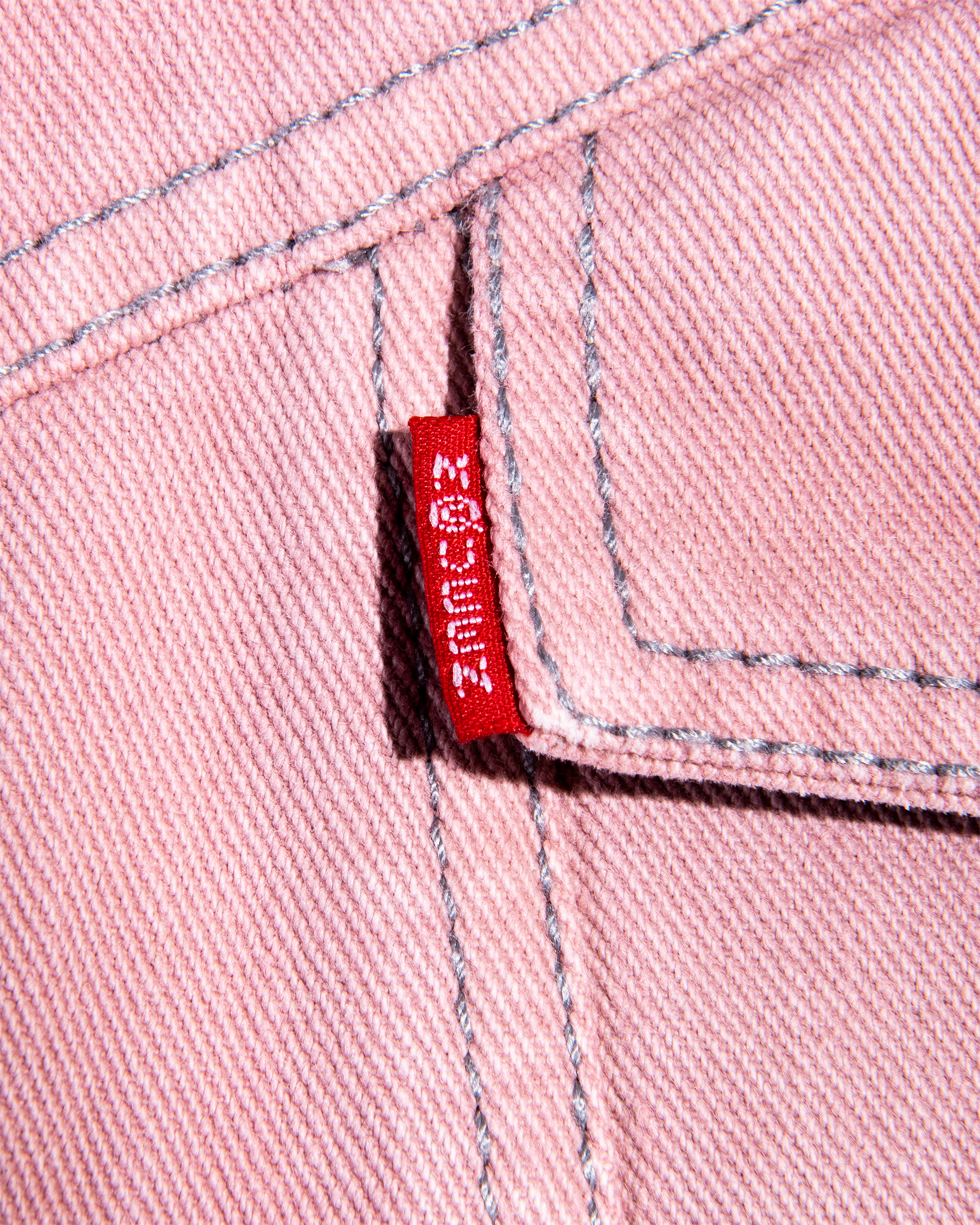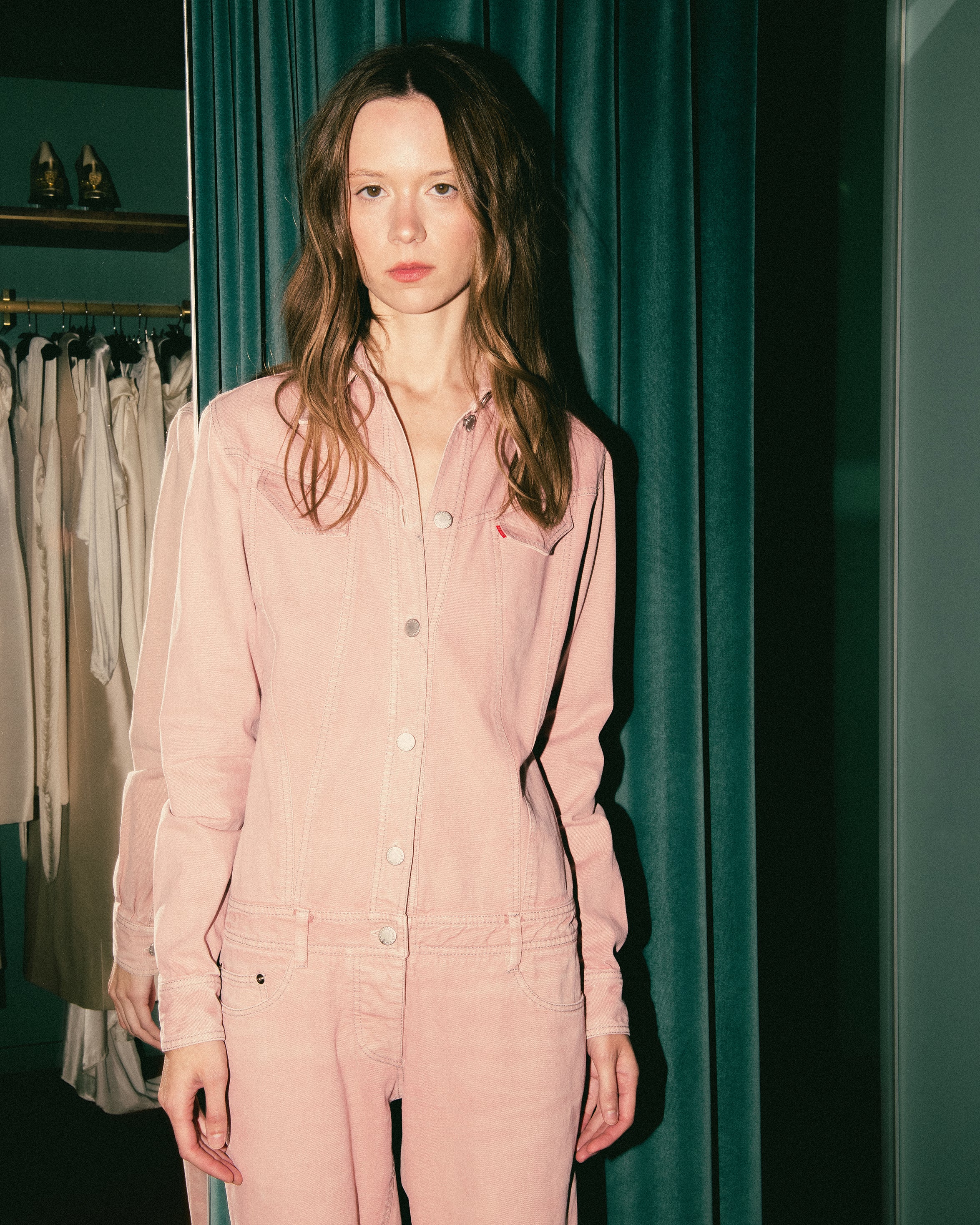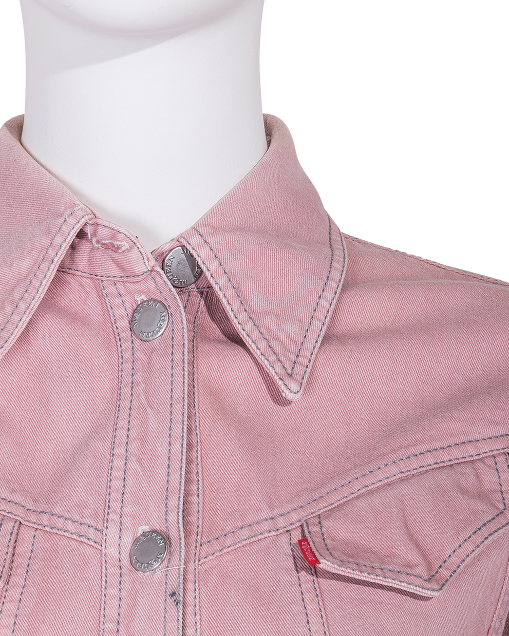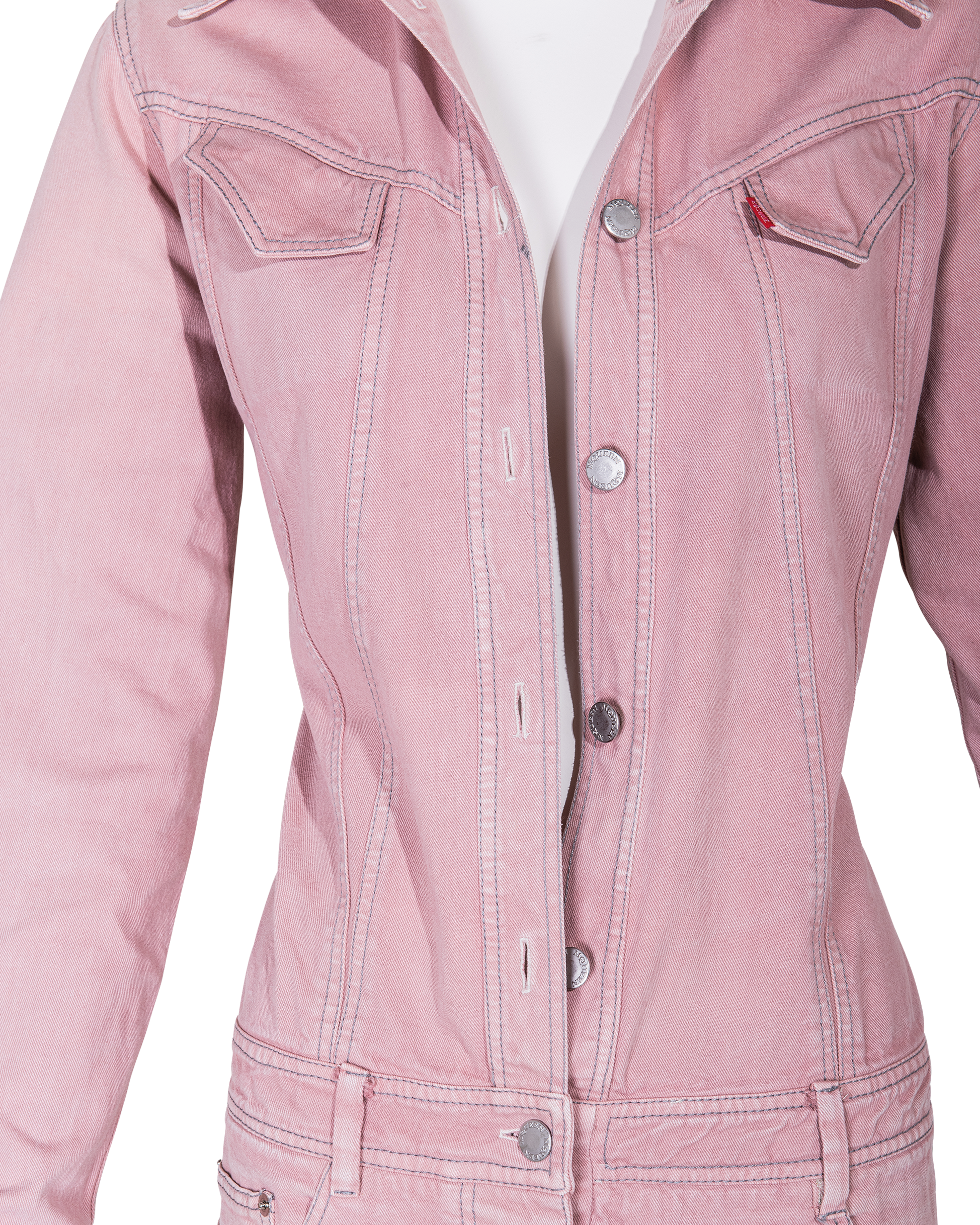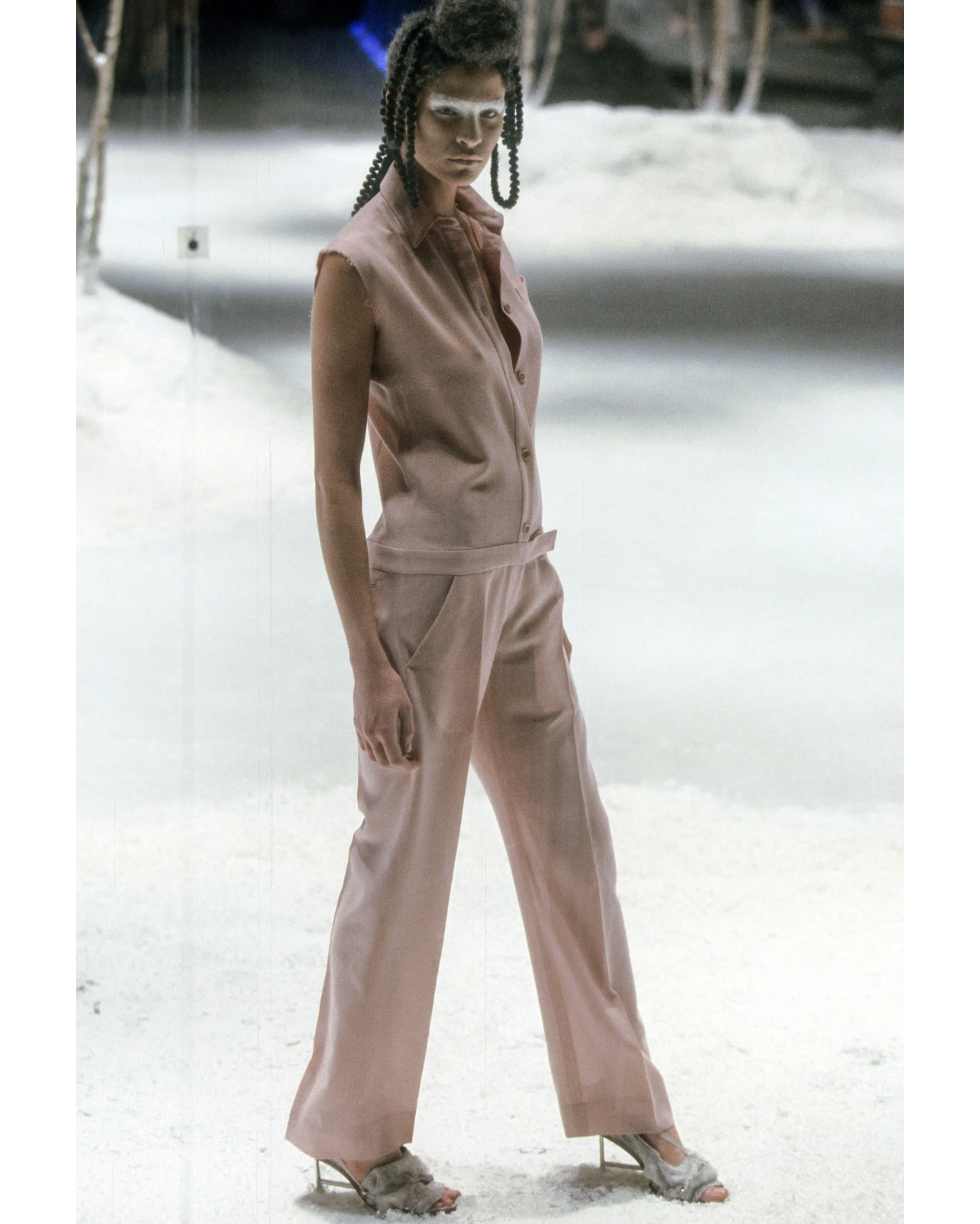 A/W 1999 Alexander McQueen by Lee Alexander McQueen "The Overlook" Collection RUNWAY SAMPLE pink denim jumpsuit. Long sleeve collared denim jumpsuit in pale baby pink, with intentionally frayed, unfinished hemline. Drop-waist design with silver-tone stamped 'McQueen' button closures. Contrasting light gray stitching throughout. As seen on the runway (Look 15). Has been taken to couture cleaner and arrives ready to wear. In good vintage condition with spotting throughout (likely intentional to design); small split at base of crotch; has been taken to couture cleaner and arrives ready to wear.