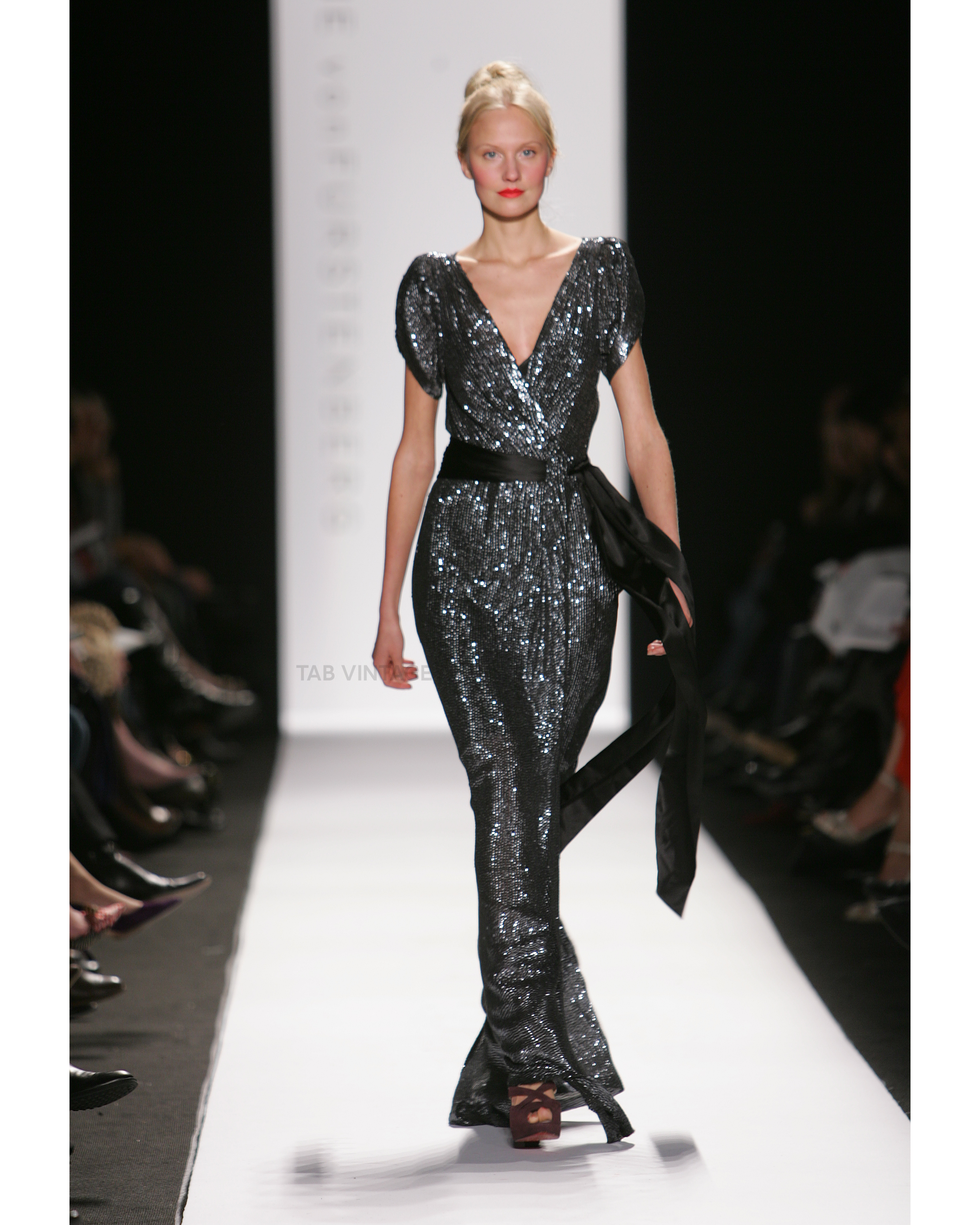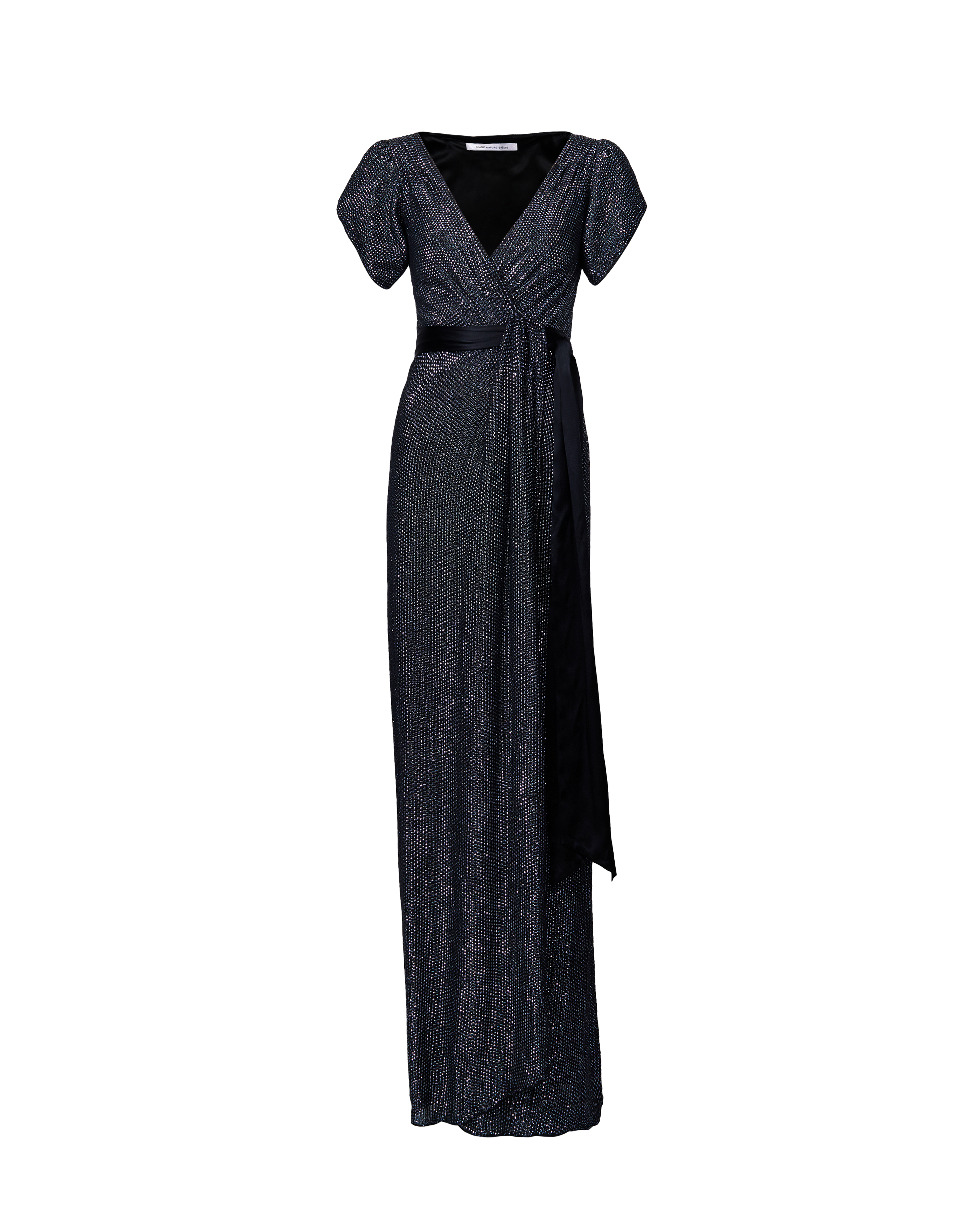 A/W 2006 Diane von Furstenberg deep navy fully embellished wrap gown. Short sleeve 'Antoinette' embellished gown with long silk ties for wrap construction when worn. Hand-embellished with metallic silver-blue raised sequins. Fabric Contents: 100% Silk with 95% Silk and 5% Lycra lining. Opening at right side waist to allow for wrap tie construction when worn. As seen on the runway (Look #53) as the finale look of the collection. In excellent vintage condition with no flaws to note; new with original brand tags and additional embellishments to use as needed.