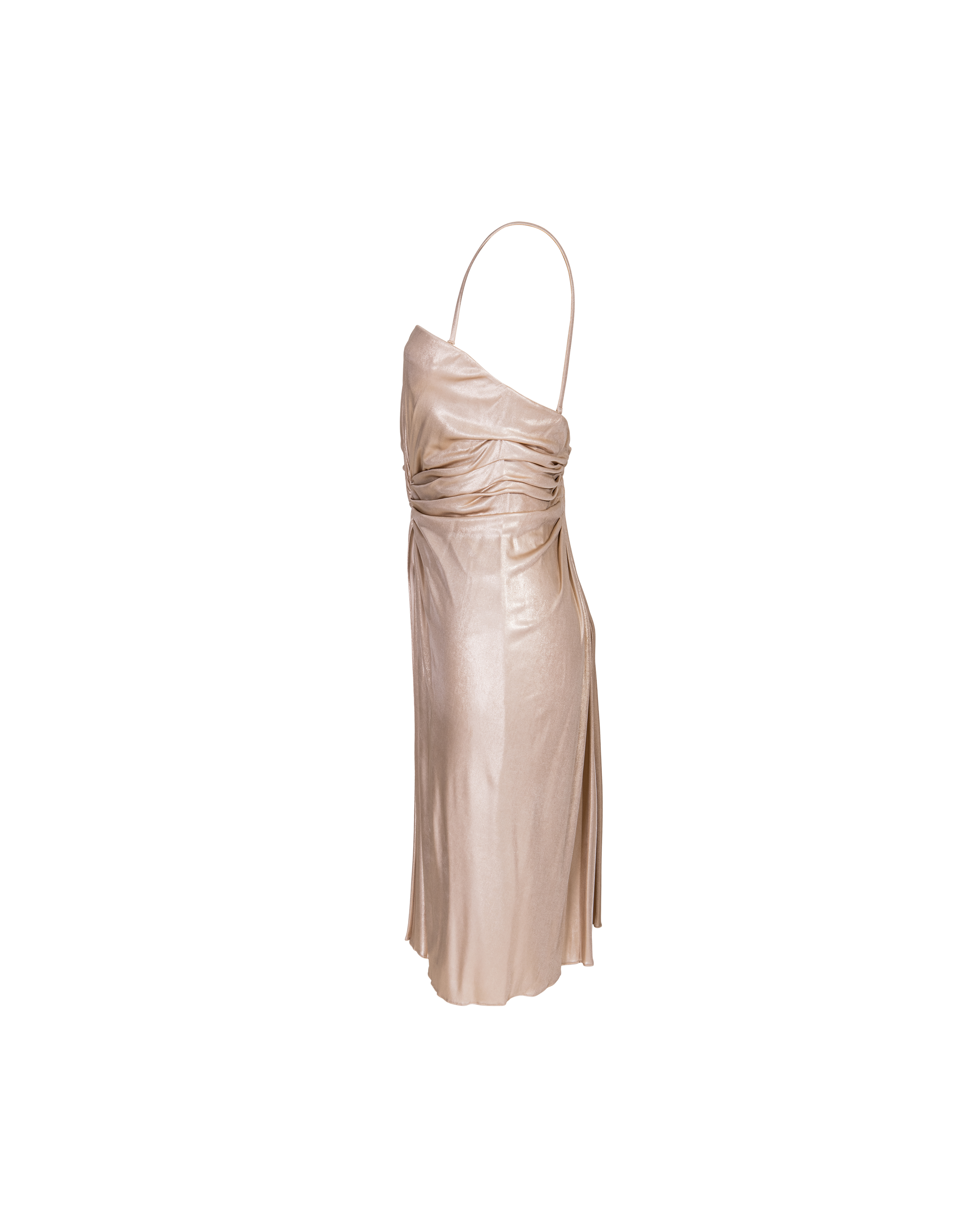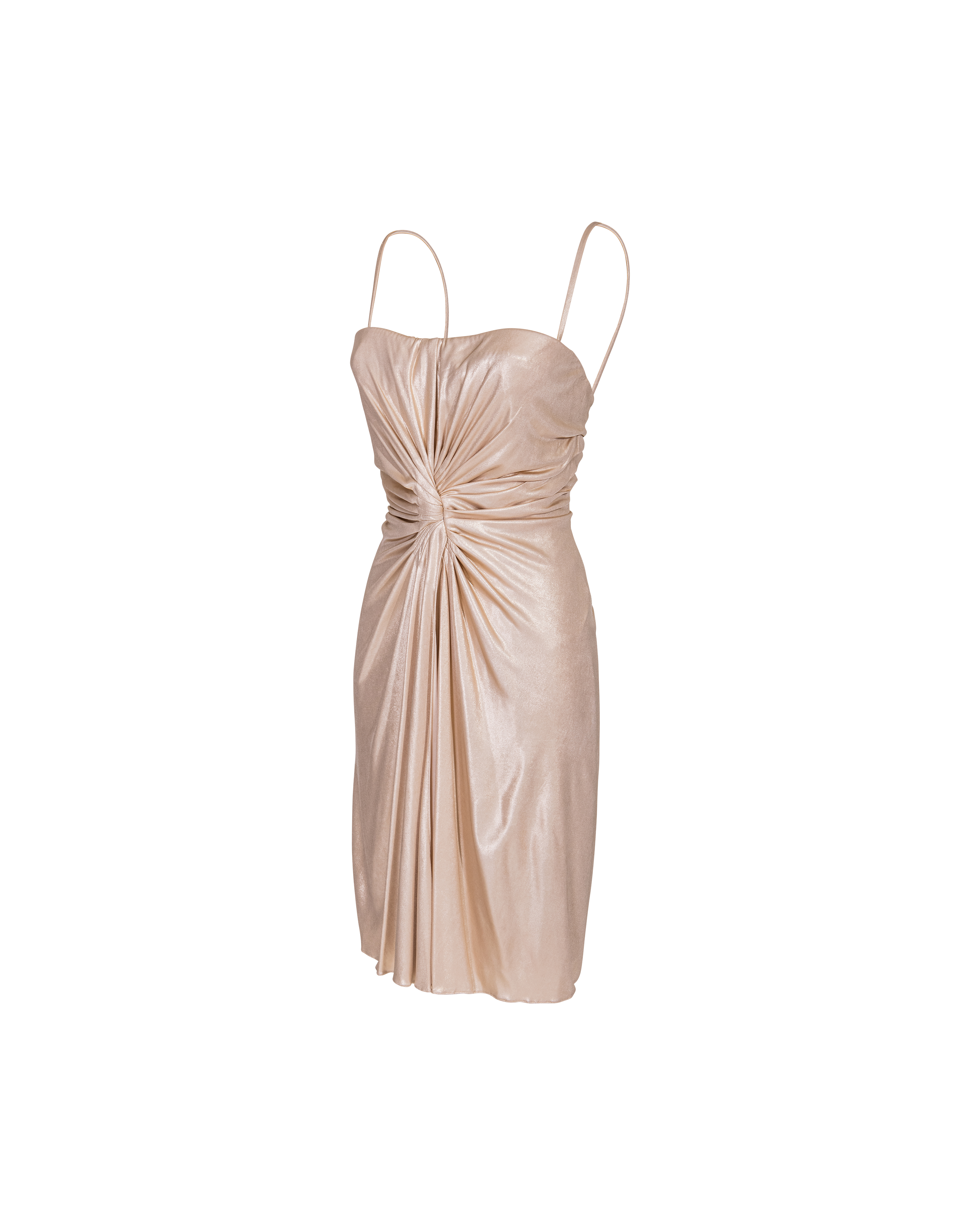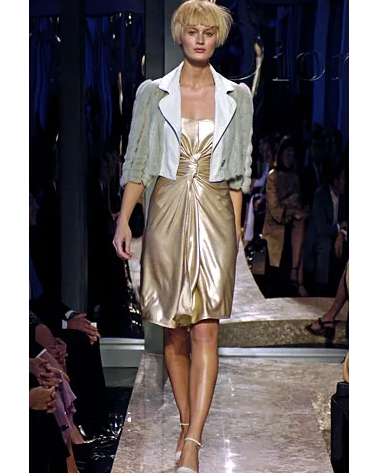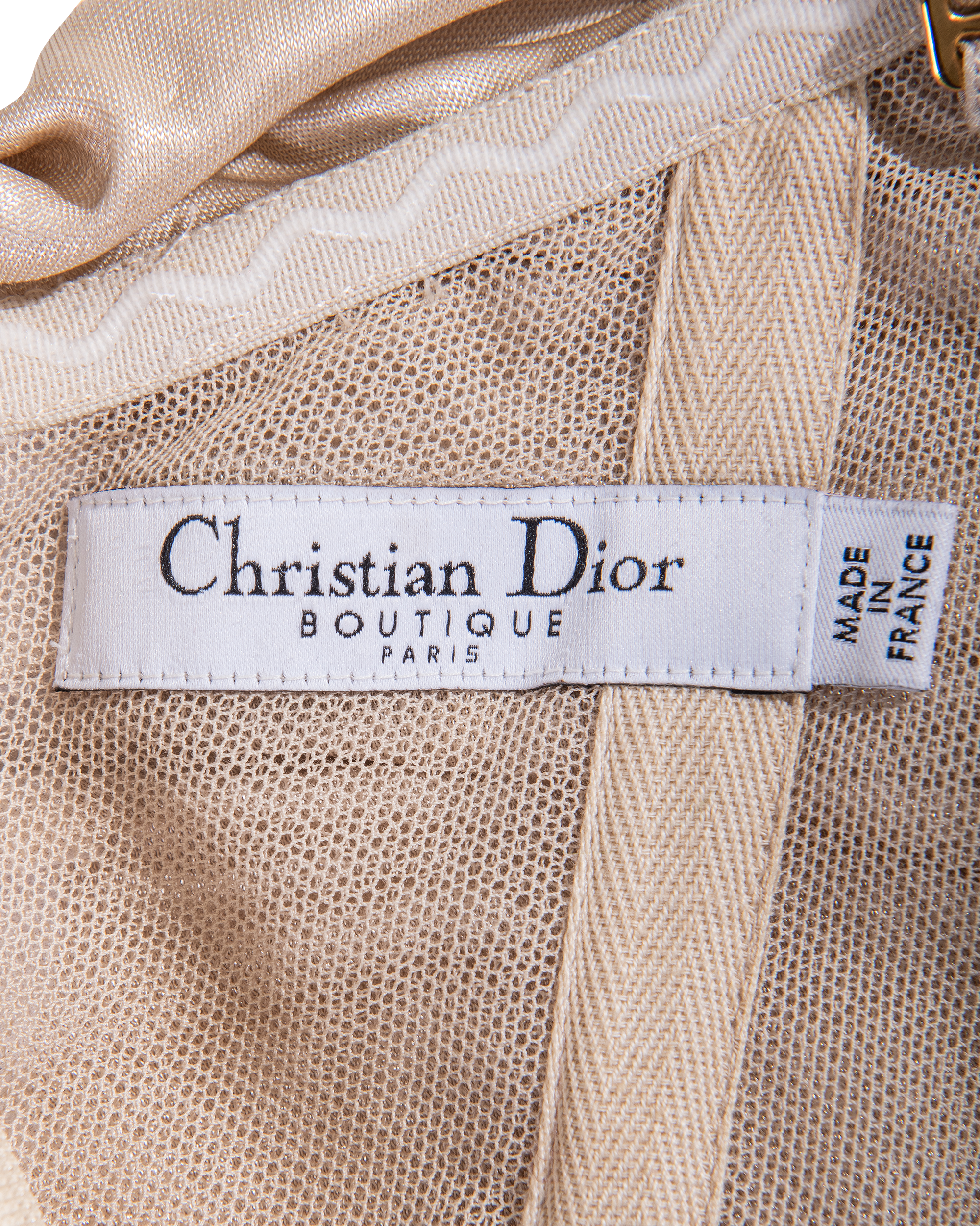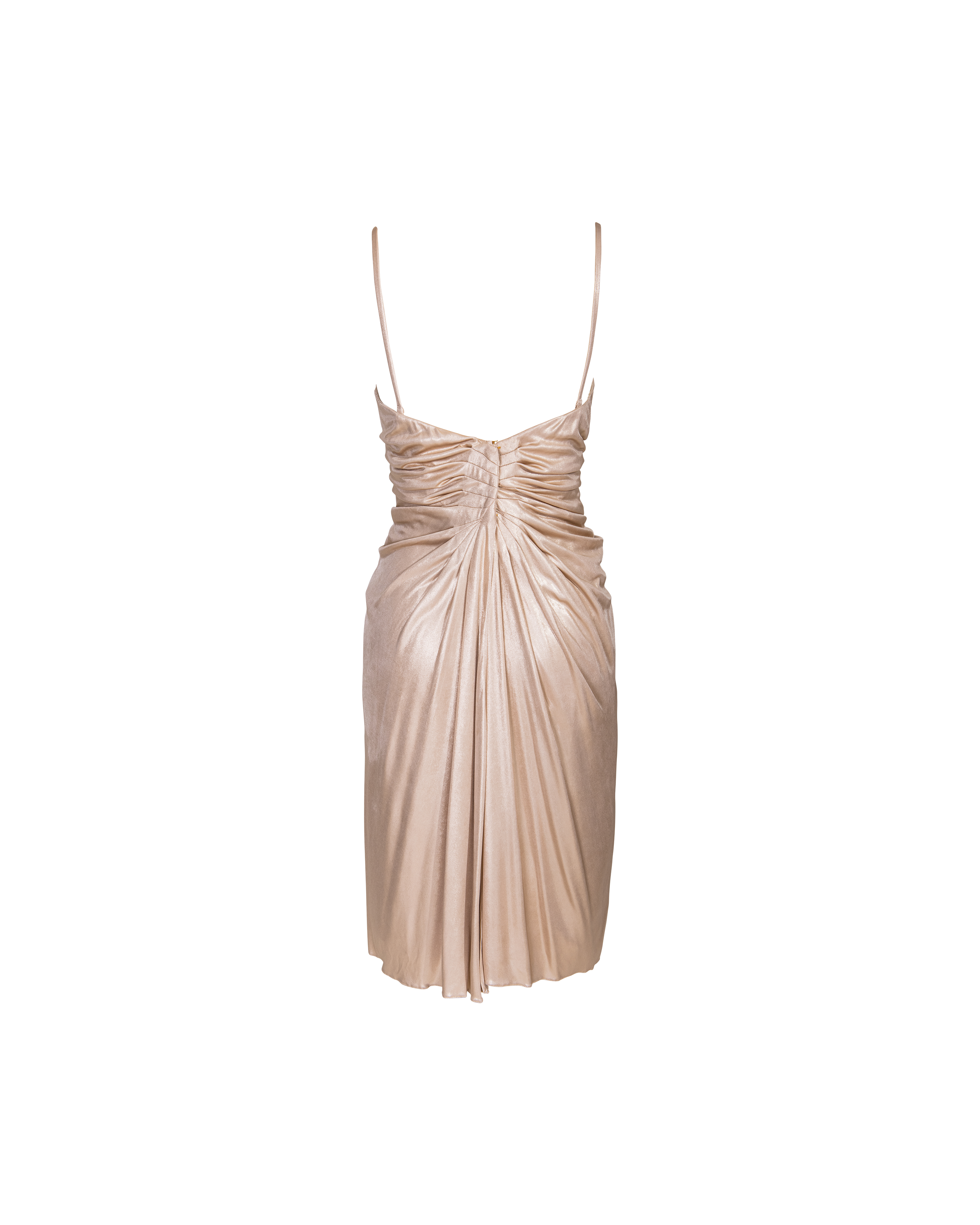 Resort 2007 Christian Dior by John Galliano gold corset mini dress. Metallic gold corset dress with optional straps (fully removable as desired) and gathered open front drape. Back paneling features visible curved seams to contour the body. Built-in mesh corset with boning and bra cups with slight padding. Concealed back zip closure, snap closures and three hook-and-eye closures. Fabric Contents: 100% Viscose with moderate stretch throughout. Lined with matching gold Viscose lining. As seen on the runway, and featured in the ad campaign in pink colorway. In excellent vintage condition with no flaws to note.