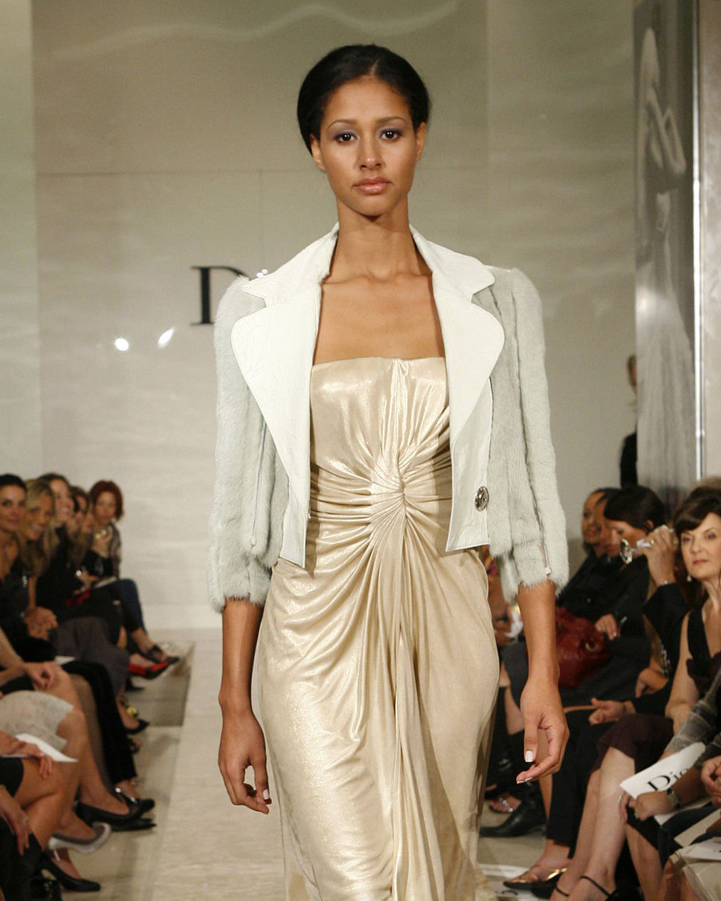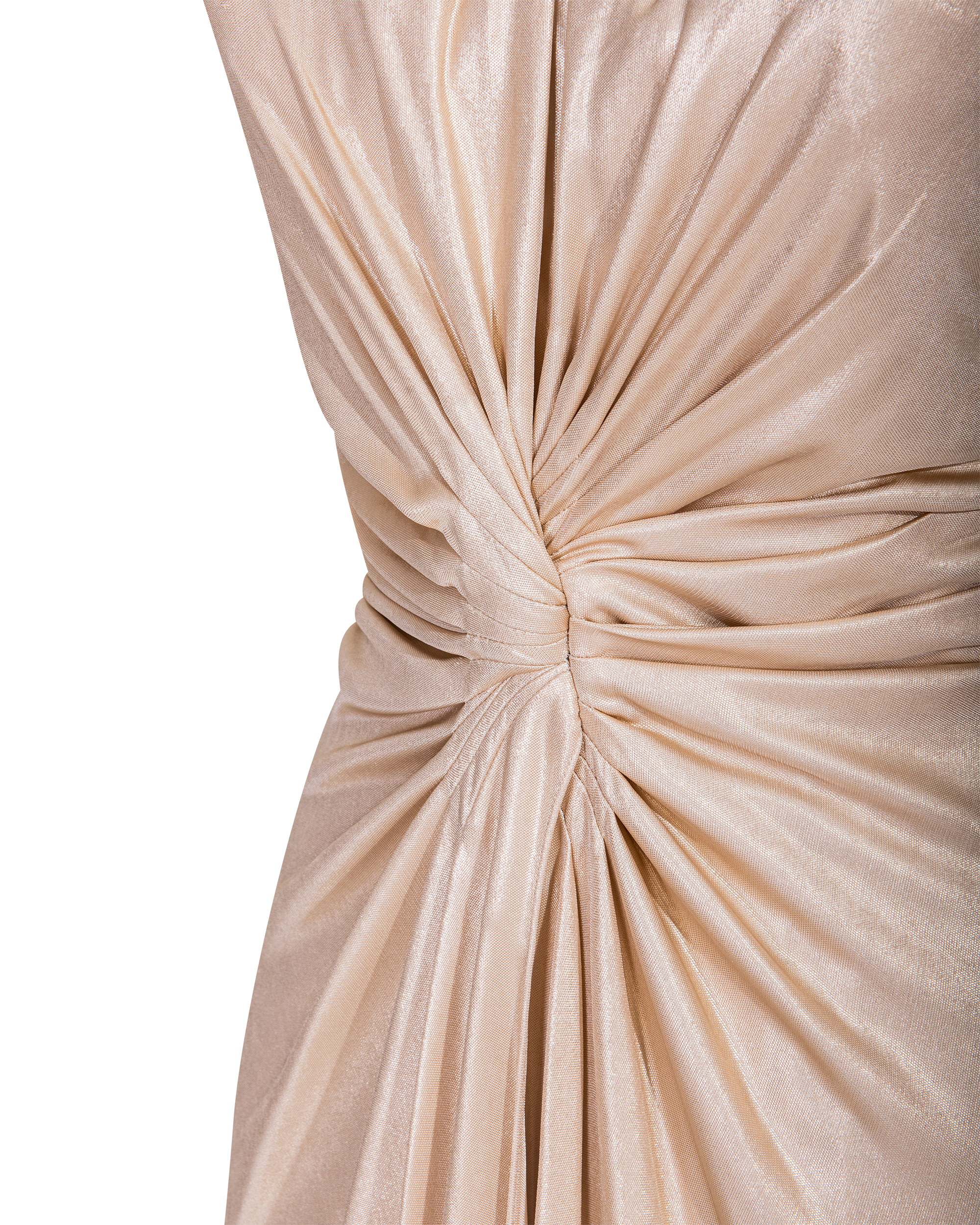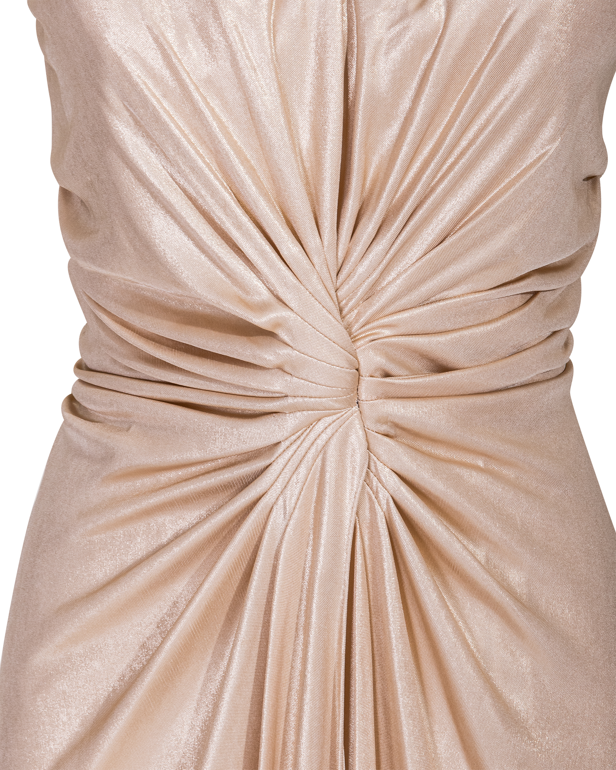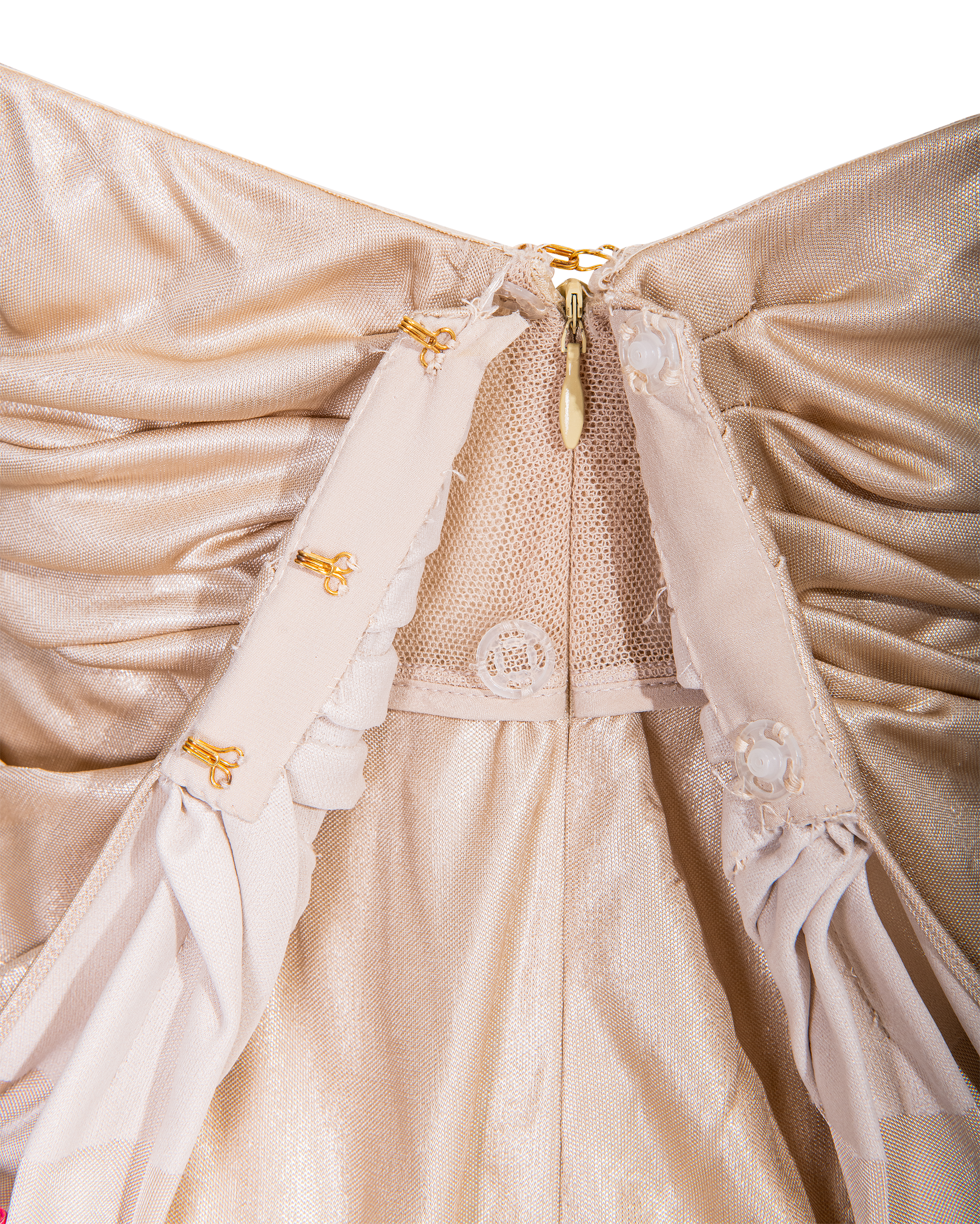 Resort 2007 Christian Dior by John Galliano gold corset mini dress. Metallic gold corset dress with optional straps (fully removable as desired) and gathered open front drape. Back paneling features visible curved seams to contour the body. Built-in mesh corset with boning and bra cups with slight padding. Concealed back zip closure, snap closures and three hook-and-eye closures. Fabric Contents: 100% Viscose with moderate stretch throughout. Lined with matching gold Viscose lining. As seen on the runway, and featured in the ad campaign in pink colorway. In excellent vintage condition with no flaws to note.