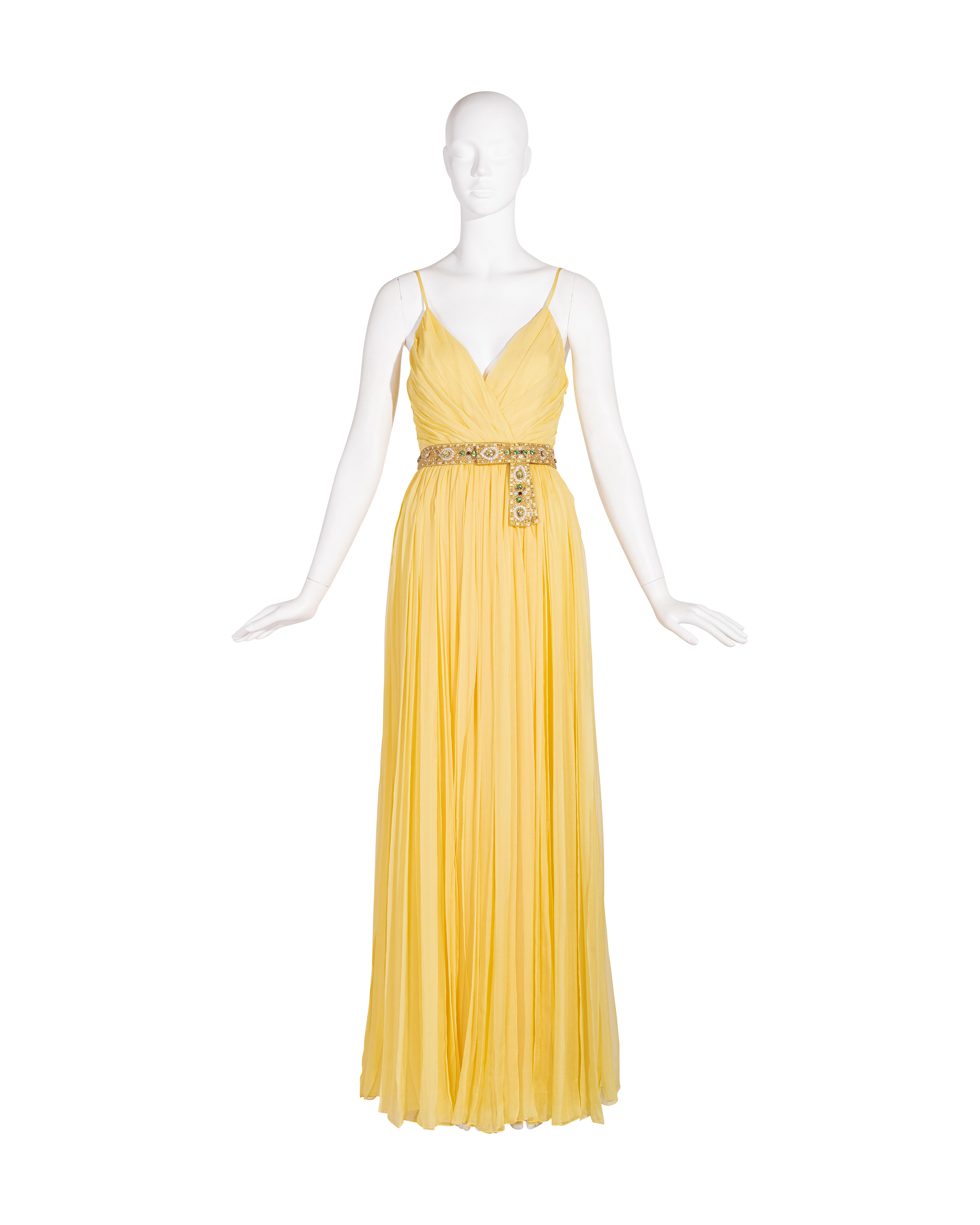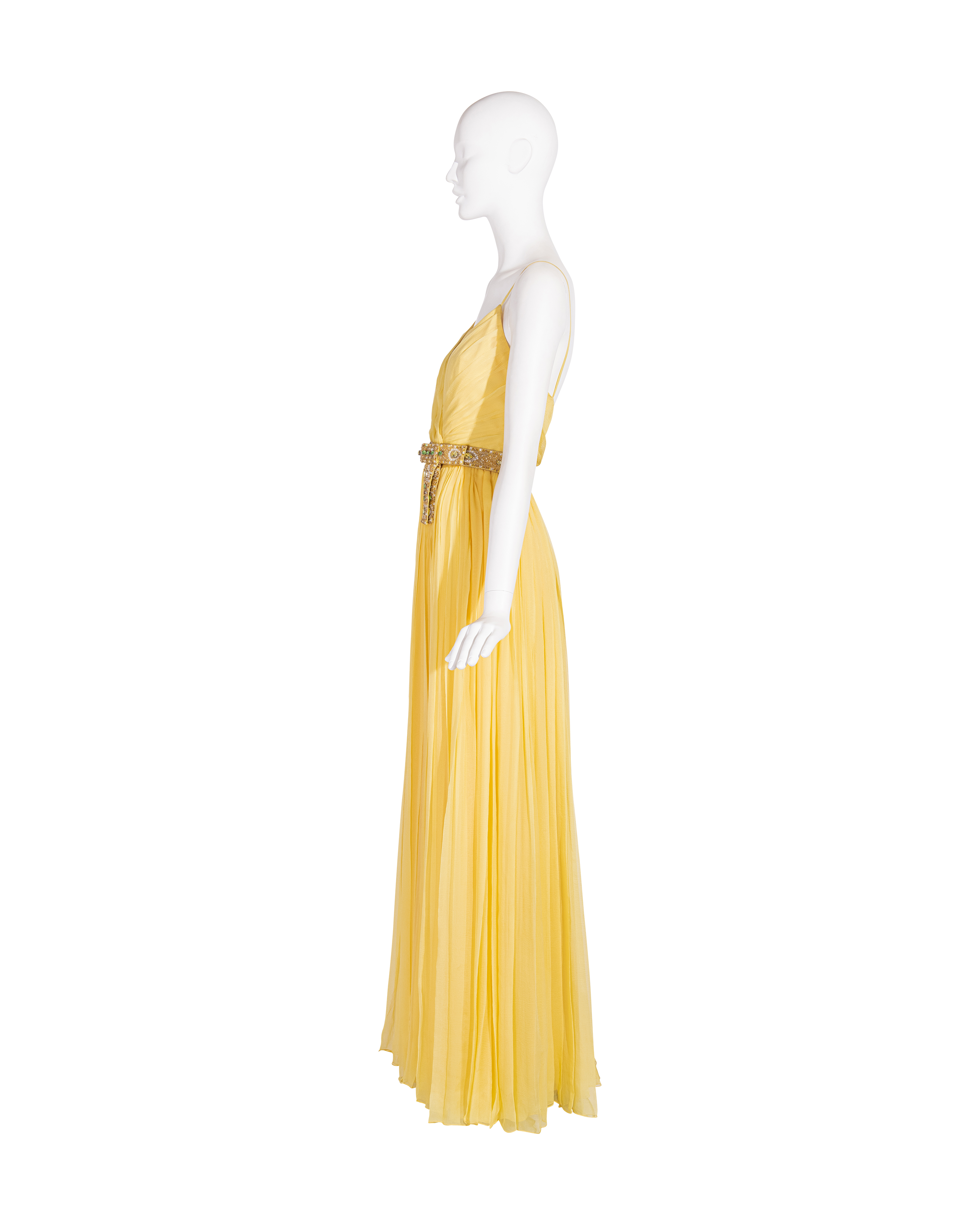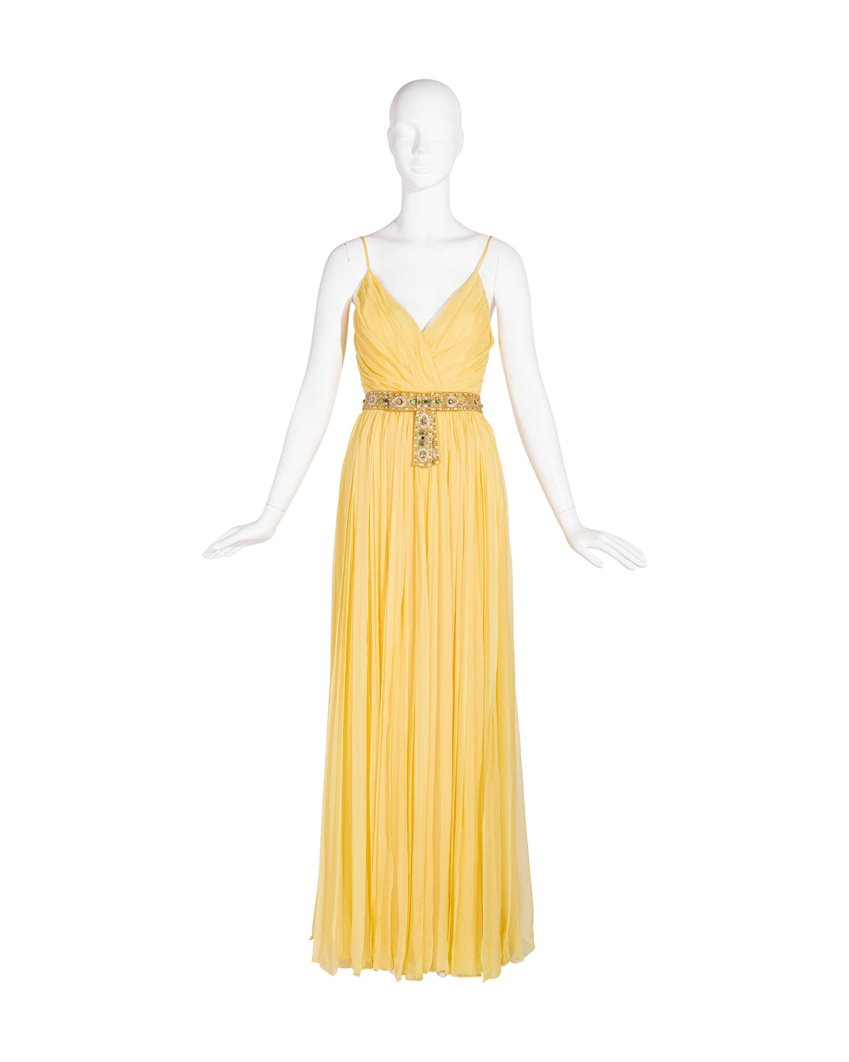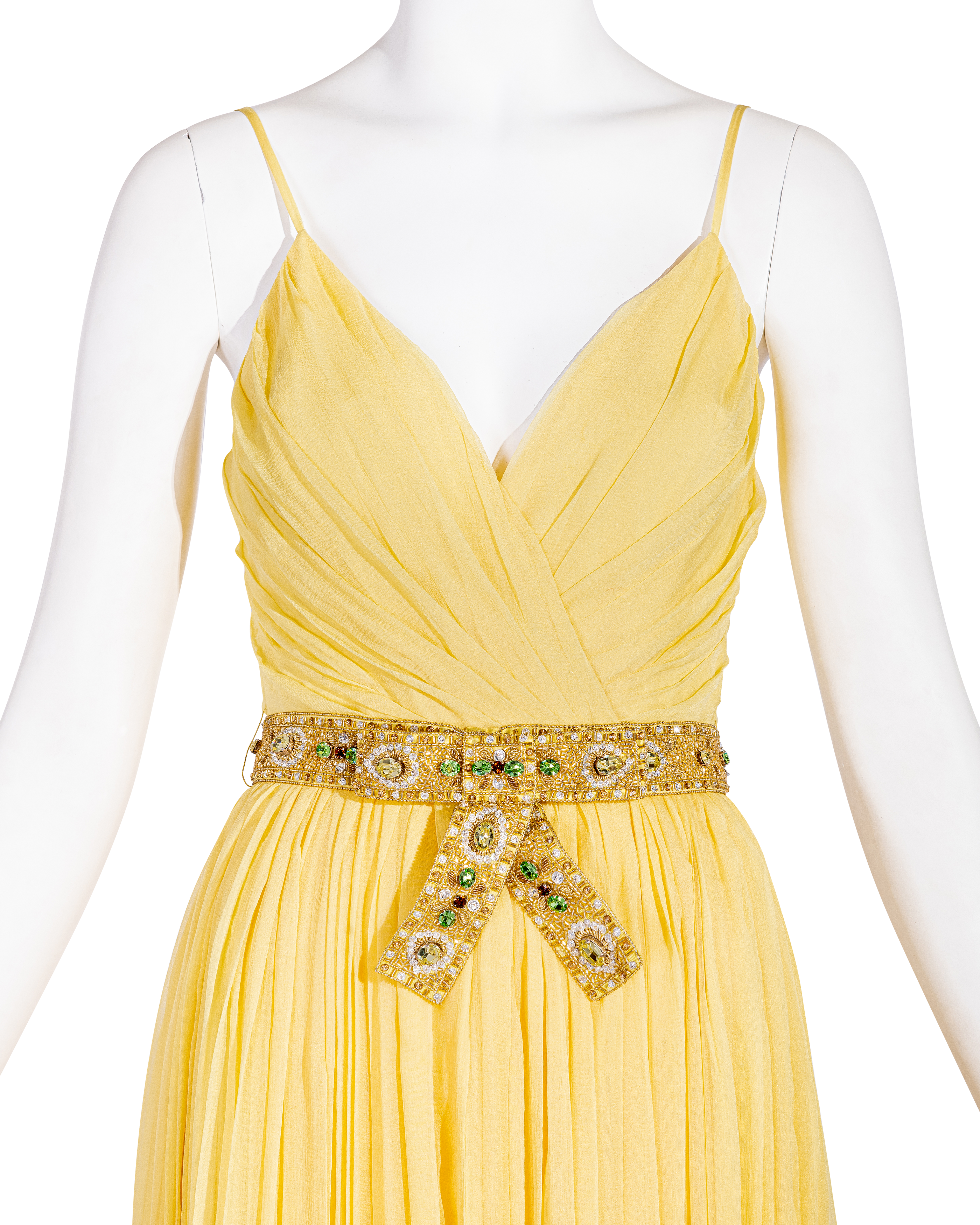 Resort 2008 Christian Dior by John Galliano yellow pleated gown with jeweled belt. Sleeveless gown with low neckline and pleated construction throughout, with fitted waist and full skirting. Pairs with removable jeweled belt (built-in thin belt loops); belt features gold-tone beads throughout, with raised green, brown and marigold yellow raised embellishments. Concealed side zip closure. Fabric Contents: 100% Silk with 100% Silk lining (chiffon exterior with full lining throughout); Glass and Metal embroidery. Rare gown as seen on the runway; note that version offered by Tab Vintage has more closed lower segment of bow than in runway variation. The belt bows do not naturally separate when worn and are taped open to show detailing in the e commerce photo. In very good vintage condition with pin-sized spot on interior (unnoticeable when worn); otherwise in excellent vintage condition with no flaws to note.