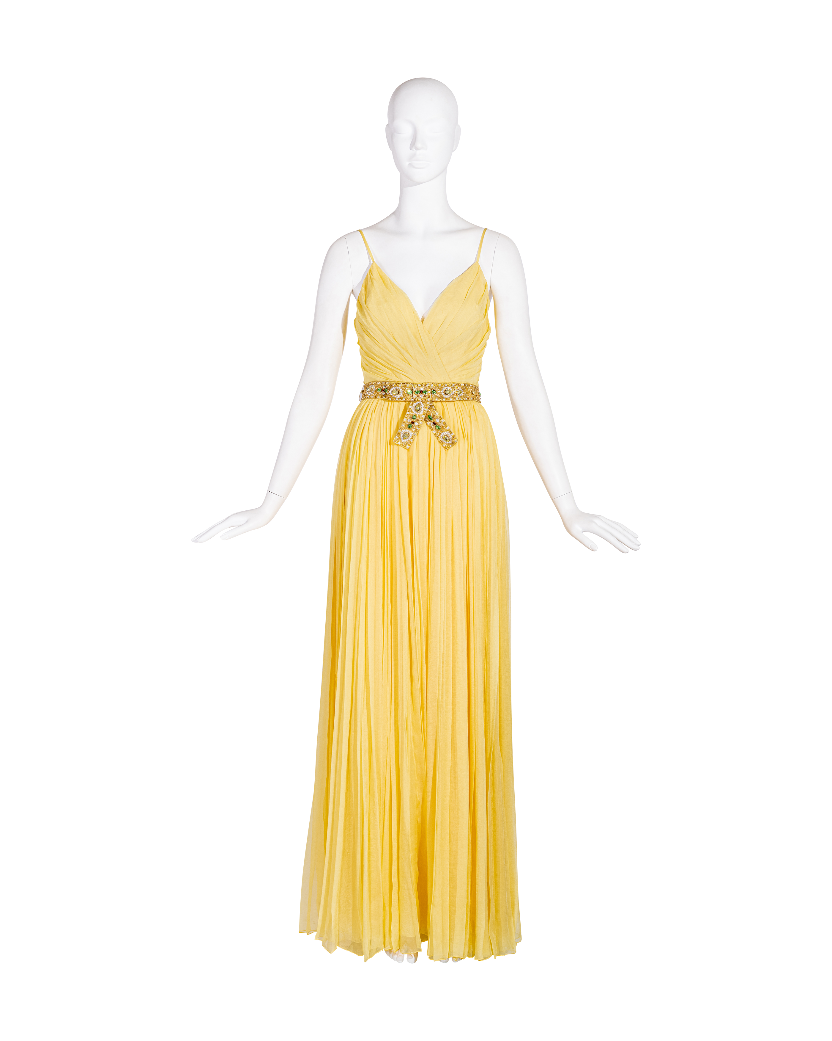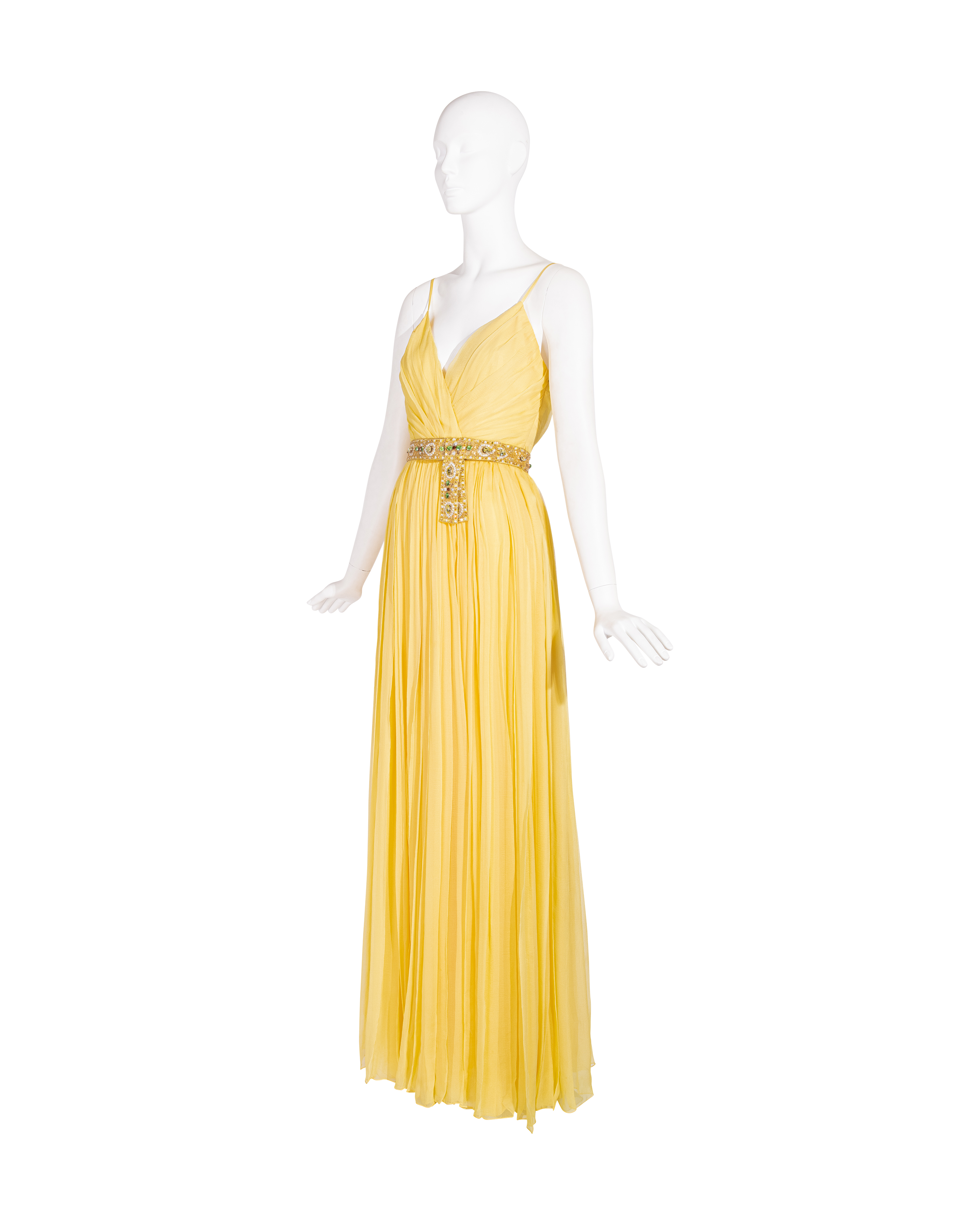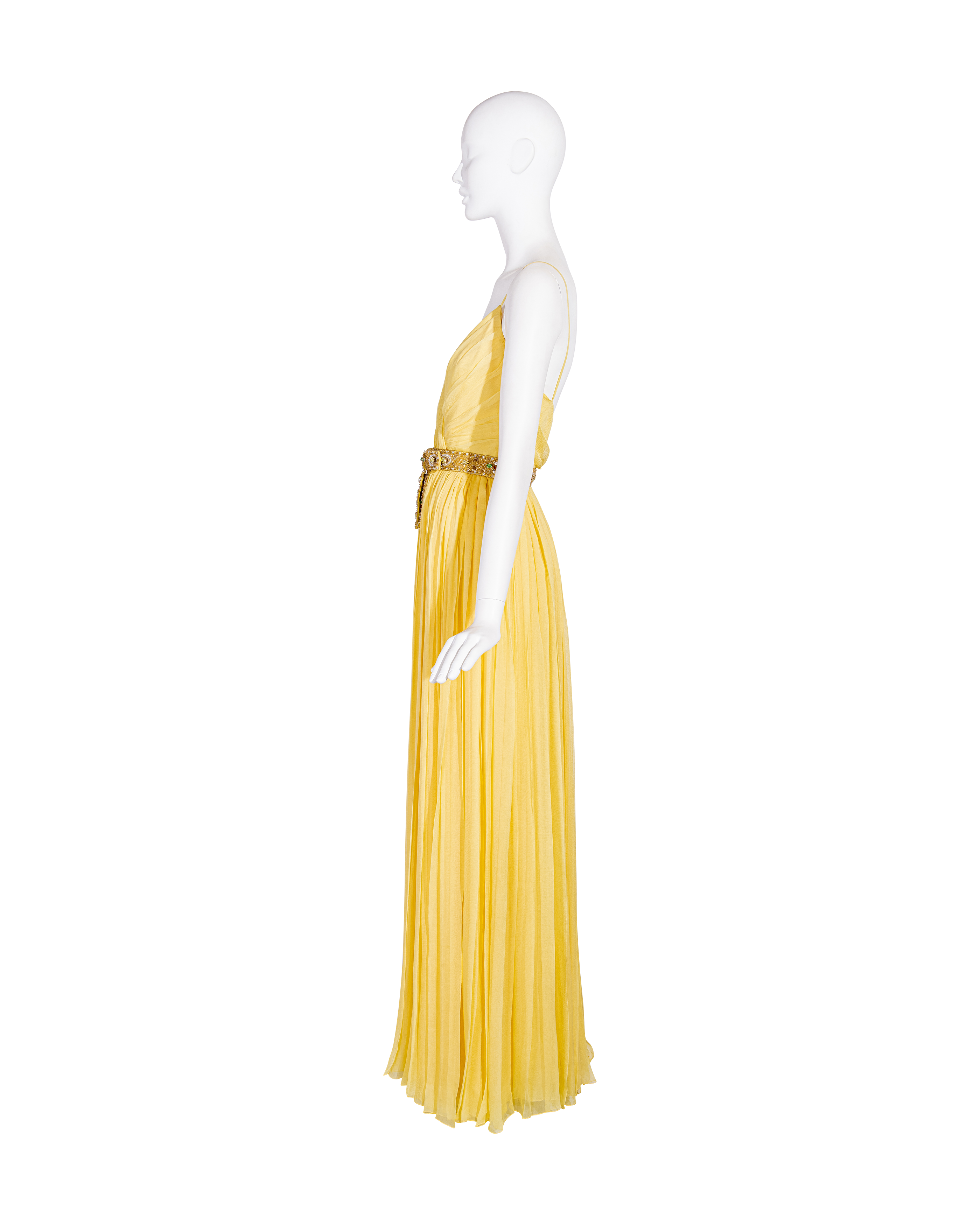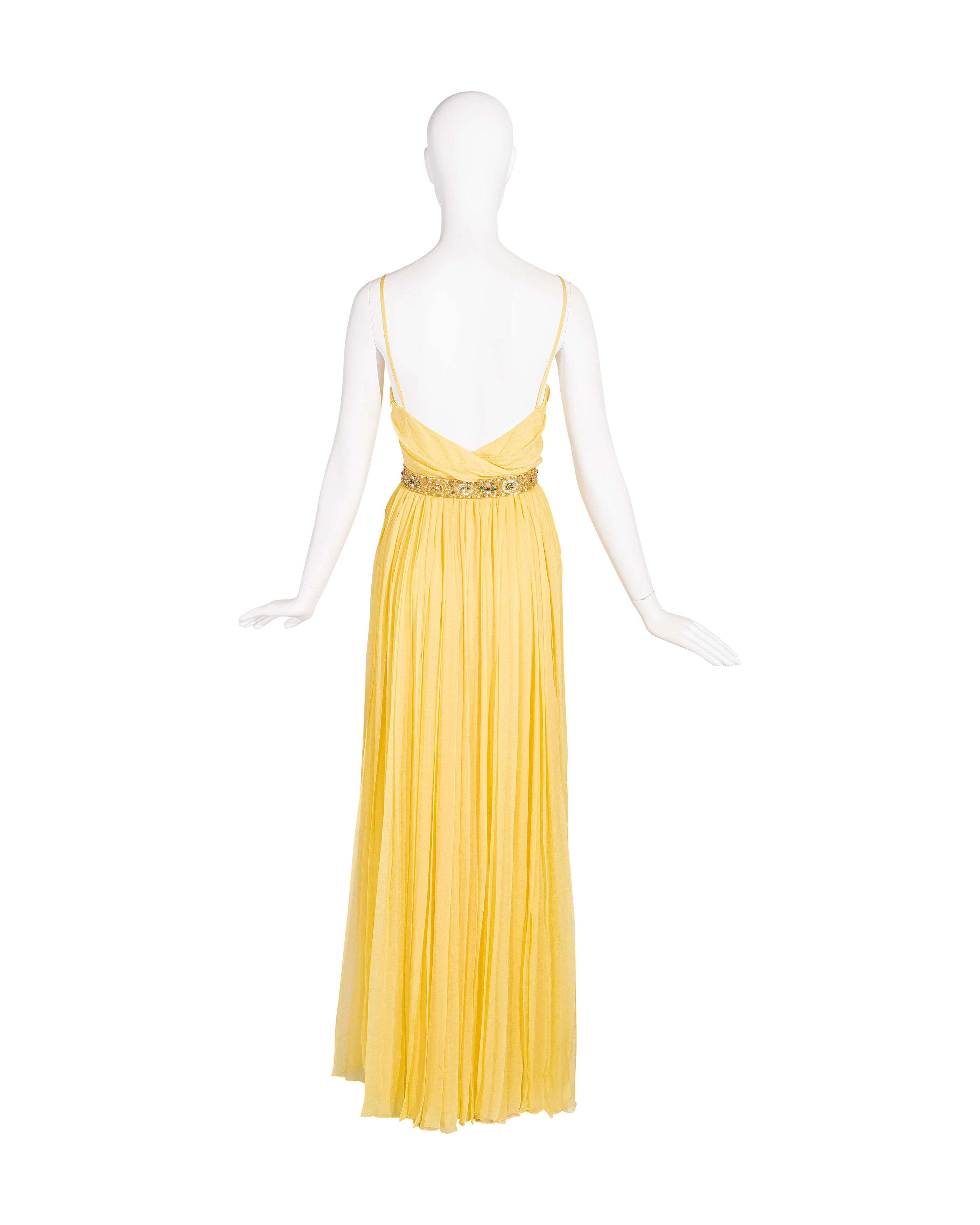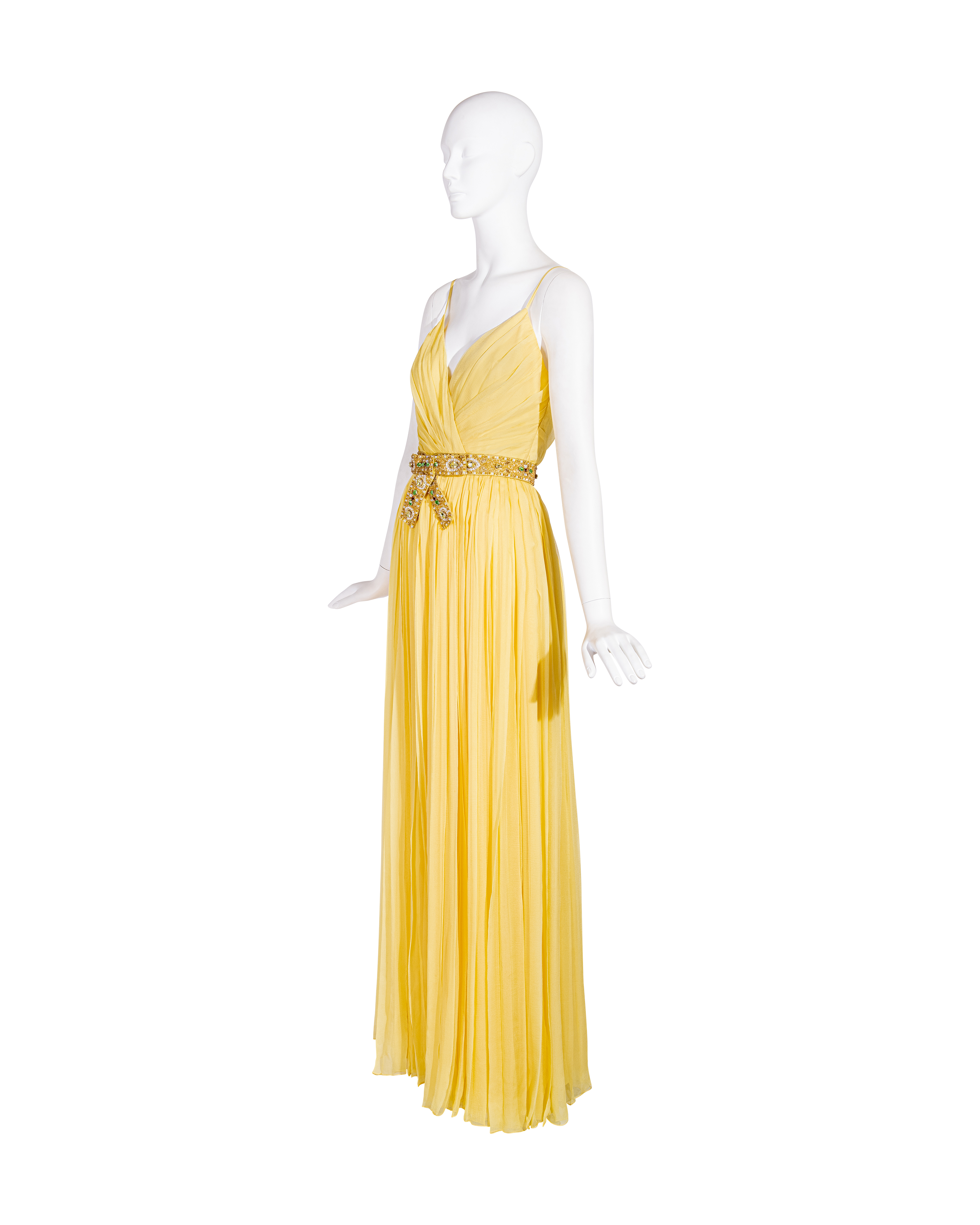Resort 2008 Christian Dior by John Galliano yellow pleated gown with jeweled belt. Sleeveless gown with low neckline and pleated construction throughout, with fitted waist and full skirting. Pairs with removable jeweled belt (built-in thin belt loops); belt features gold-tone beads throughout, with raised green, brown and marigold yellow raised embellishments. Concealed side zip closure. Fabric Contents: 100% Silk with 100% Silk lining (chiffon exterior with full lining throughout); Glass and Metal embroidery. Rare gown as seen on the runway; note that version offered by Tab Vintage has more closed lower segment of bow than in runway variation. The belt bows do not naturally separate when worn and are taped open to show detailing in the e commerce photo. In very good vintage condition with pin-sized spot on interior (unnoticeable when worn); otherwise in excellent vintage condition with no flaws to note.