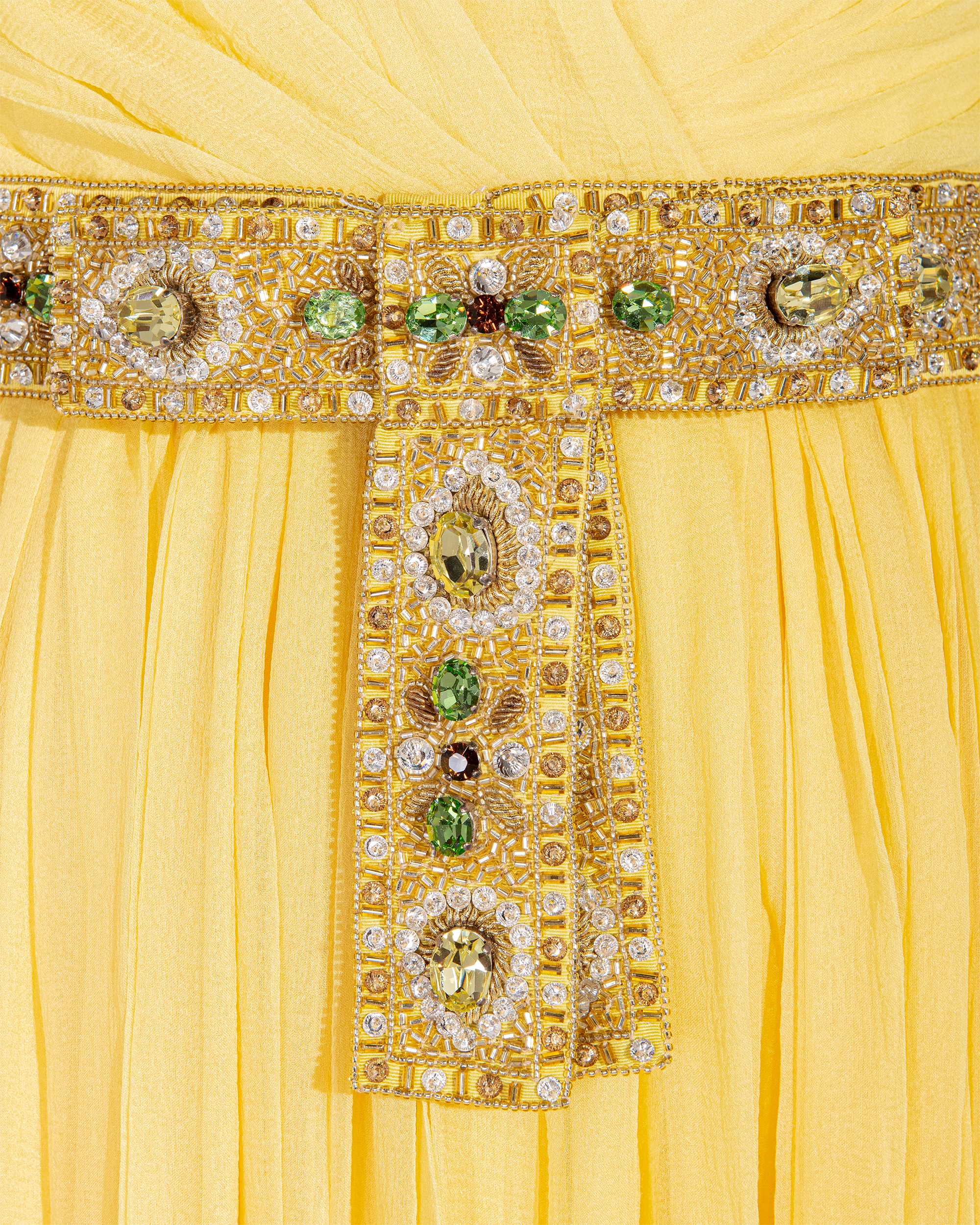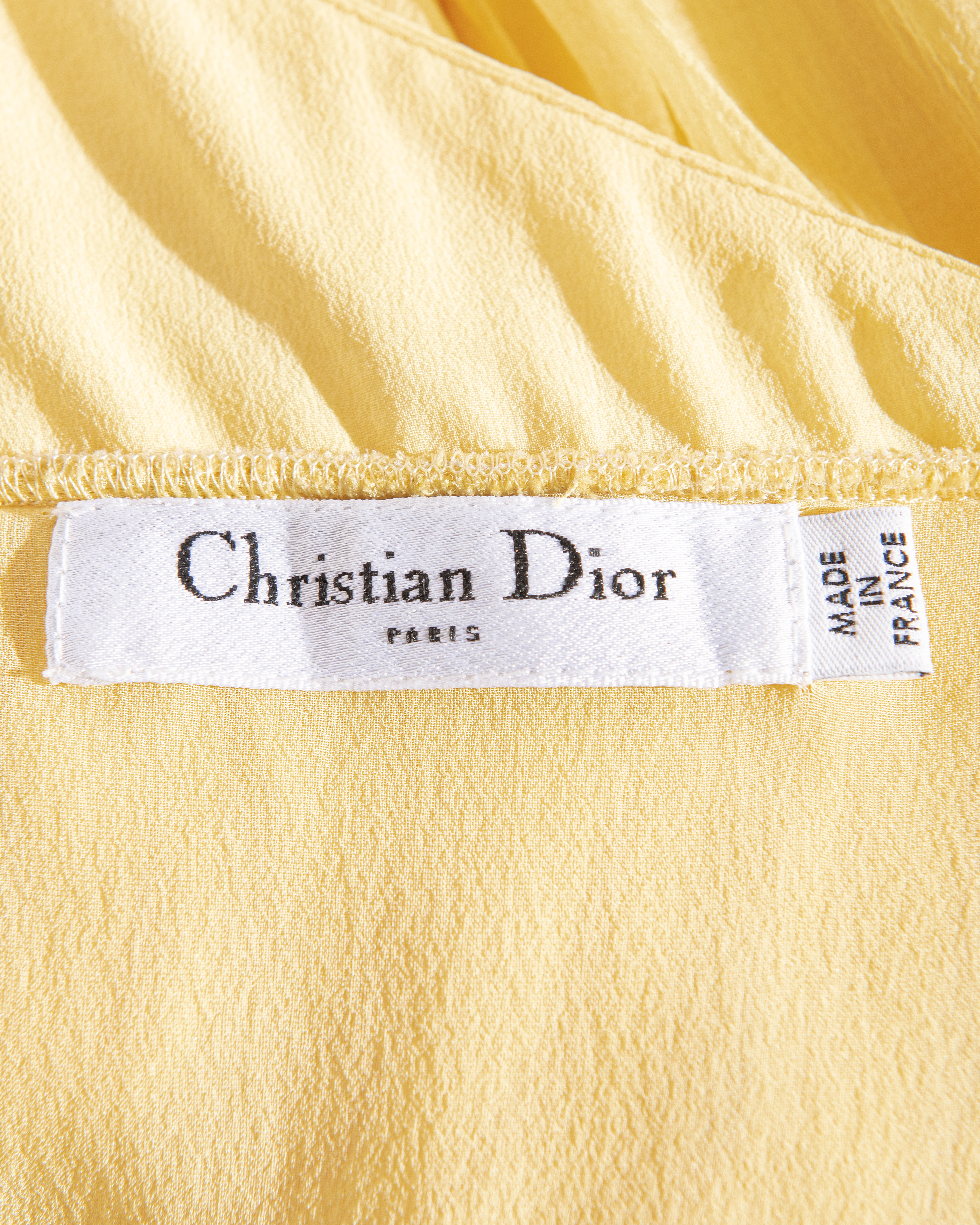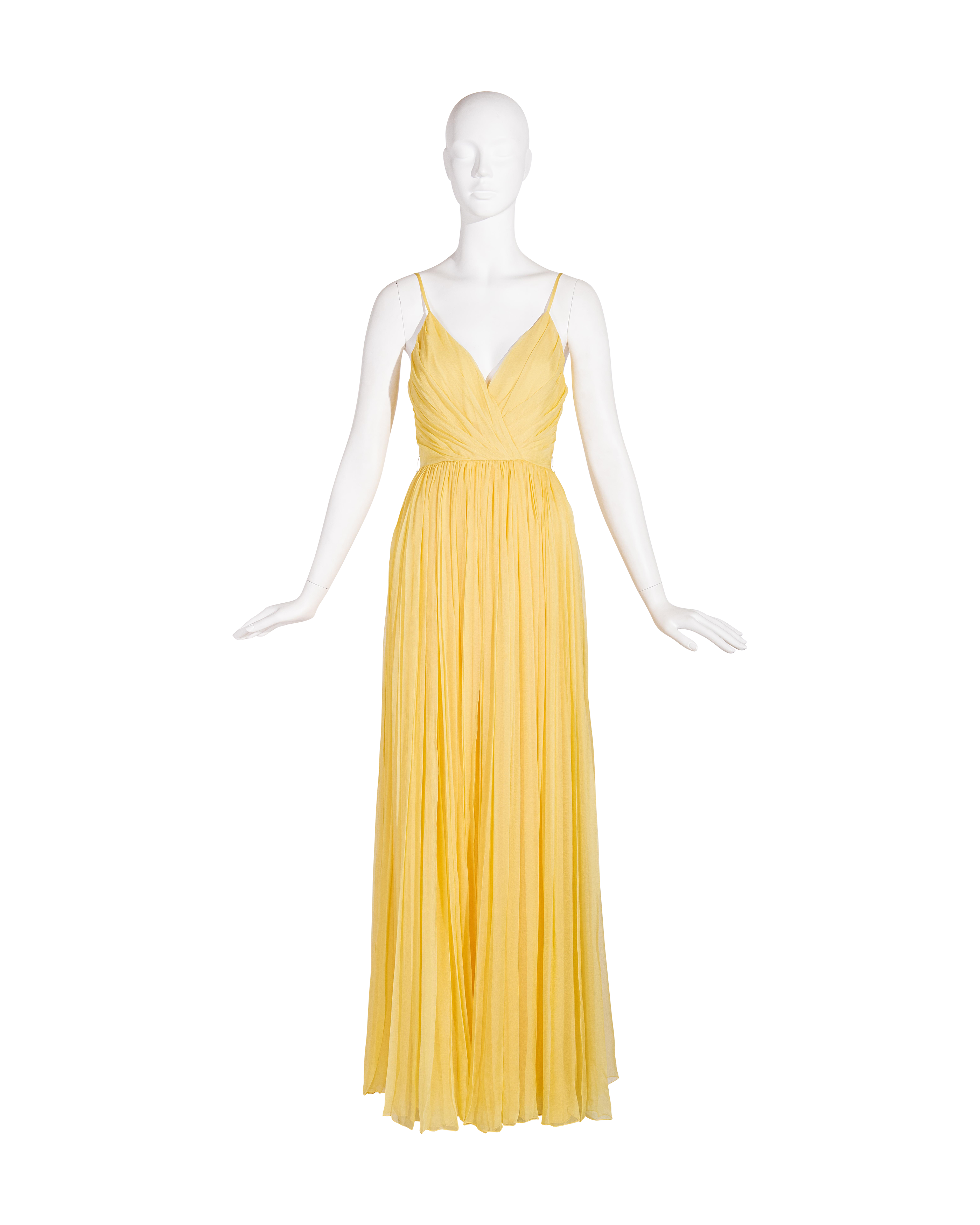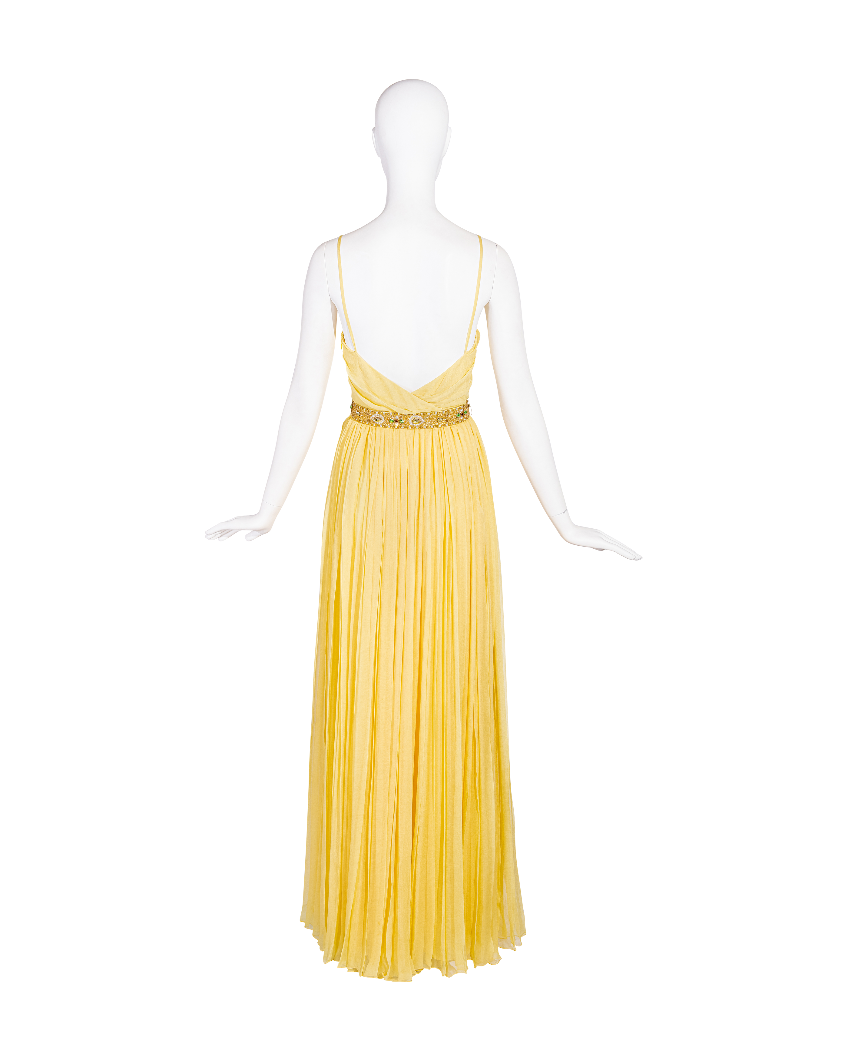 Resort 2008 Christian Dior by John Galliano yellow pleated gown with jeweled belt. Sleeveless gown with low neckline and pleated construction throughout, with fitted waist and full skirting. Pairs with removable jeweled belt (built-in thin belt loops); belt features gold-tone beads throughout, with raised green, brown and marigold yellow raised embellishments. Concealed side zip closure. Fabric Contents: 100% Silk with 100% Silk lining (chiffon exterior with full lining throughout); Glass and Metal embroidery. Rare gown as seen on the runway; note that version offered by Tab Vintage has more closed lower segment of bow than in runway variation. The belt bows do not naturally separate when worn and are taped open to show detailing in the e commerce photo. In very good vintage condition with pin-sized spot on interior (unnoticeable when worn); otherwise in excellent vintage condition with no flaws to note.