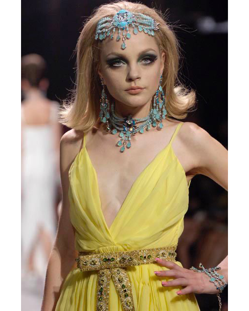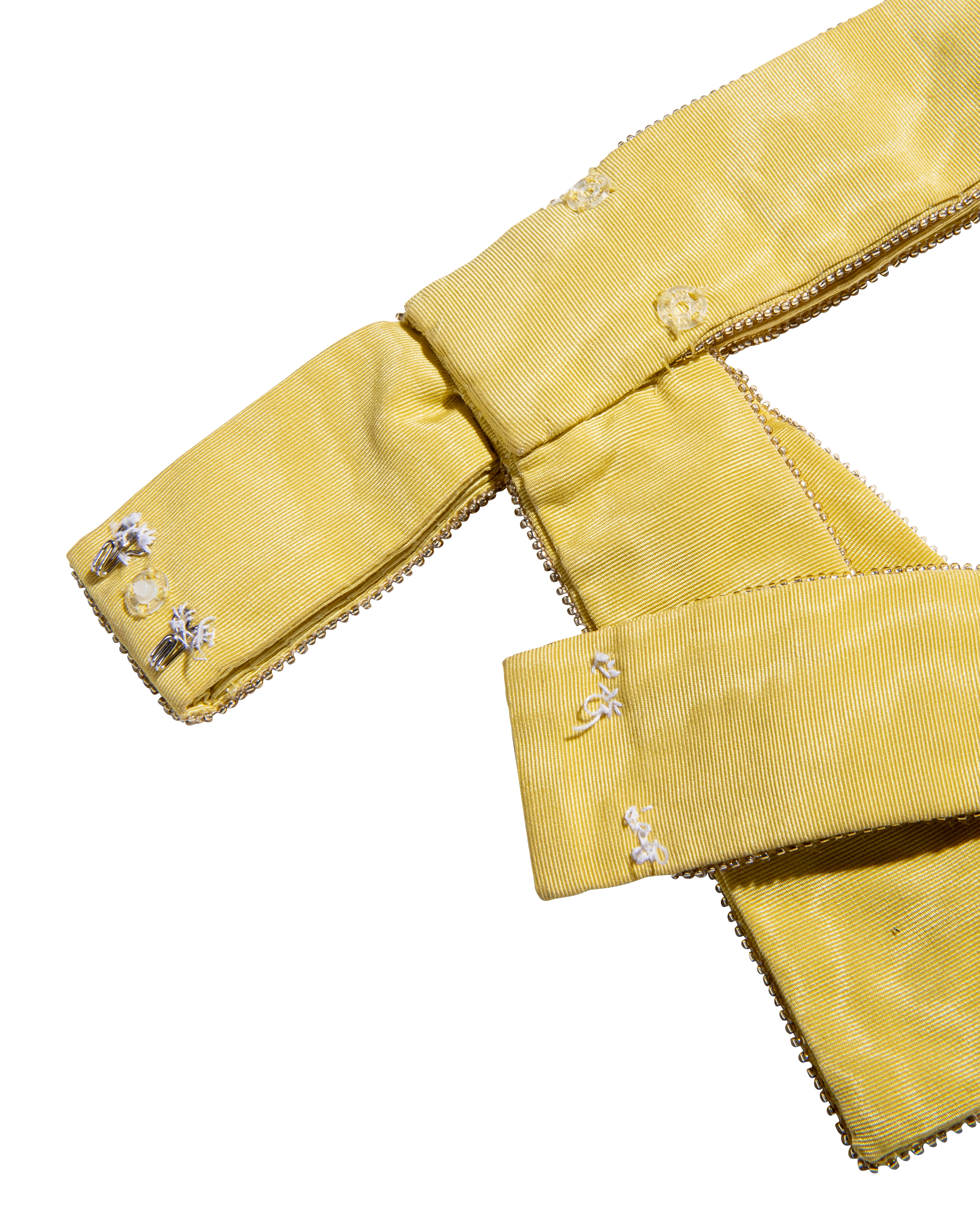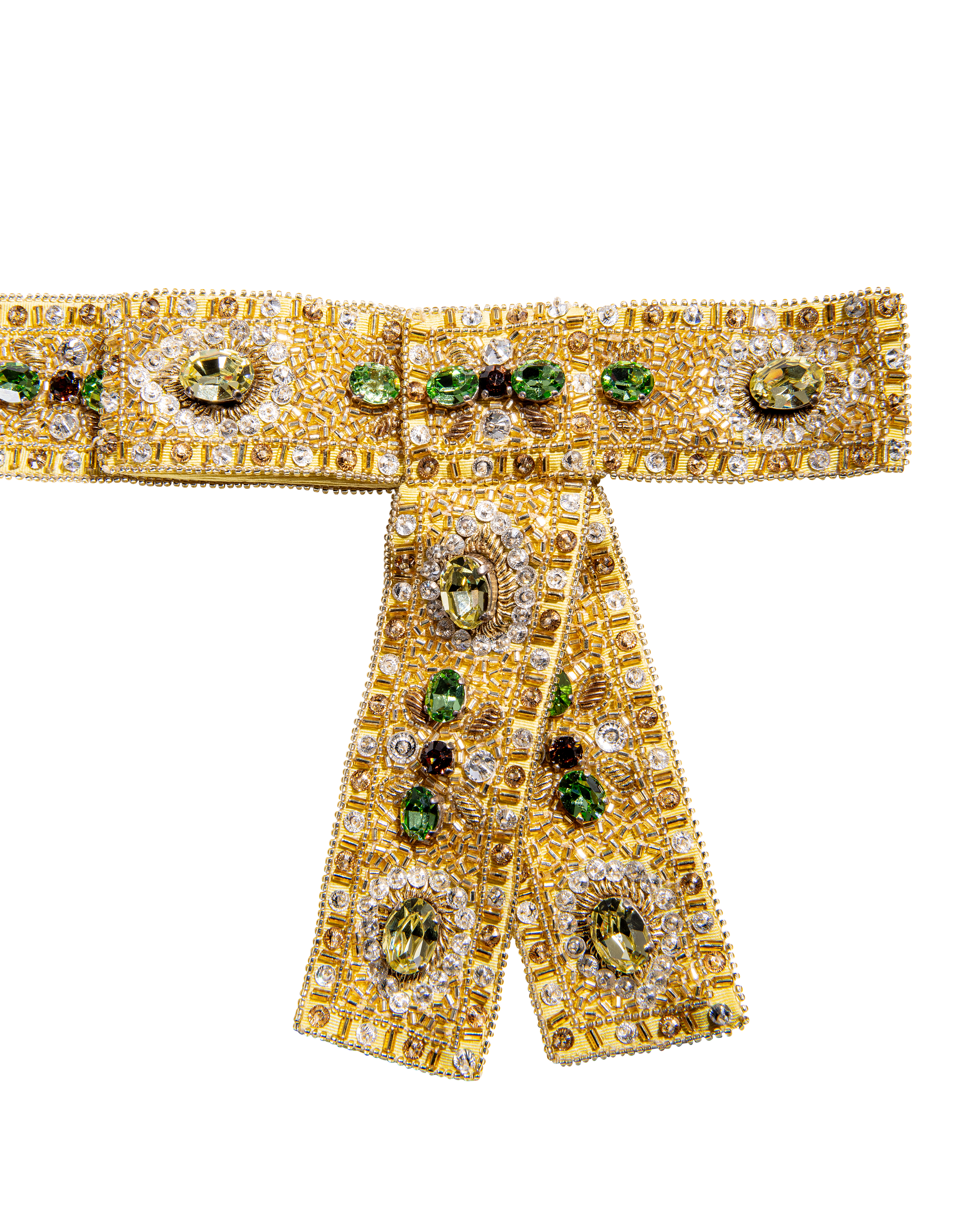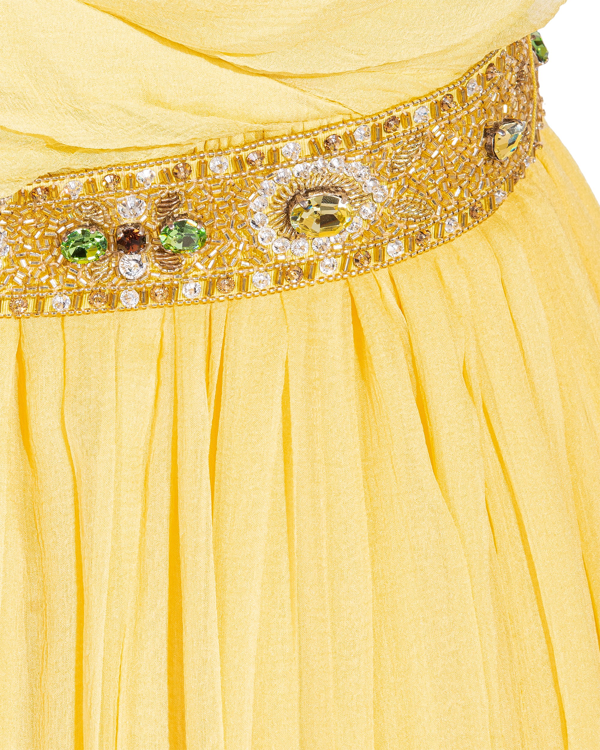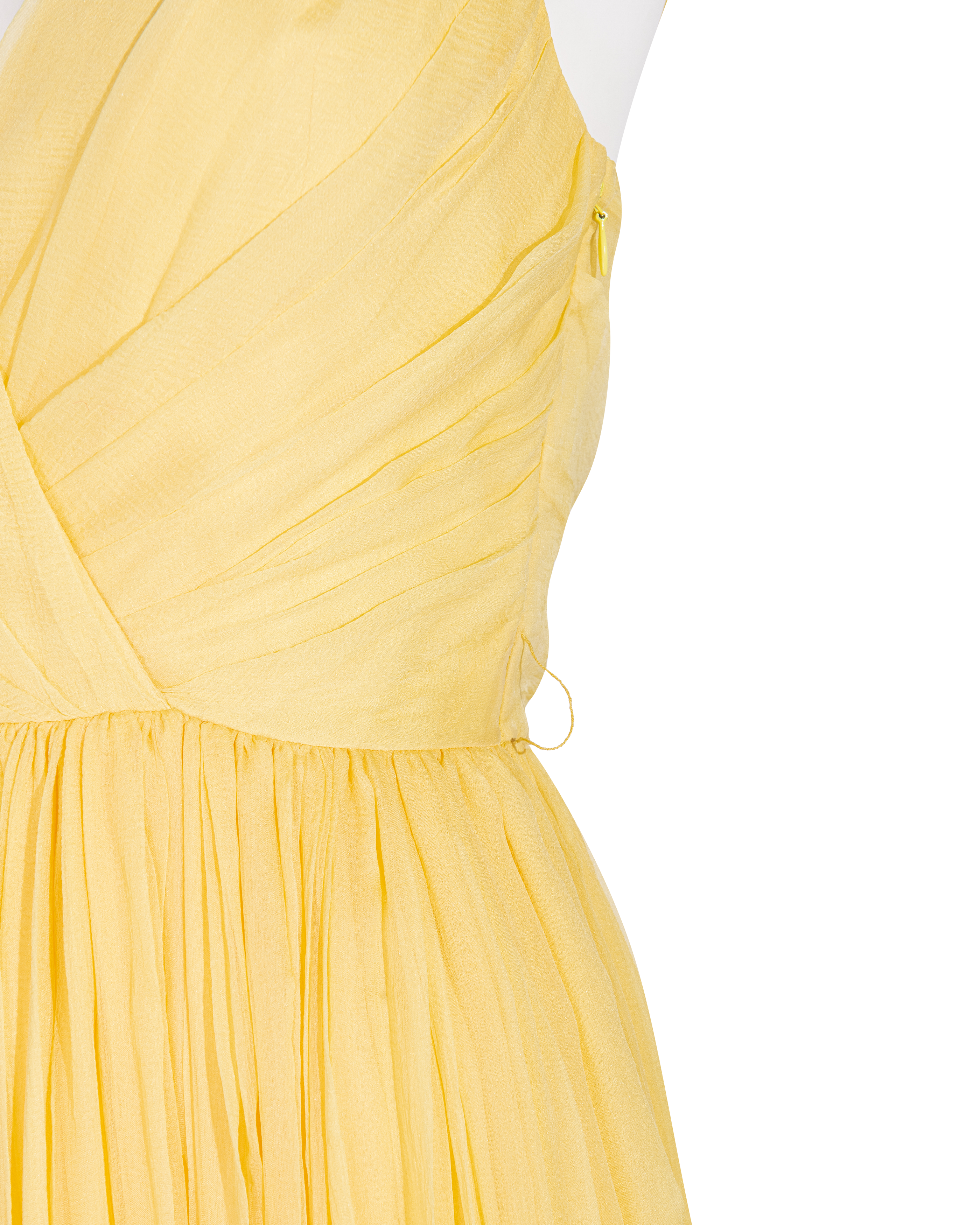 Resort 2008 Christian Dior by John Galliano yellow pleated gown with jeweled belt. Sleeveless gown with low neckline and pleated construction throughout, with fitted waist and full skirting. Pairs with removable jeweled belt (built-in thin belt loops); belt features gold-tone beads throughout, with raised green, brown and marigold yellow raised embellishments. Concealed side zip closure. Fabric Contents: 100% Silk with 100% Silk lining (chiffon exterior with full lining throughout); Glass and Metal embroidery. Rare gown as seen on the runway; note that version offered by Tab Vintage has more closed lower segment of bow than in runway variation. The belt bows do not naturally separate when worn and are taped open to show detailing in the e commerce photo. In very good vintage condition with pin-sized spot on interior (unnoticeable when worn); otherwise in excellent vintage condition with no flaws to note.