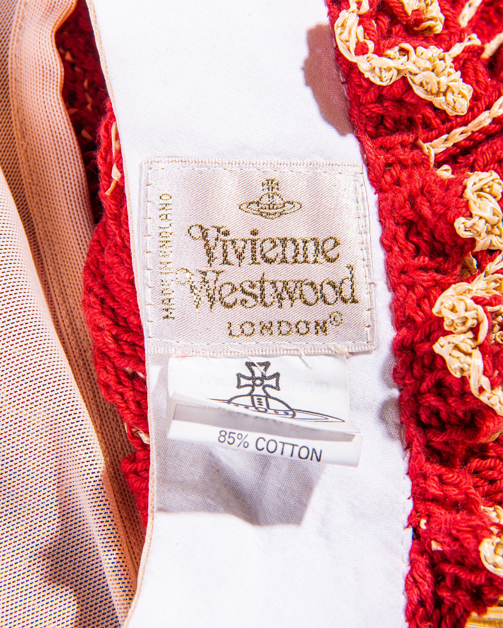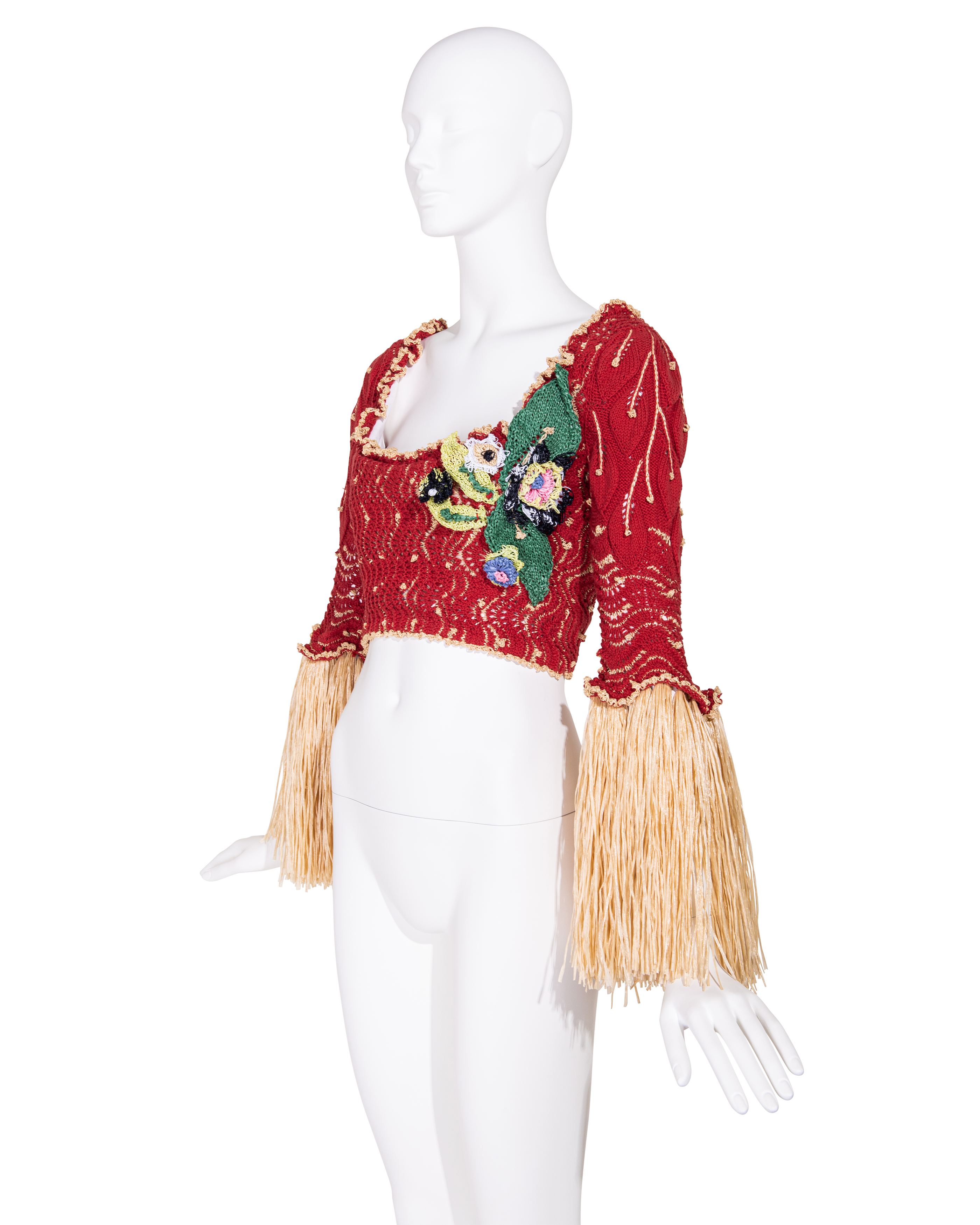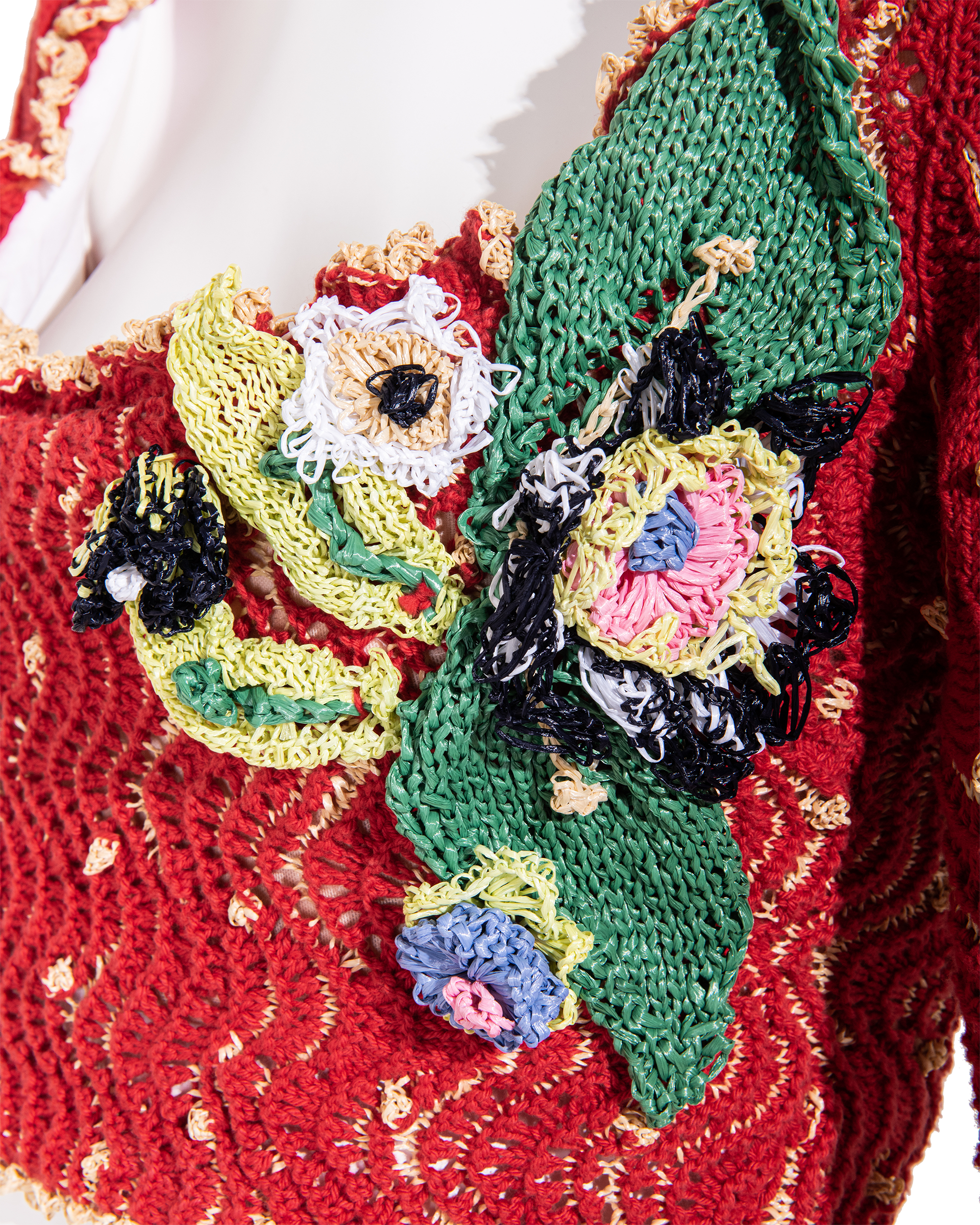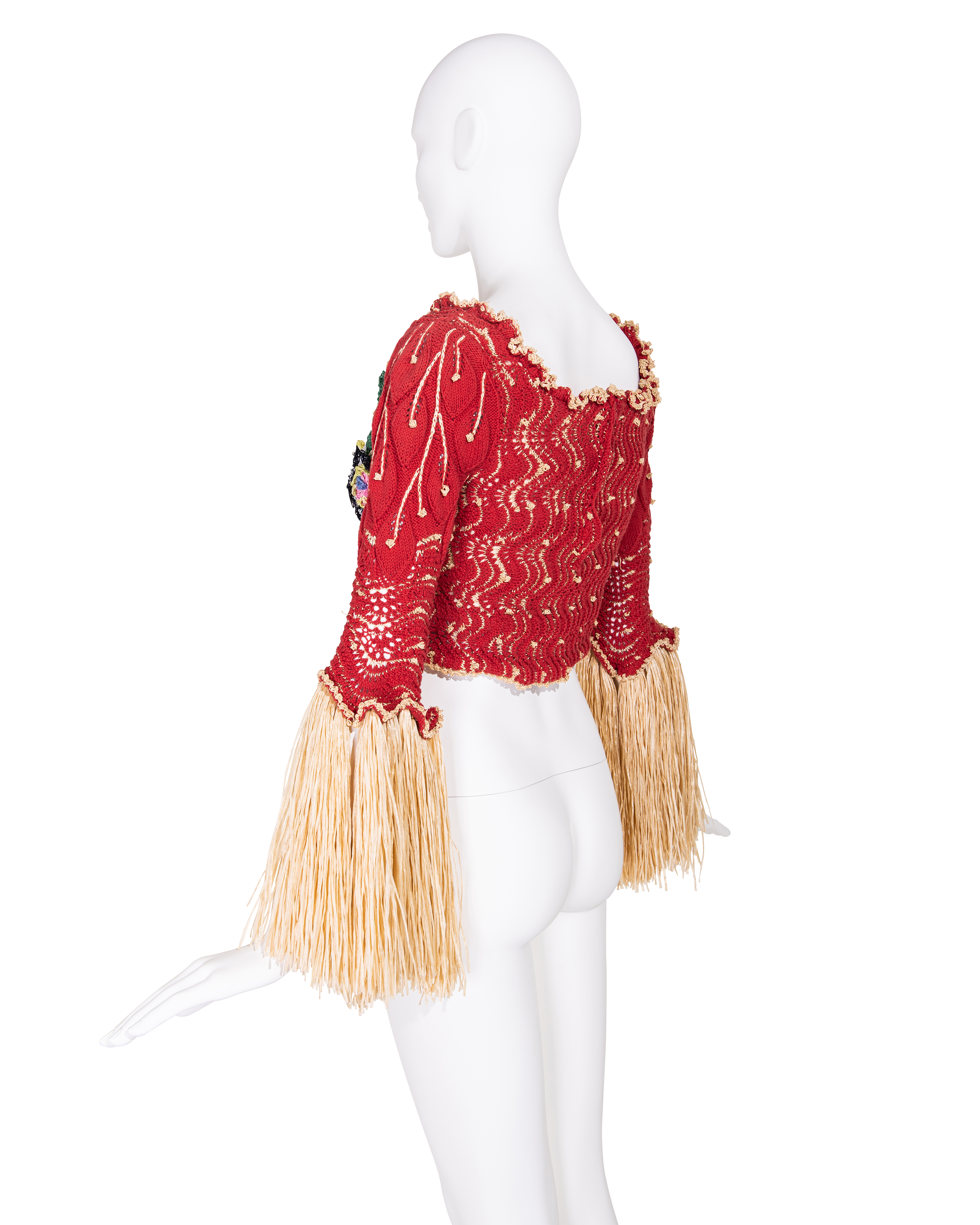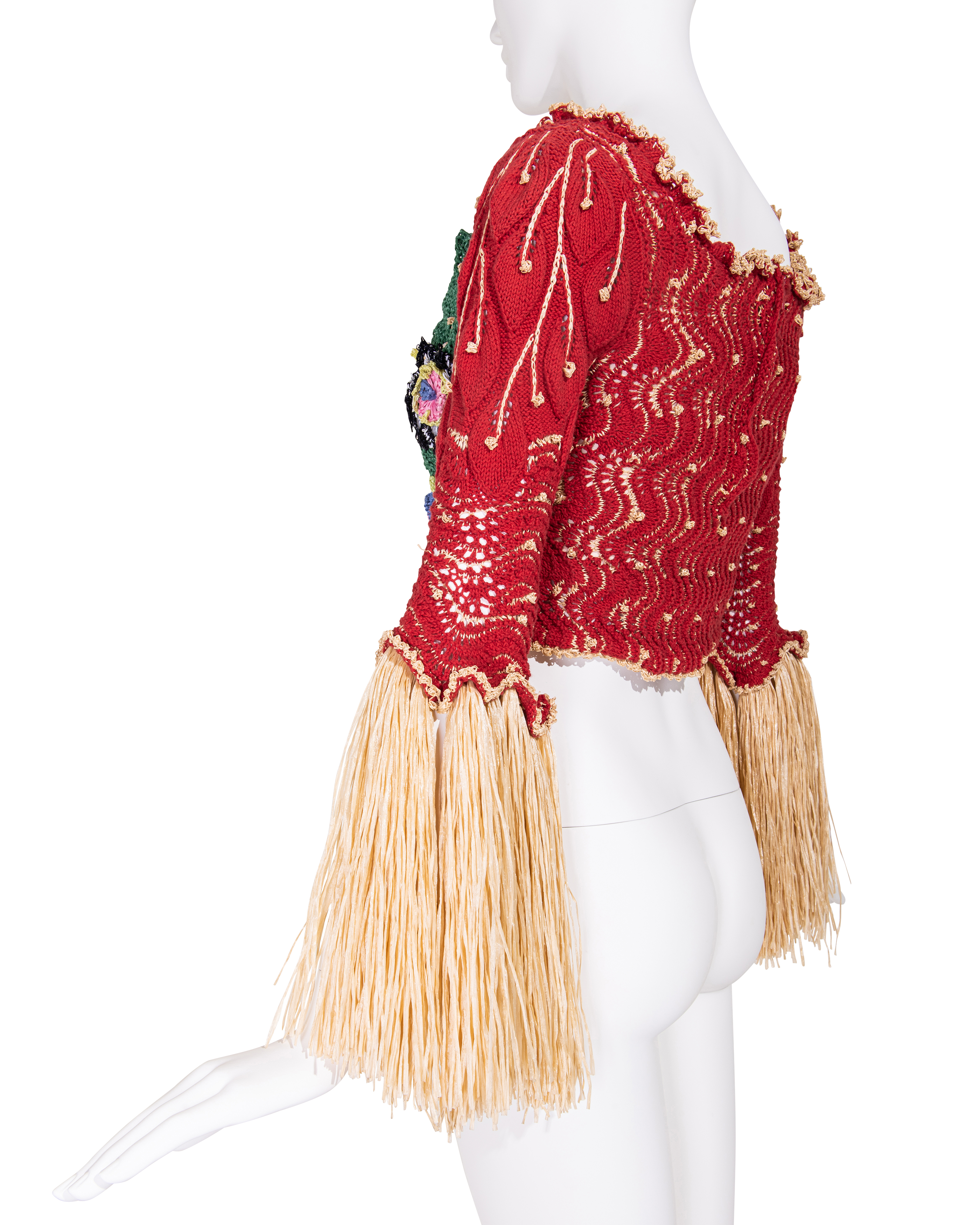 S/S 1995 Vivienne Westwood red crochet knit corset top with raffia sleeves. Scoop neck red and tan knit corset top with multicolor 3D raffia floral side-bust detailing. Concealed back zip closure. Fabric Contents: 85% Cotton, 15% Raffia - composed of specialized type of knit that Vivienne Westwood invented, employing professional crochet and knit specialists to make by hand (couture level artistry). As seen on the runway (without raffia sleeve addition). In very good vintage condition with light wear throughout. Provenance: The personal collection of a former employee of Vivienne Westwood, who worked directly with the designer in London.