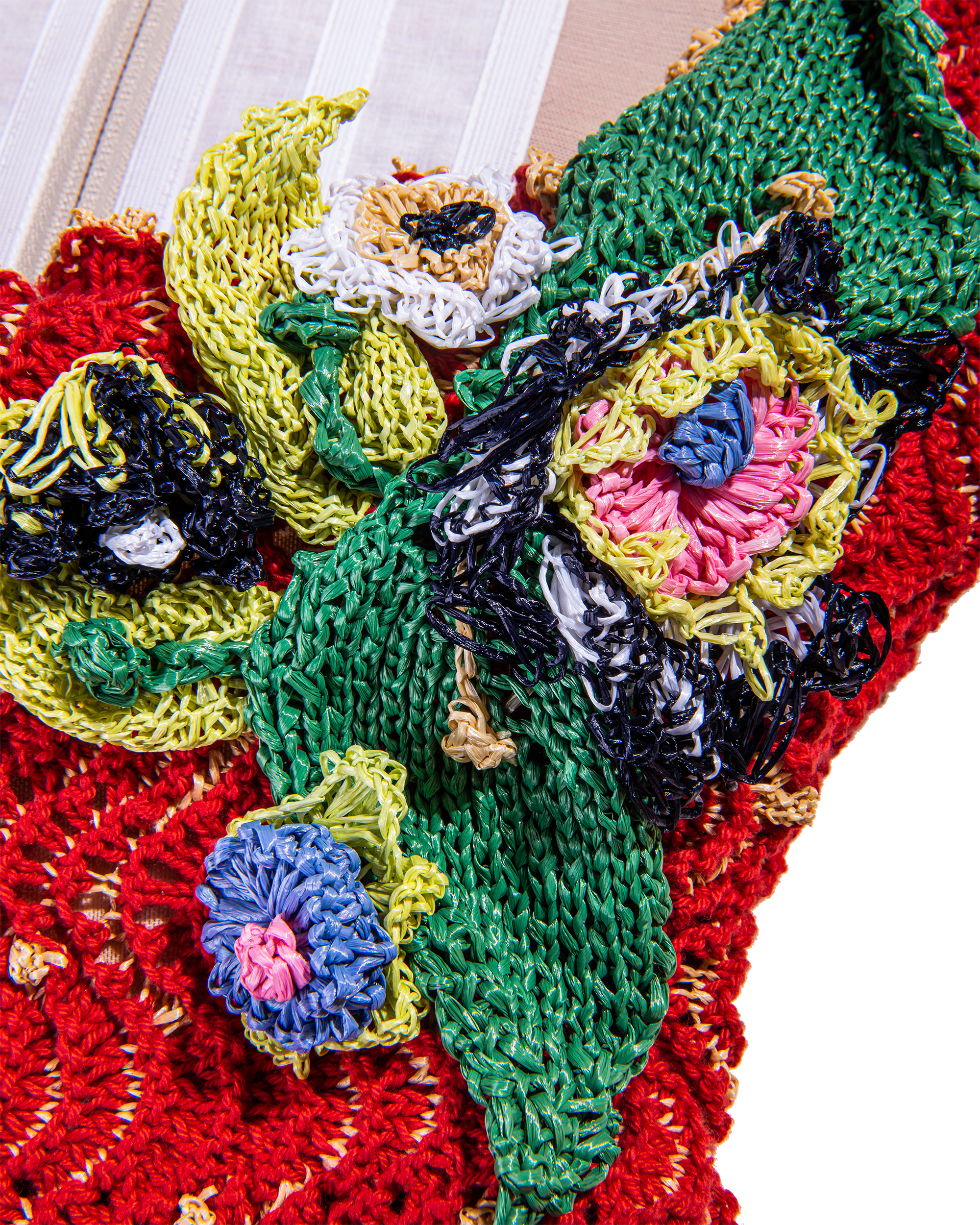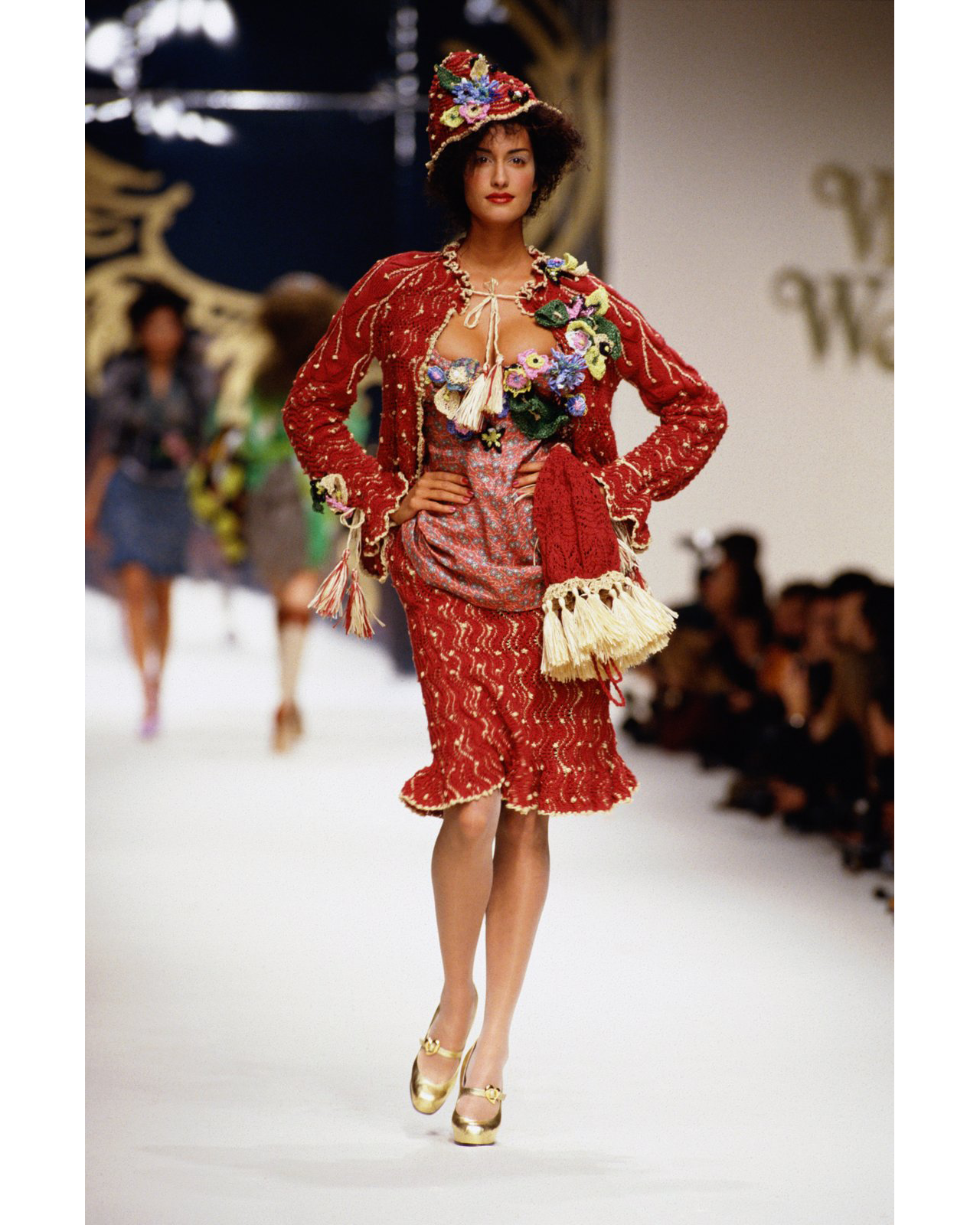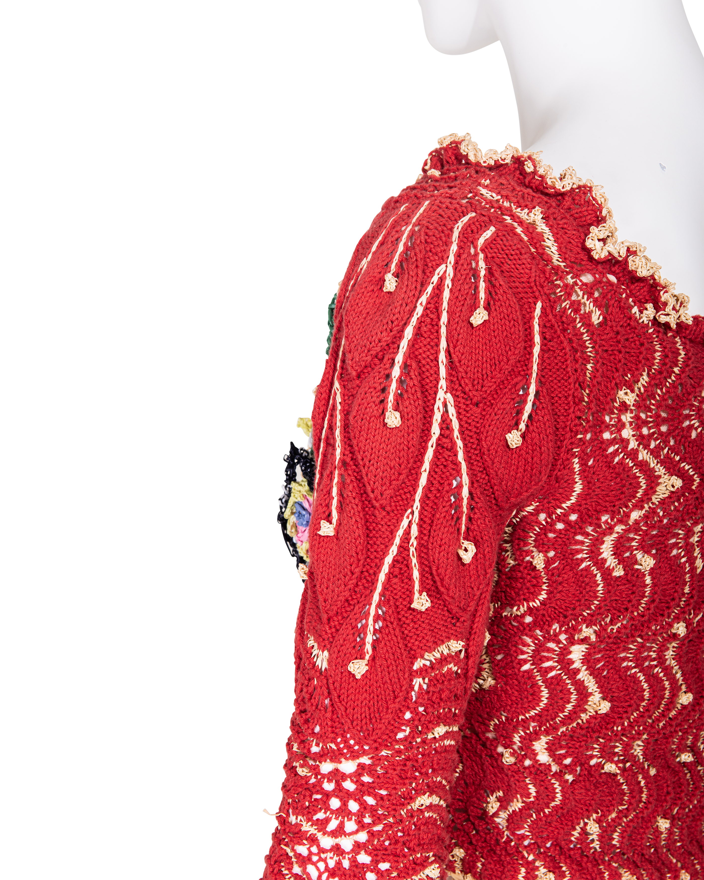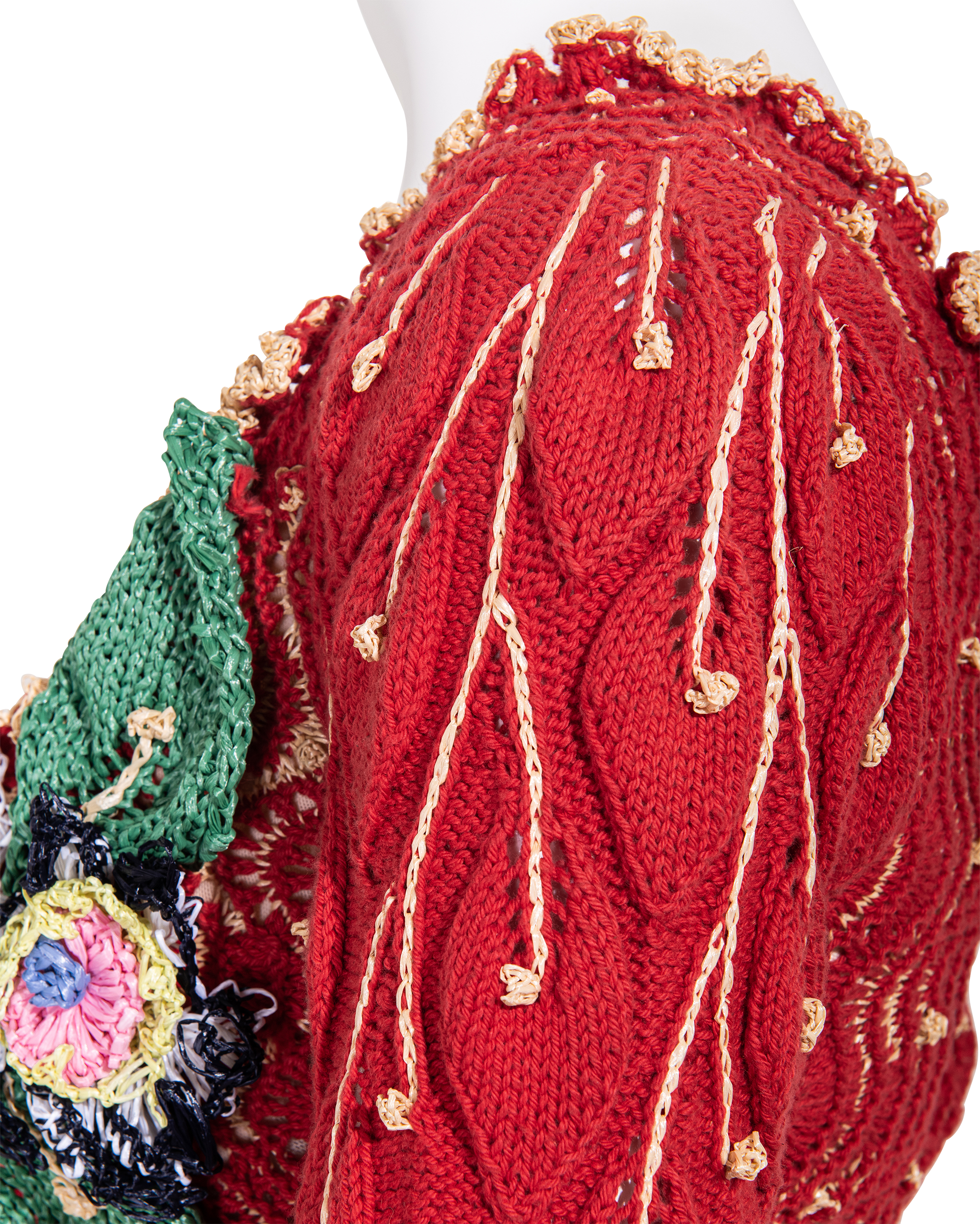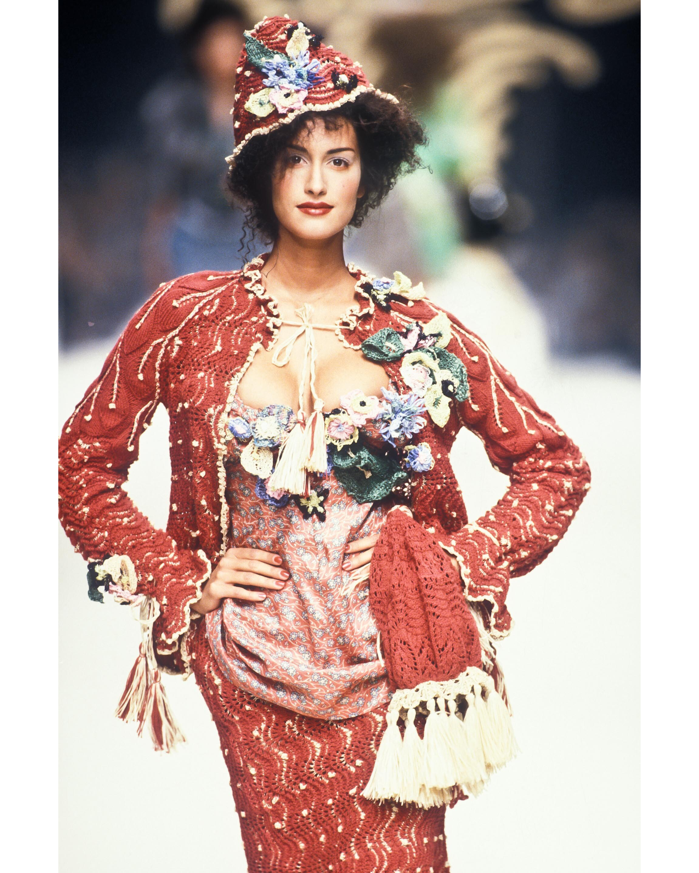 S/S 1995 Vivienne Westwood red crochet knit corset top with raffia sleeves. Scoop neck red and tan knit corset top with multicolor 3D raffia floral side-bust detailing. Concealed back zip closure. Fabric Contents: 85% Cotton, 15% Raffia - composed of specialized type of knit that Vivienne Westwood invented, employing professional crochet and knit specialists to make by hand (couture level artistry). As seen on the runway (without raffia sleeve addition). In very good vintage condition with light wear throughout. Provenance: The personal collection of a former employee of Vivienne Westwood, who worked directly with the designer in London.