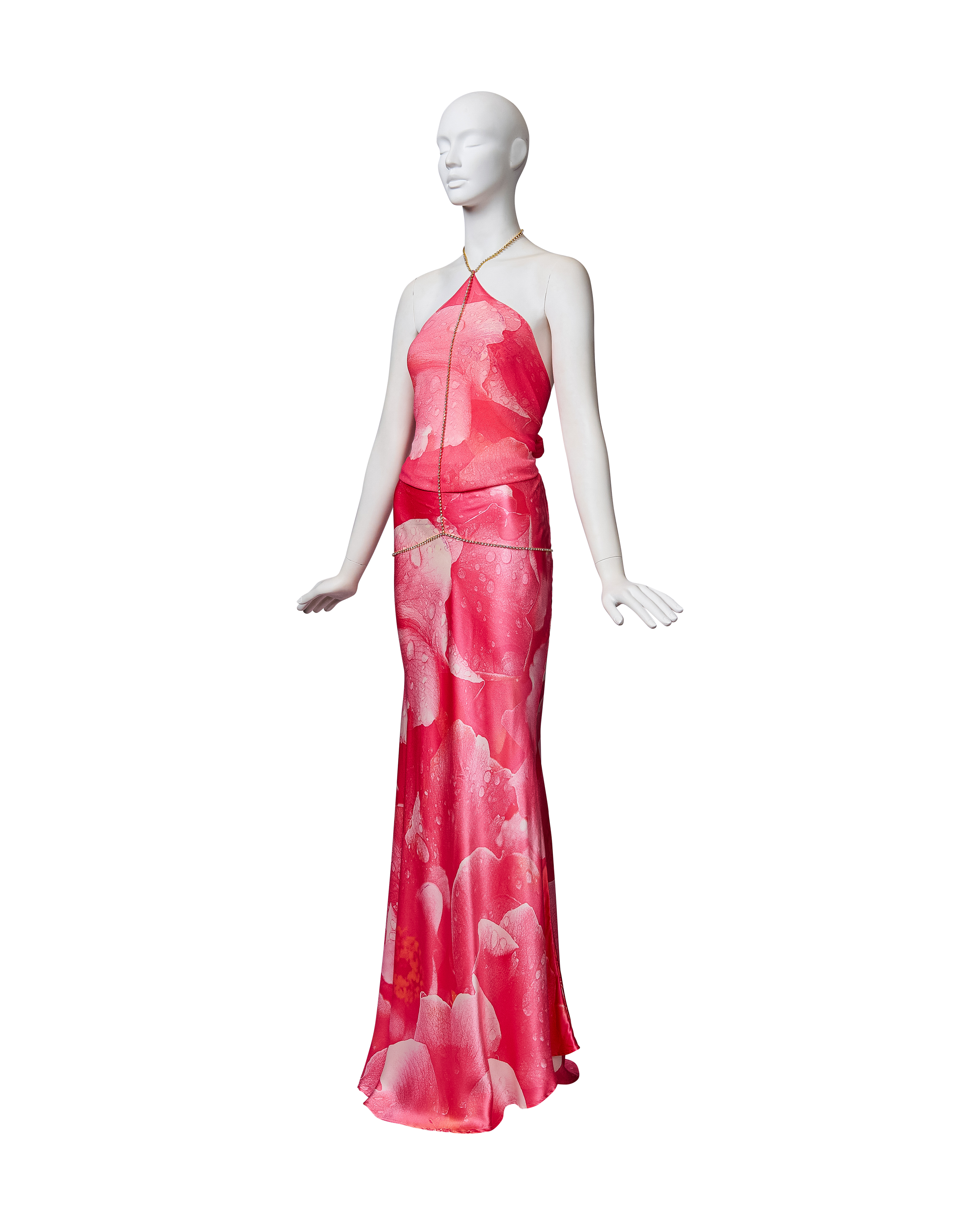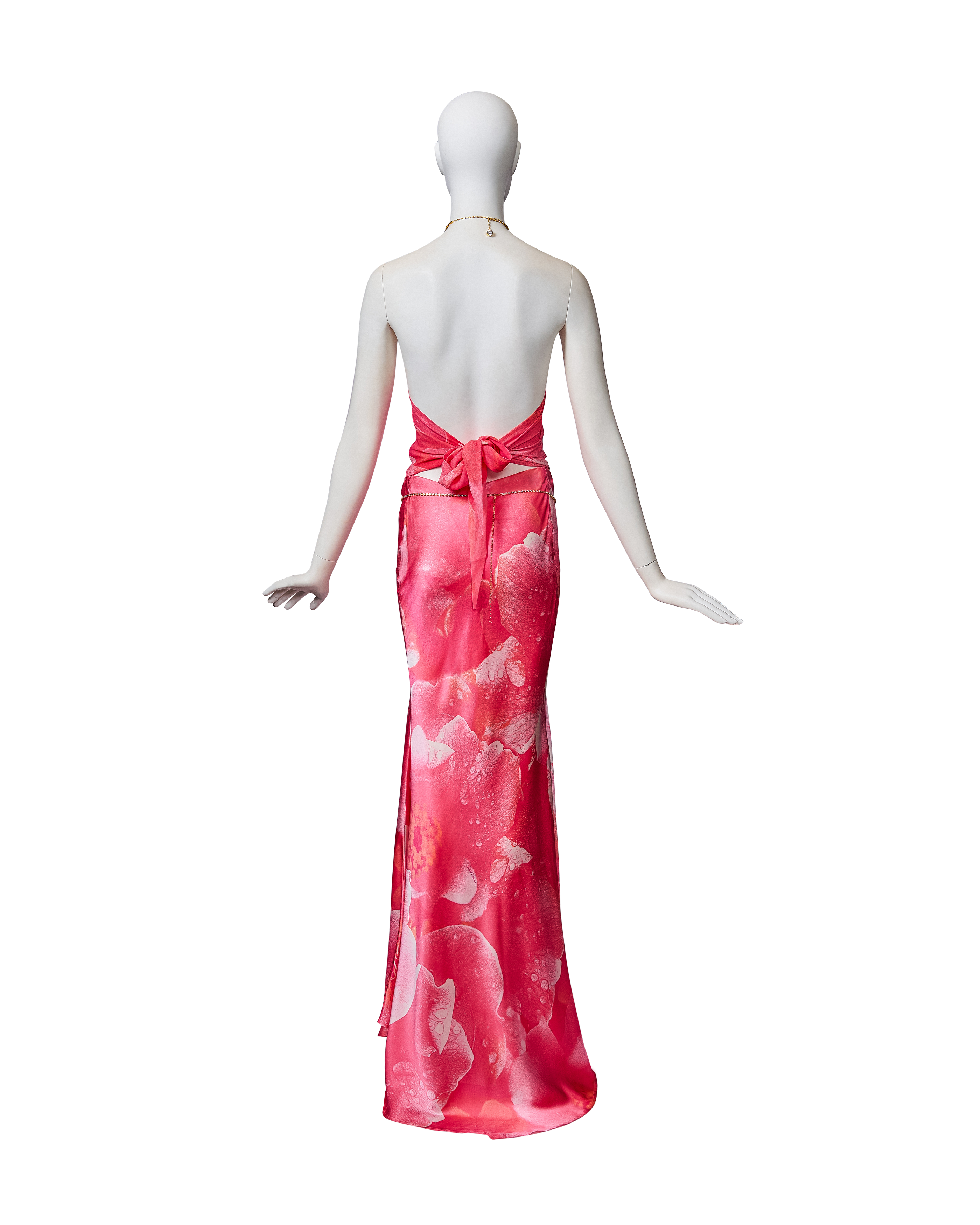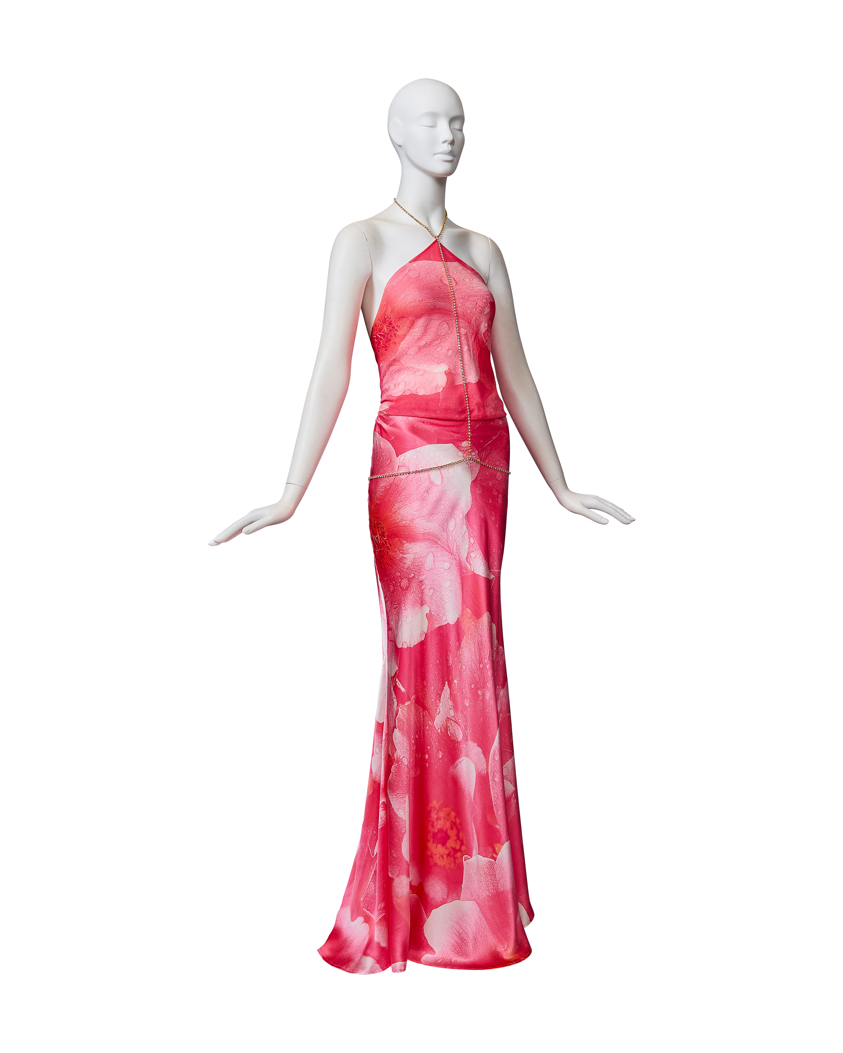 S/S 2000 Roberto Cavalli pink patterned halter gown and built-in body chain. Pink floral rose pattern with dewdrop motif, with gold-tone rhinestone built-in chain halter at center of body that wraps around low hip (lobster clasps at nape of neck and at hip for ease of wear, with oversized rhinestone detail at nape of neck). Semi-open back with back tie closure and elasticized interior at back to adhere to body when worn, with slight drop waist effect and asymmetrical train - note that train is longer on right side. Dress features subtle 'Roberto Cavalli' cursive signature throughout pattern. As seen on the runway on Alek Wek (Look #59), and featured on Hannelore Knuts for Vogue Italia's March 2000 issue (photographed by Steven Meisel). In excellent vintage condition with no flaws to note.