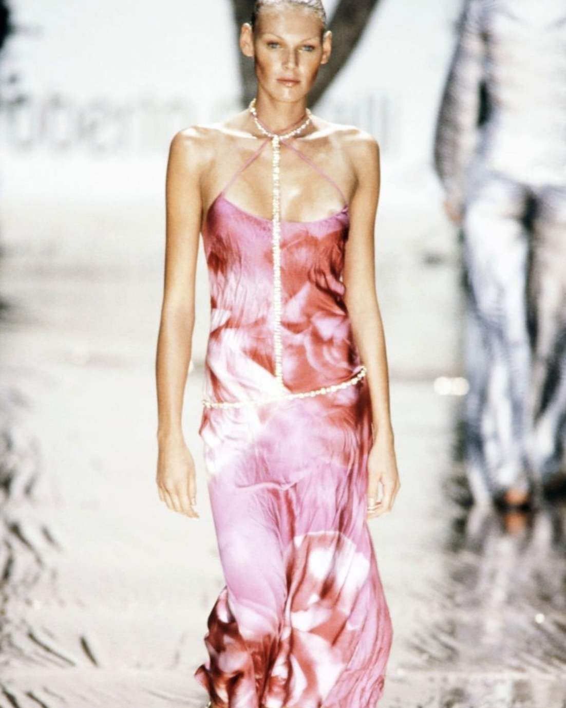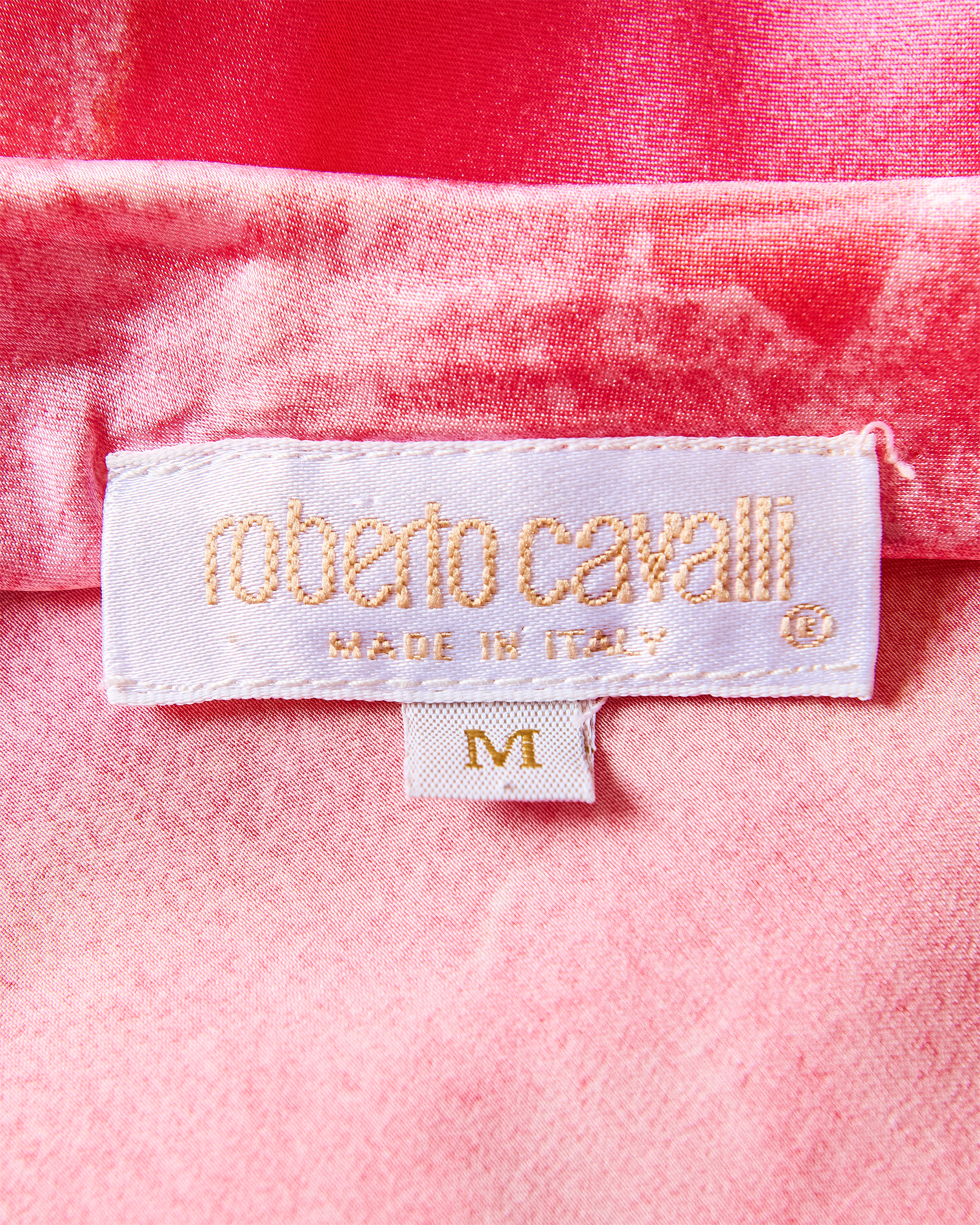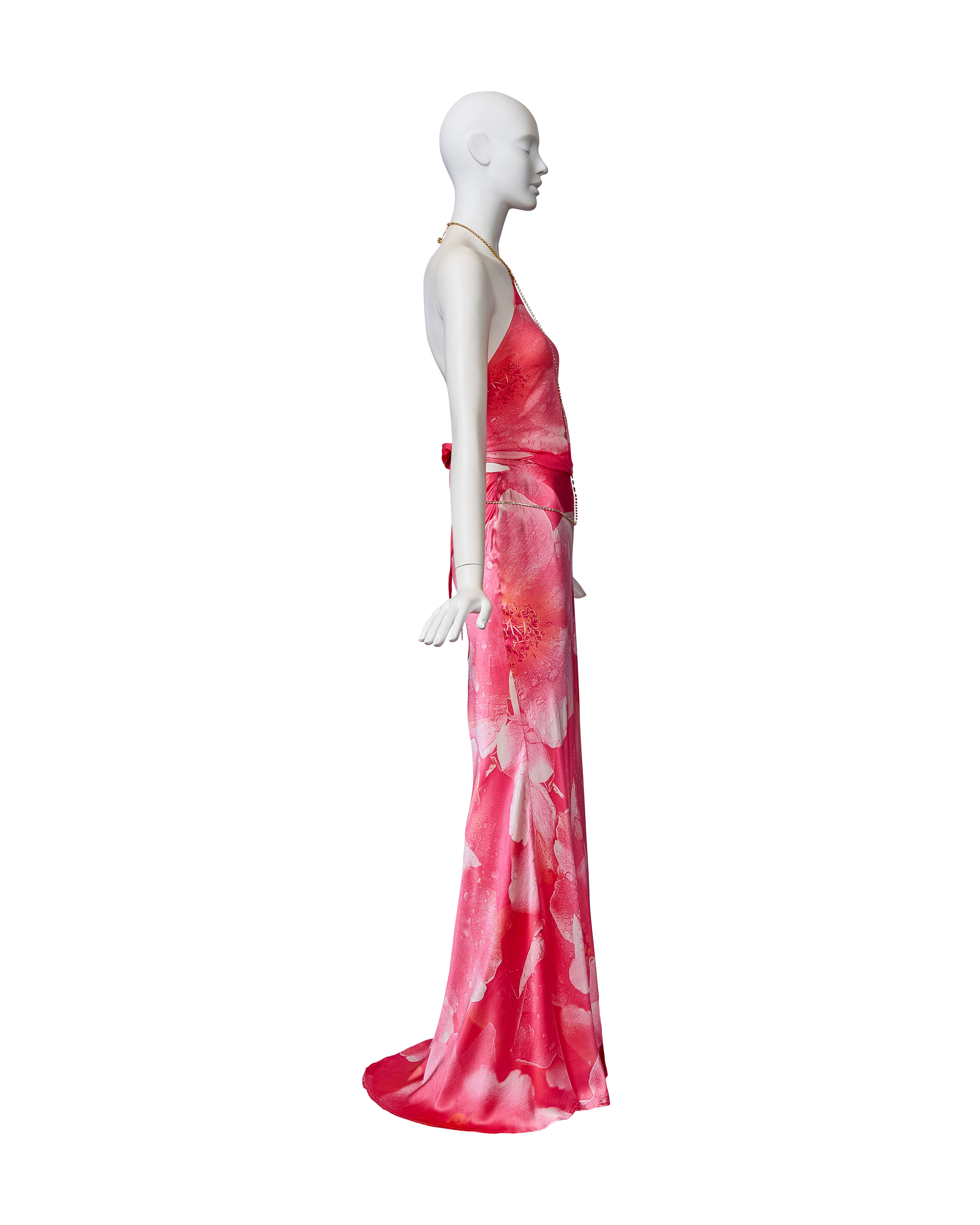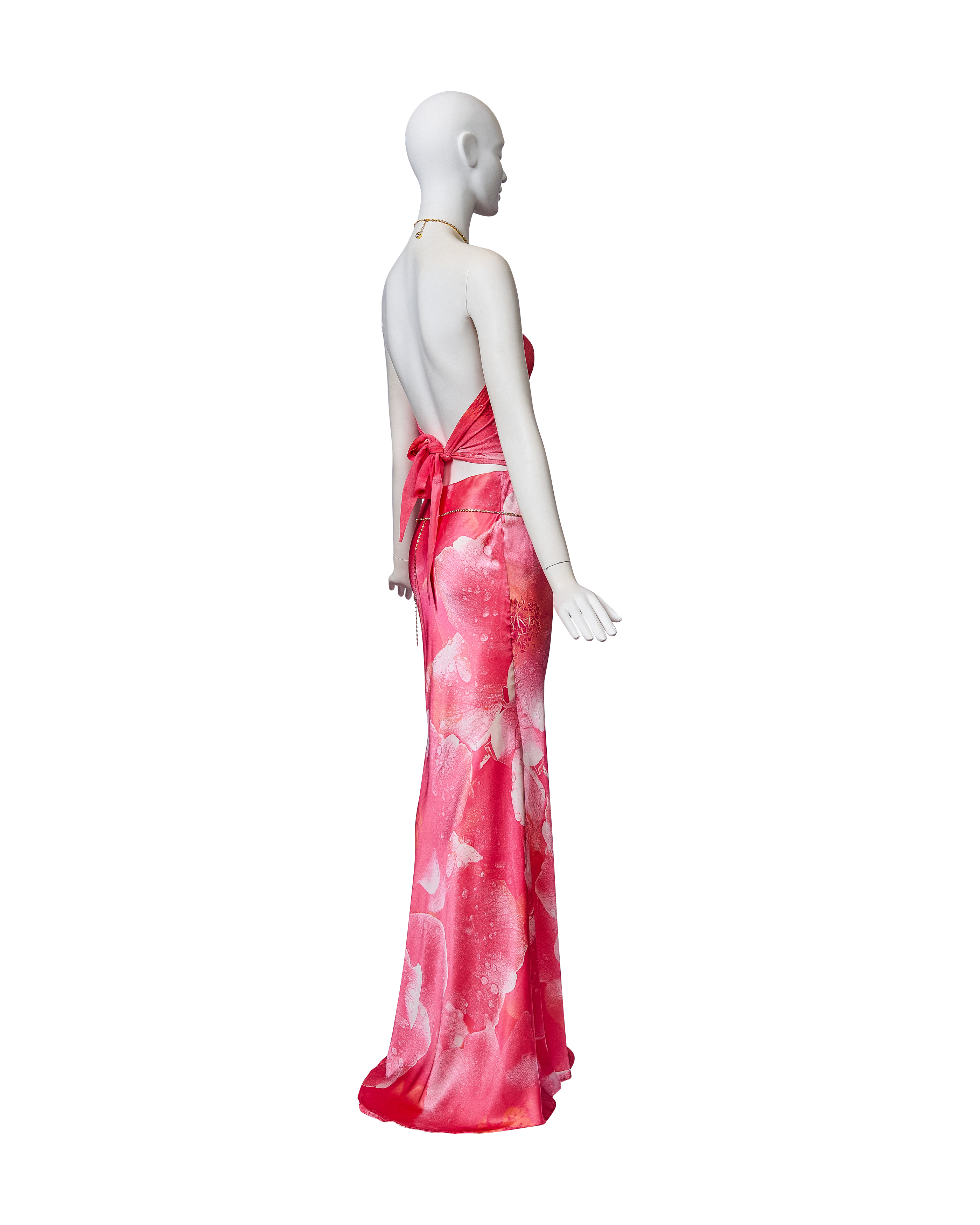 S/S 2000 Roberto Cavalli pink patterned halter gown and built-in body chain. Pink floral rose pattern with dewdrop motif, with gold-tone rhinestone built-in chain halter at center of body that wraps around low hip (lobster clasps at nape of neck and at hip for ease of wear, with oversized rhinestone detail at nape of neck). Semi-open back with back tie closure and elasticized interior at back to adhere to body when worn, with slight drop waist effect and asymmetrical train - note that train is longer on right side. Dress features subtle 'Roberto Cavalli' cursive signature throughout pattern. As seen on the runway on Alek Wek (Look #59), and featured on Hannelore Knuts for Vogue Italia's March 2000 issue (photographed by Steven Meisel). In excellent vintage condition with no flaws to note.