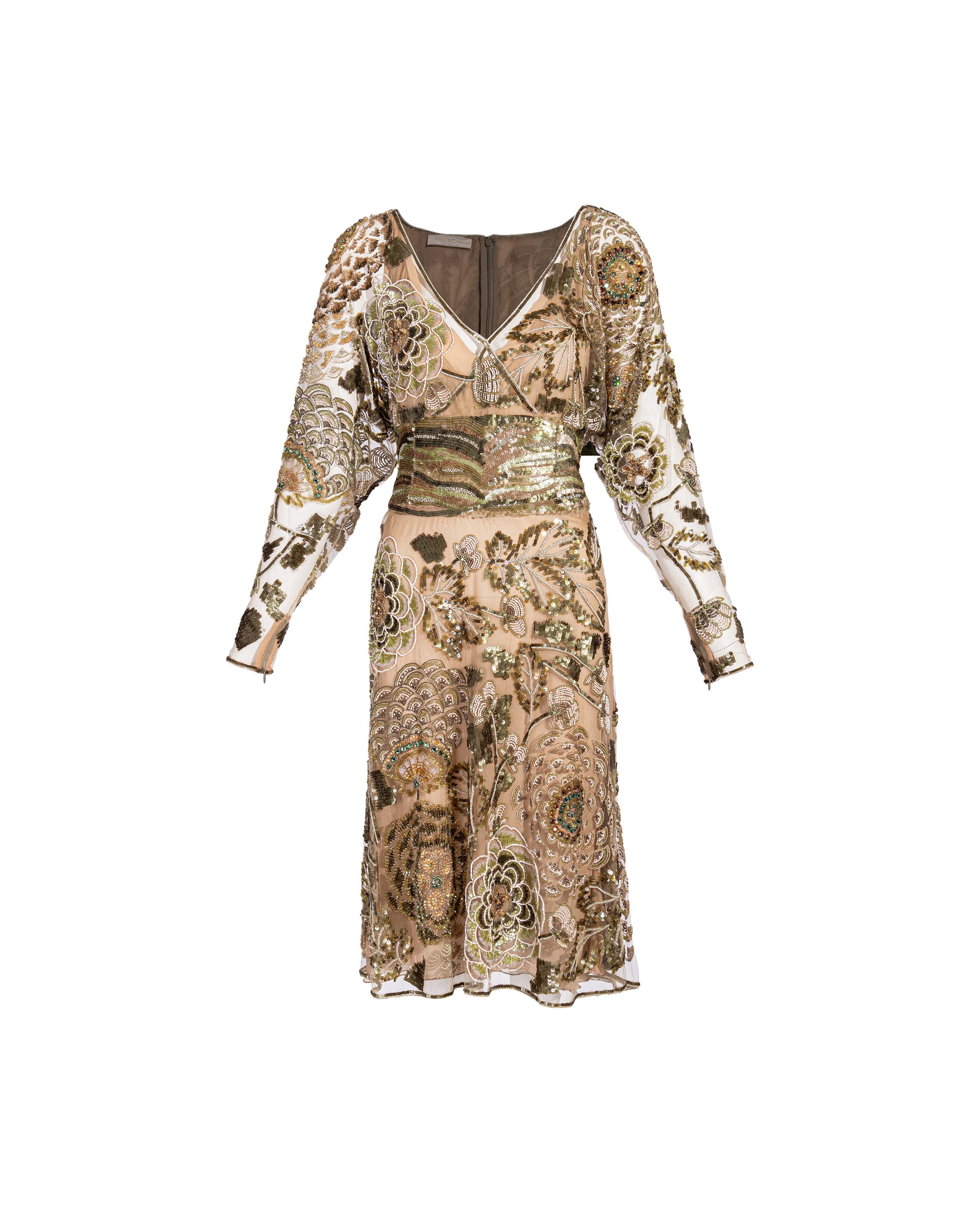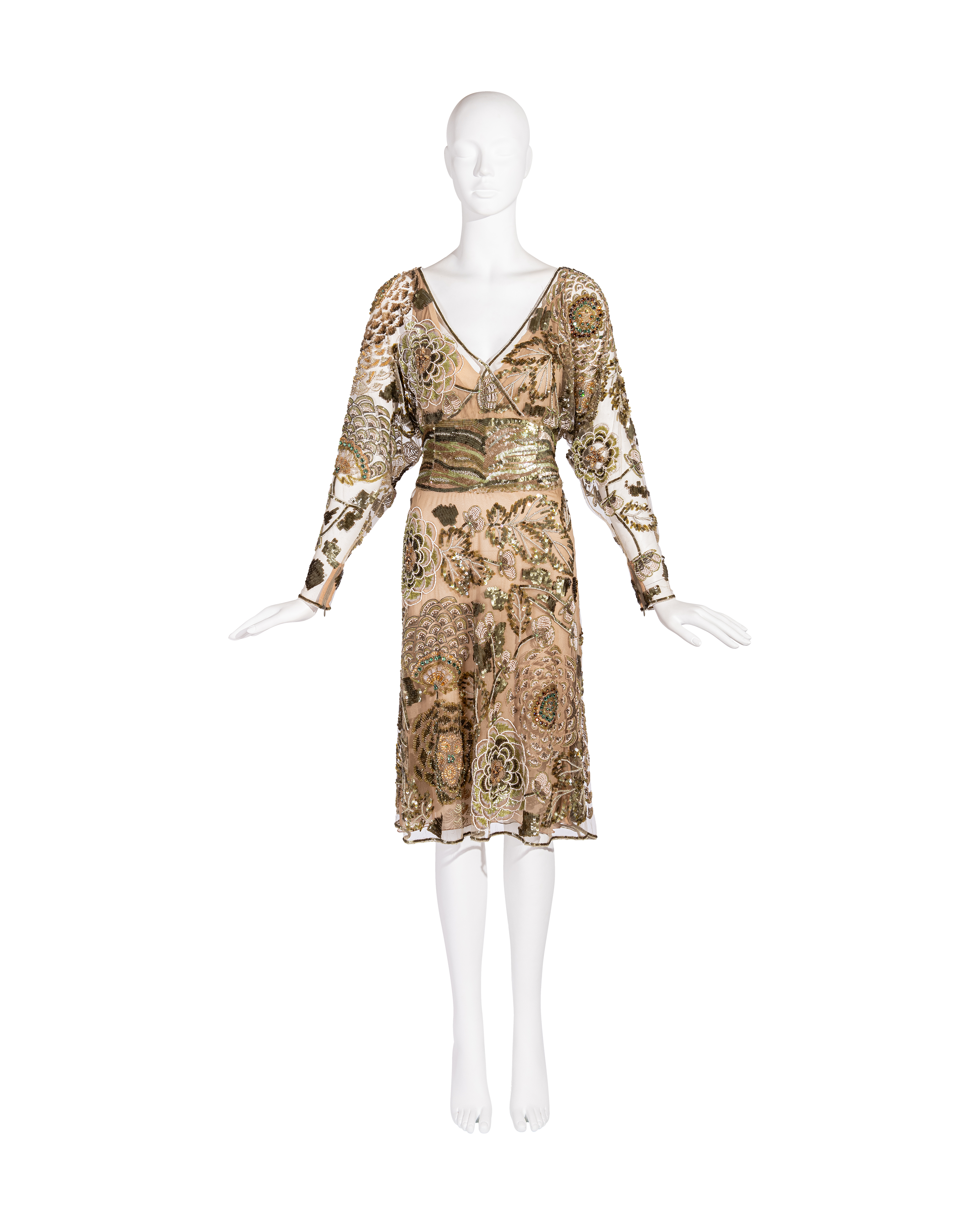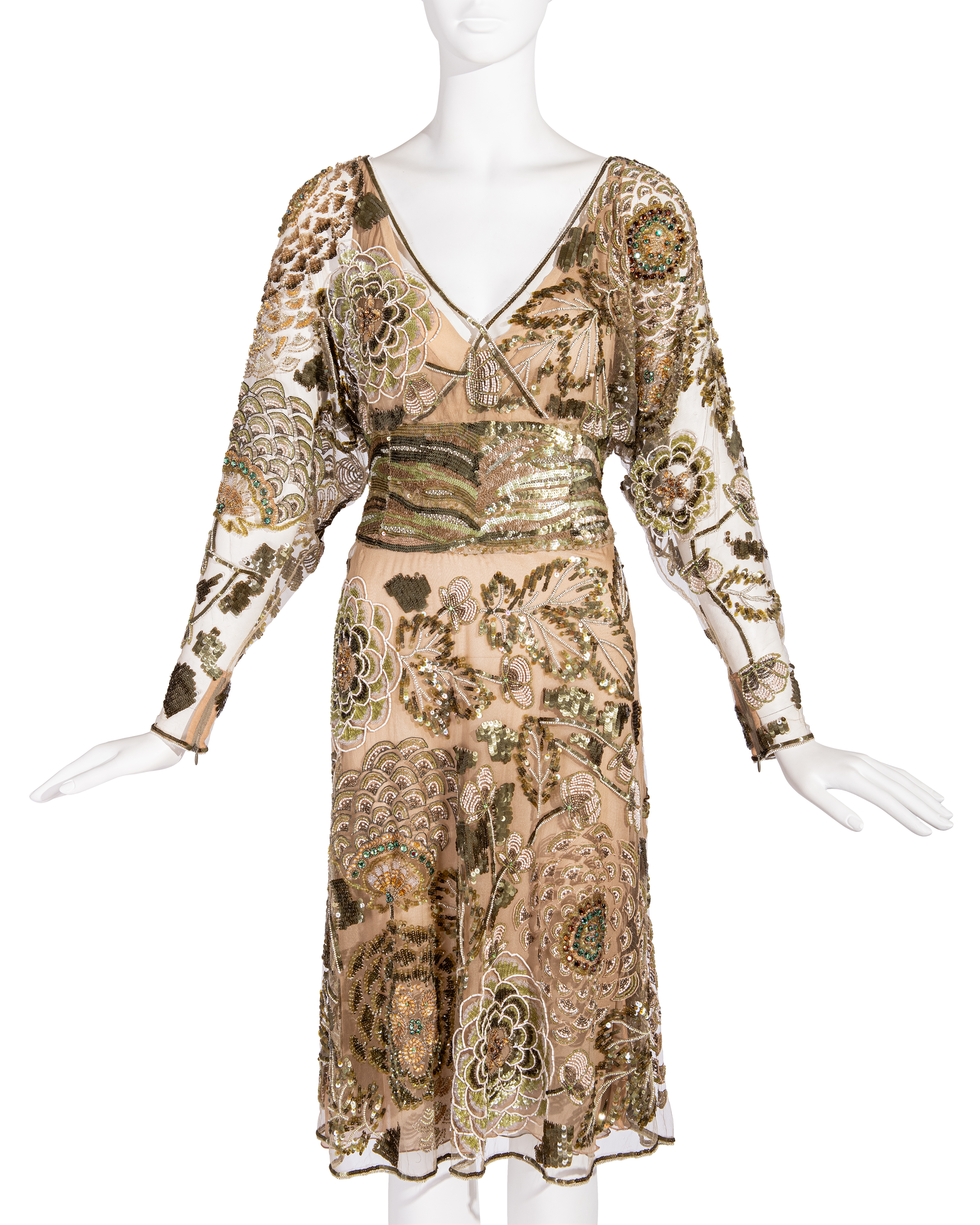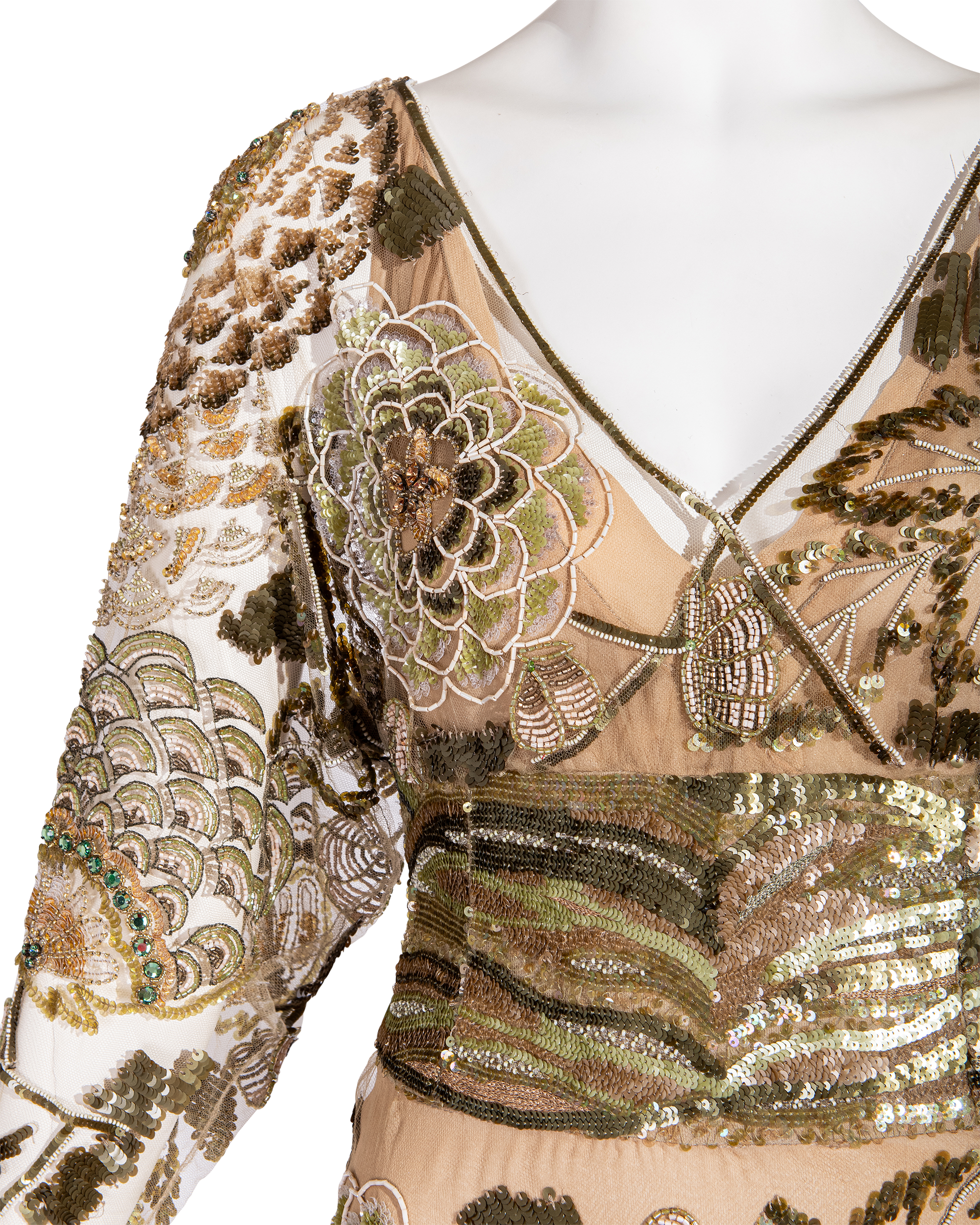 S/S 2003 Valentino heavily embellished long sleeve dress. Heavily embroidered, intricate green leaf and floral pattern long sleeve knee length dress with sequin and beaded embellished details. Dress is lined with light tan lining, with exception of at sleeves (which have slight dolman silhouette). Back zip closure and small zip closures at wrists for ease of wear. Unlined version featured on the runway on Delfine Bafort (Look 19). Fabric contents unlisted; feels like mesh exterior with silk chiffon lining. In very good vintage condition with light wear throughout, including very few missing embellishments (unnoticeable when worn).