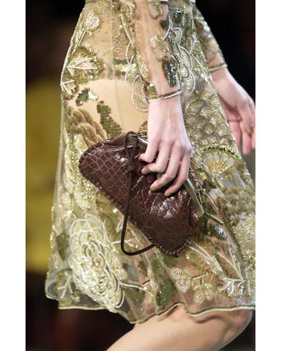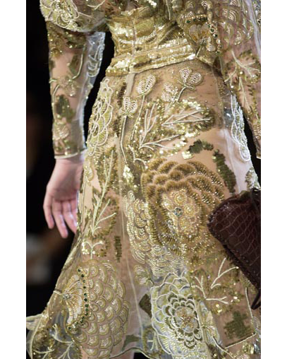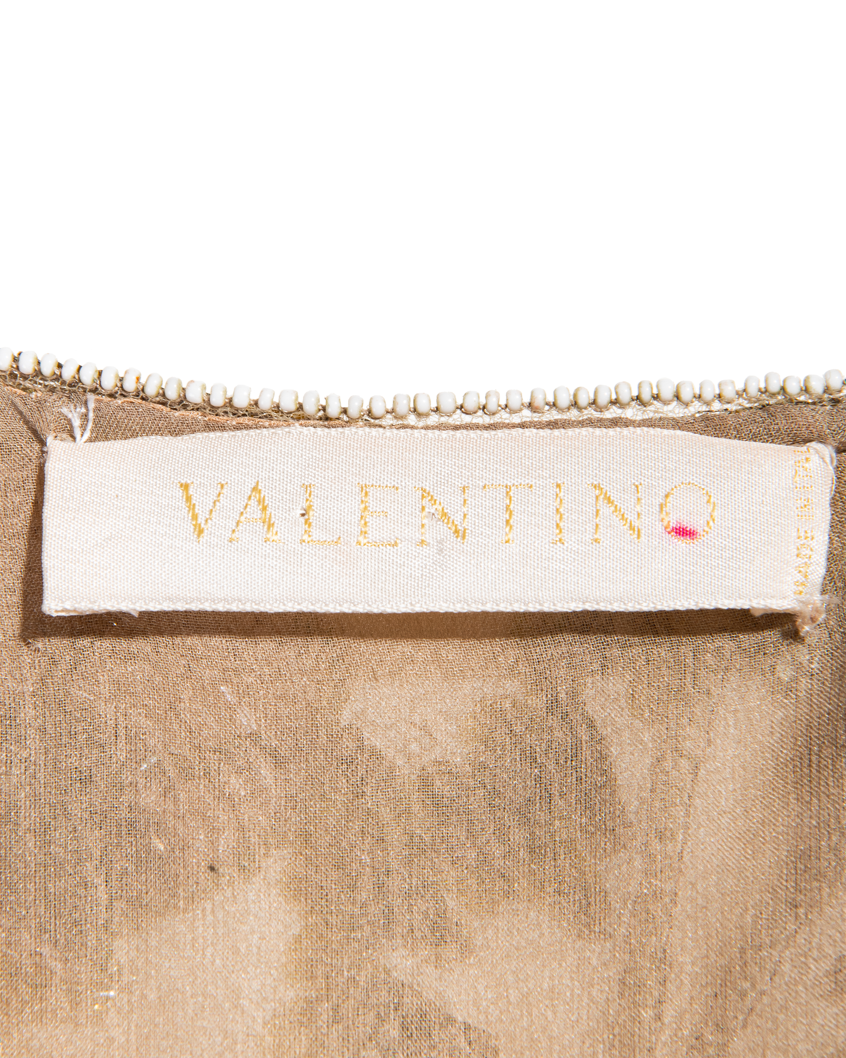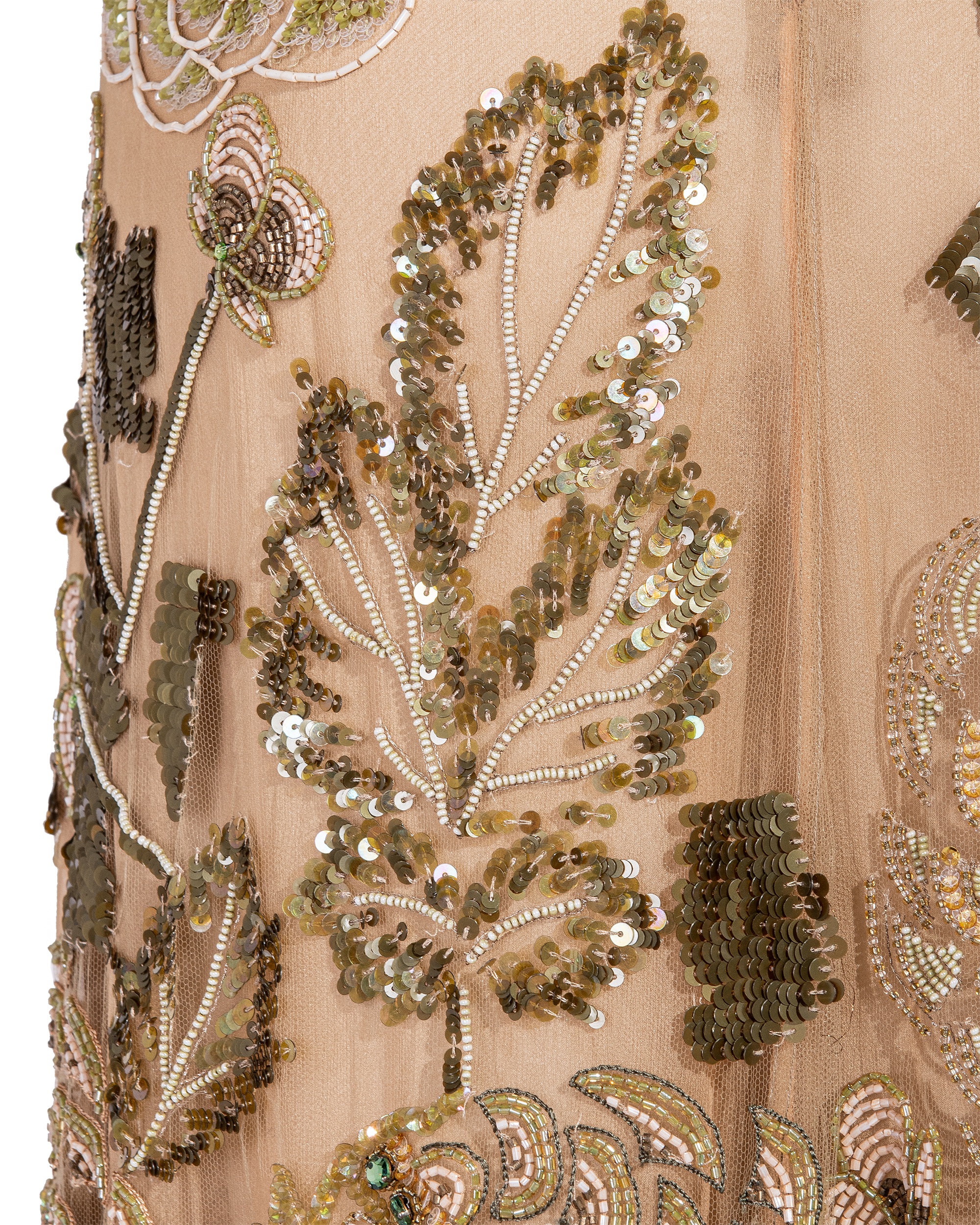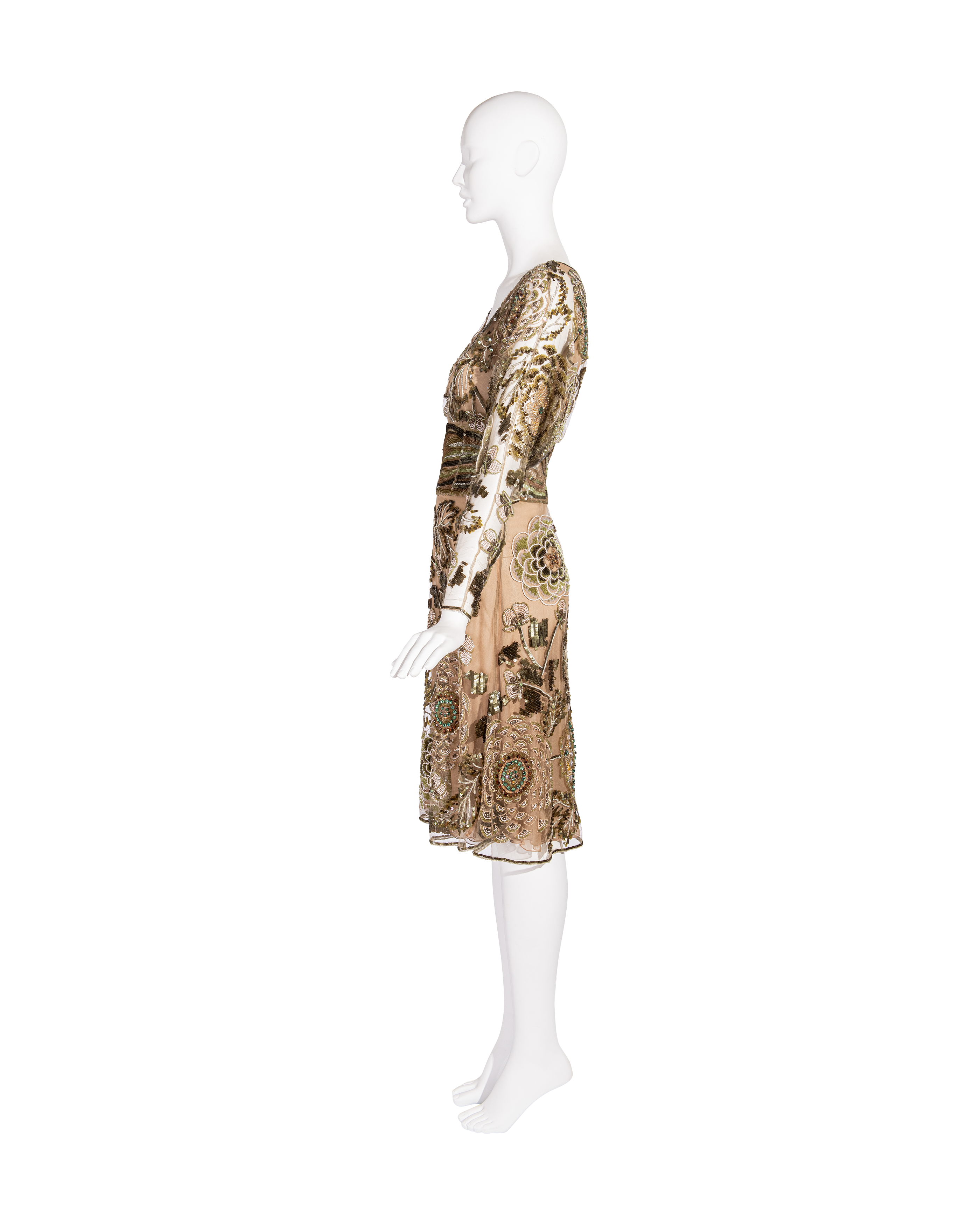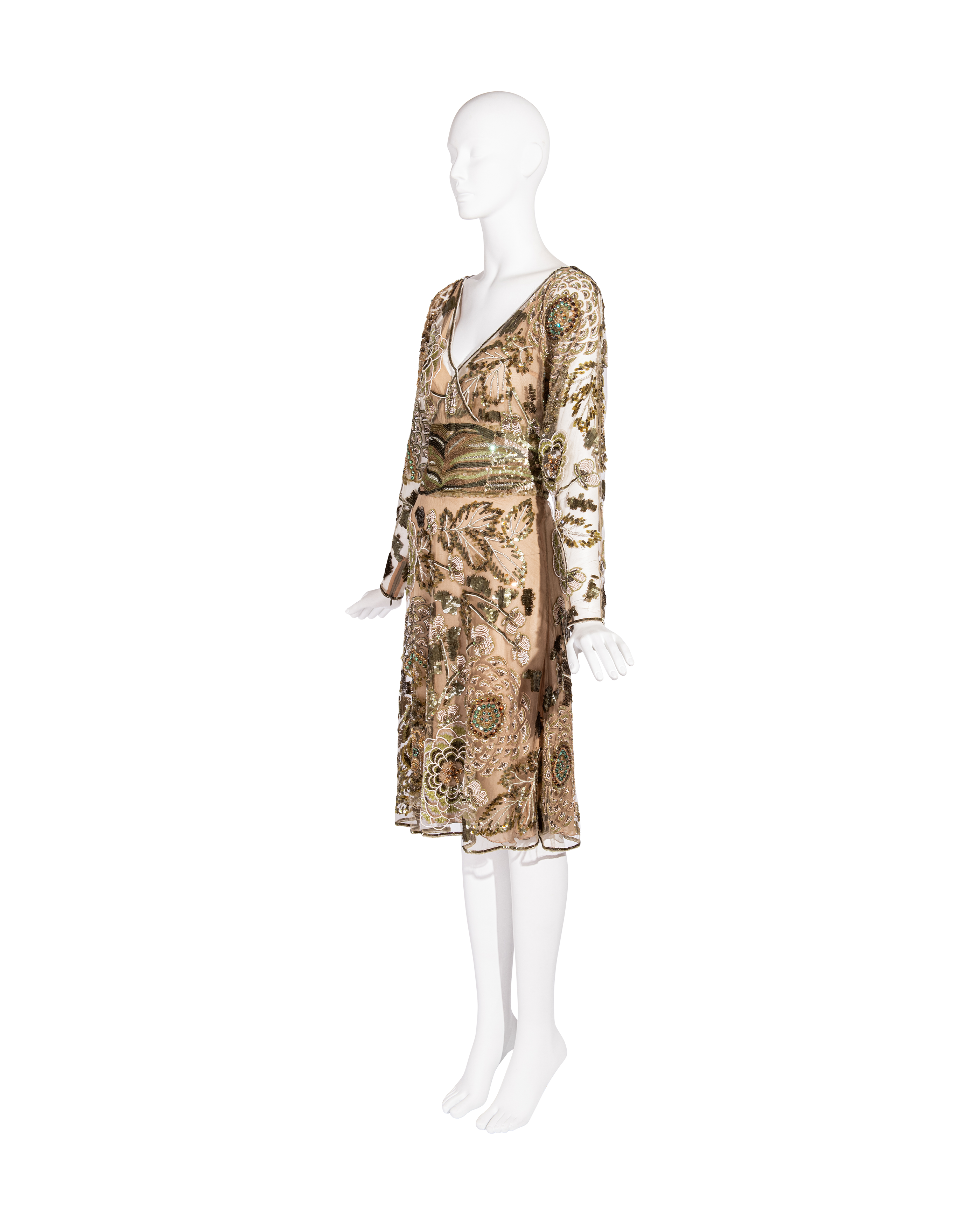S/S 2003 Valentino heavily embellished long sleeve dress. Heavily embroidered, intricate green leaf and floral pattern long sleeve knee length dress with sequin and beaded embellished details. Dress is lined with light tan lining, with exception of at sleeves (which have slight dolman silhouette). Back zip closure and small zip closures at wrists for ease of wear. Unlined version featured on the runway on Delfine Bafort (Look 19). Fabric contents unlisted; feels like mesh exterior with silk chiffon lining. In very good vintage condition with light wear throughout, including very few missing embellishments (unnoticeable when worn).