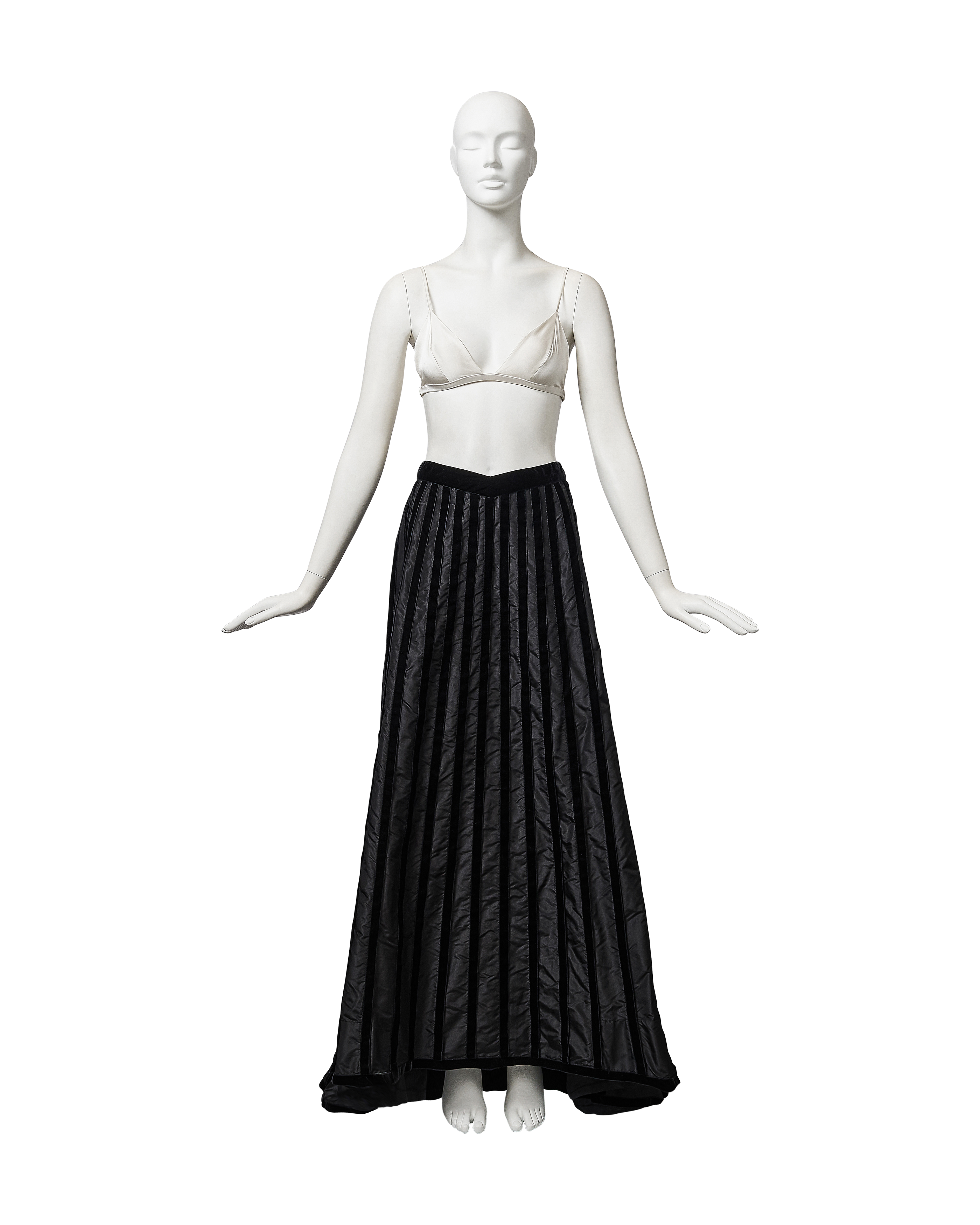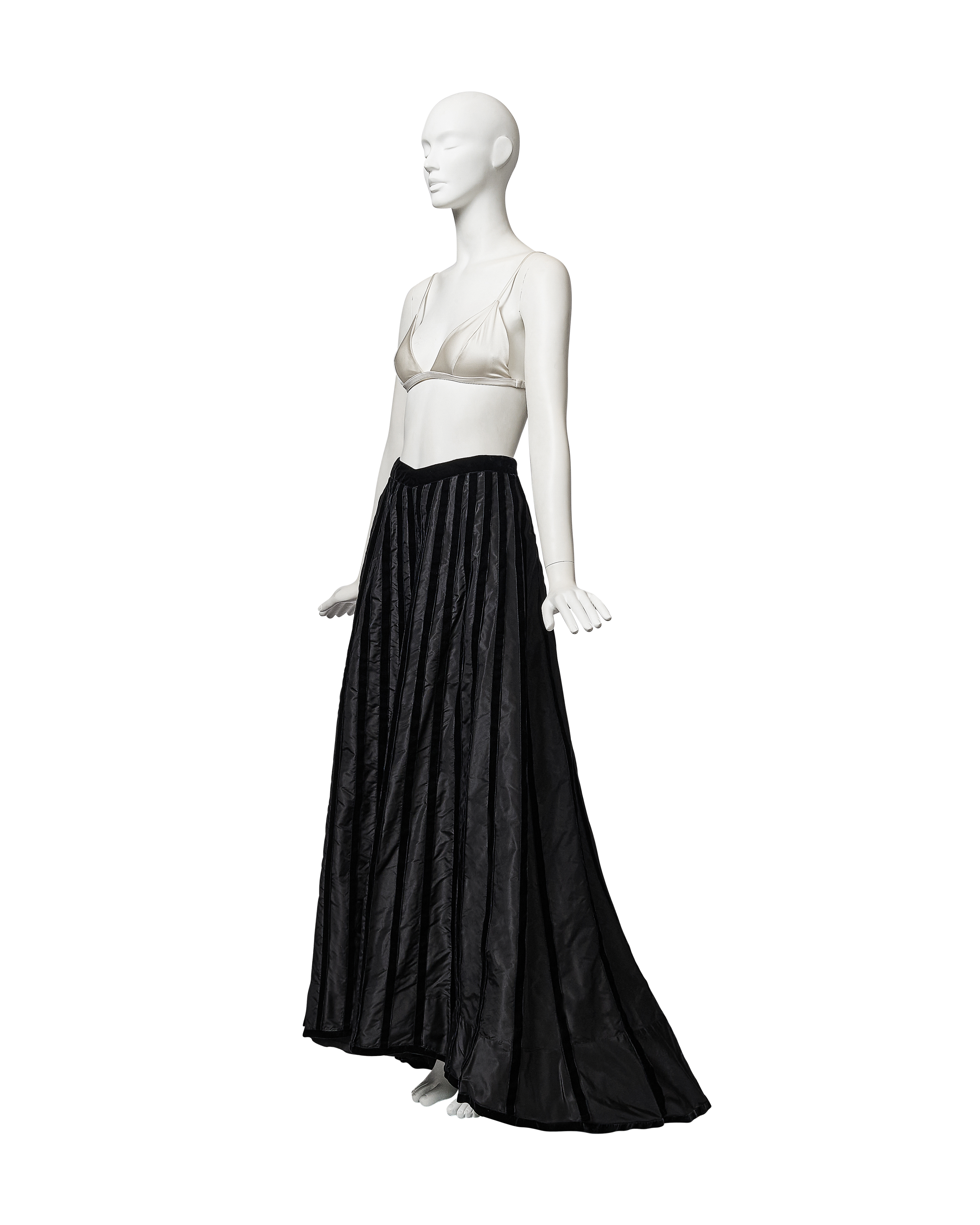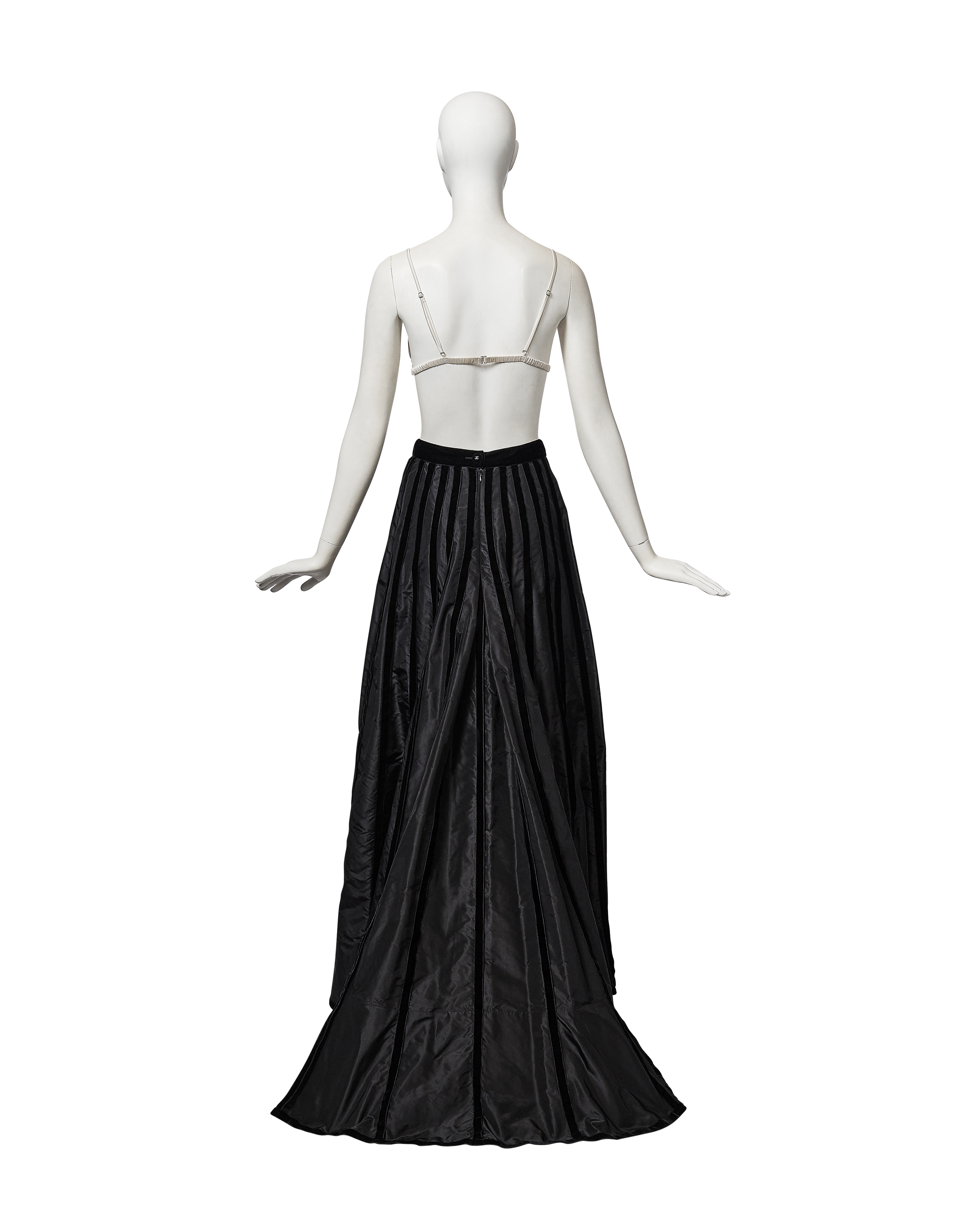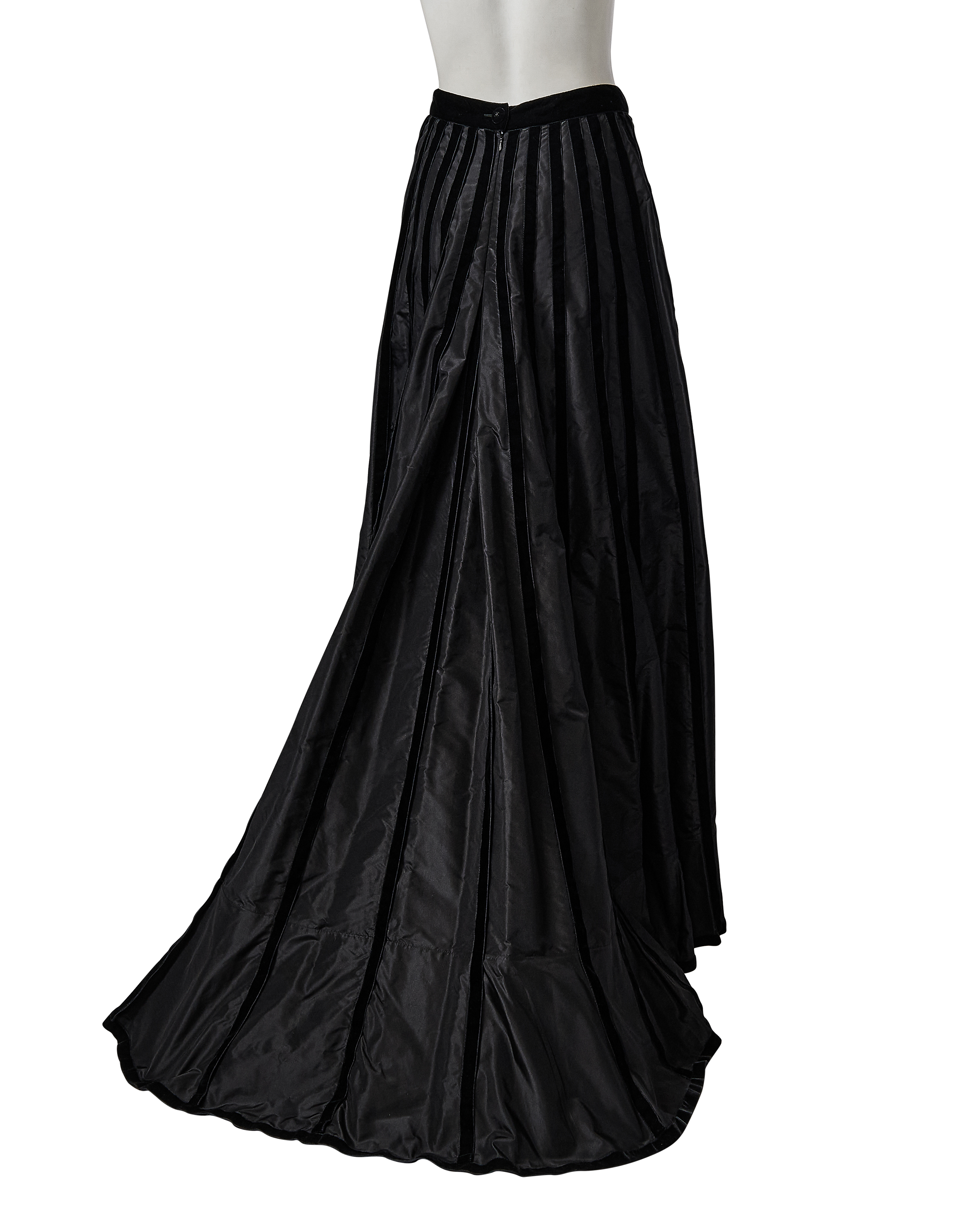 A/W 1998 Chanel by Karl Lagerfeld black velvet paneled skirt with train. Back maxi skirt with contrasting silk taffeta and black velvet raised paneling that creates vertical striped effect when worn. Very slight 'v' at waist flatters the body when worn. Concealed back zip closure with 'CC' logo velvet button closure at back waist. Skirt has moderate court train that creates beautiful movement when worn. Fabric Contents: 100% Silk (lined with Silk lining at interior). Rare skirt as seen on the runway. In very good vintage condition with light spotting at hemline (unnoticeable when worn). Styled with white bra top for e-commerce purposes only; not included with purchase.
