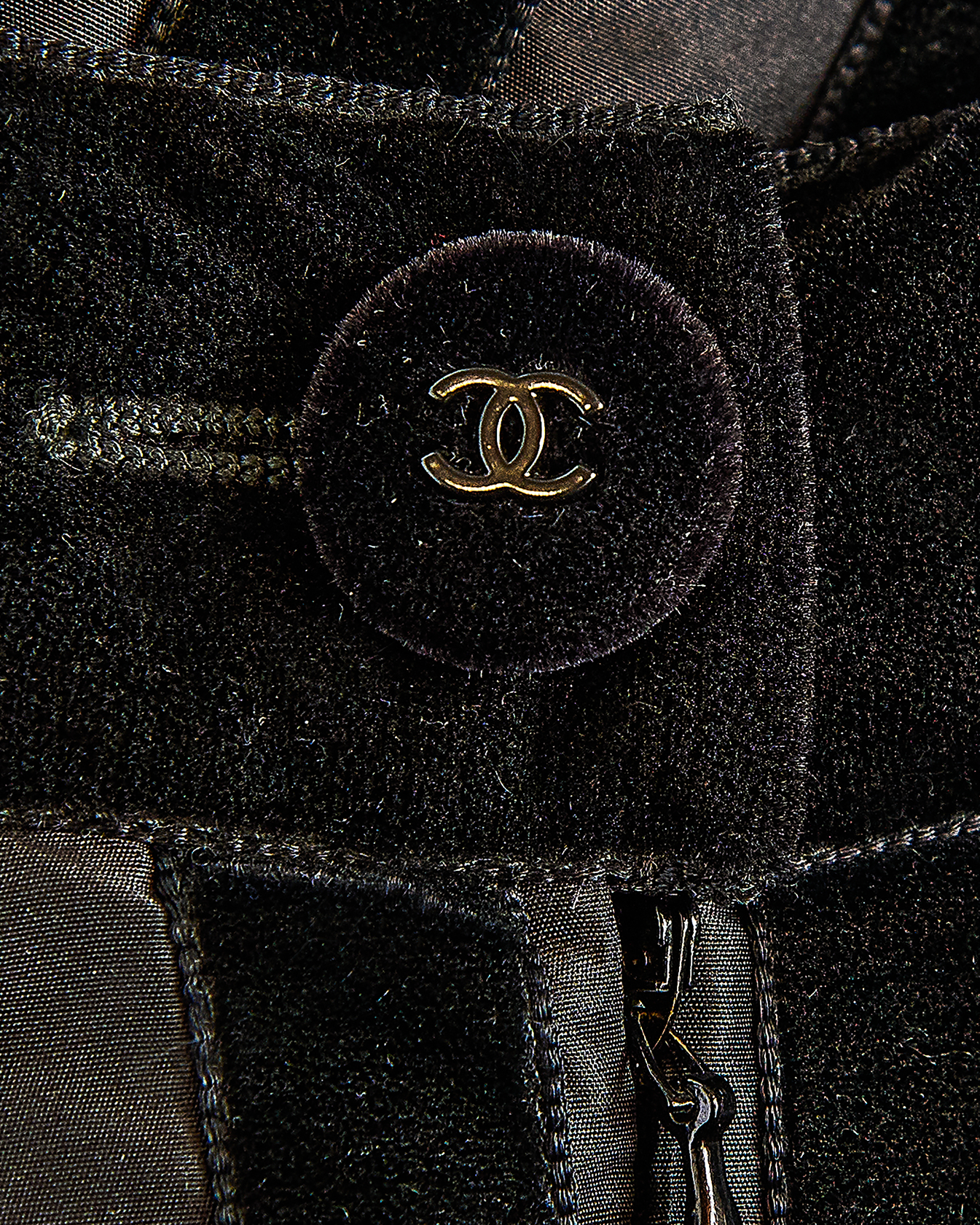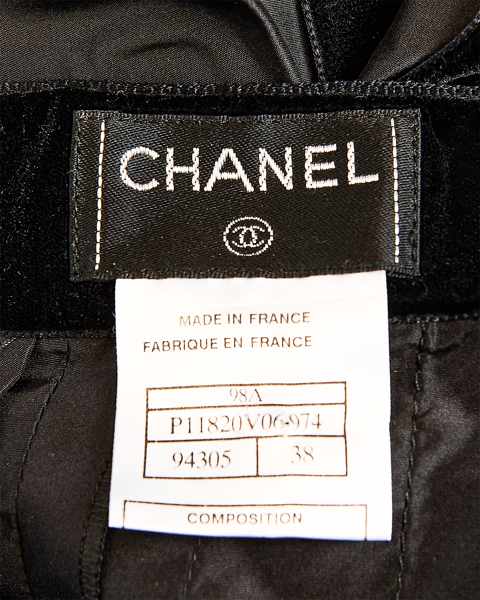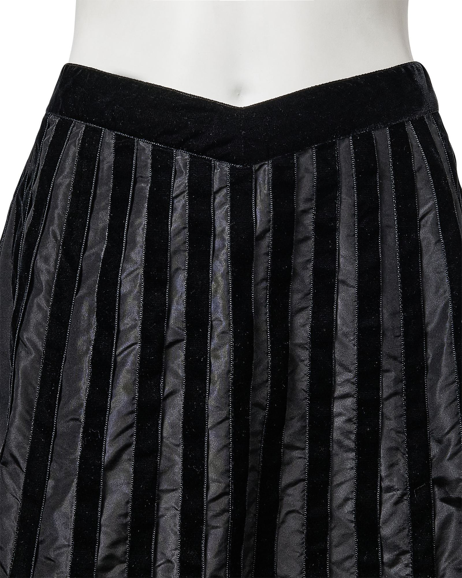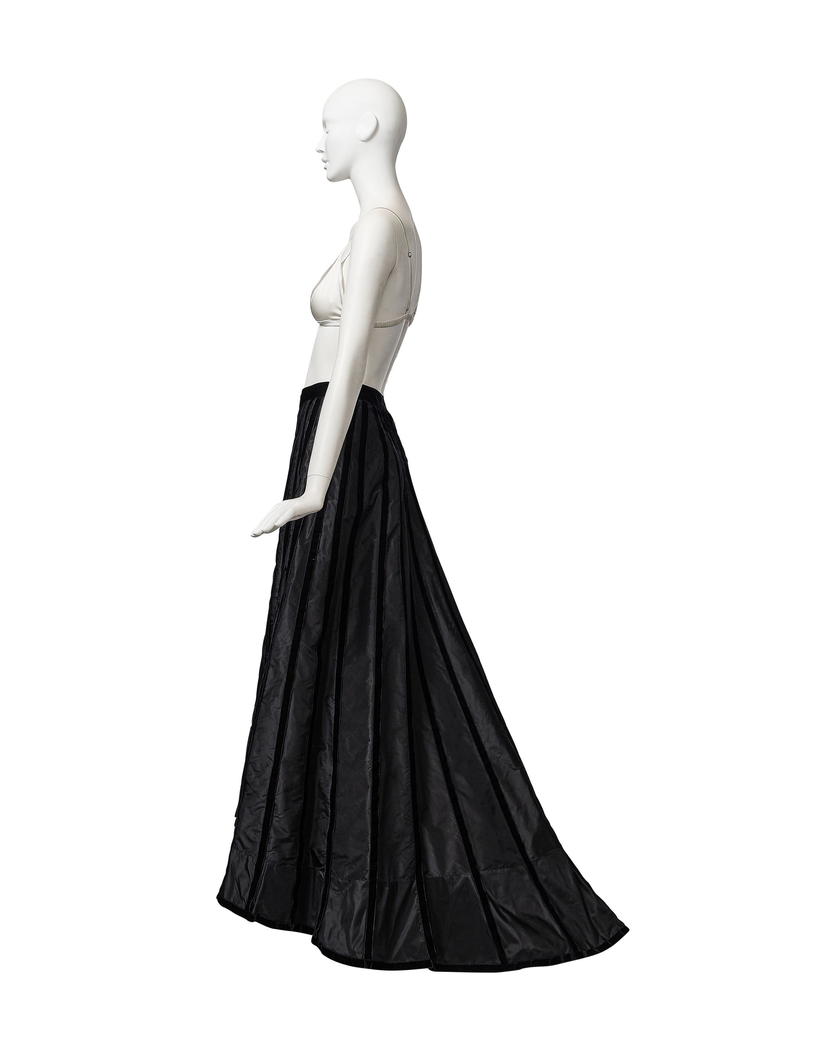 A/W 1998 Chanel by Karl Lagerfeld black velvet paneled skirt with train. Back maxi skirt with contrasting silk taffeta and black velvet raised paneling that creates vertical striped effect when worn. Very slight 'v' at waist flatters the body when worn. Concealed back zip closure with 'CC' logo velvet button closure at back waist. Skirt has moderate court train that creates beautiful movement when worn. Fabric Contents: 100% Silk (lined with Silk lining at interior). Rare skirt as seen on the runway. In very good vintage condition with light spotting at hemline (unnoticeable when worn). Styled with white bra top for e-commerce purposes only; not included with purchase.