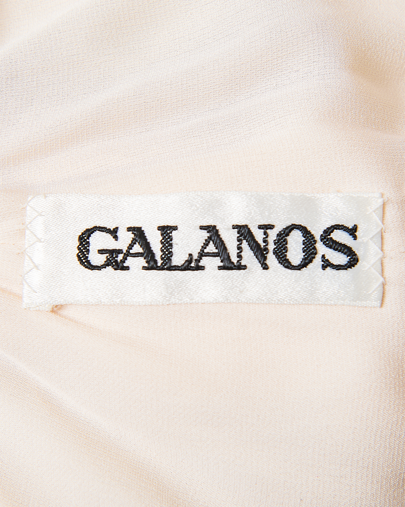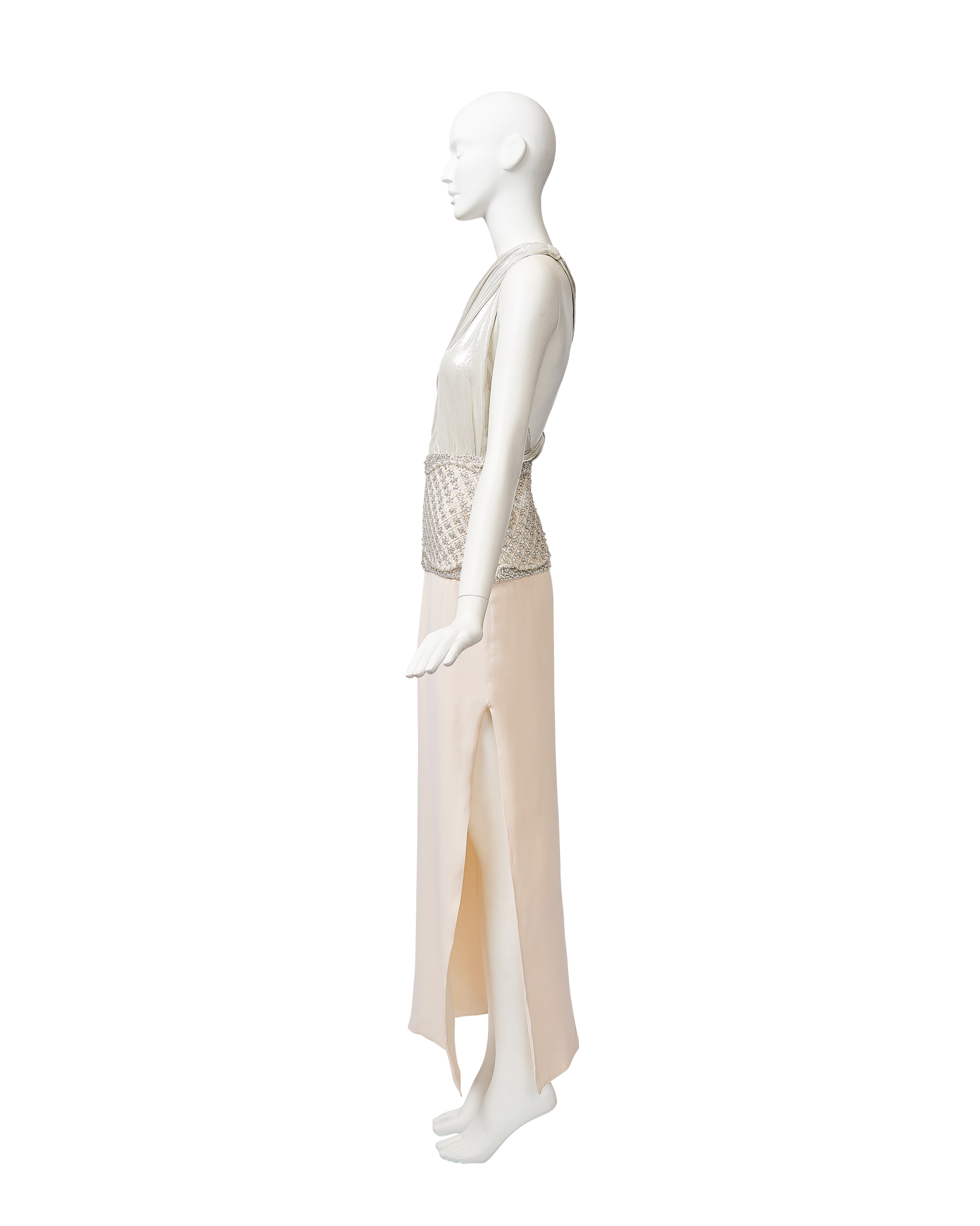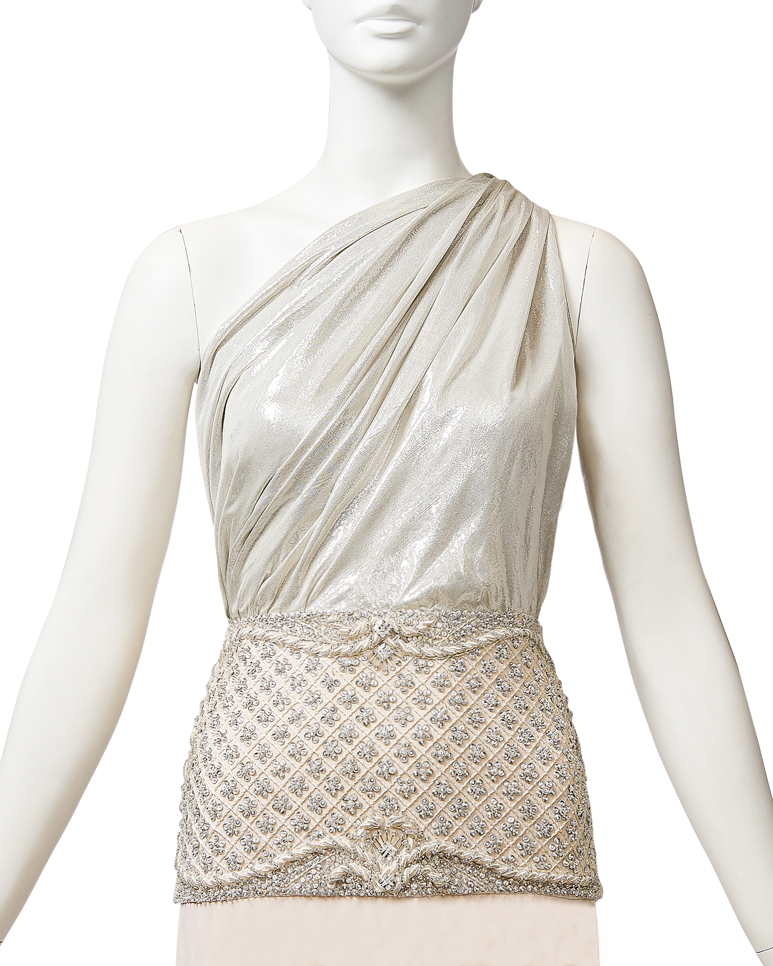 1970's James Galanos one-shoulder silver and ivory beaded waist gown. Silver lamé draped one-shoulder upper with contrasting ivory lower skirting, featuring intricate bead embellished detailing at waist through hip. Ankle length dress with moderate side slit and semi-open asymmetrical back. Concealed side zip and two snap closures at left side, with hook closure at strap (strap drapes across back and hooks into front waist at right side). In very good vintage condition with minor missing embellishments at waist (noticeable only upon close inspection) and very light spotting at front and at interior of slit (unnoticeable when worn).