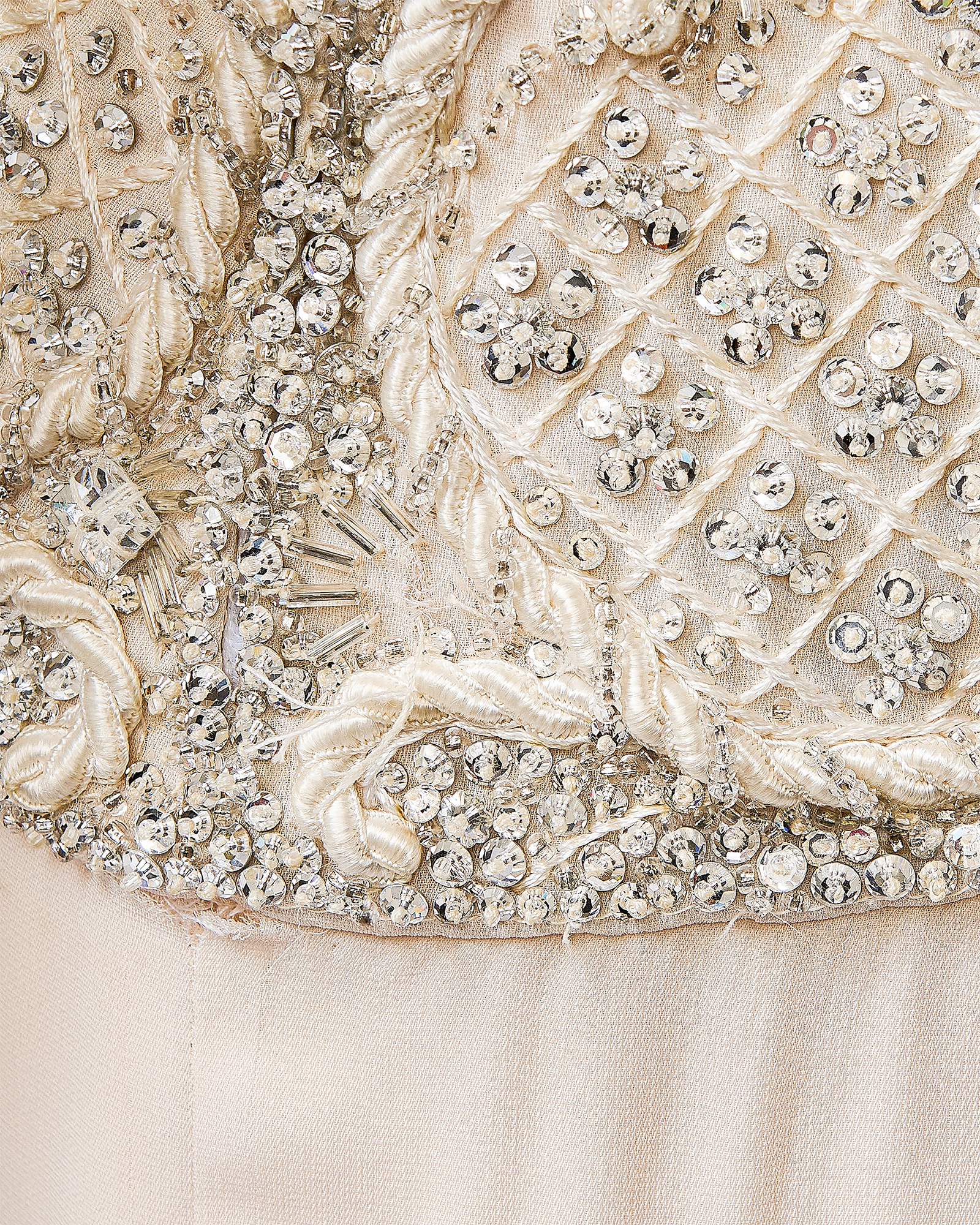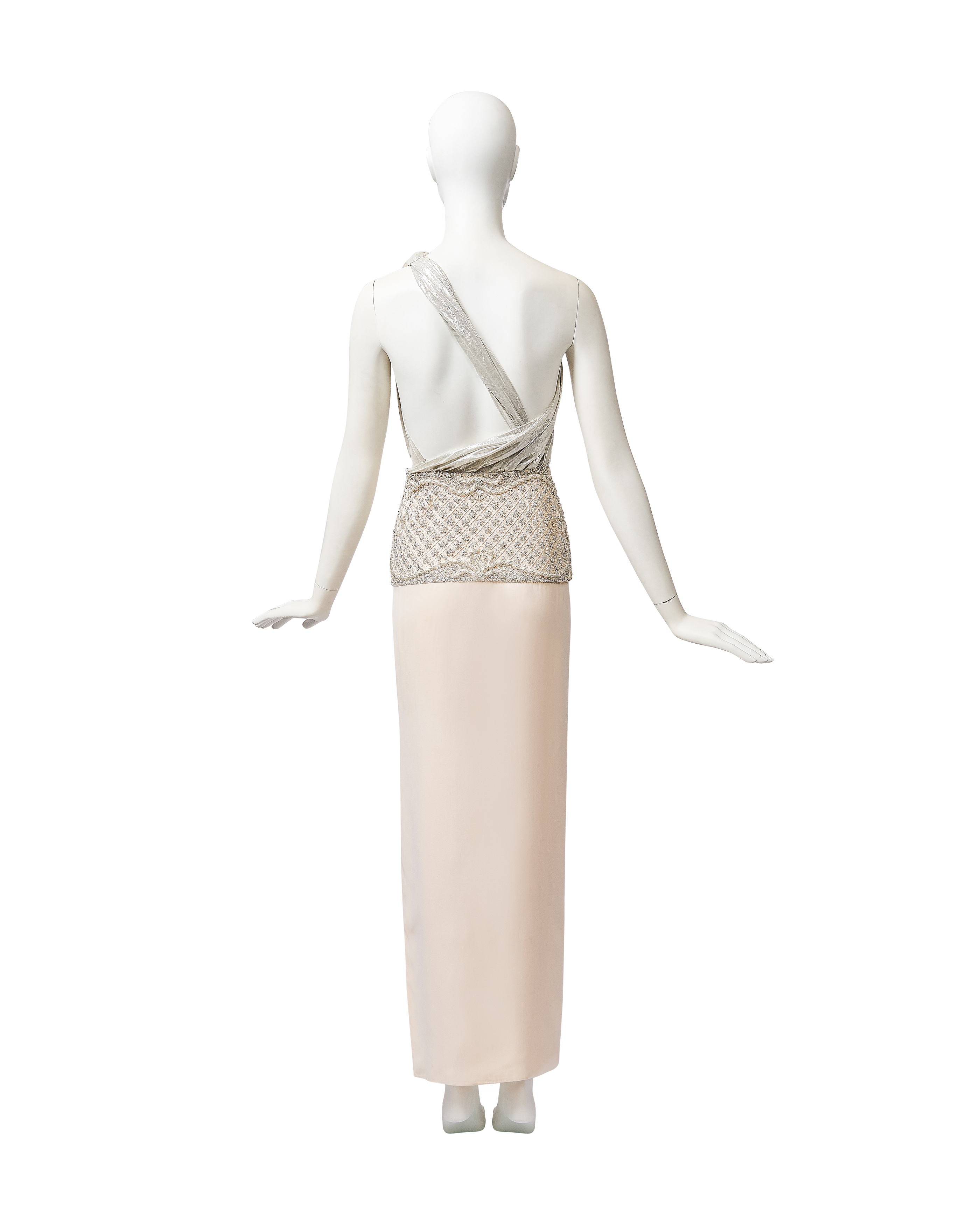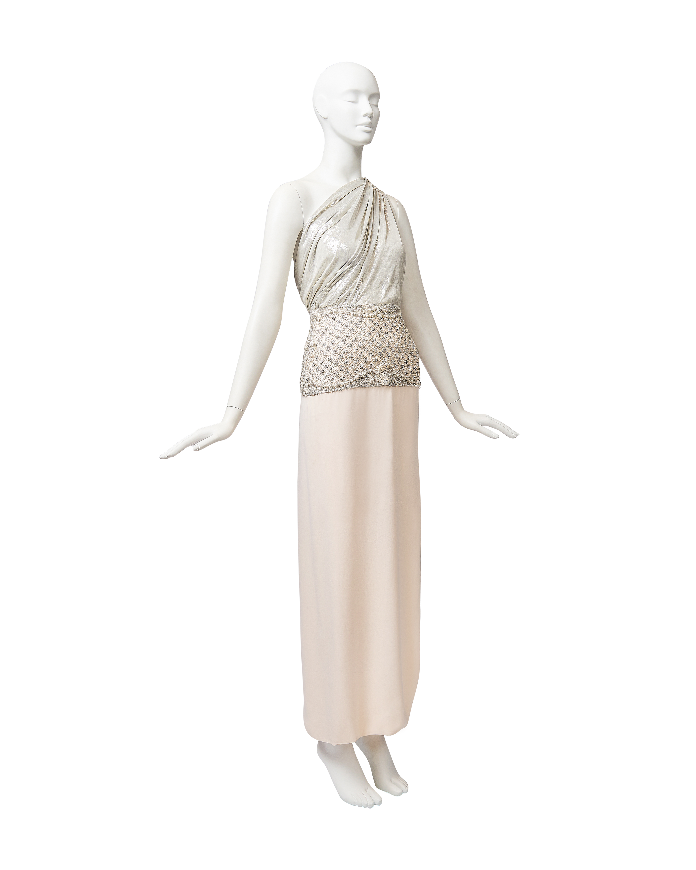 1970's One-Shoulder Silver and Ivory Beaded Waist Gown