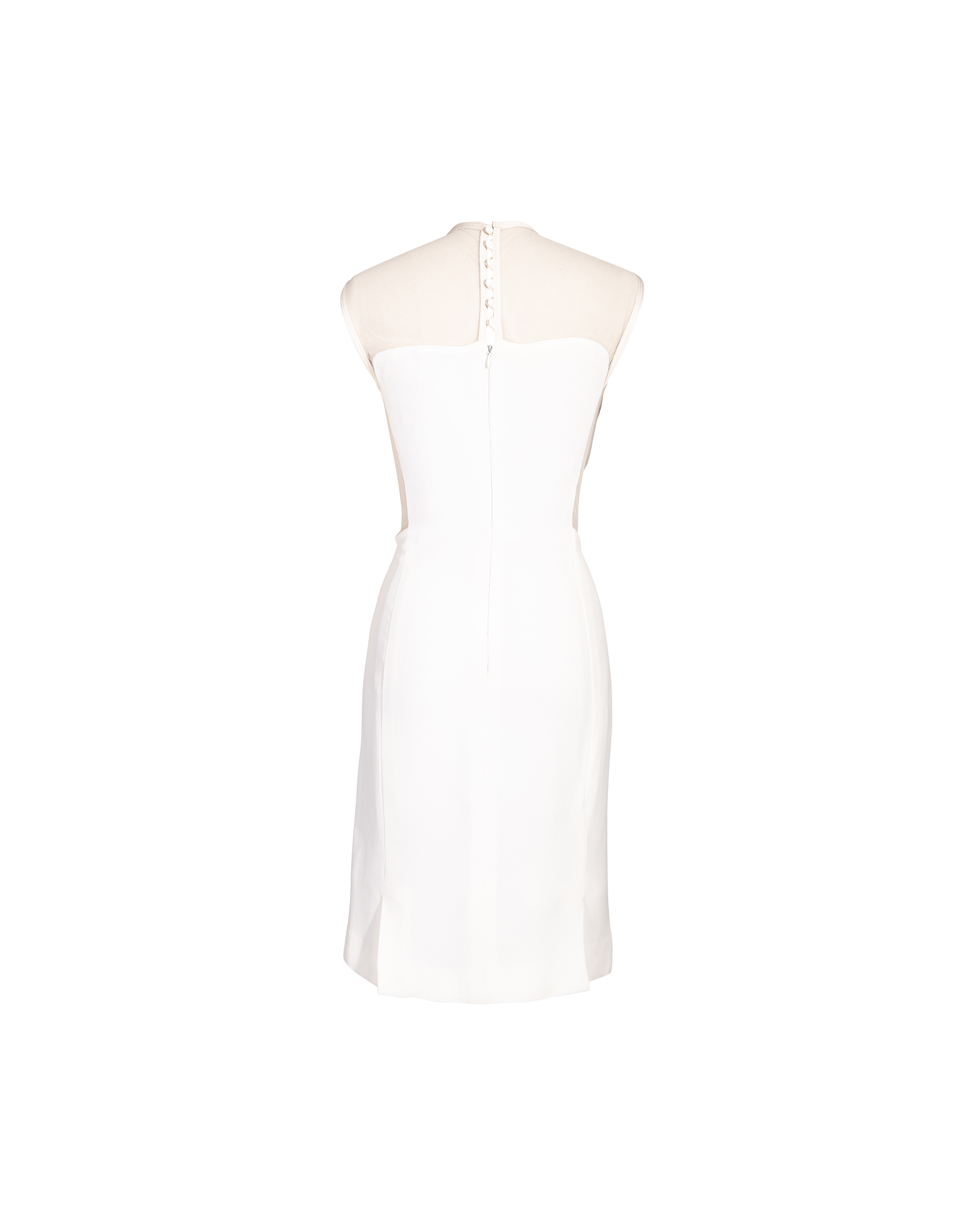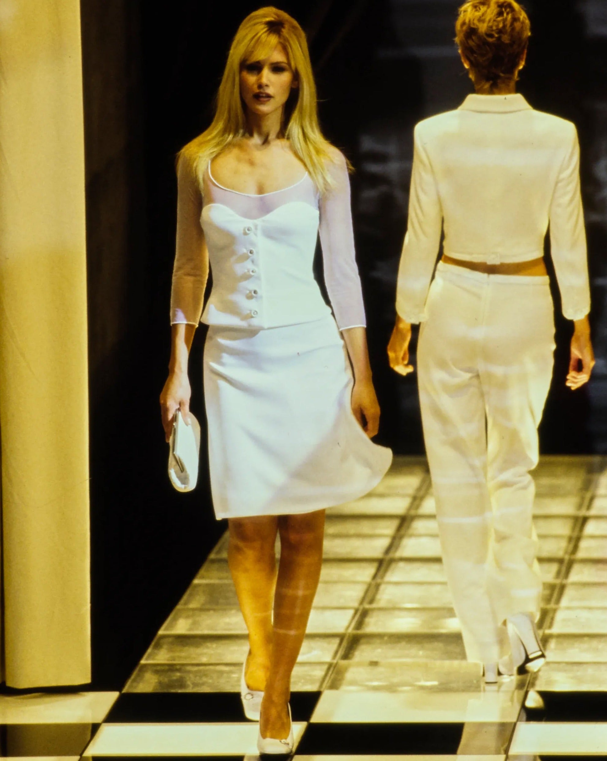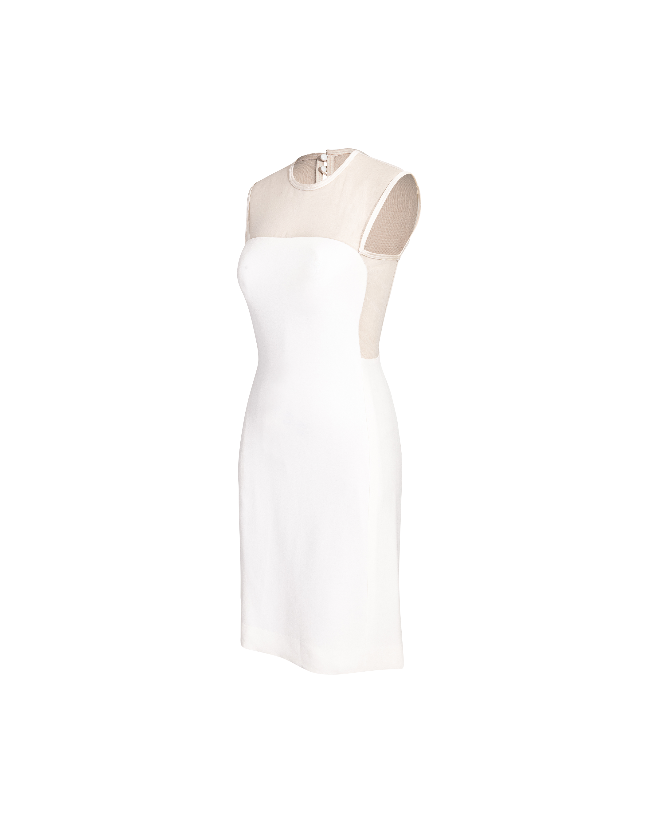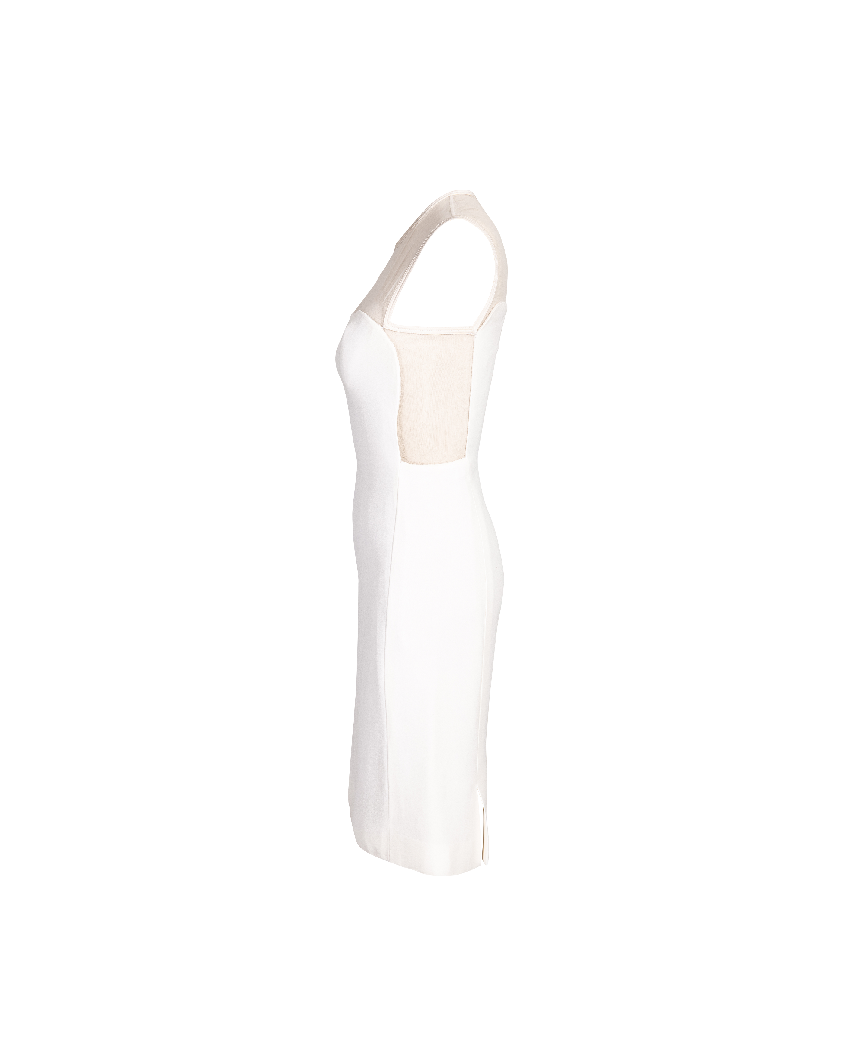 S/S 1996 Gianni Versace white mesh mini dress. Sleeveless mini dress with mesh scoop neck upper and sides, and 'strapless' bustier sheath dress. Lined with signature Medusa head white lining. Built-in bra cups (removable as desired). Back zip and oversized plastic back button and loop closures. Fabric Contents: 47% Rayon; 45% Acetate; 4% Silk and 4% Nylon with 100% Rayon lining. Similar featured on runway. In very good vintage condition with minor runs and snags throughout (not noticeable when worn).