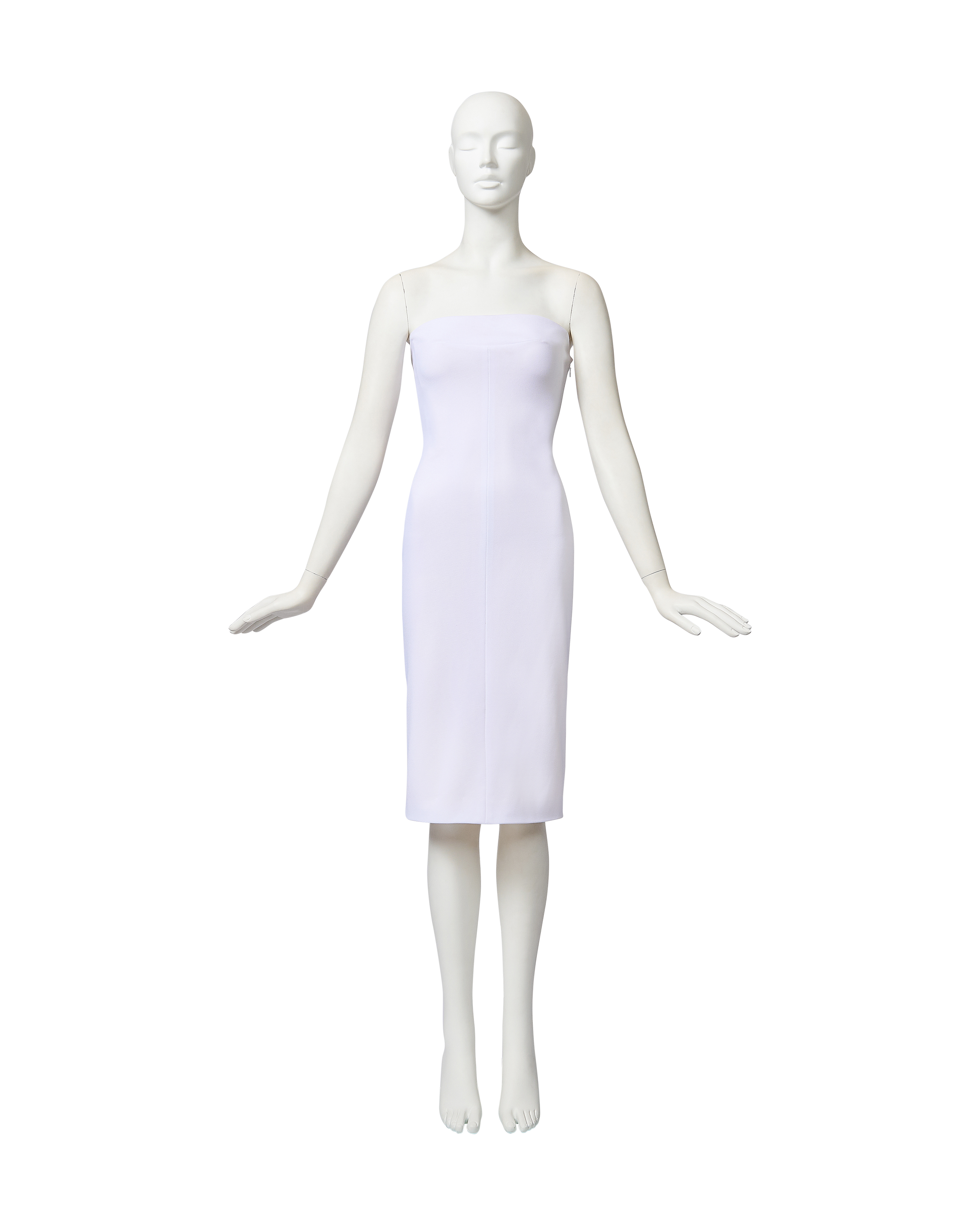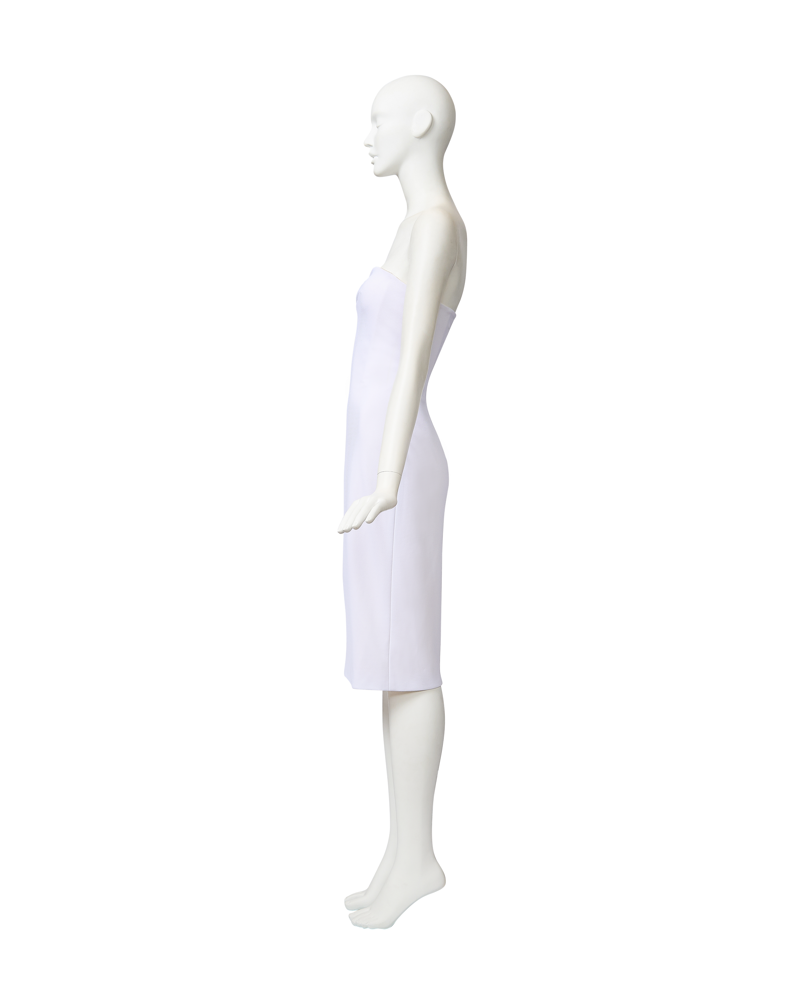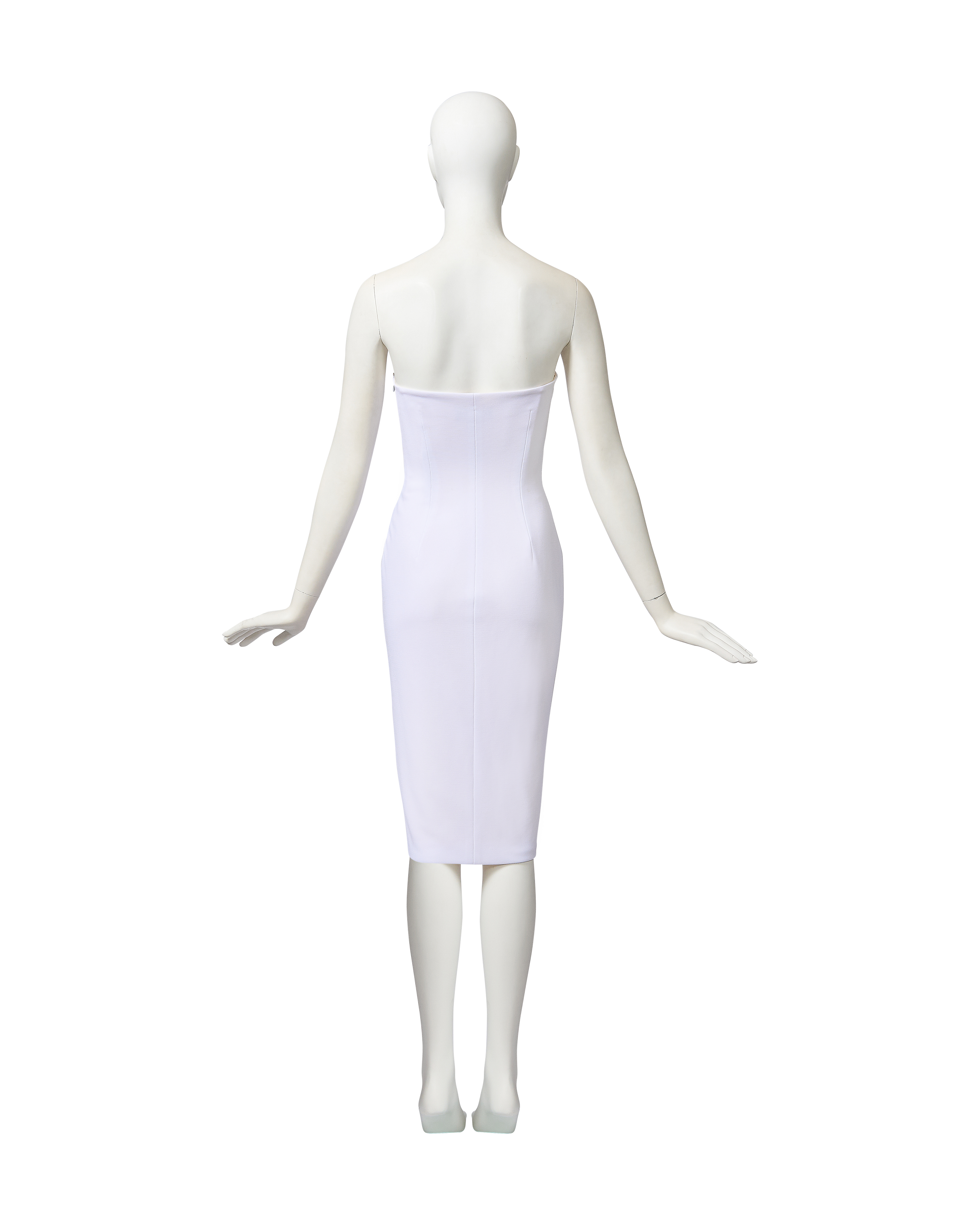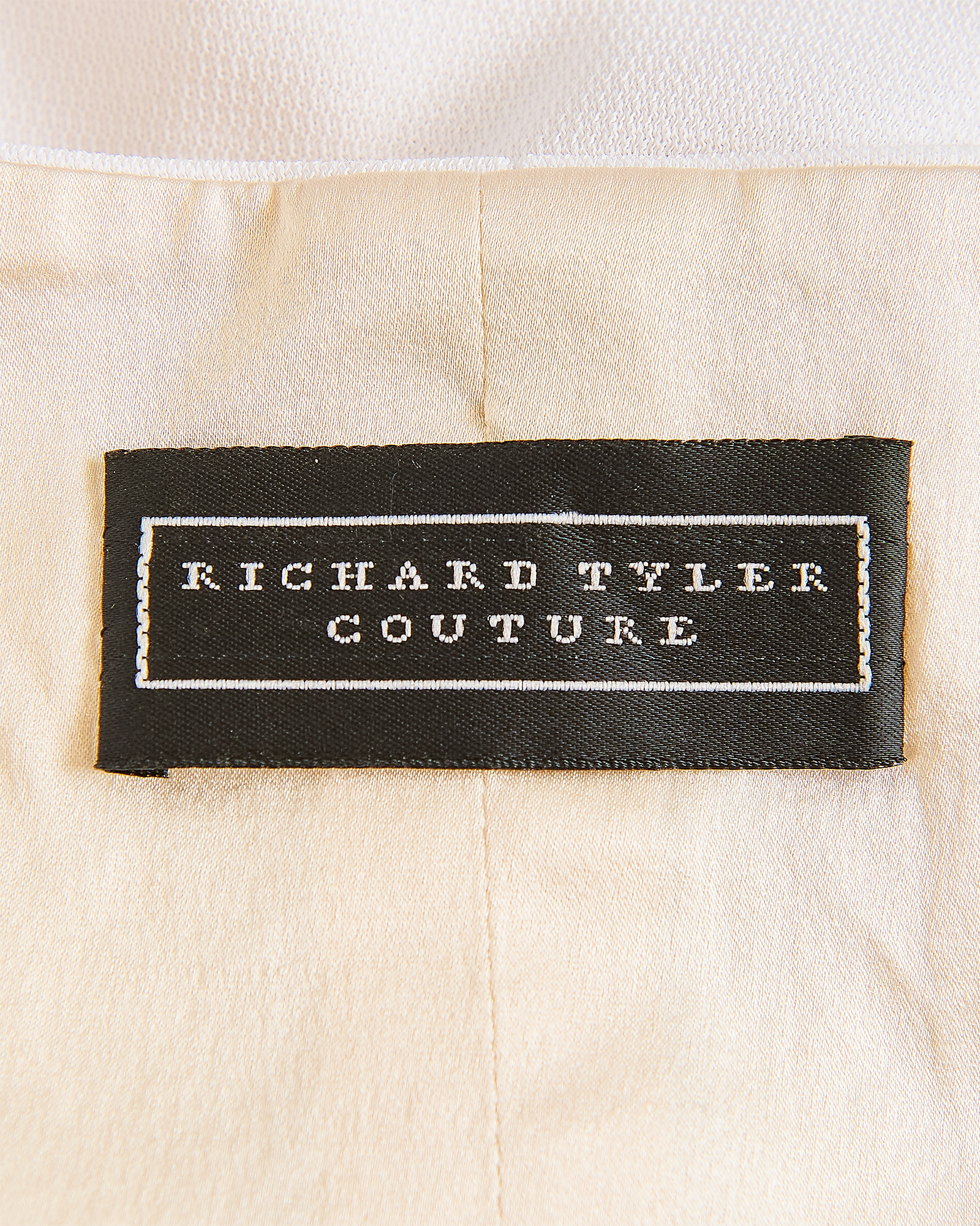 1990's Richard Tyler Couture white strapless bustier dress. Knee-length bustier dress with concealed side zip closure and built-in boning at sides of bust. Curved paneling at bust and multiple pieces of boning create distinct structure when worn, with A-line skirting to just above the knee. Fabric Contents: 100% Polyester with 100% Silk lining (white exterior with ecru lining). In excellent vintage condition with no flaws to note.