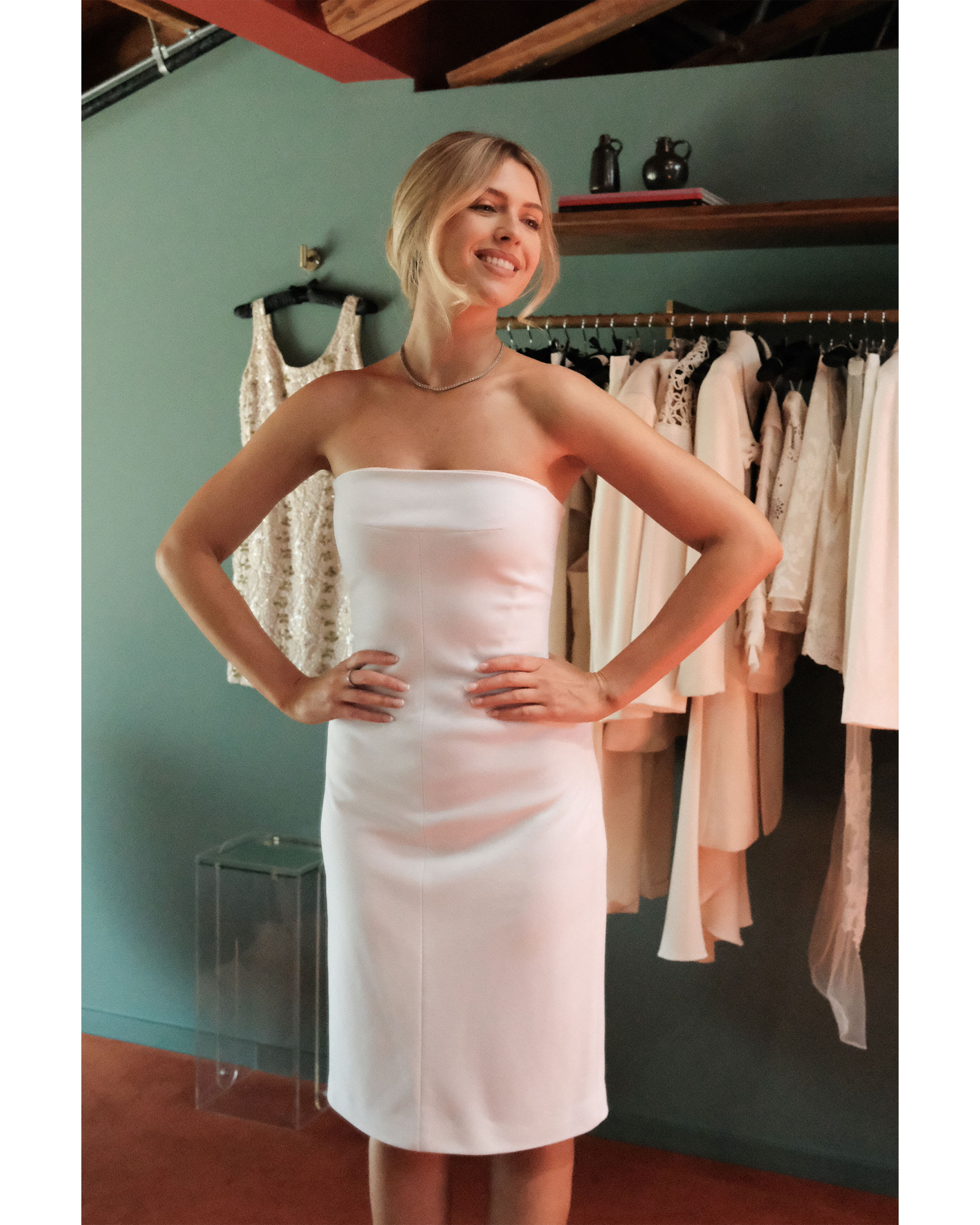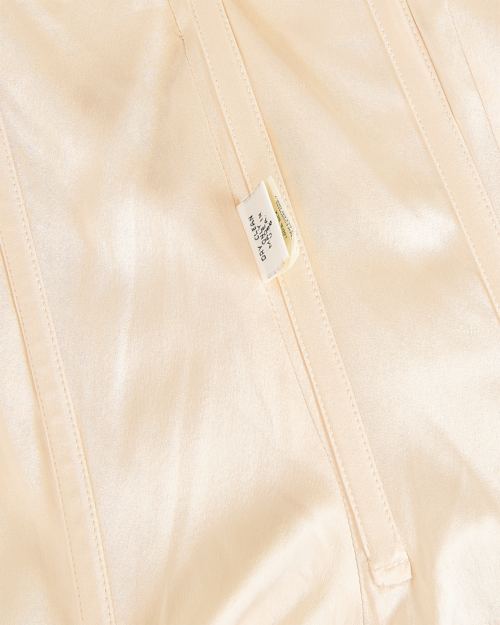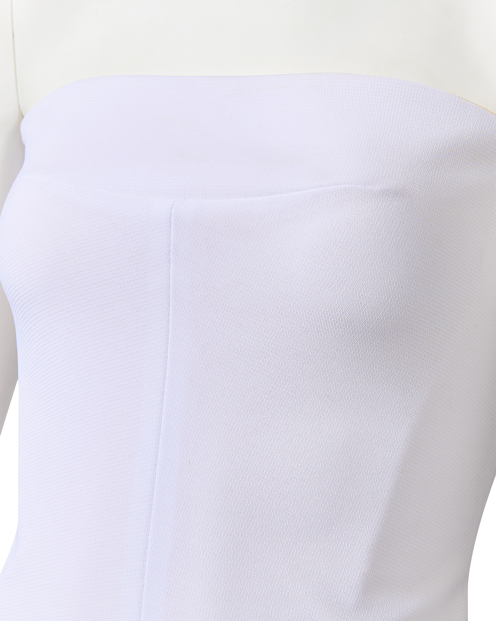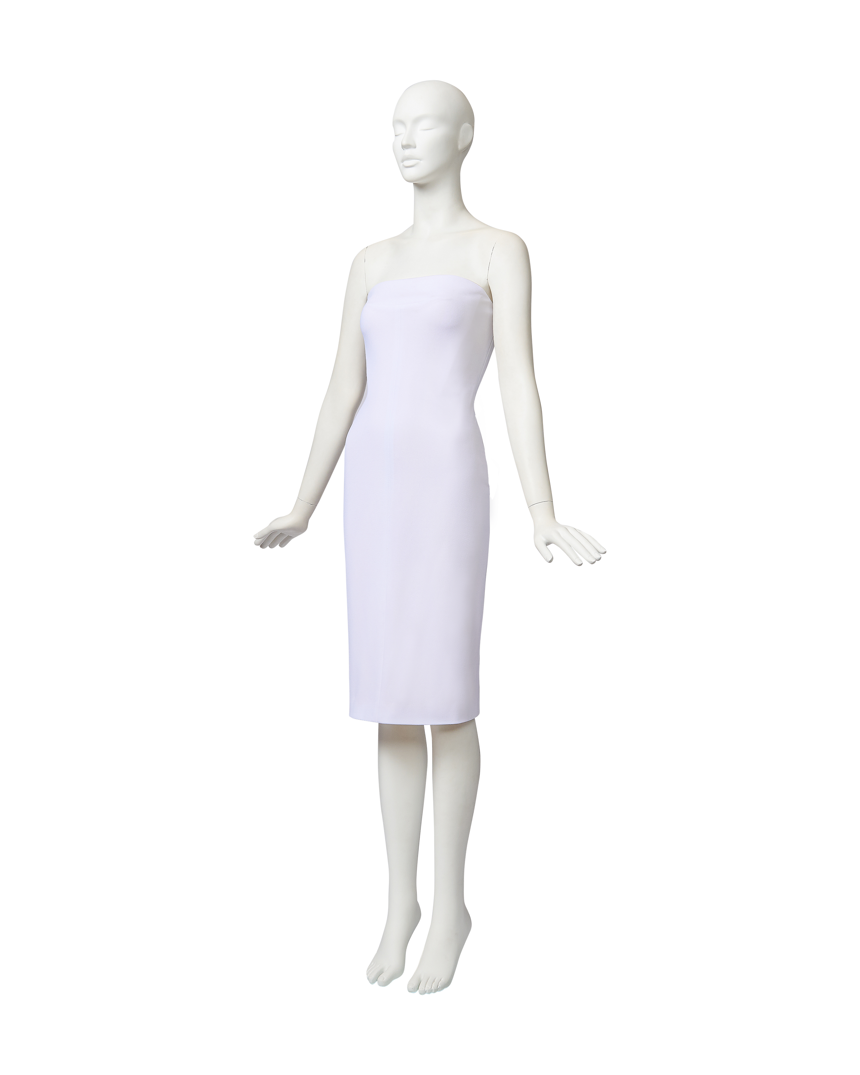 1990's Richard Tyler Couture white strapless bustier dress. Knee-length bustier dress with concealed side zip closure and built-in boning at sides of bust. Curved paneling at bust and multiple pieces of boning create distinct structure when worn, with A-line skirting to just above the knee. Fabric Contents: 100% Polyester with 100% Silk lining (white exterior with ecru lining). In excellent vintage condition with no flaws to note.