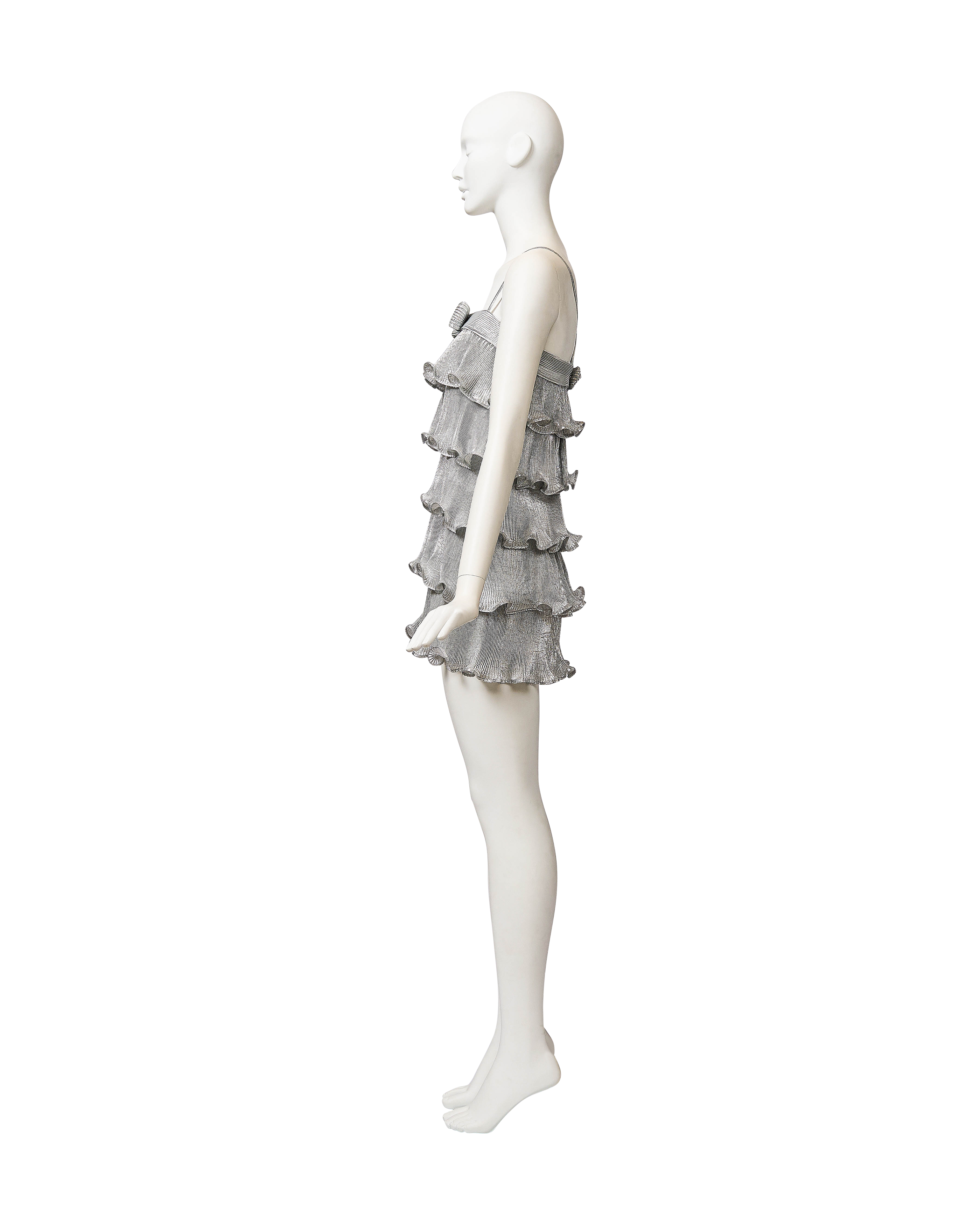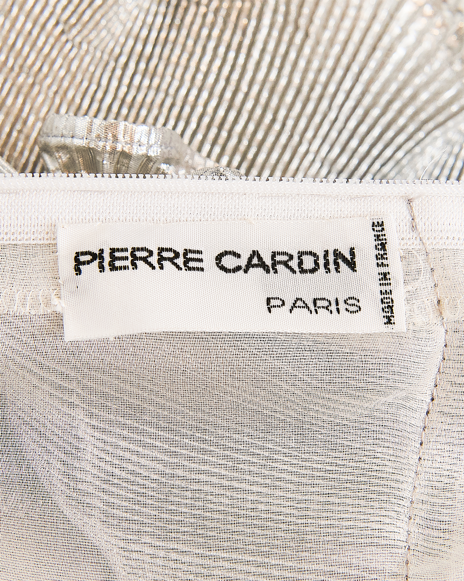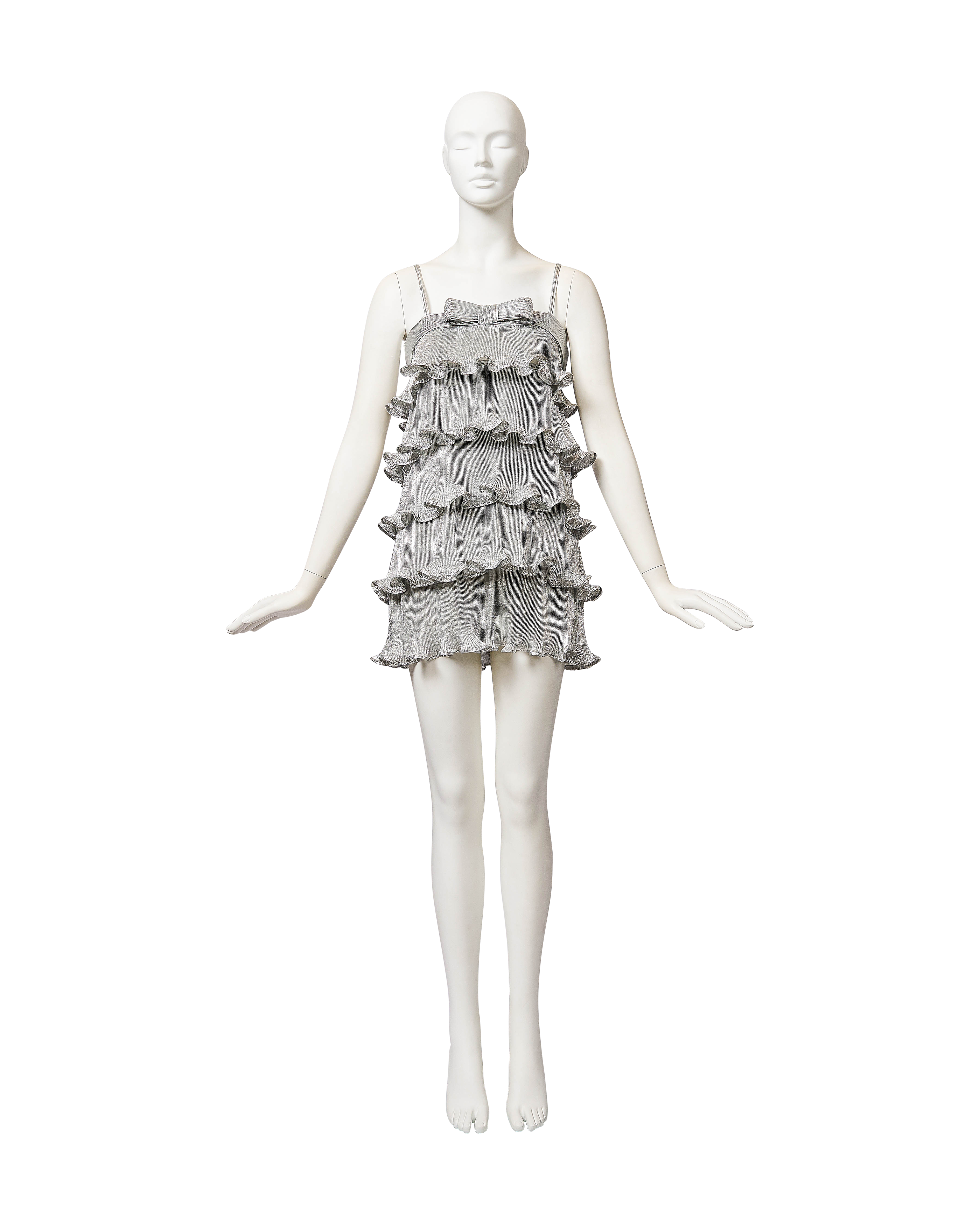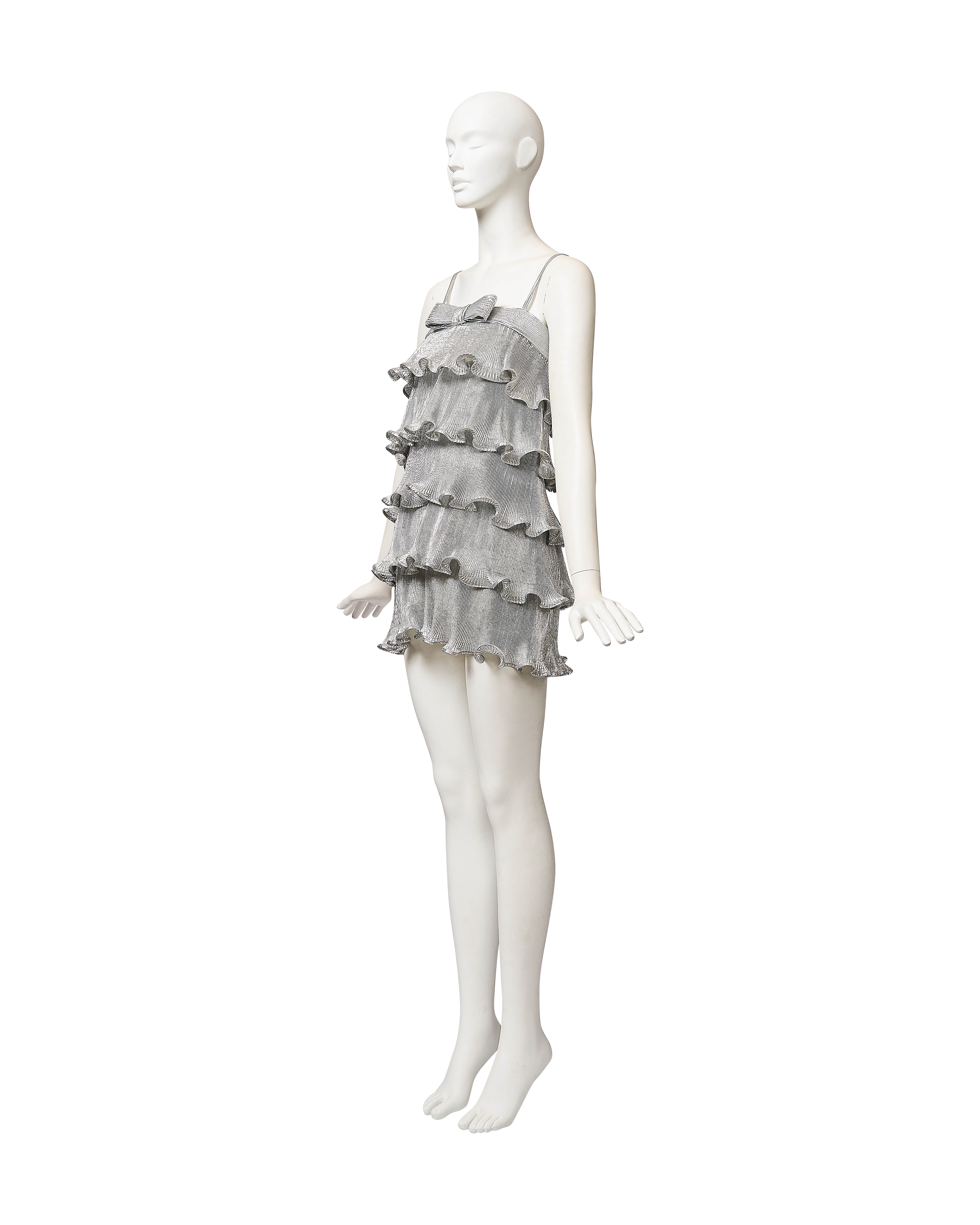 2011 Pierre Cardin silver tiered lamé mini dress. Sleeveless square neck mini dress with accordion pleated silver-tone tiered ruffle paneling (five total tiers) and oversized bow at center bust. Semi-sheer gray organza interior paneling. Lightweight, easy to wear fabrication. Center back zip closure and single snap closure. In excellent vintage condition with no flaws to note (new with original tags). Provenance: This piece is part of a small collection of samples acquired directly from the Pierre Cardin Archive in Paris. This is a one-of-one sample which walked the runway and was created directly at the maison.
