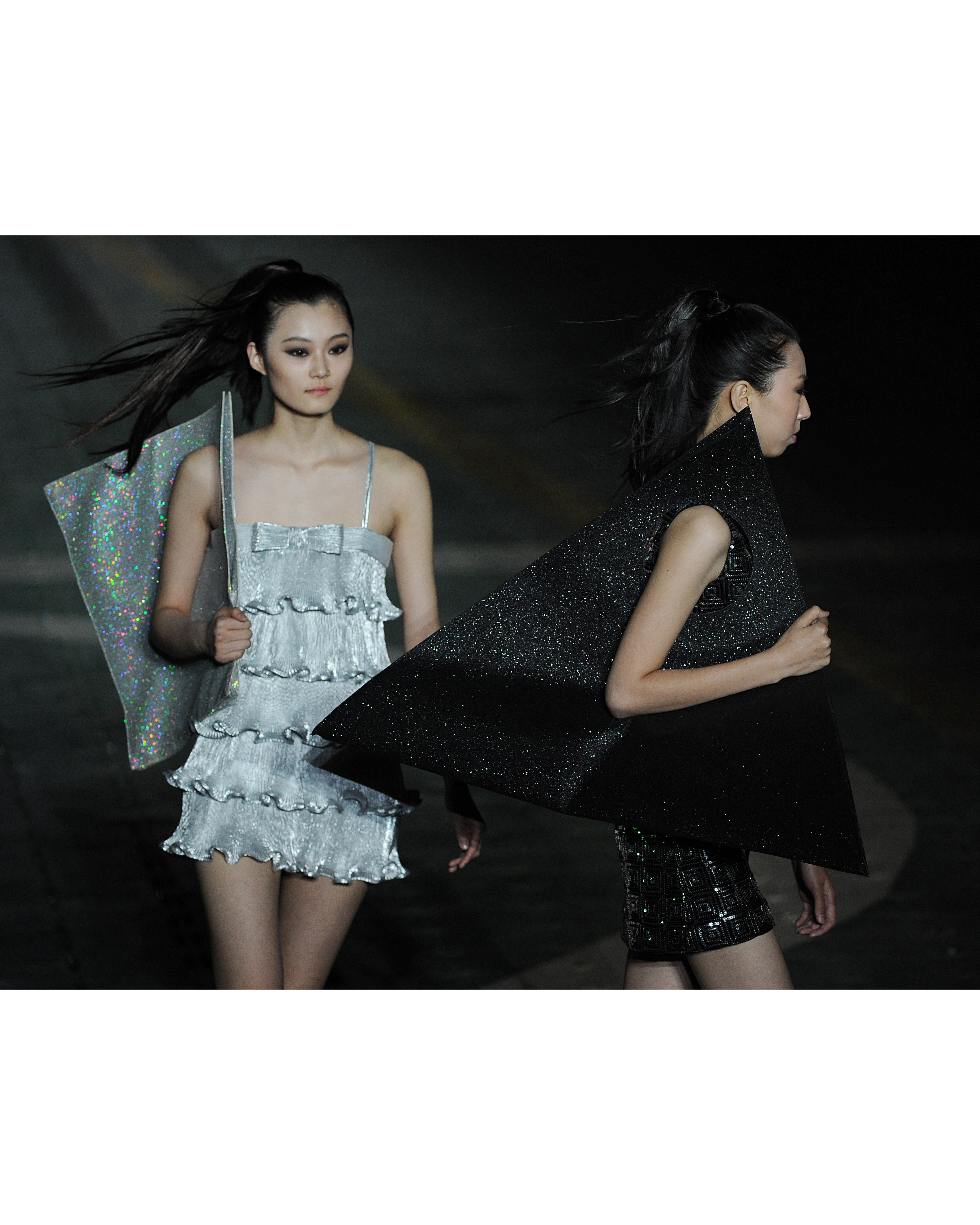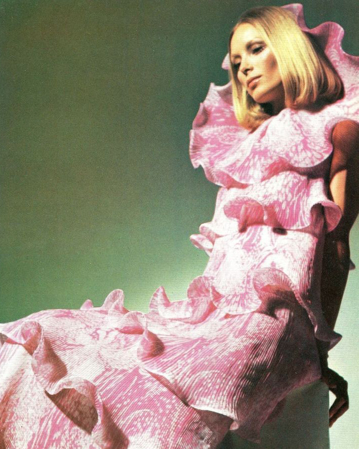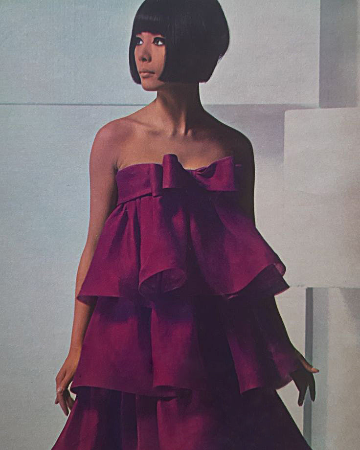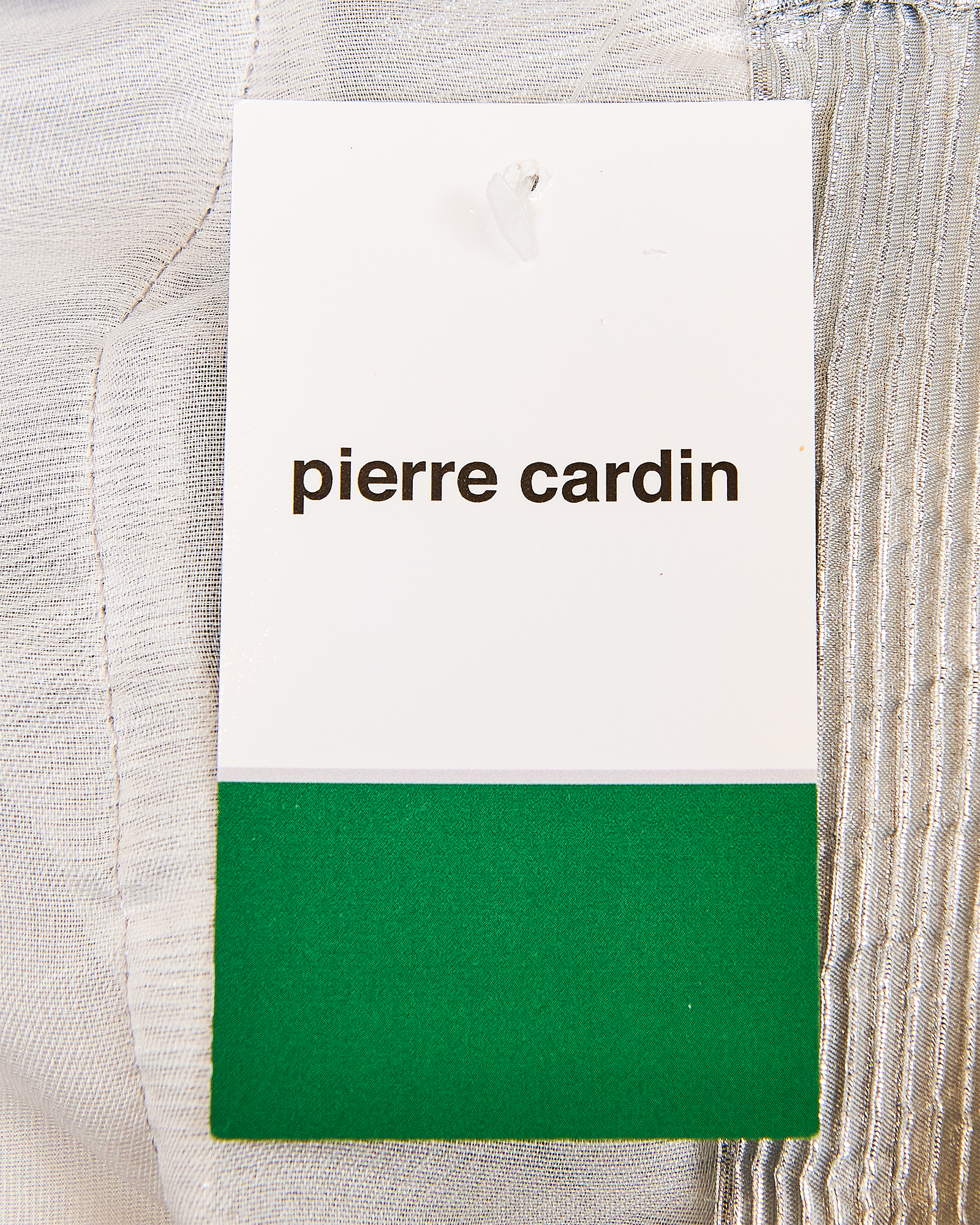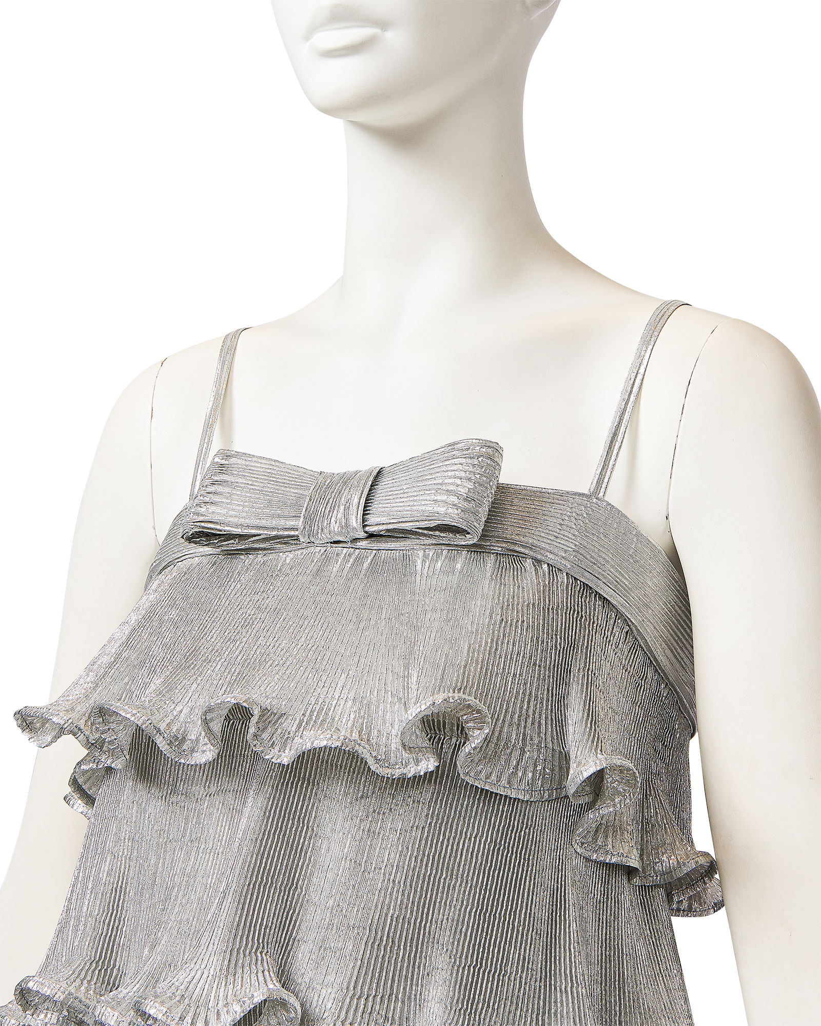2011 Pierre Cardin silver tiered lamé mini dress. Sleeveless square neck mini dress with accordion pleated silver-tone tiered ruffle paneling (five total tiers) and oversized bow at center bust. Semi-sheer gray organza interior paneling. Lightweight, easy to wear fabrication. Center back zip closure and single snap closure. In excellent vintage condition with no flaws to note (new with original tags). Provenance: This piece is part of a small collection of samples acquired directly from the Pierre Cardin Archive in Paris. This is a one-of-one sample which walked the runway and was created directly at the maison.