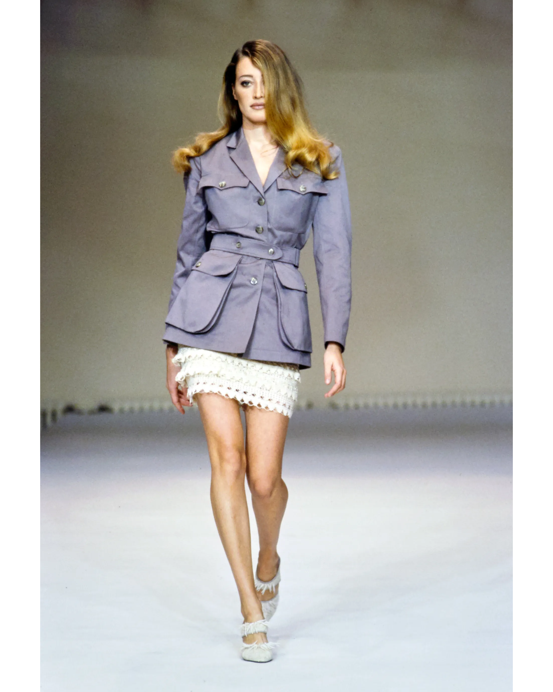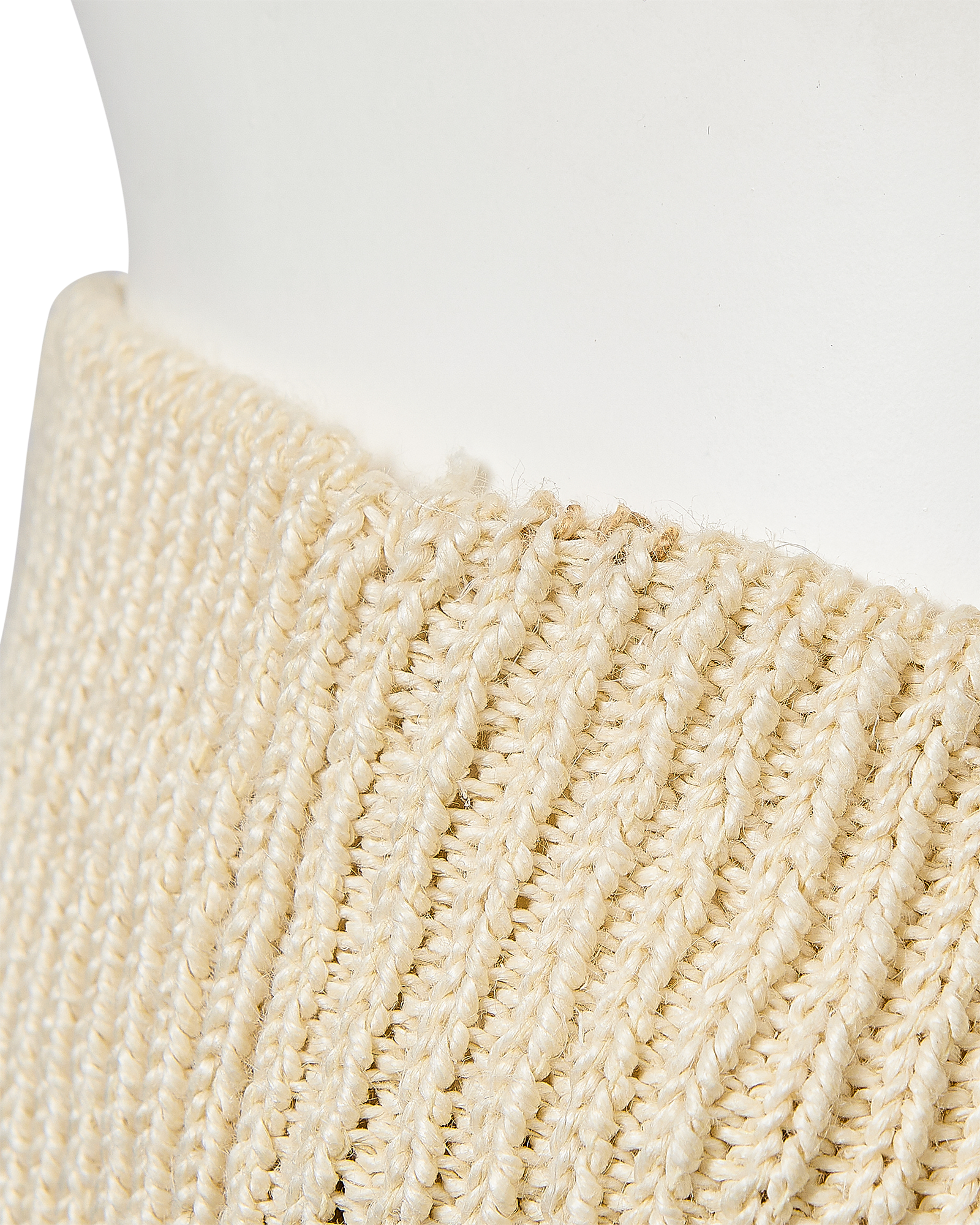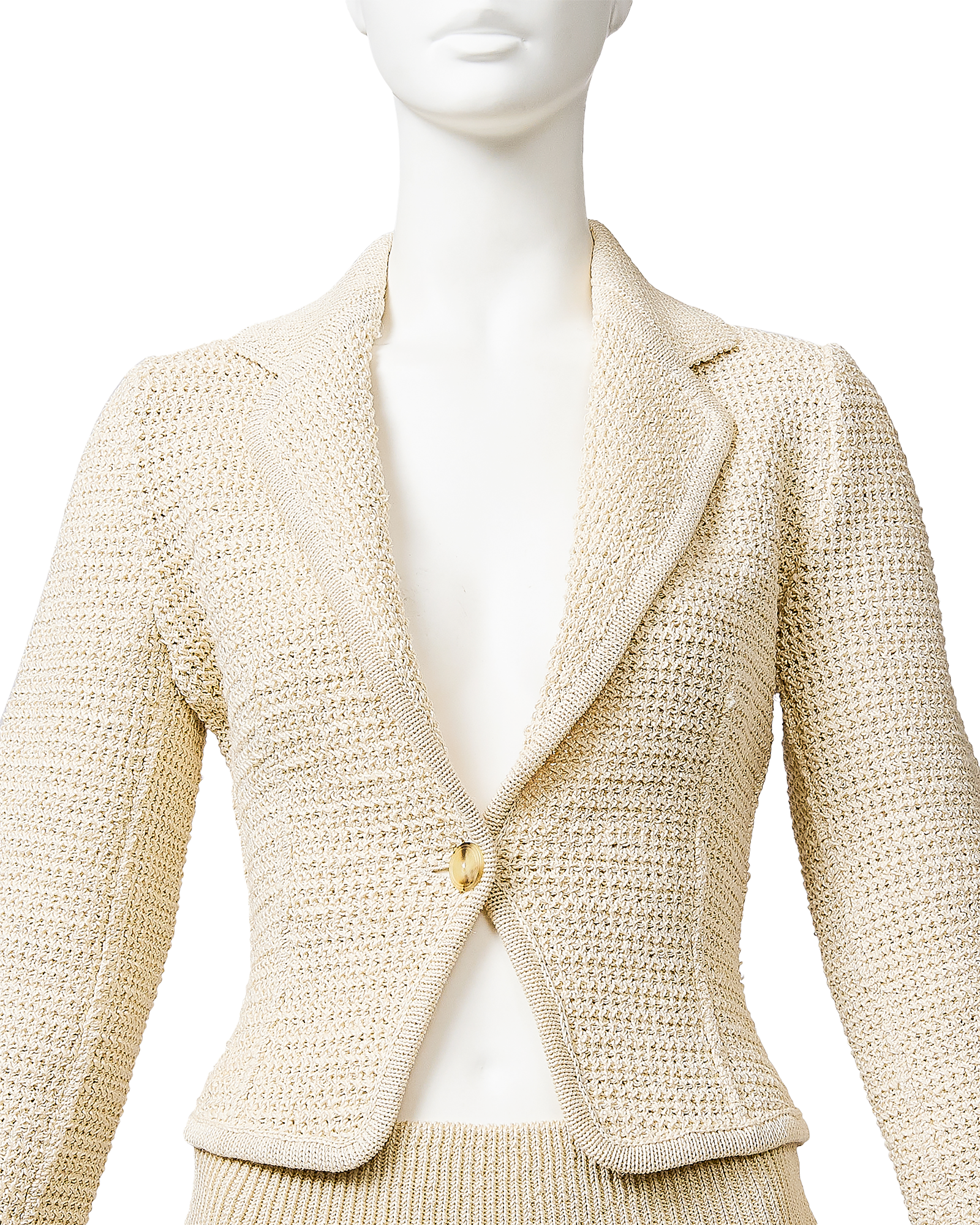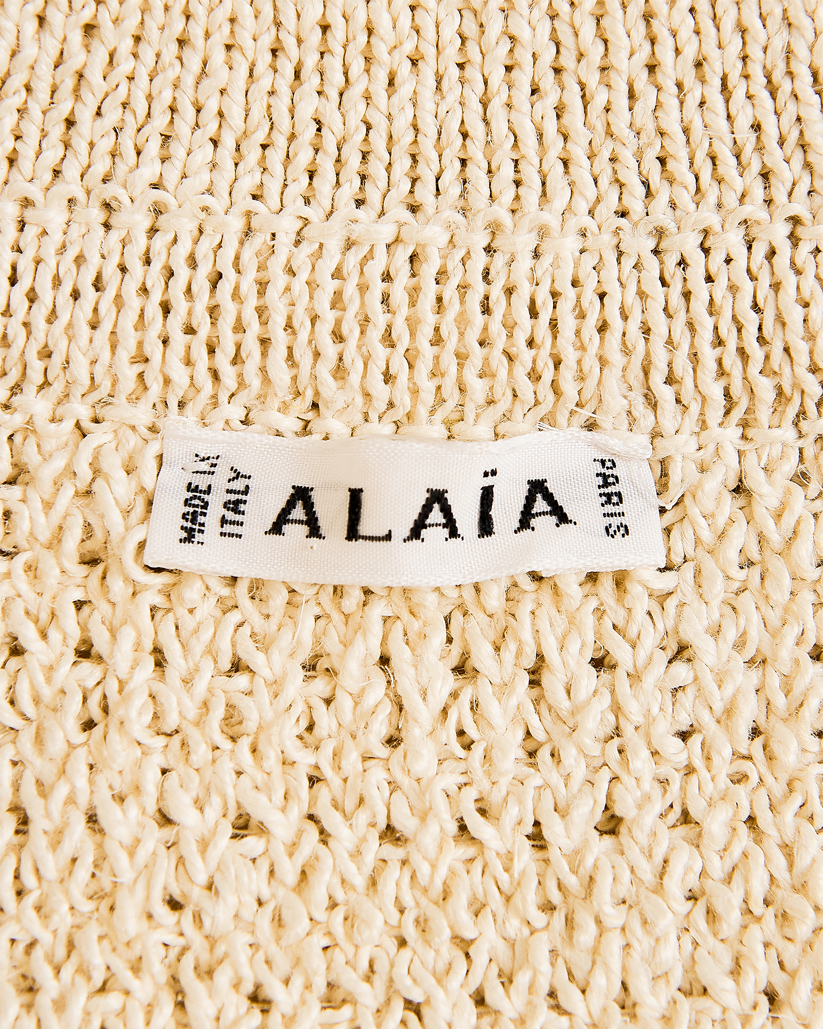 S/S 1990 Azzedine Alaïa ecru crochet skirt suit set. Long sleeve collared stretch linen jacket with single tortoiseshell button closure. Pairs with fitted mini skirt with ribbed knit waist, featuring raw picot tiered edge with cutout construction at hemline. Fabric Contents: 85% Linen and 15% Spandex blend (knit linen with stretch throughout). Similar featured on the runway. In excellent vintage condition with no flaws to note (extremely light wear at side of skirt that is unnoticeable when worn).