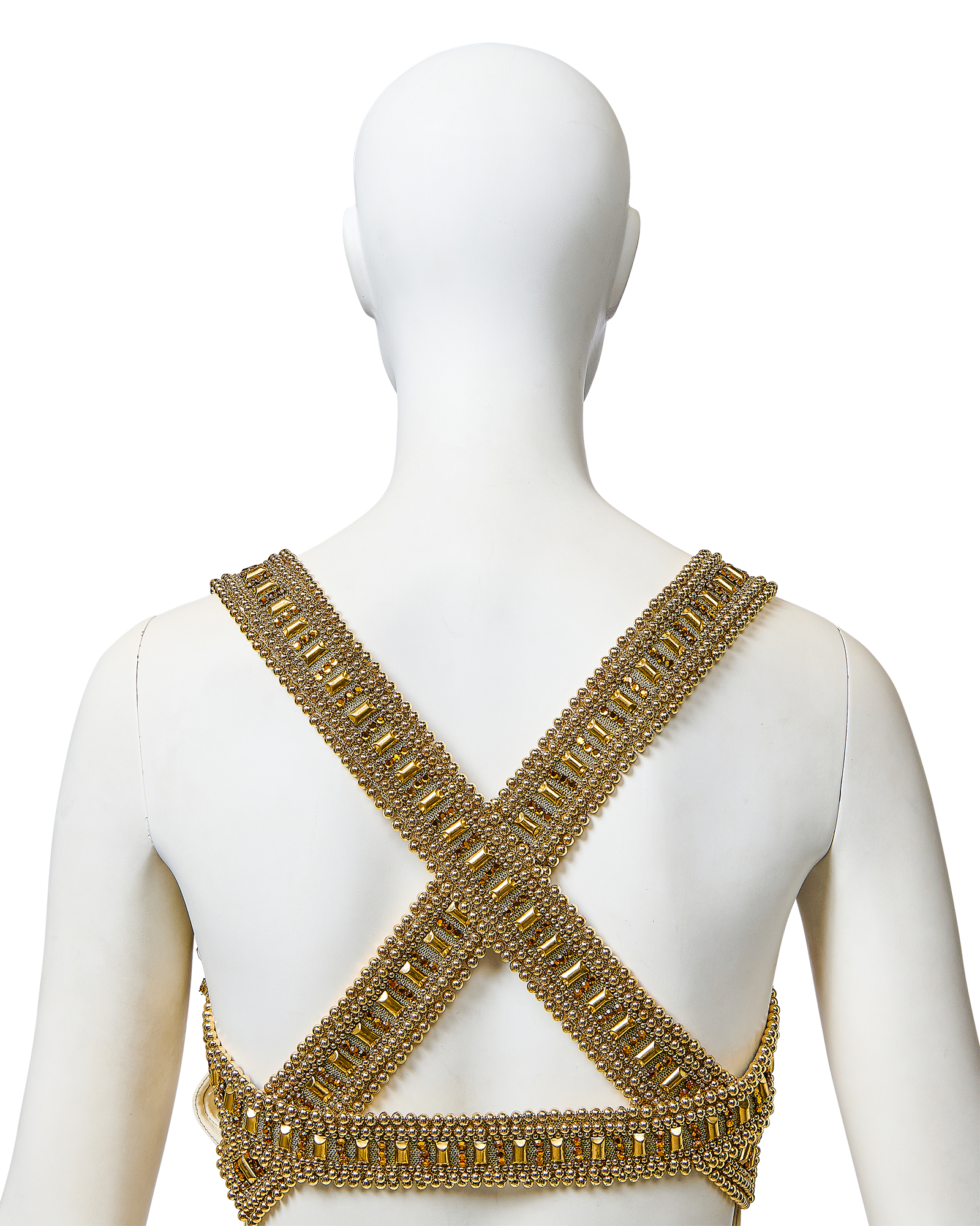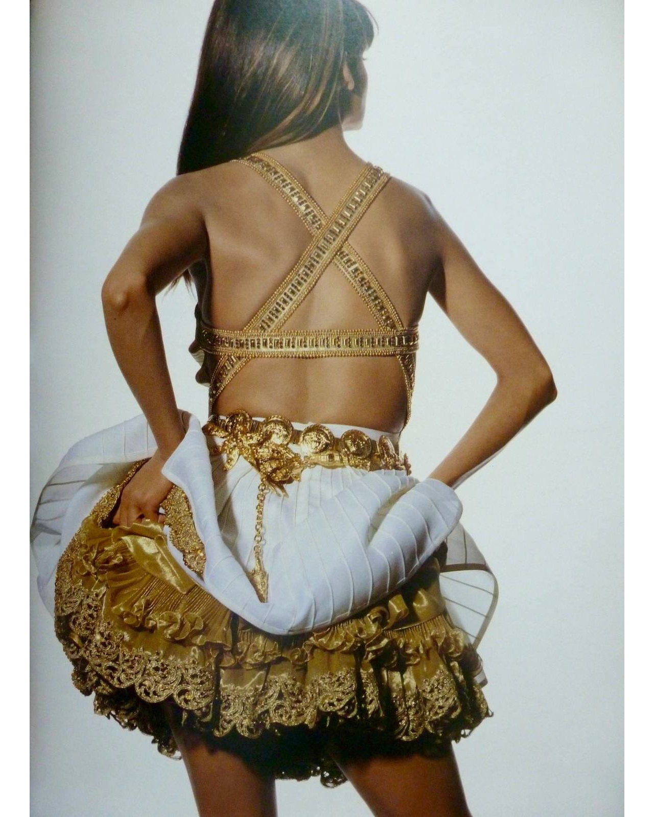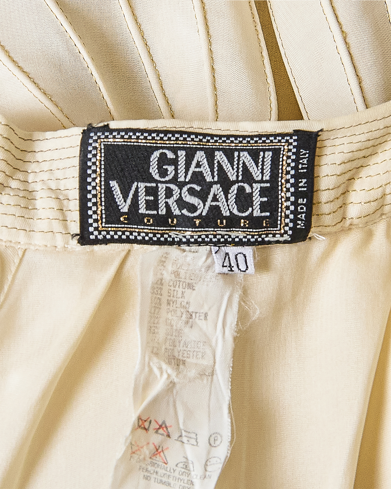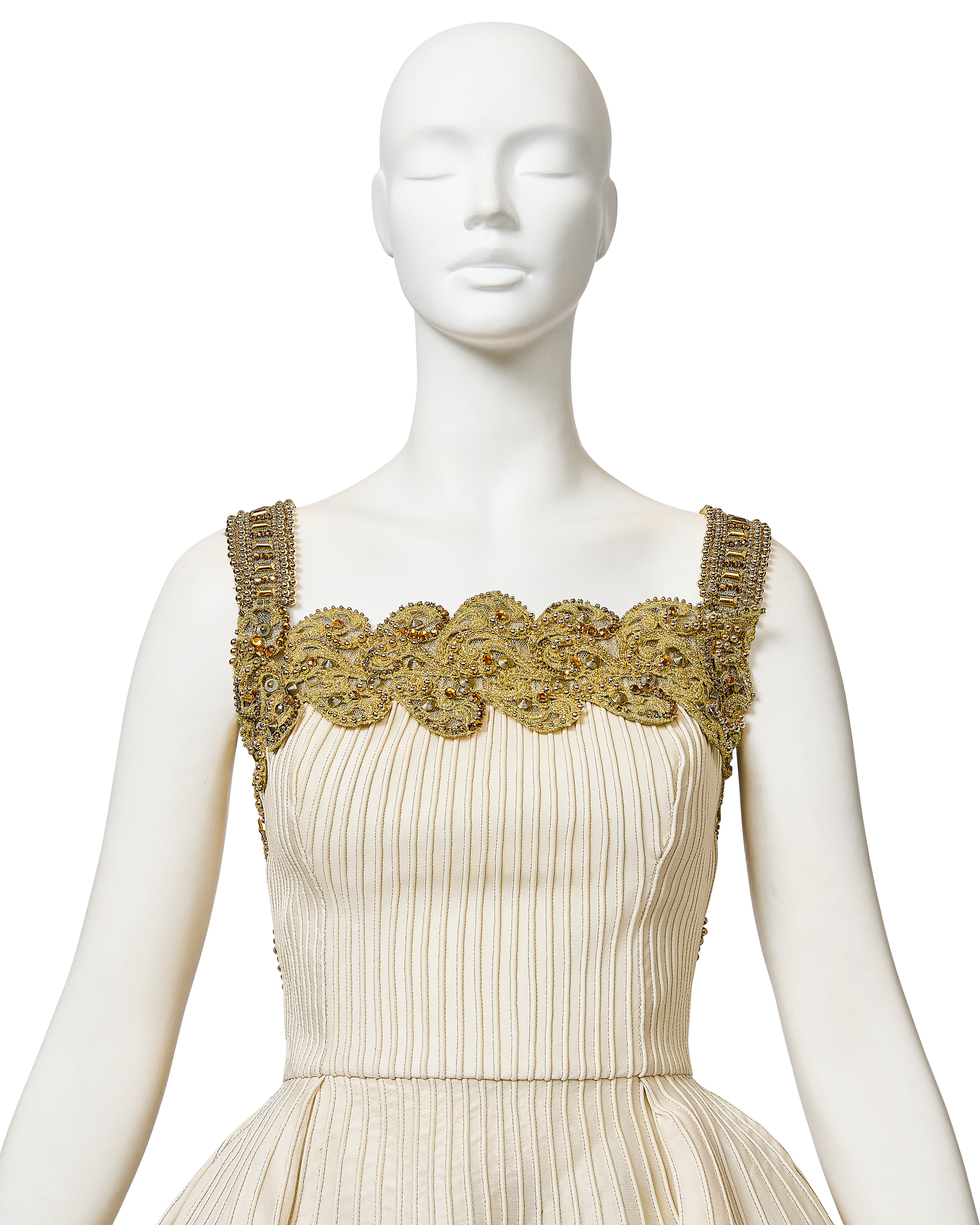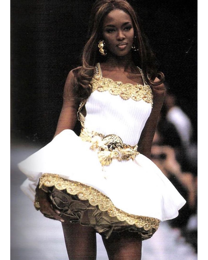 S/S 1992 Gianni Versace ivory and metallic gold embellished mini dress and gold underskirt. Sleeveless ivory / off-white dress with gold-tone metallic contrast stitching and gold faux pearl, rhinestone and orange-gold beaded details at straps, bust and interior trim, with semi-open back and separate gold mini underskirt that creates additional volume when worn. Dress has concealed center back zip closure and three interior hook-and-eye closures and snap closure to attach back strap. Underskirt has single tan button closure and two concealed snap closures, and can be styled separately as desired. Fabric Contents: 33% Silk, 27% Polyester, 10% Nylon, 22% Cotton and 8% Polyamide blend. Rare look as seen on Naomi Campbell on the runway (Look #5), featured on Nicole Kidman in Vogue Magazine, and documented in many other prominent editorials. Shoes from runway look available via link here (sold separately and not included with purchase). In excellent vintage condition with no flaws to note.