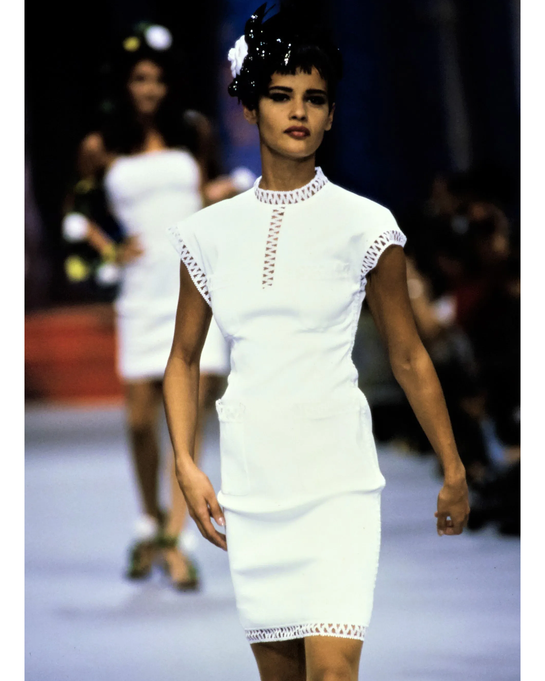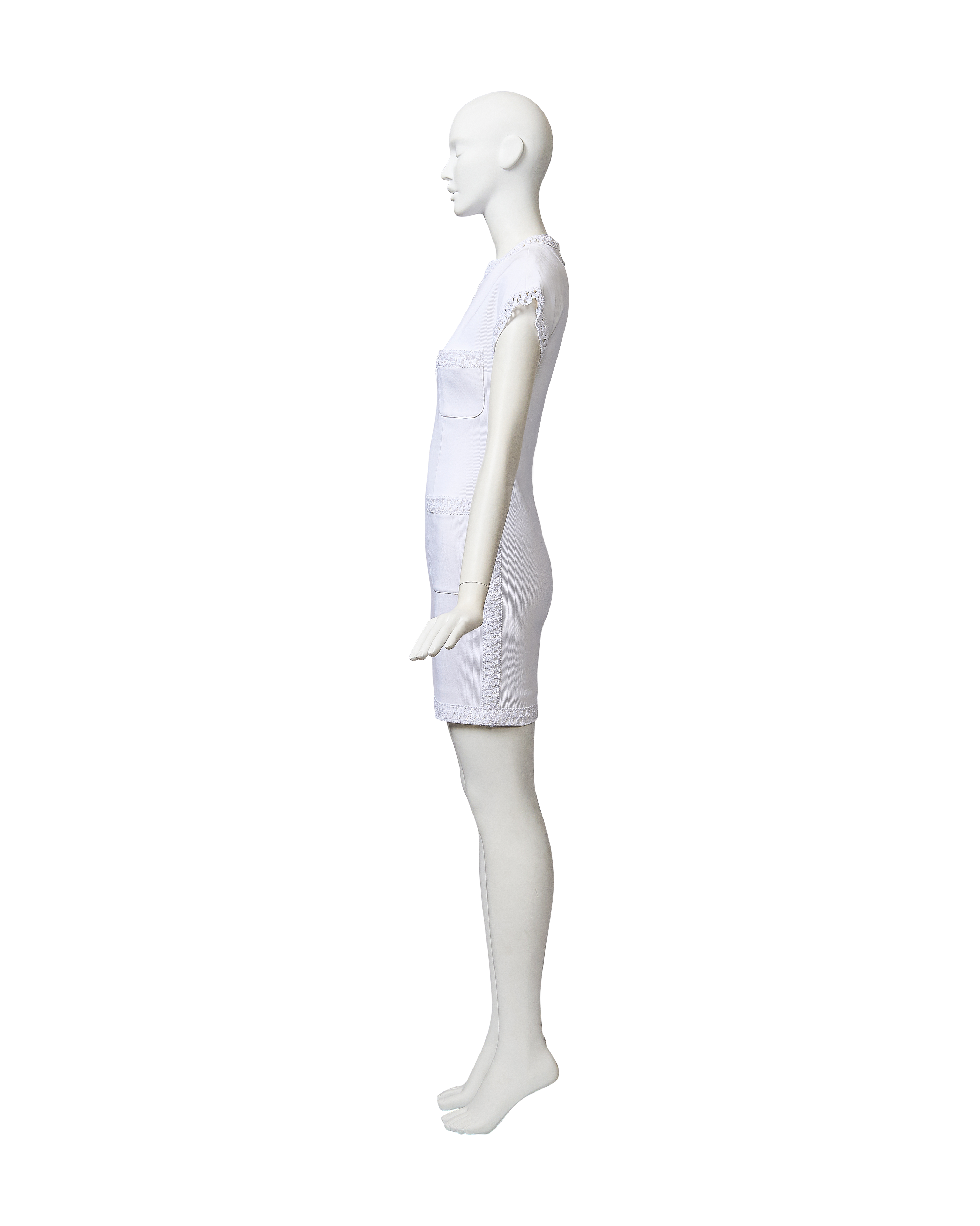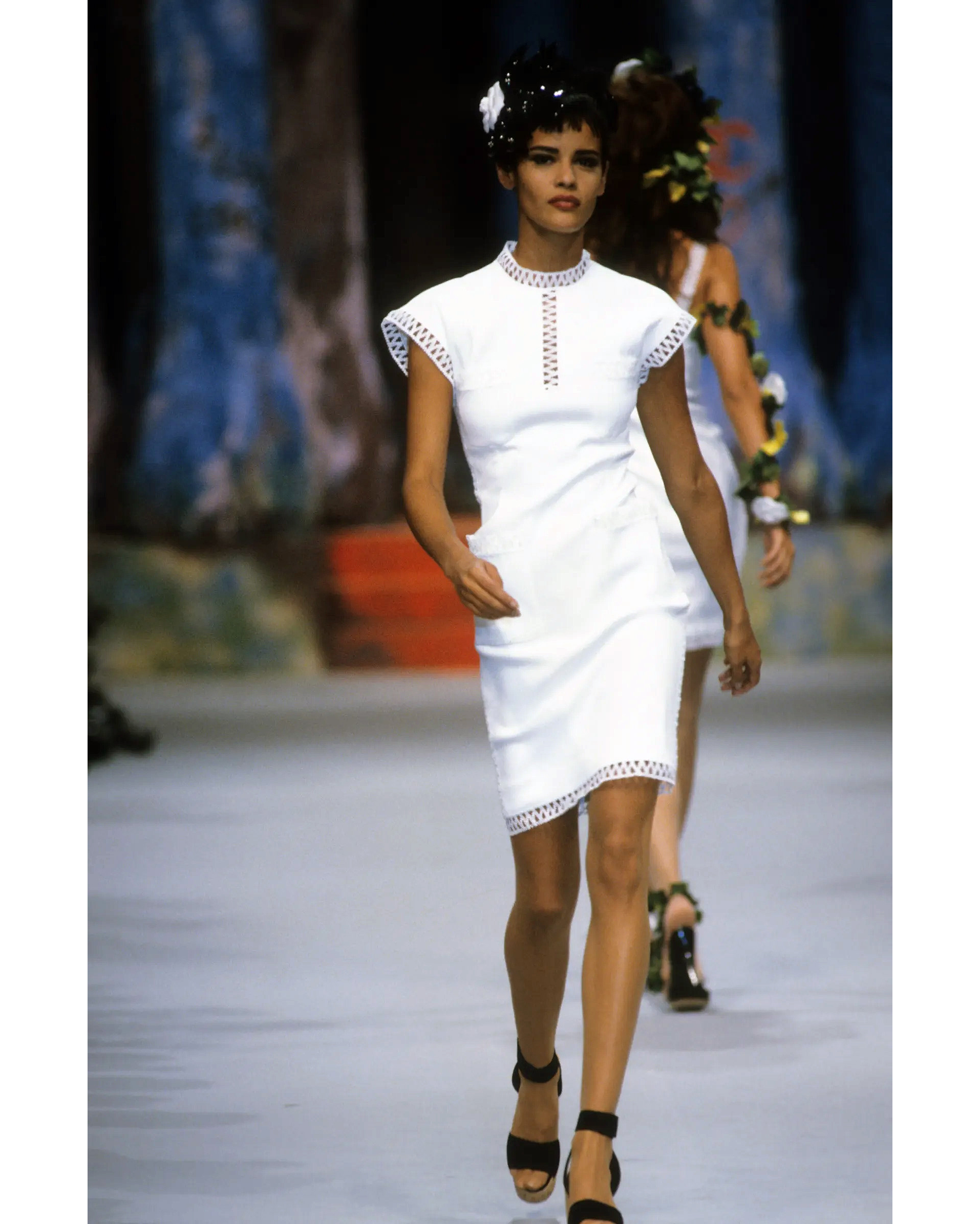 S/S 1992 Chanel by Karl Lagerfeld white woven short sleeve mini dress and camellia set. Semi-open woven trim detailing at neckline, sleeves and functional pockets (at bust and hip) with gold and white braided 'CC' button details. Concealed back zip closure and stretch ribbed fabric throughout allow for variations in sizing - fabric is blend of Cotton and Elastanne. As seen in the ad campaign on Claudia Schiffer, and featured on the runway (Look #57). In very good vintage condition with very faint spots throughout (unnoticeable unless upon close inspection) and wear at zipper pull; has been taken to couture cleaner and arrives ready to wear.