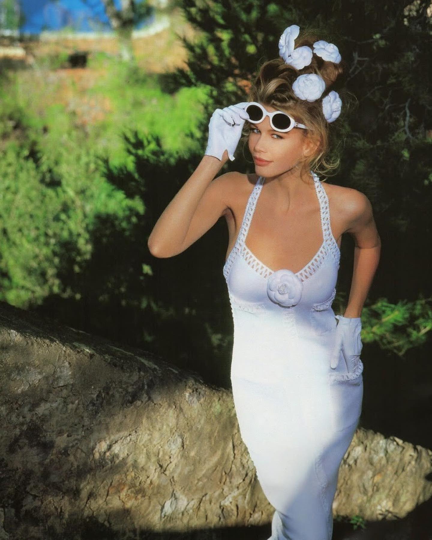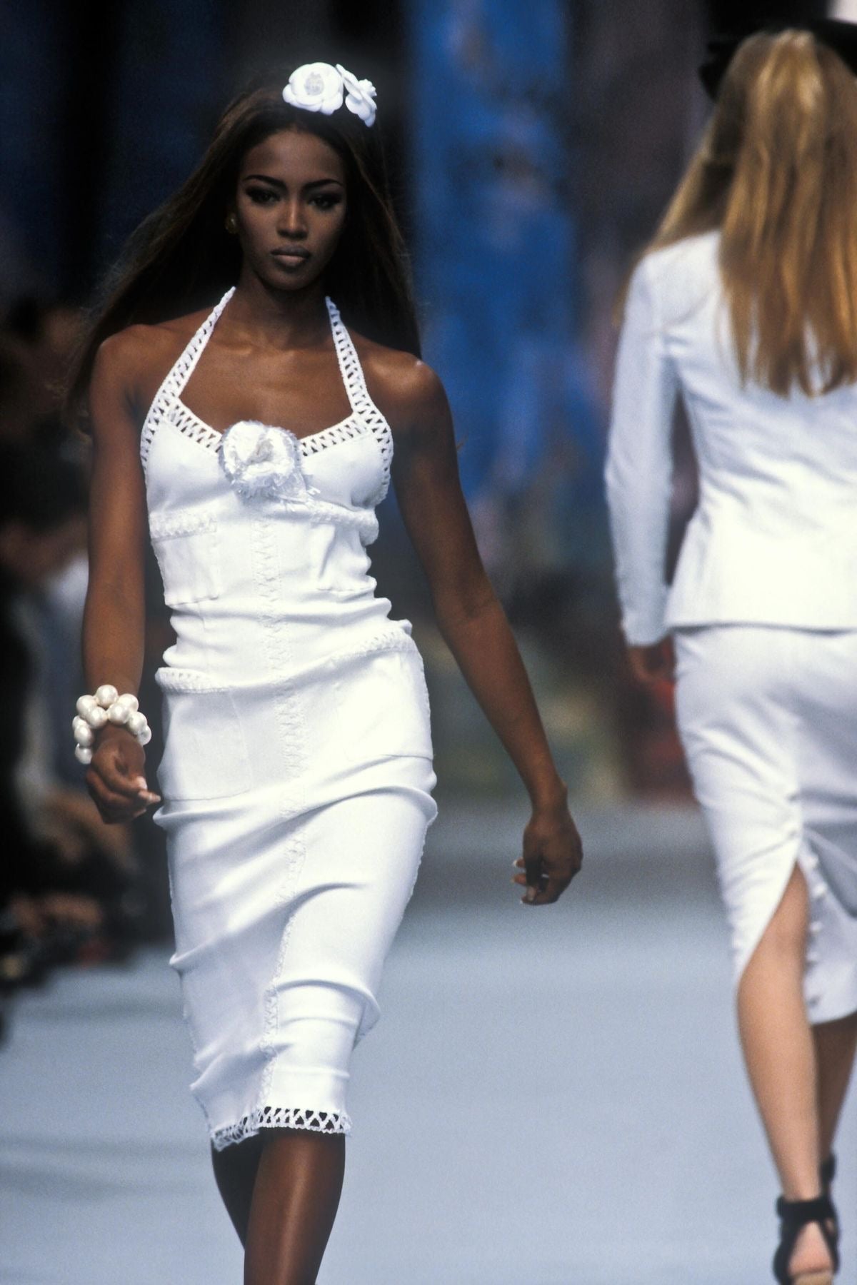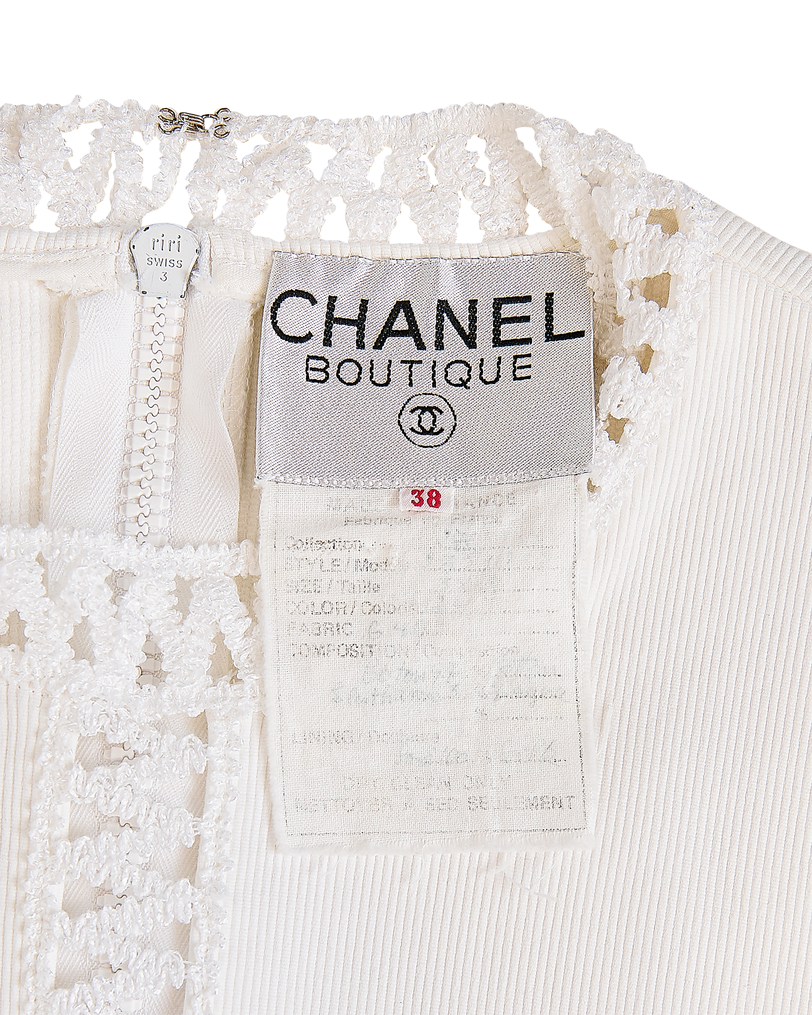 S/S 1992 Chanel by Karl Lagerfeld white woven short sleeve mini dress and camellia set. Semi-open woven trim detailing at neckline, sleeves and functional pockets (at bust and hip) with gold and white braided 'CC' button details. Concealed back zip closure and stretch ribbed fabric throughout allow for variations in sizing - fabric is blend of Cotton and Elastanne. As seen in the ad campaign on Claudia Schiffer, and featured on the runway (Look #57). In very good vintage condition with very faint spots throughout (unnoticeable unless upon close inspection) and wear at zipper pull; has been taken to couture cleaner and arrives ready to wear.