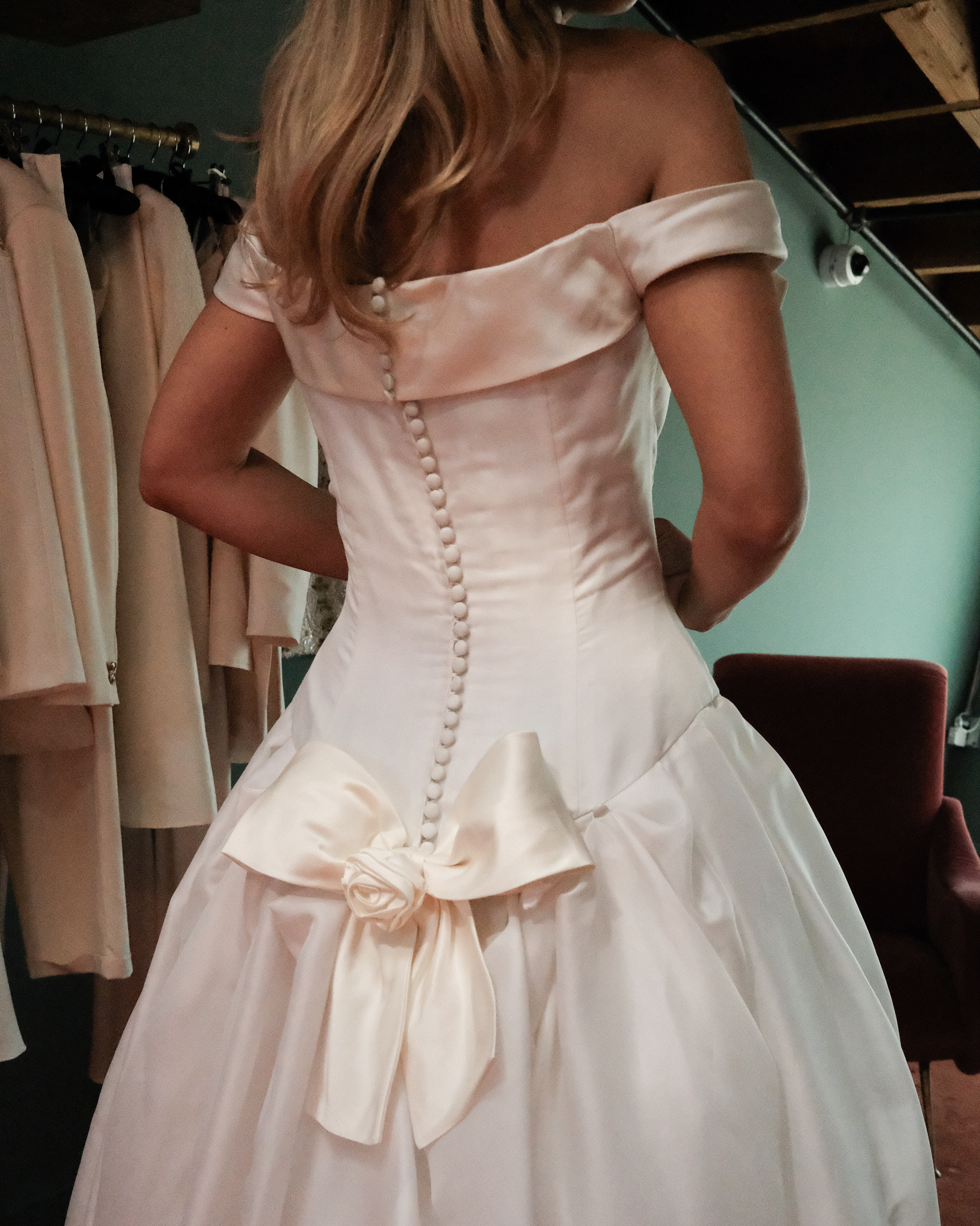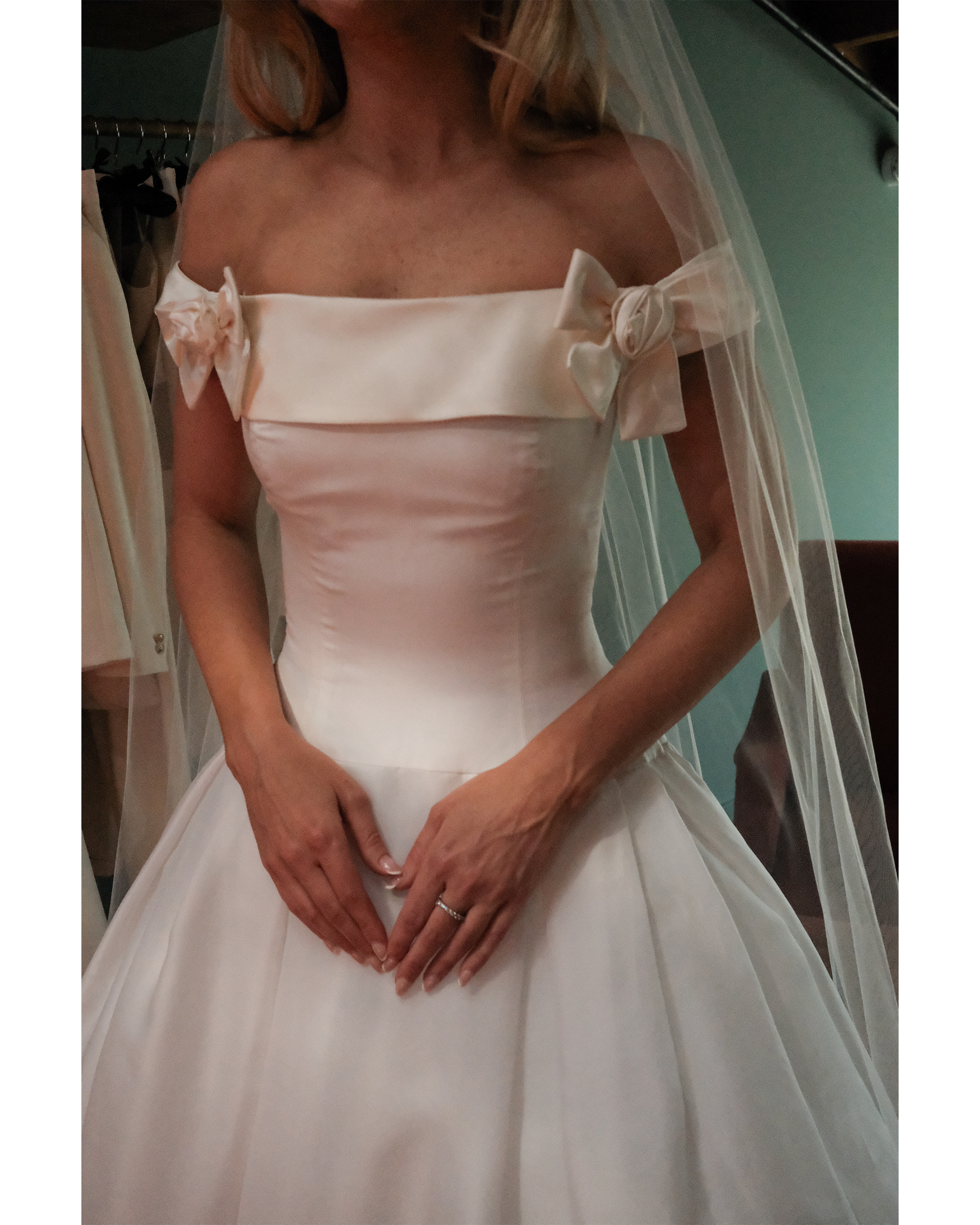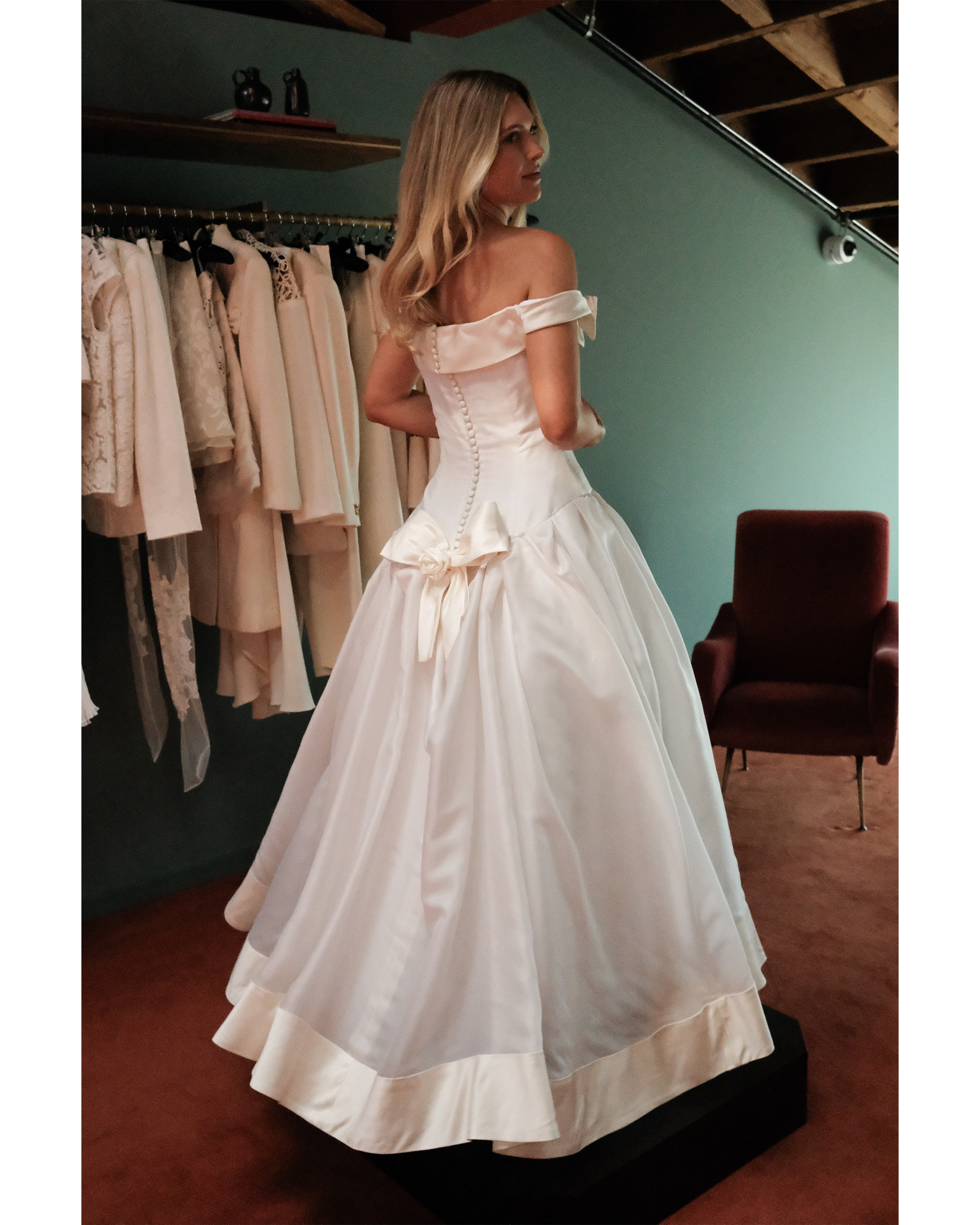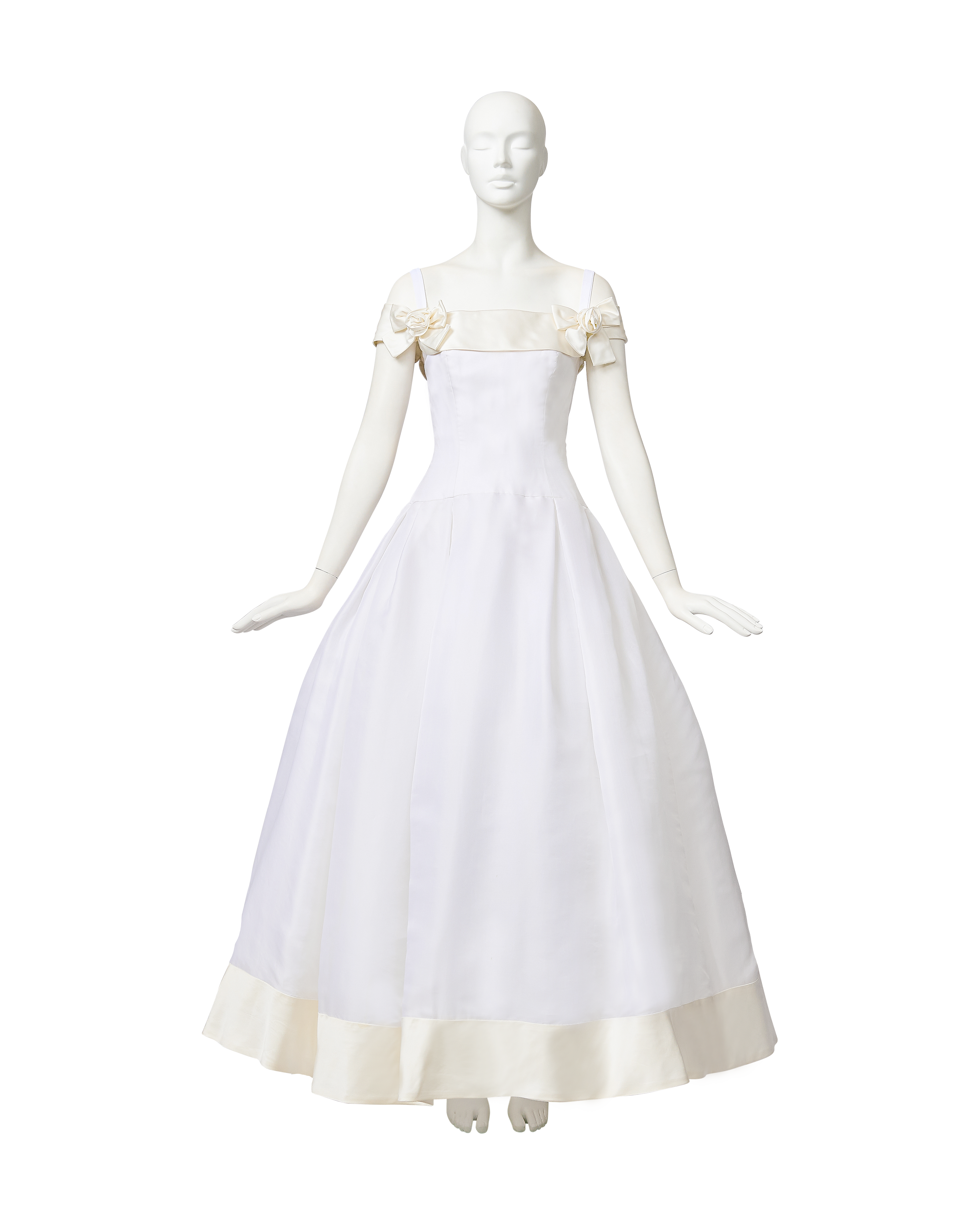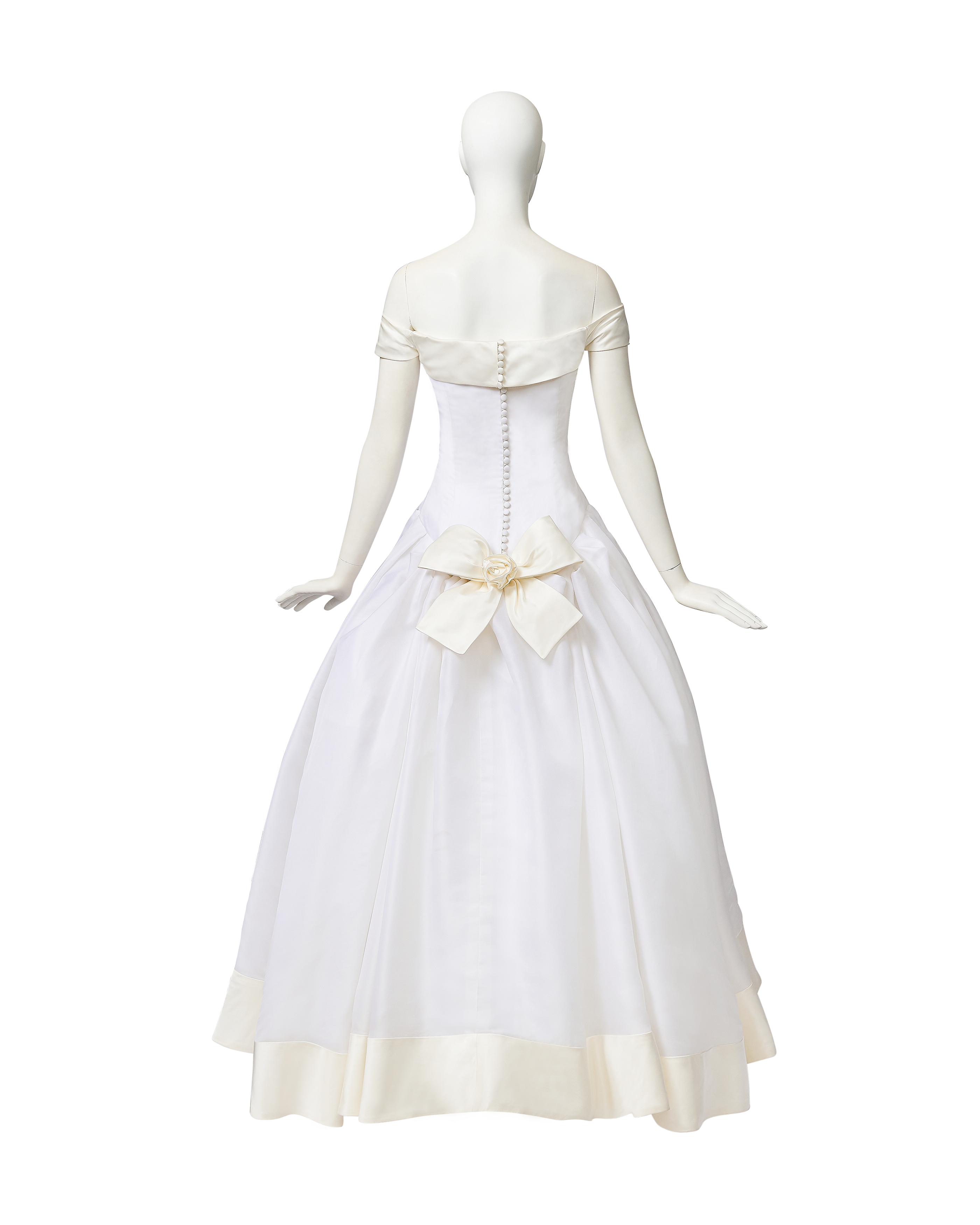 1999 Off-Shoulder Ivory Ballgown with Ecru Bow Details