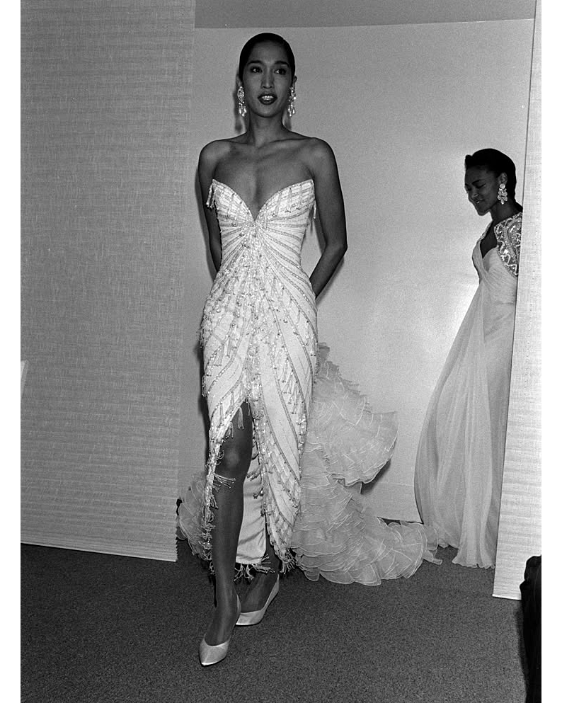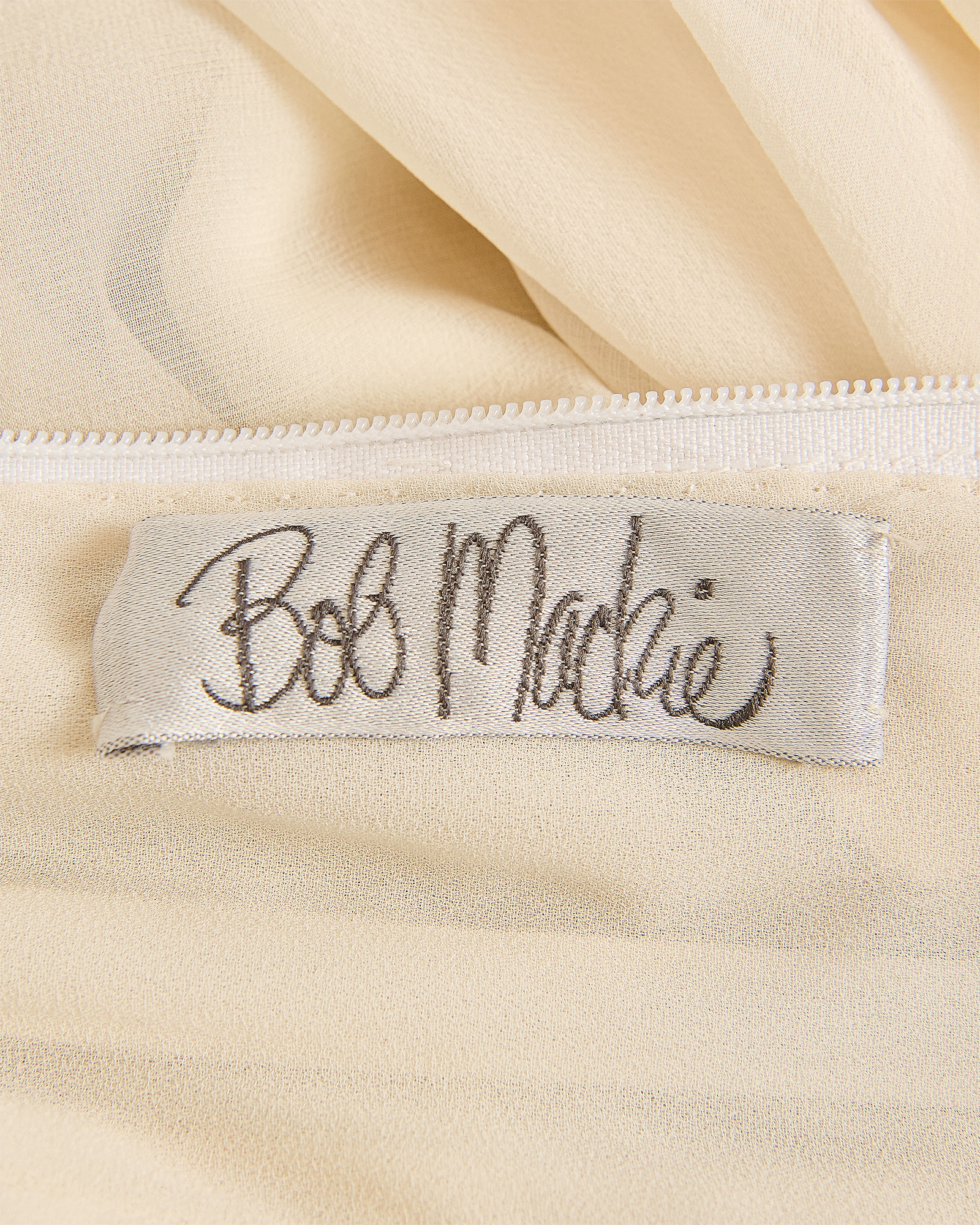 c. 1990 Bob Mackie ivory and gold beaded embellished strapless bustier gown. Boned strapless sweetheart bustier with gold-tone leaf pattern embellished beaded and rhinestone detailing throughout, featuring gold beaded fringe tassels at waist. Multi-layered full skirting creates beautiful movement when worn. Center back zip closure. Similar featured on the runway. In very good vintage condition with moderate spotting at interior and very faint spotting at exterior layers (unnoticeable when worn).