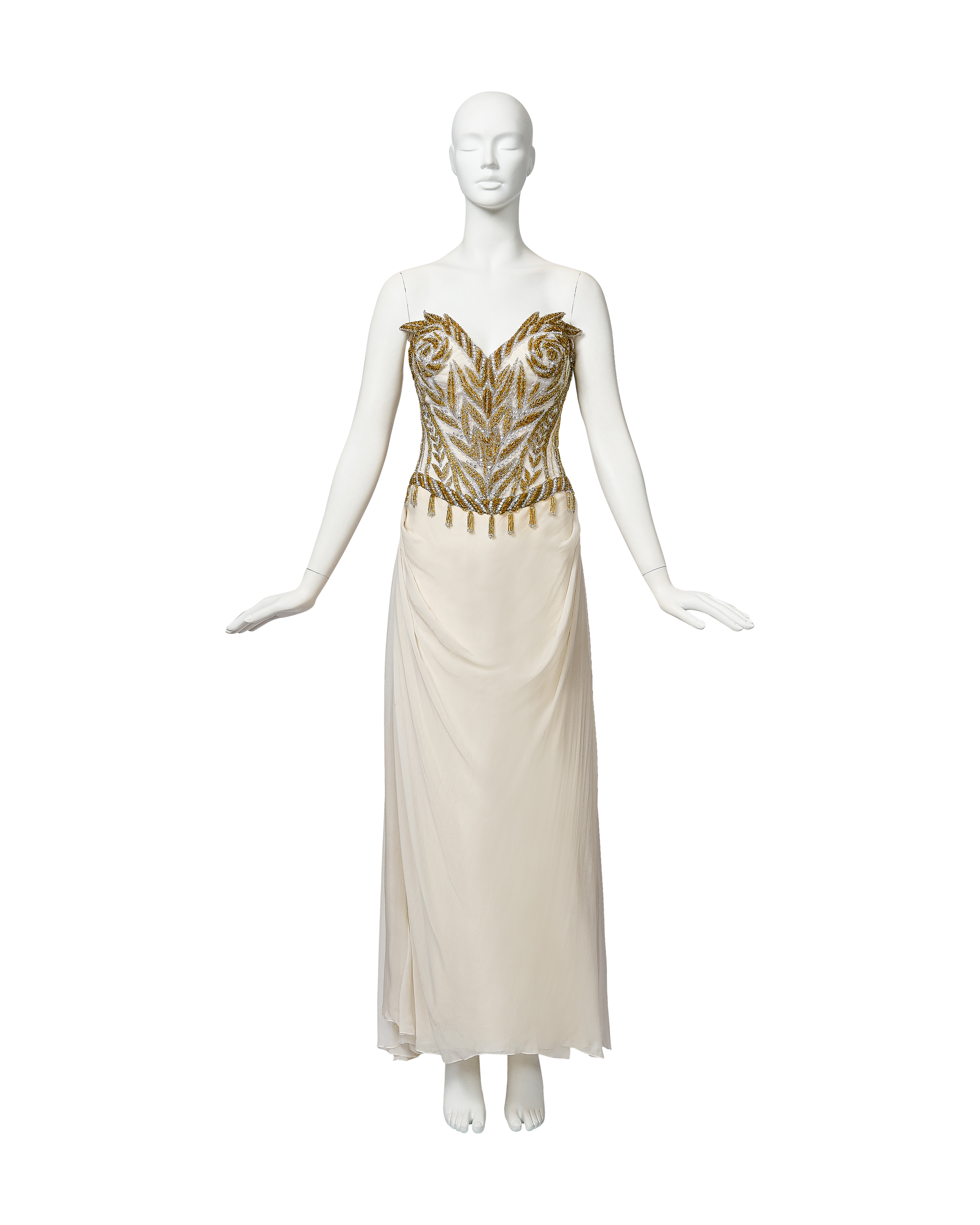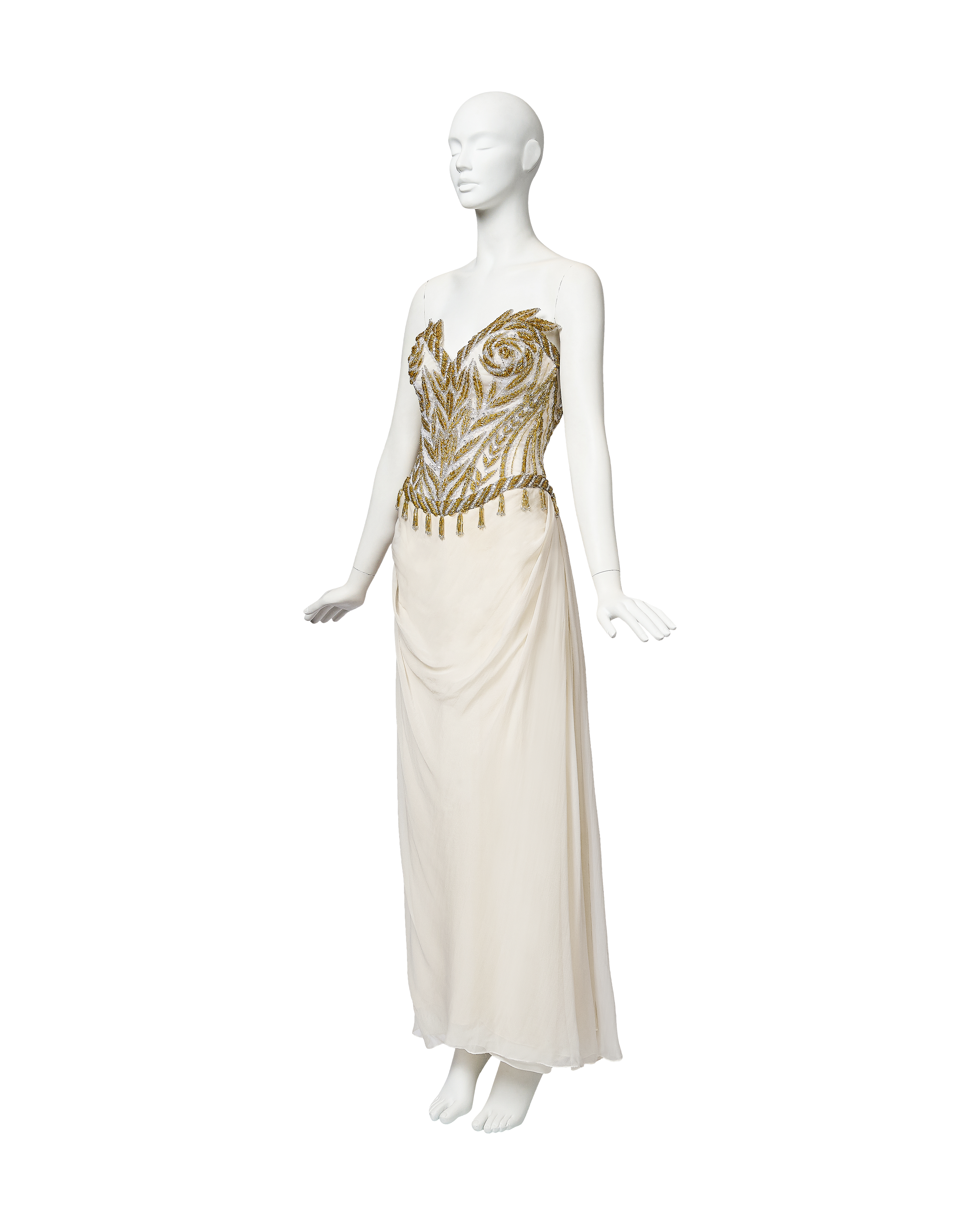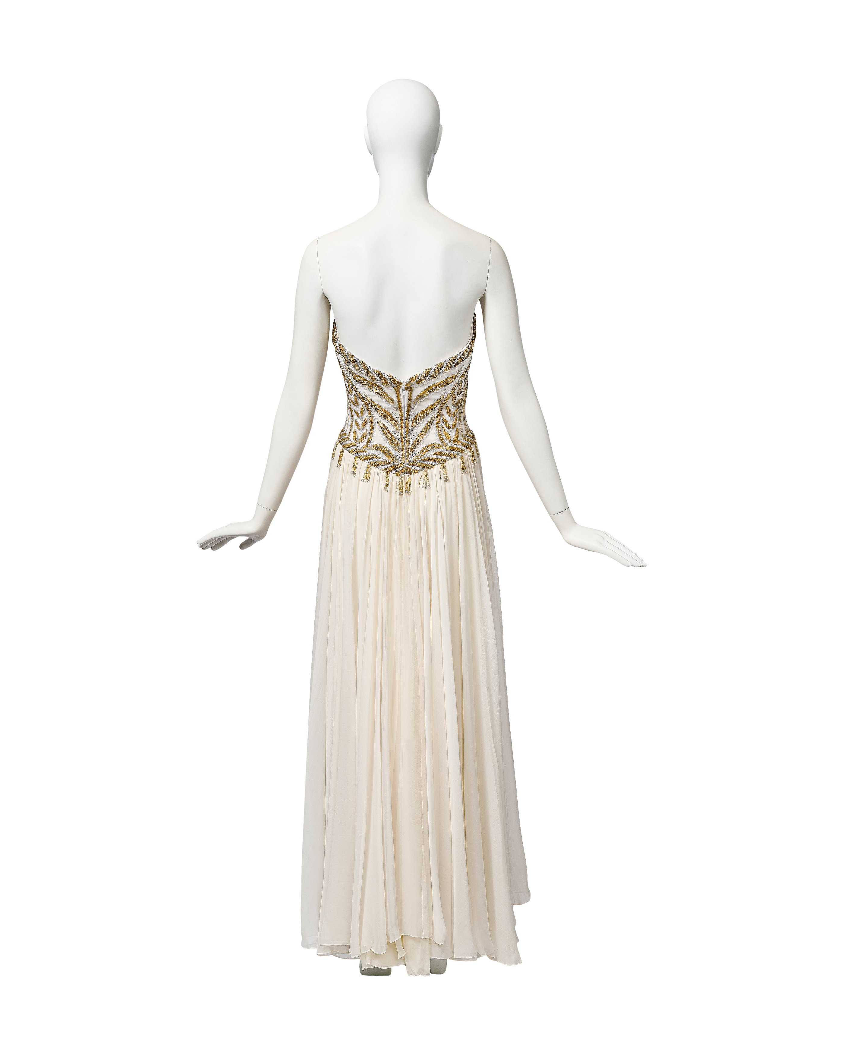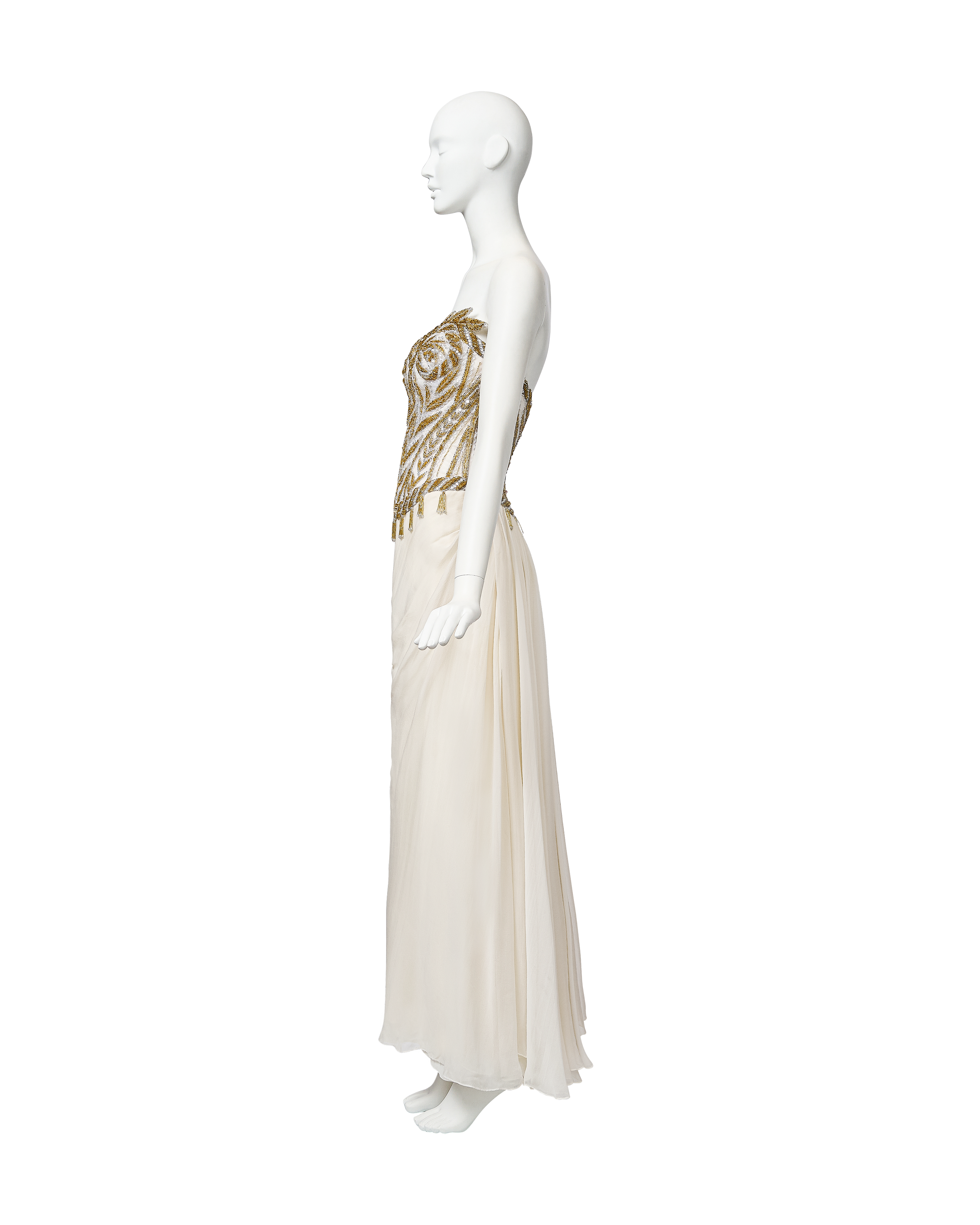 c. 1990 Ivory and Gold Beaded Embellished Strapless Bustier Gown