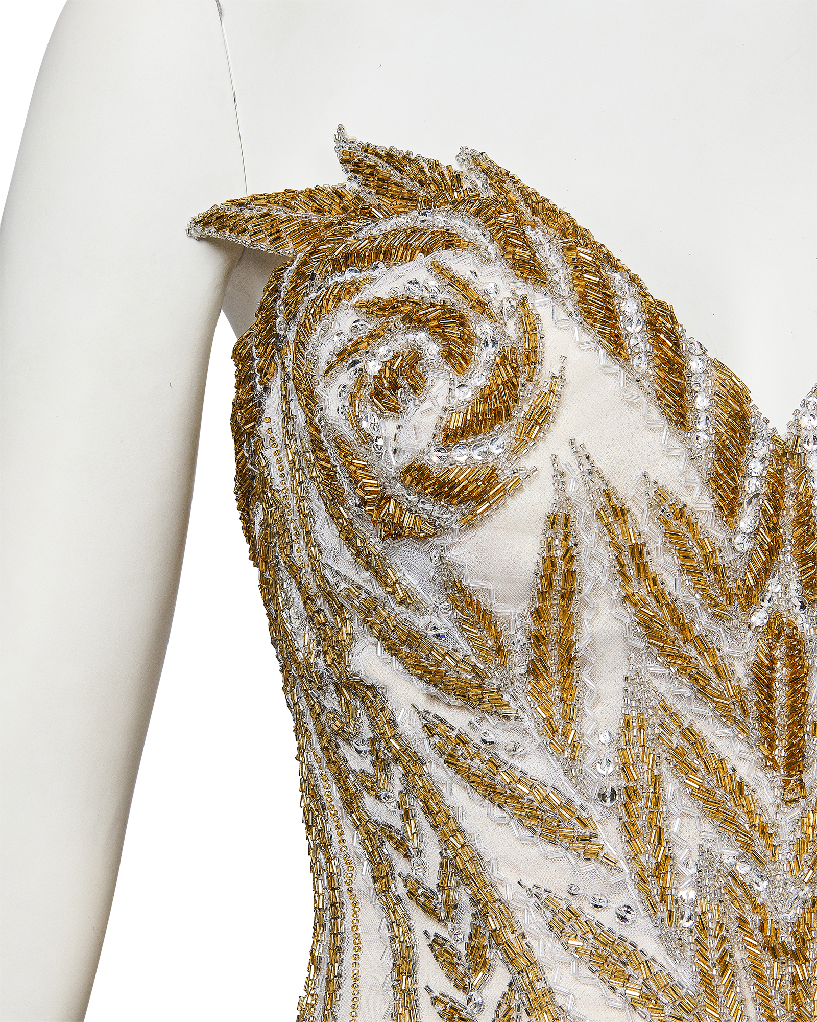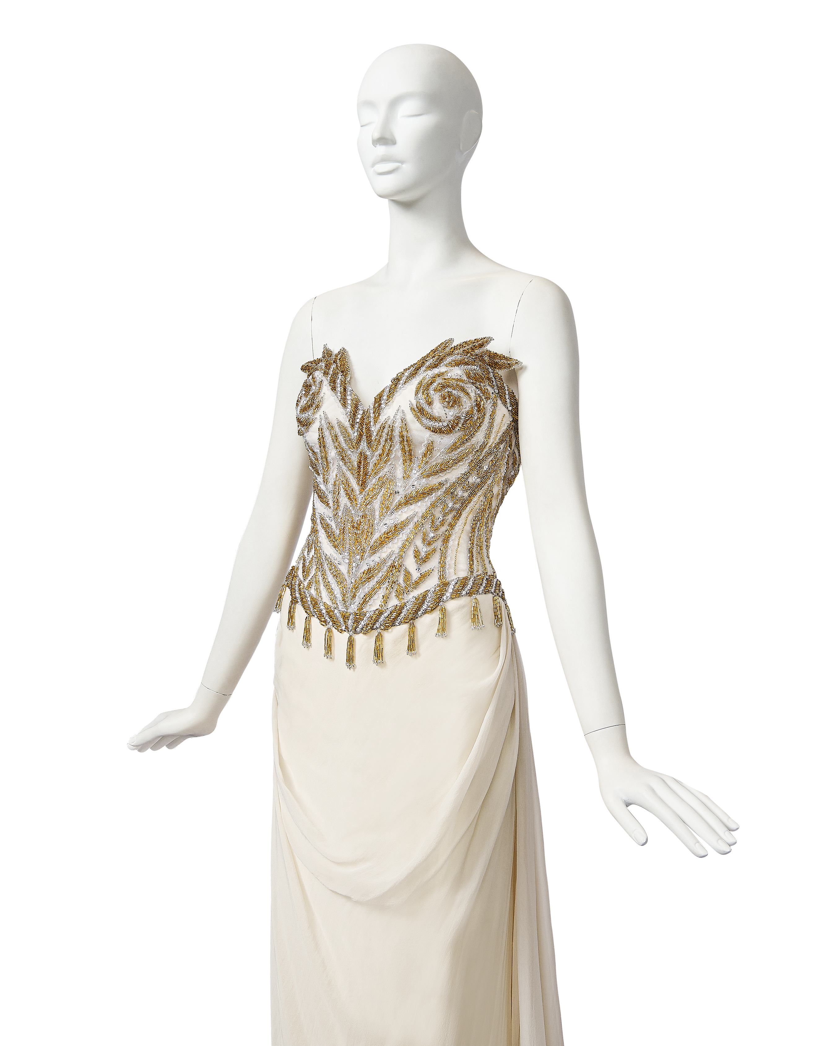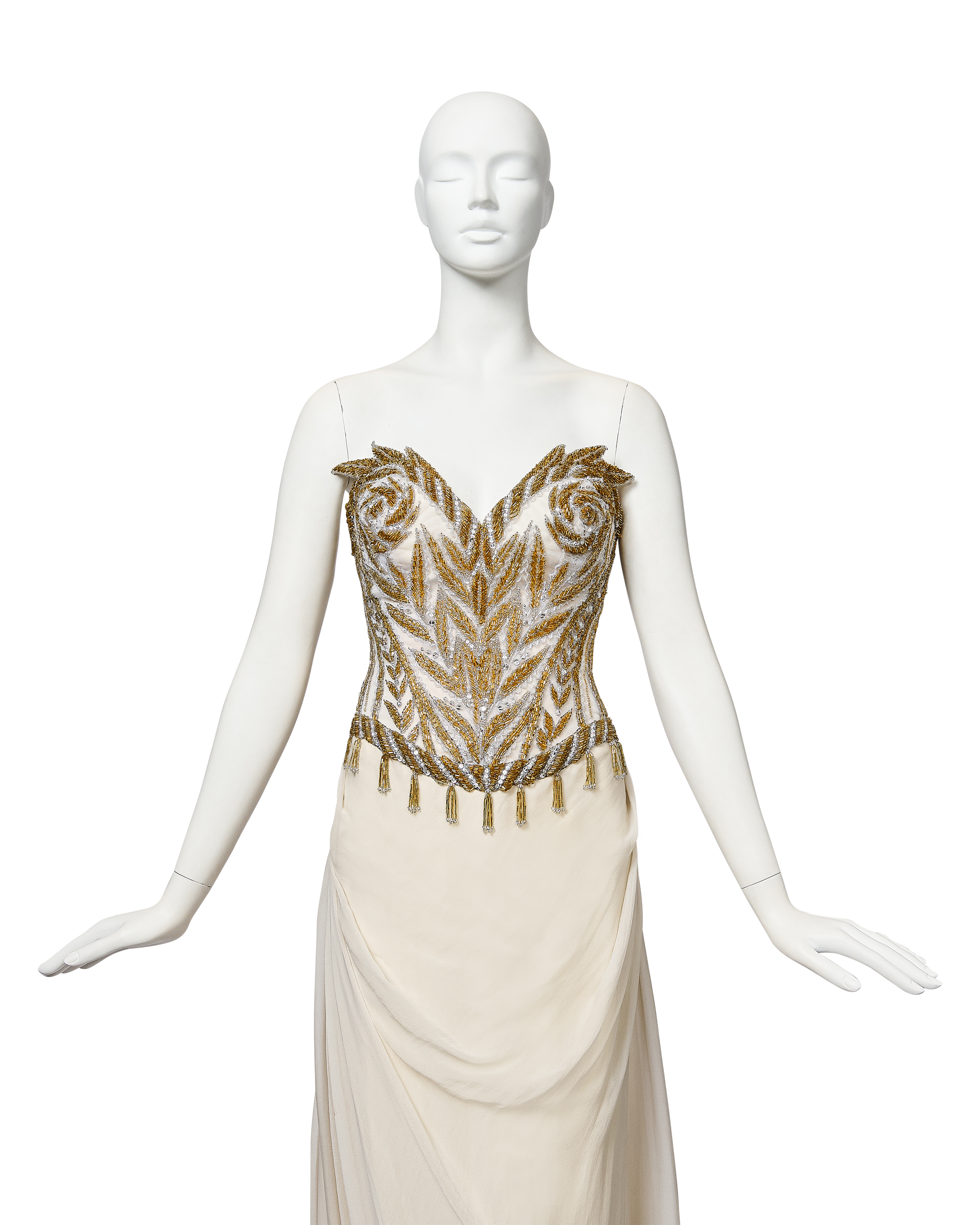 c. 1990 Ivory and Gold Beaded Embellished Strapless Bustier Gown