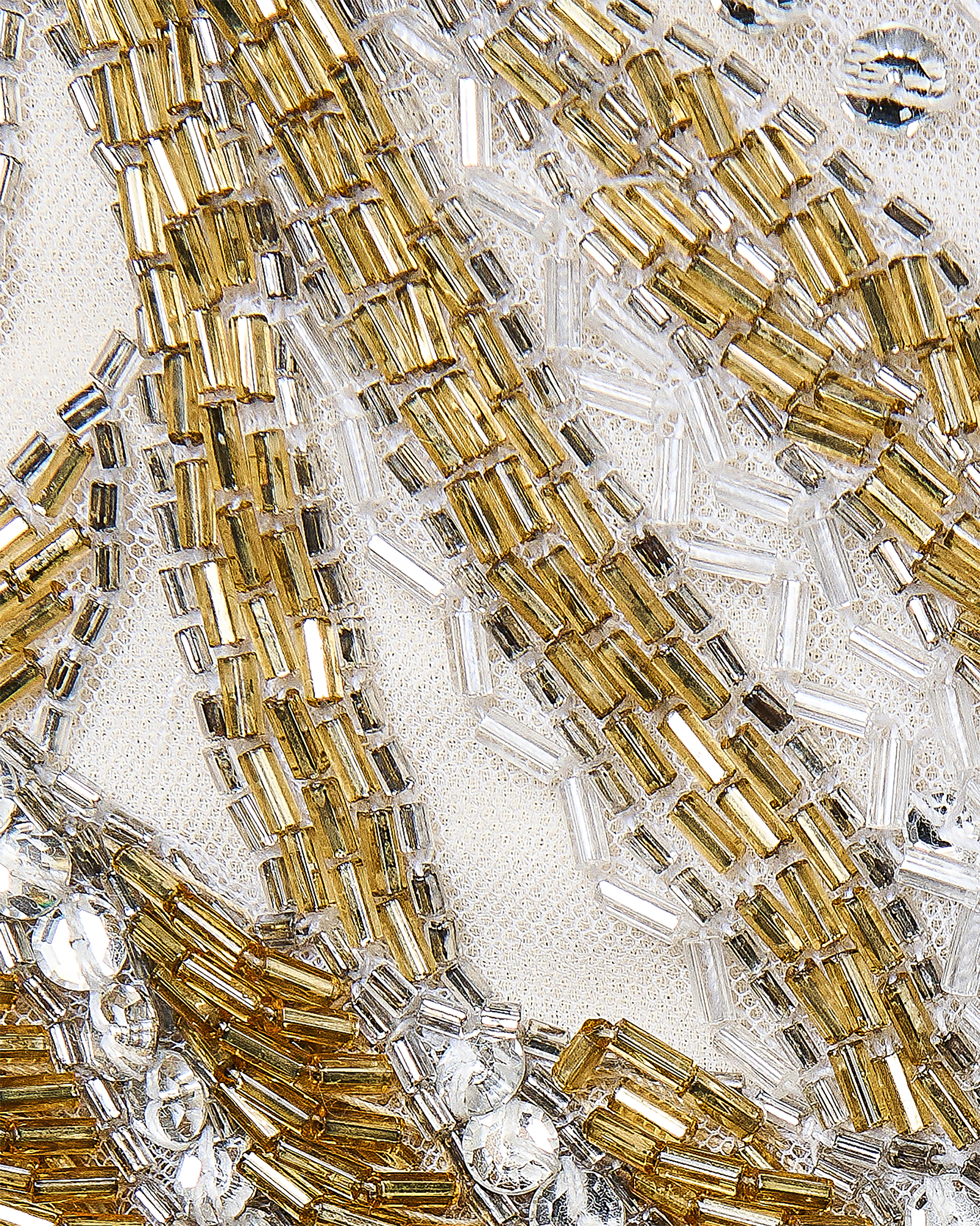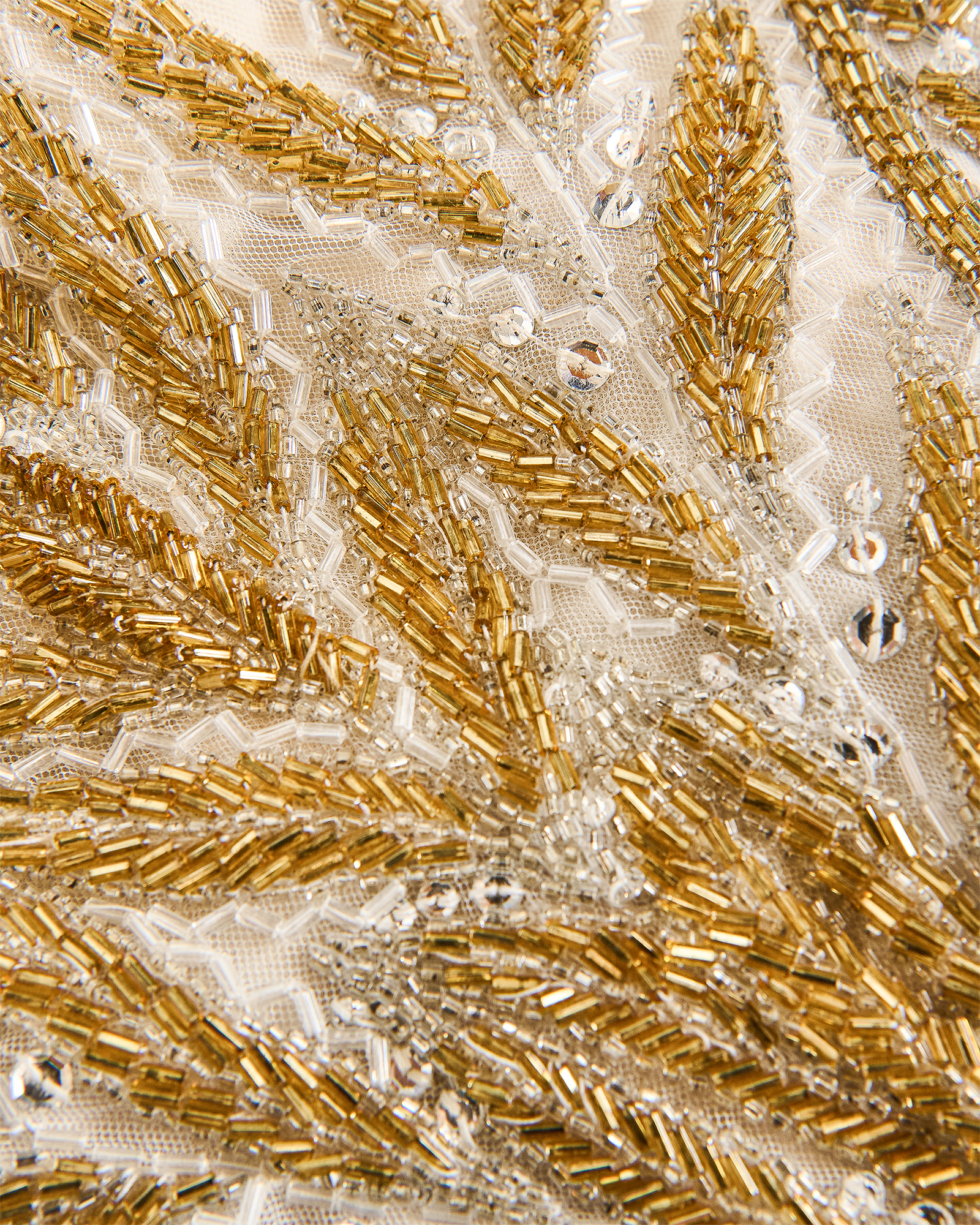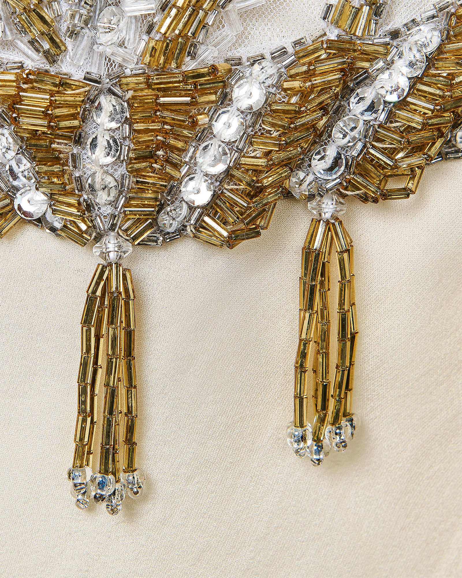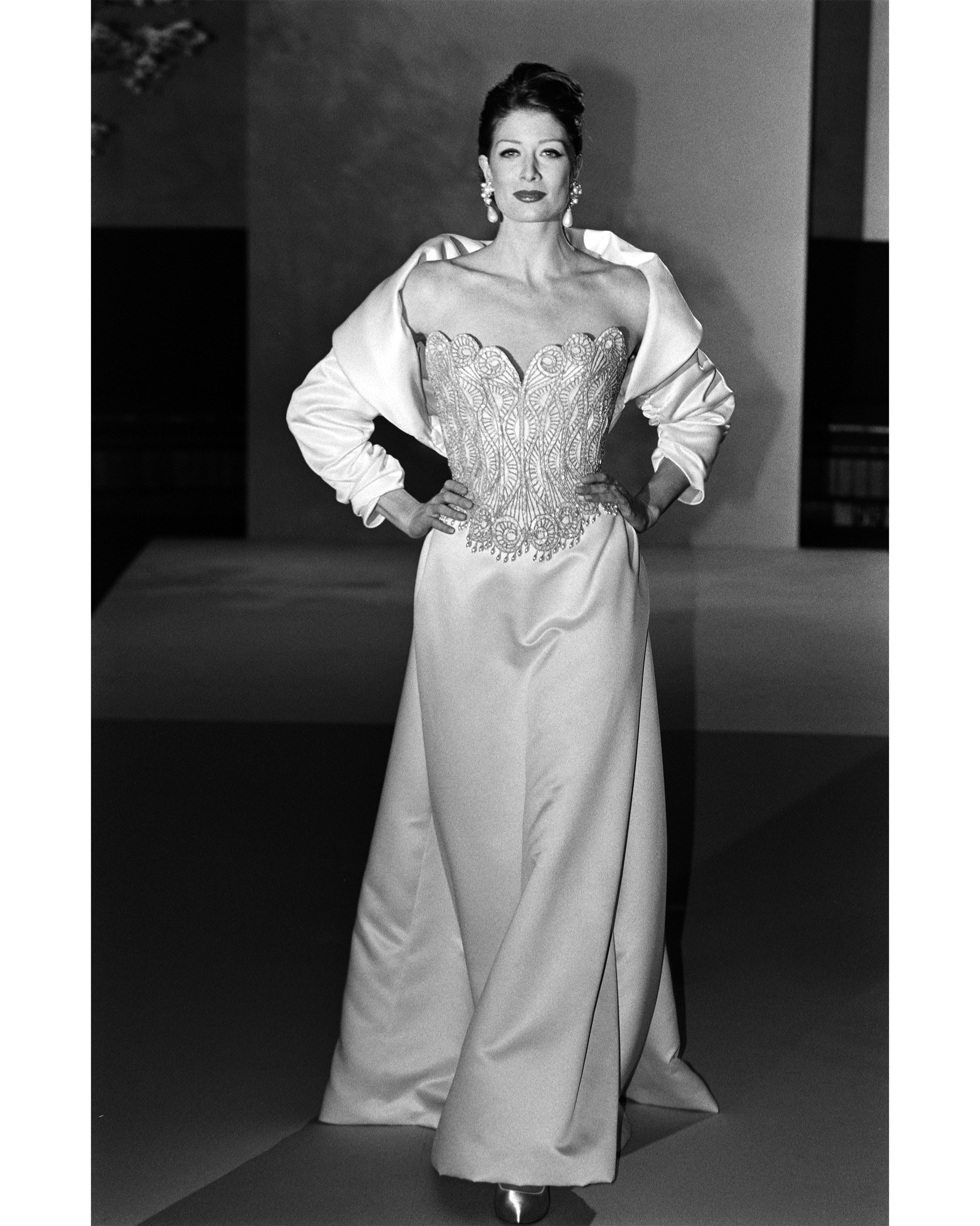 c. 1990 Ivory and Gold Beaded Embellished Strapless Bustier Gown