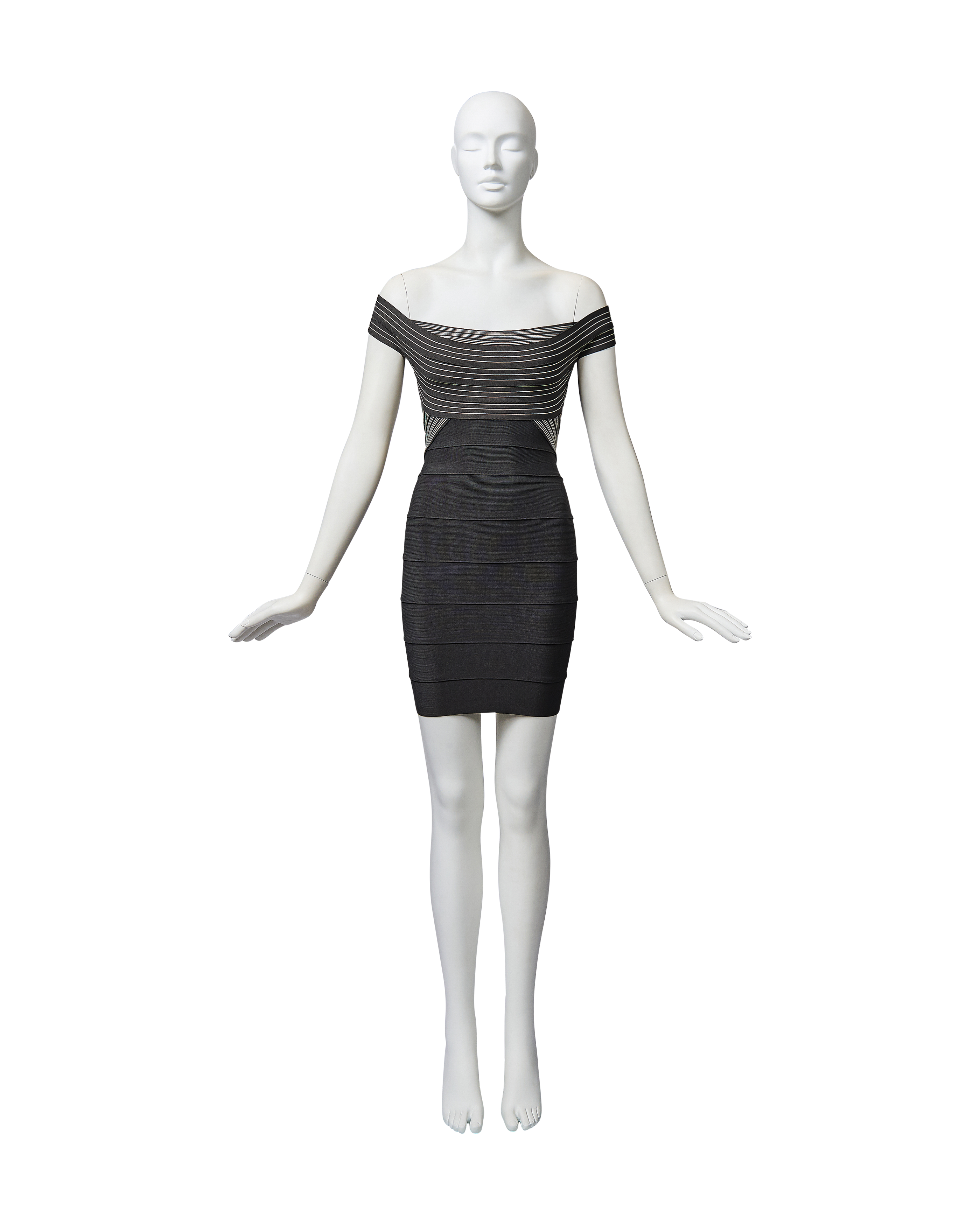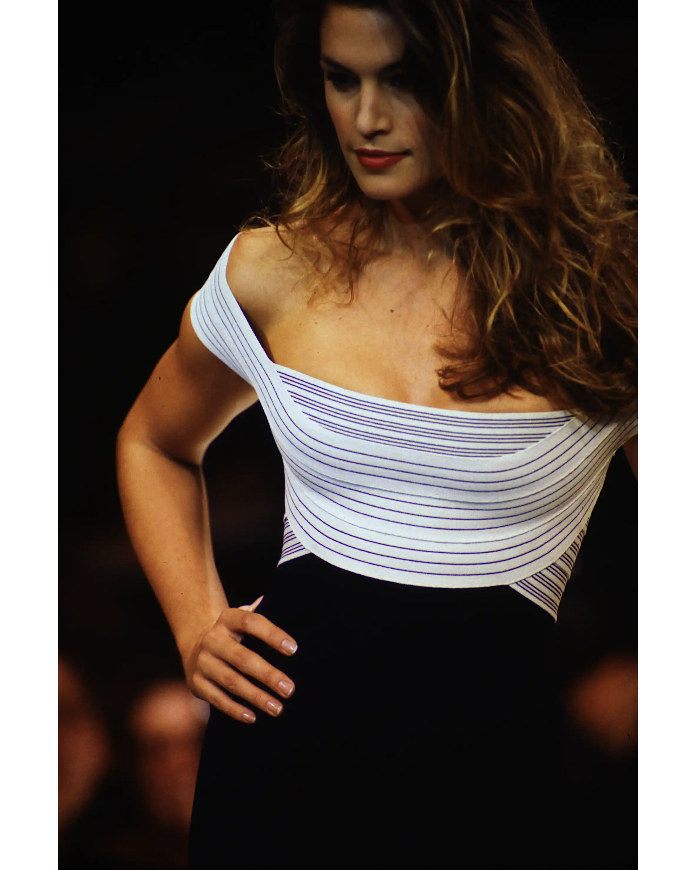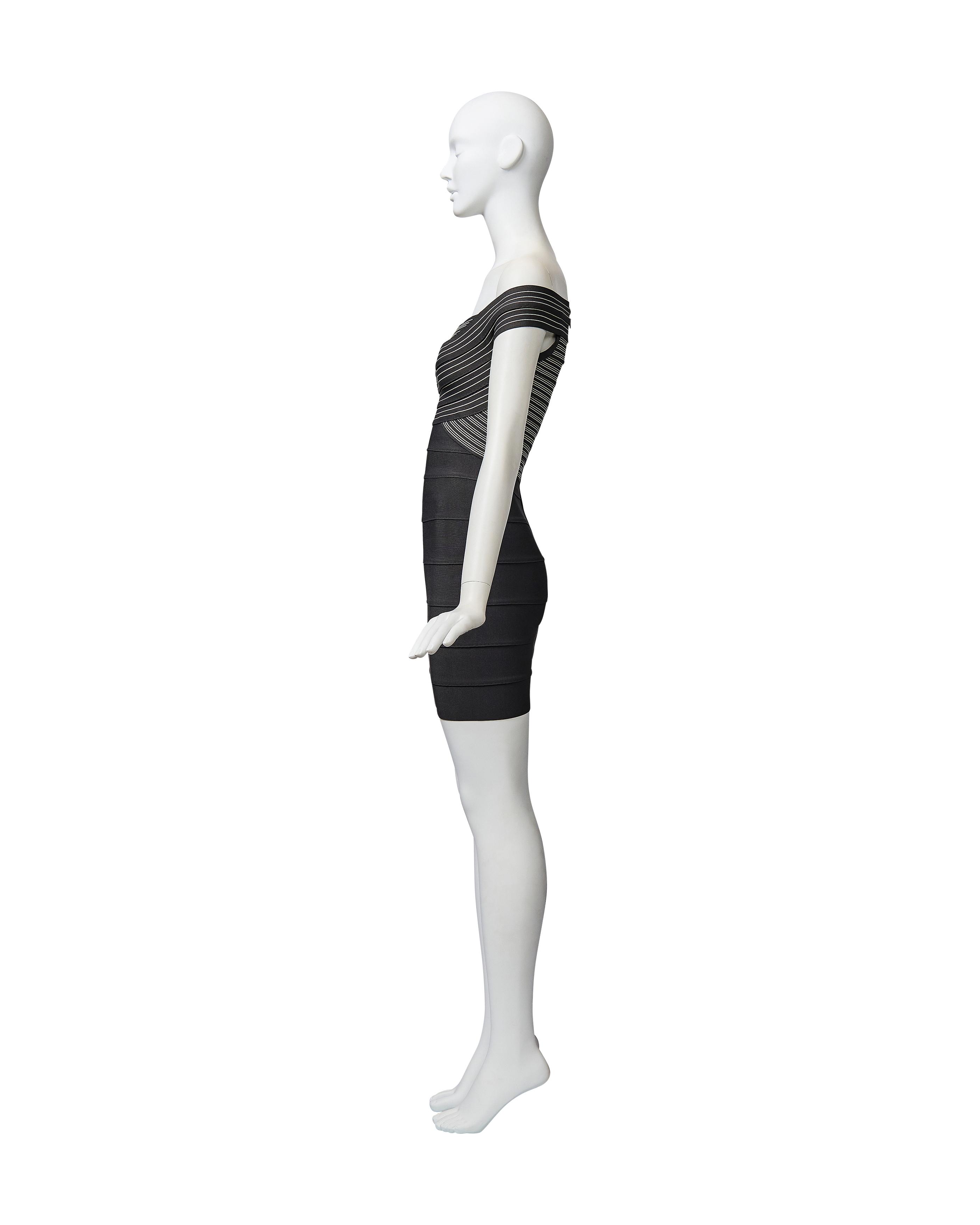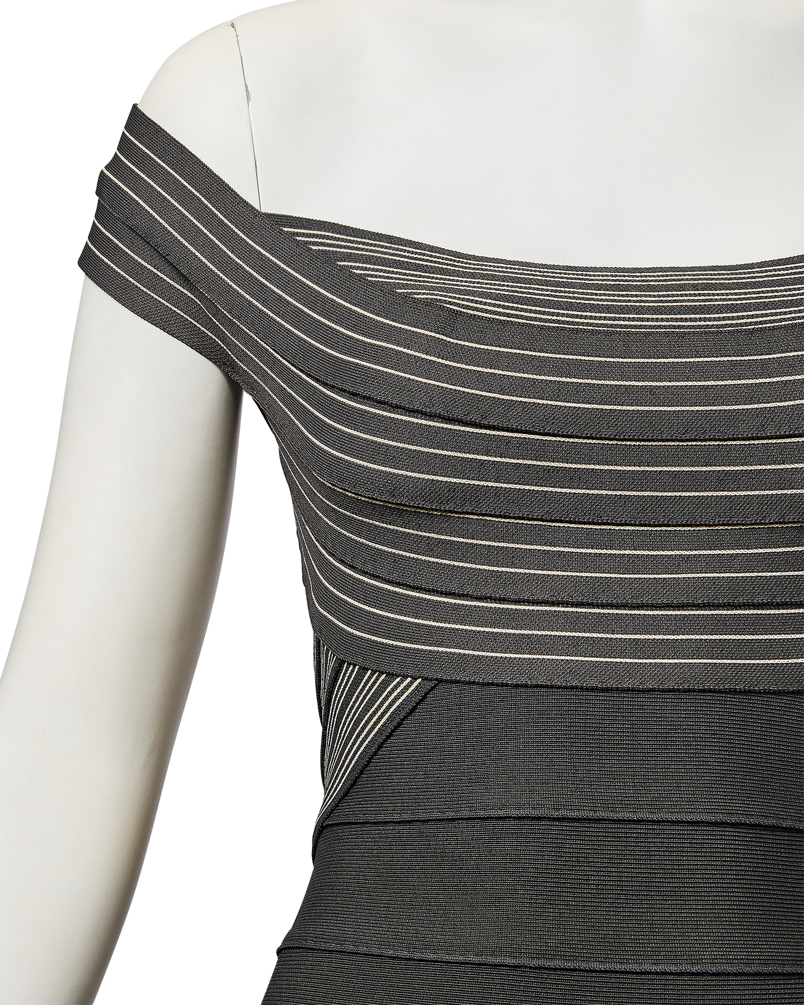 S/S 1994 Hervé Léger gray and ivory striped bandage mini dress. Sleeveless off-shoulder / square neck mini dress with alternating gray and ivory stripes at bust and dark gray lower skirting. Fabric Contents: 90% Rayon and 10% Spandex blend. Concealed center back zip closure and interior grip tape paneling to easily adhere off shoulder when worn. As seen on the runway; also featured on Cindy Crawford in gown length variation and gray/black colorway. In excellent vintage condition with no flaws to note.