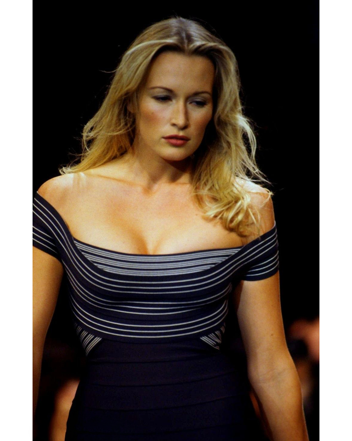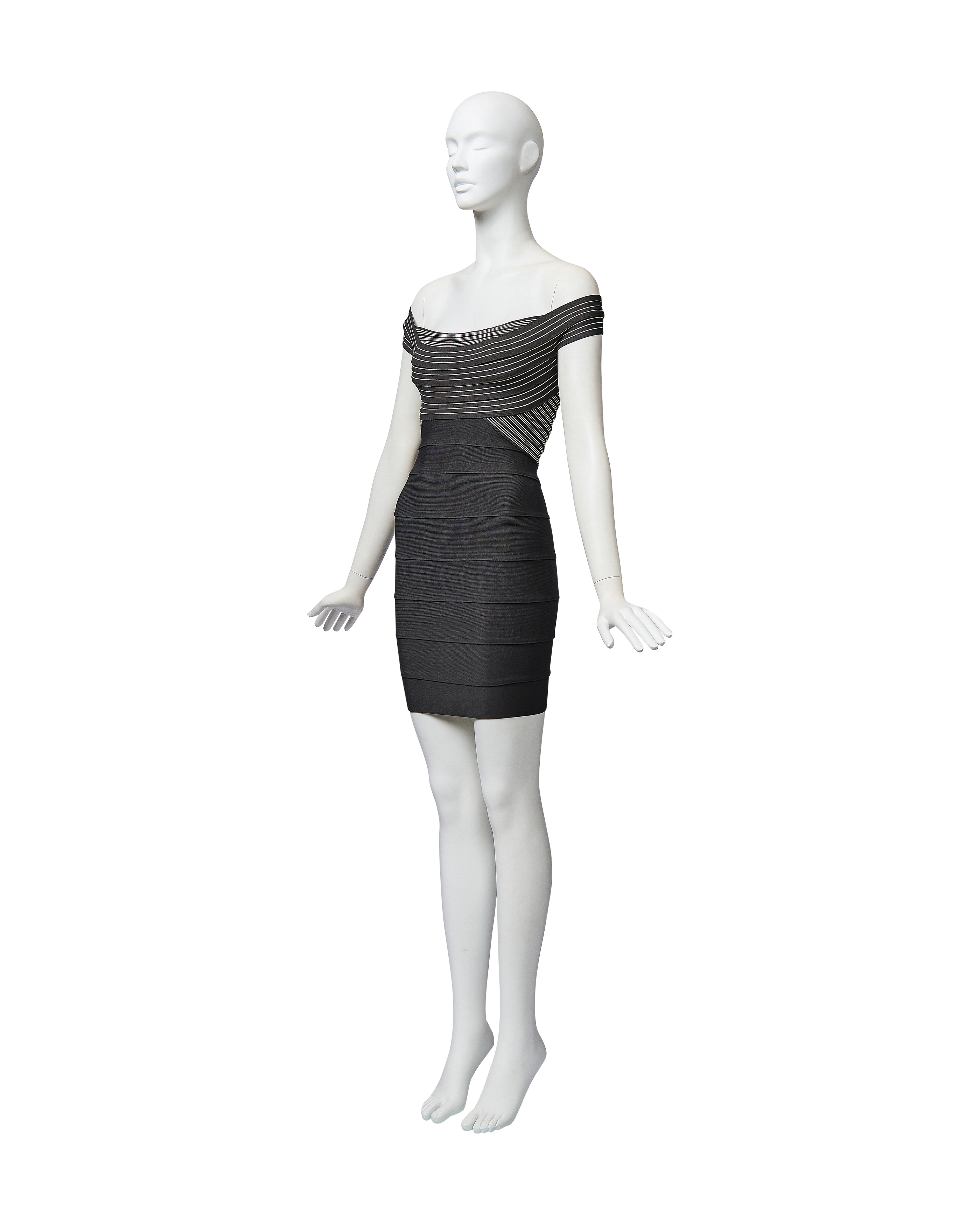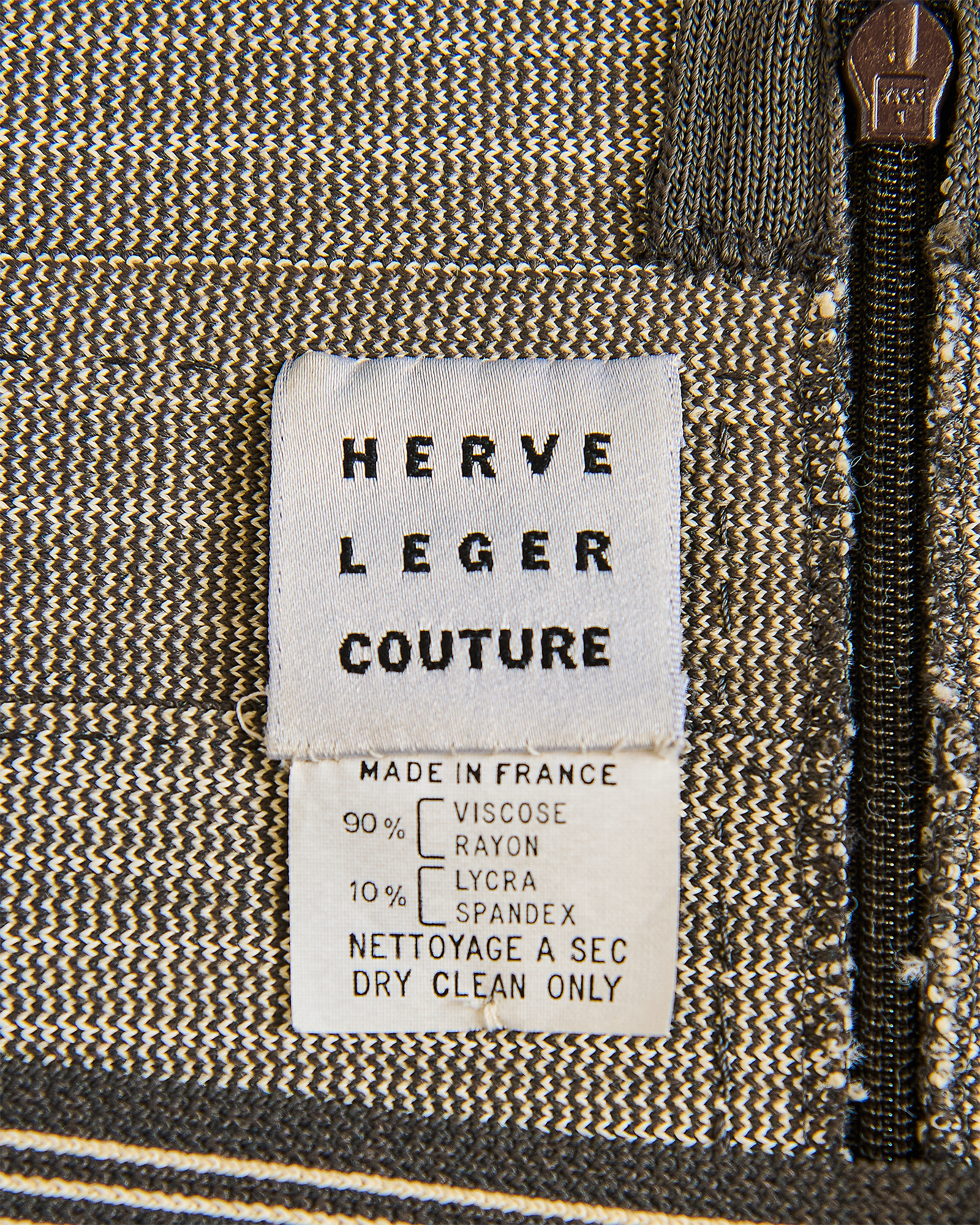 S/S 1994 Hervé Léger gray and ivory striped bandage mini dress. Sleeveless off-shoulder / square neck mini dress with alternating gray and ivory stripes at bust and dark gray lower skirting. Fabric Contents: 90% Rayon and 10% Spandex blend. Concealed center back zip closure and interior grip tape paneling to easily adhere off shoulder when worn. As seen on the runway; also featured on Cindy Crawford in gown length variation and gray/black colorway. In excellent vintage condition with no flaws to note.