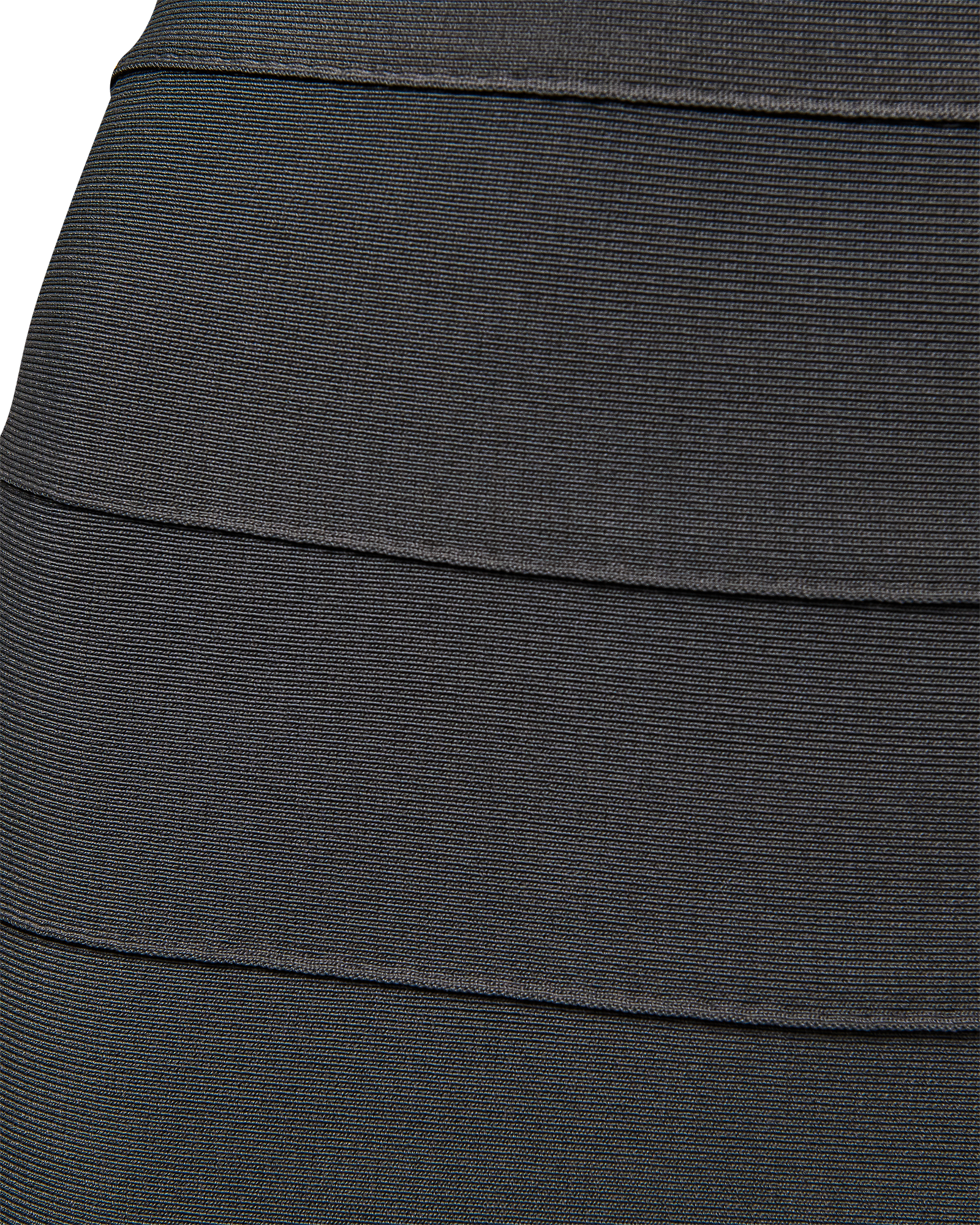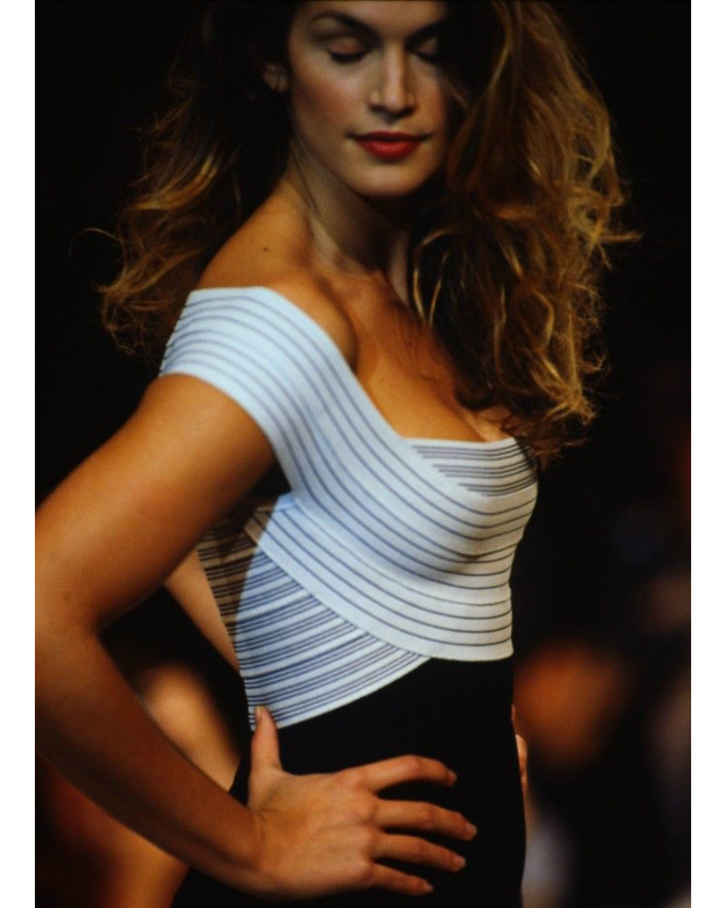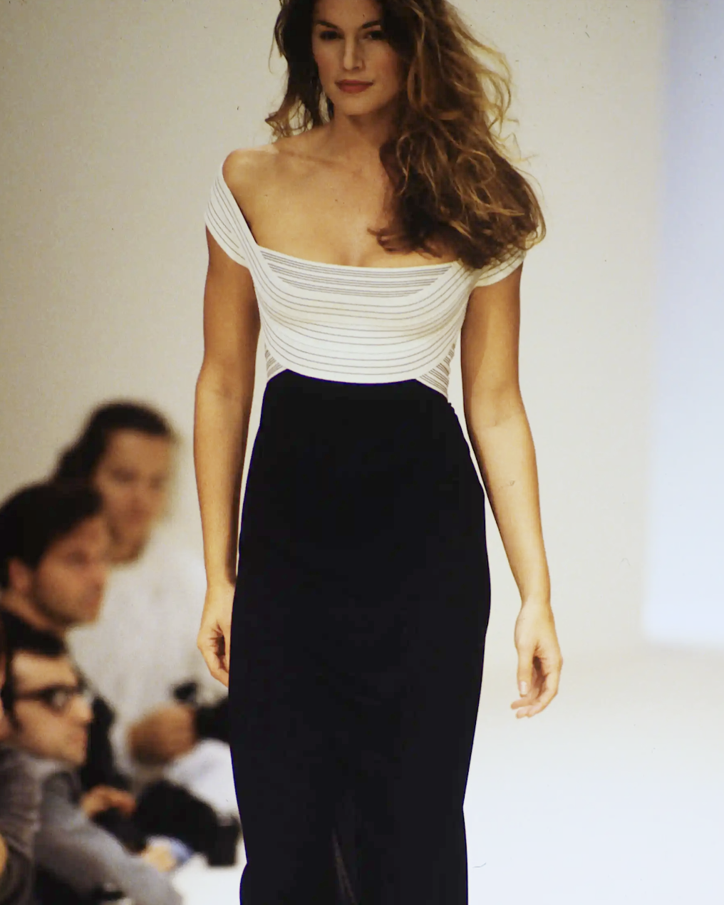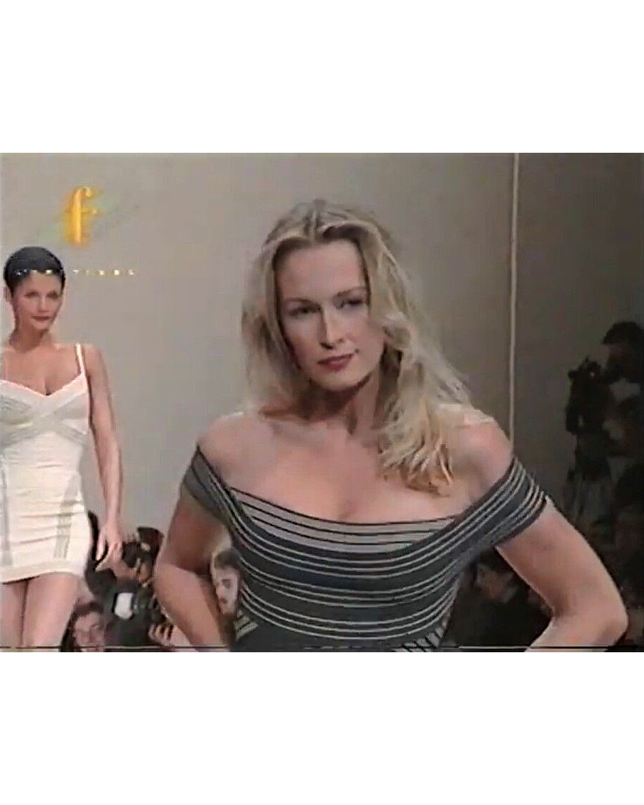 S/S 1994 Hervé Léger gray and ivory striped bandage mini dress. Sleeveless off-shoulder / square neck mini dress with alternating gray and ivory stripes at bust and dark gray lower skirting. Fabric Contents: 90% Rayon and 10% Spandex blend. Concealed center back zip closure and interior grip tape paneling to easily adhere off shoulder when worn. As seen on the runway; also featured on Cindy Crawford in gown length variation and gray/black colorway. In excellent vintage condition with no flaws to note.