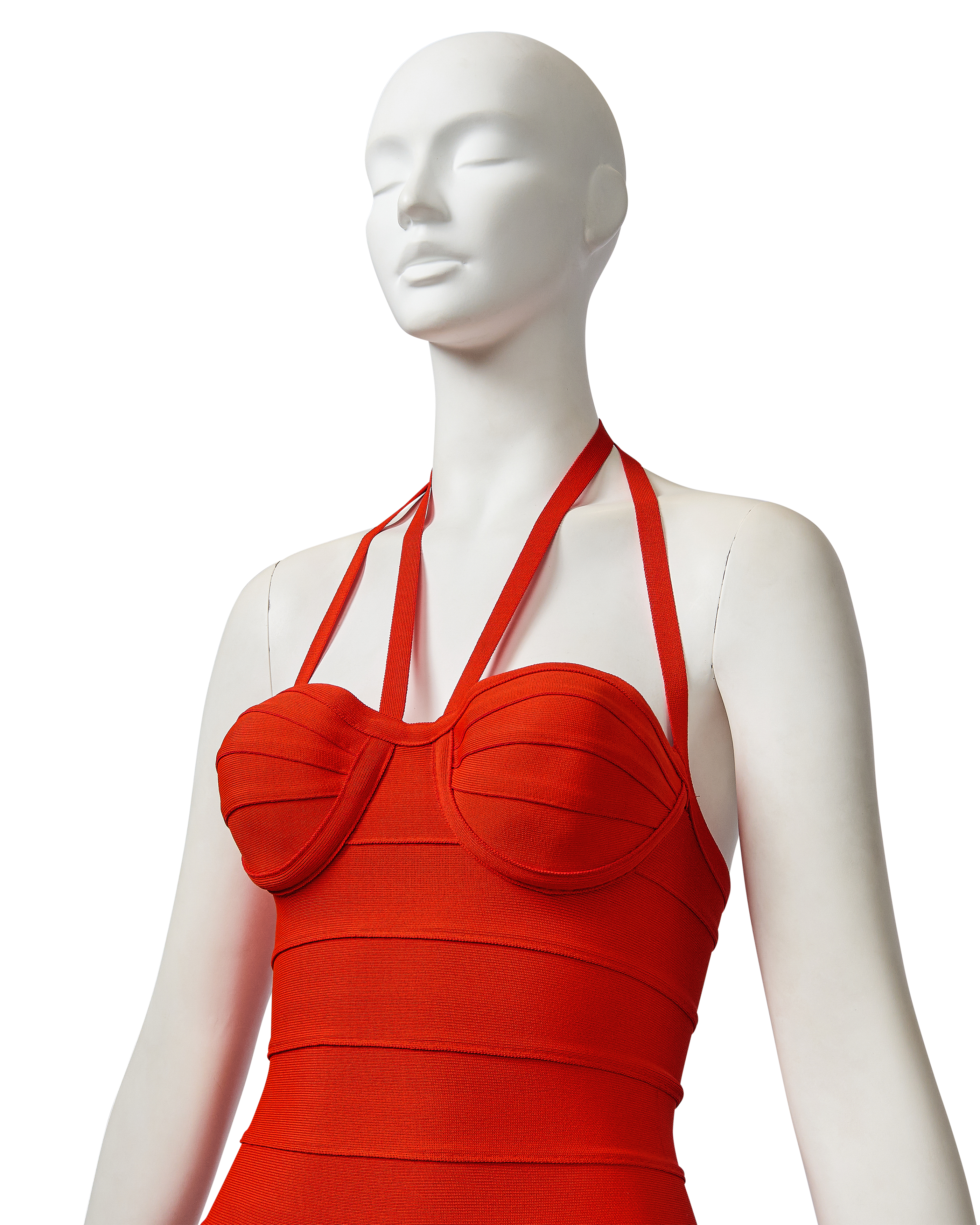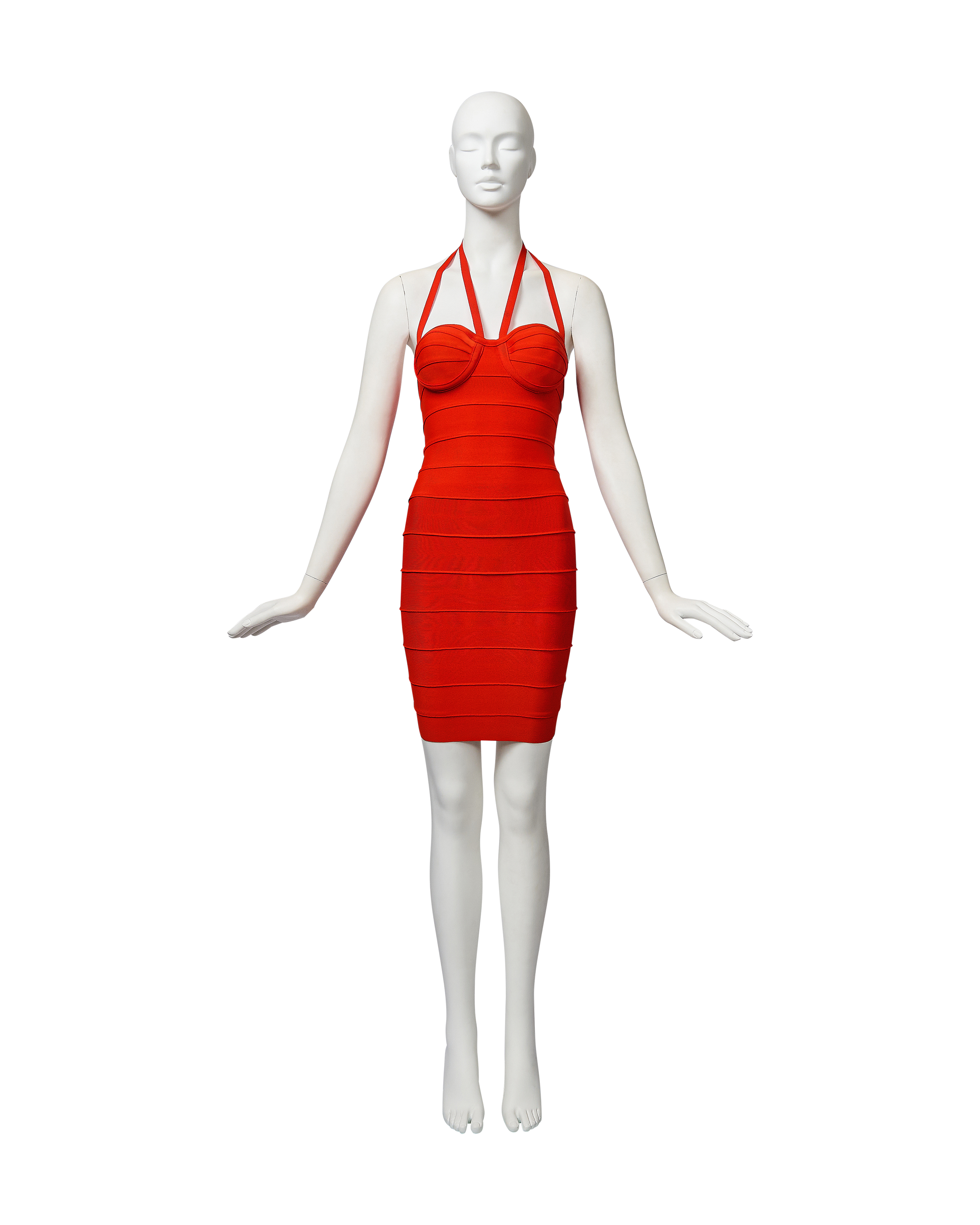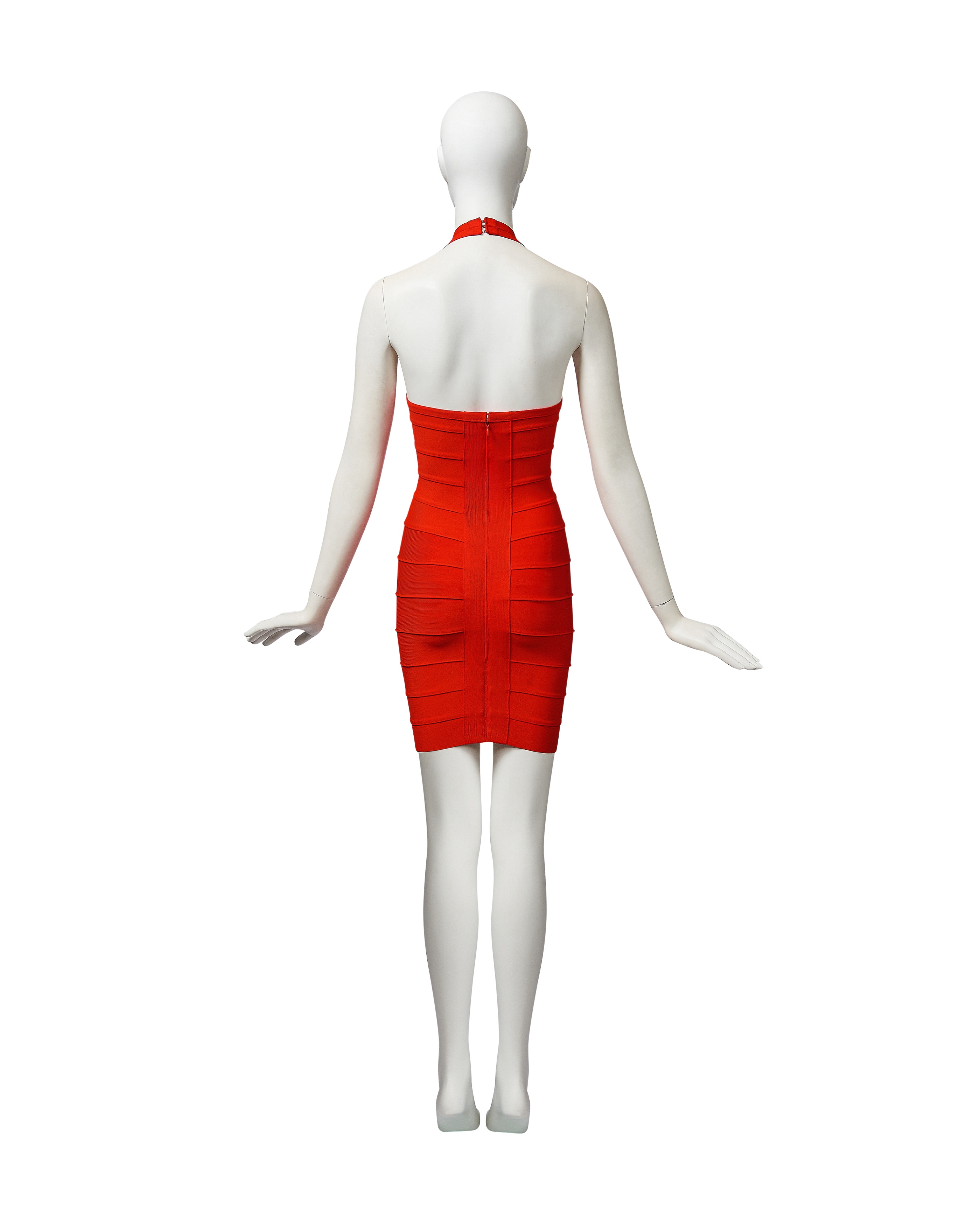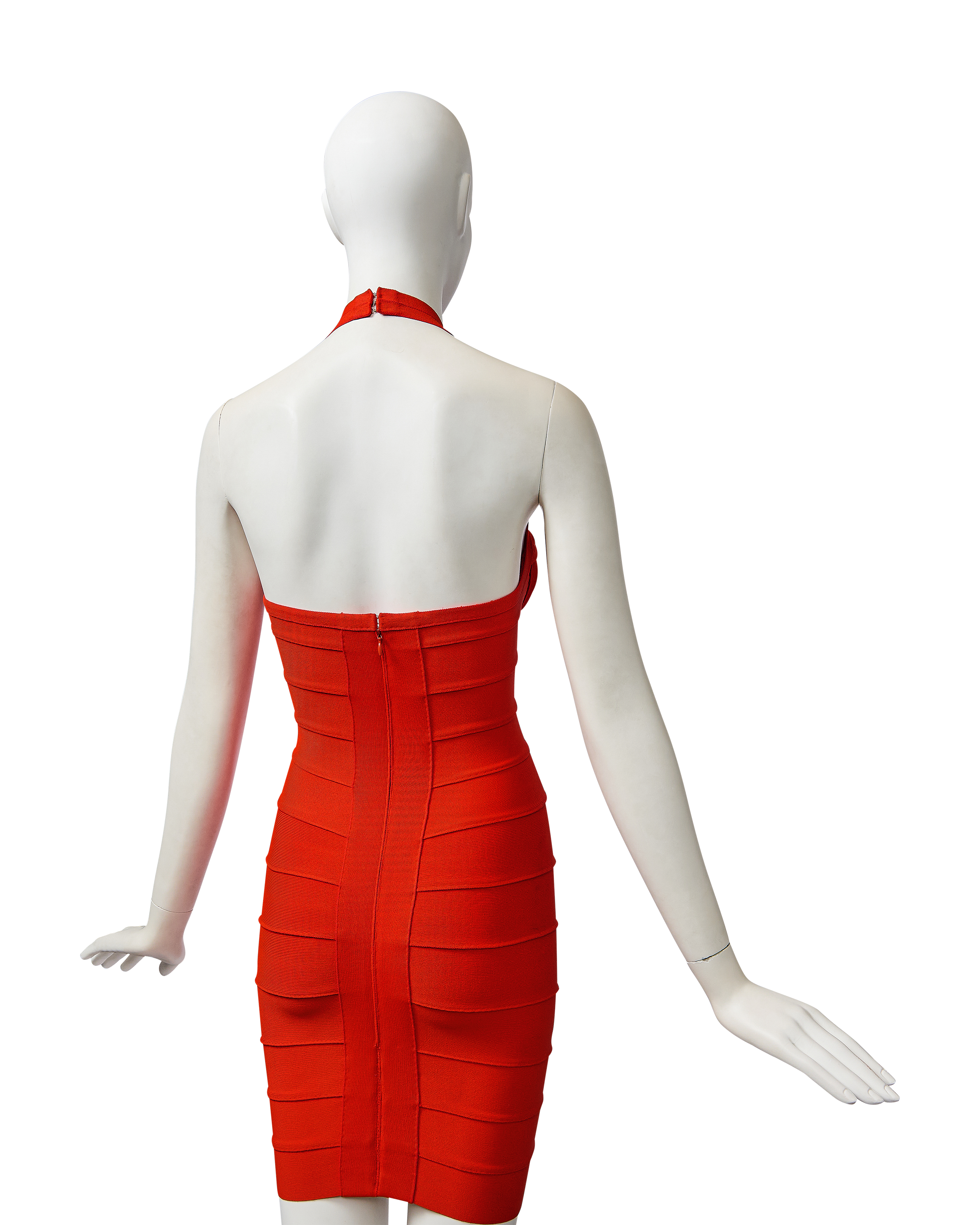 S/S 1993 Hervé Léger orange bandage mini dress. Fitted bodycon dress with halter straps and curved paneling at bust that flatters the body when worn. Hook-and-eye closures at nape of neck and concealed back zip closure. Fabric Contents: 90% Rayon and 10% Spandex blend. Boning at underbust adds structure when worn. As seen on the runway in white colorway on Eva Herzigova, one year after the signature bandage dress was first introduced. In very good vintage condition with very light spotting at front strap and right side back (noticeable only upon close inspection; has been taken to couture cleaner and arrives ready to wear).