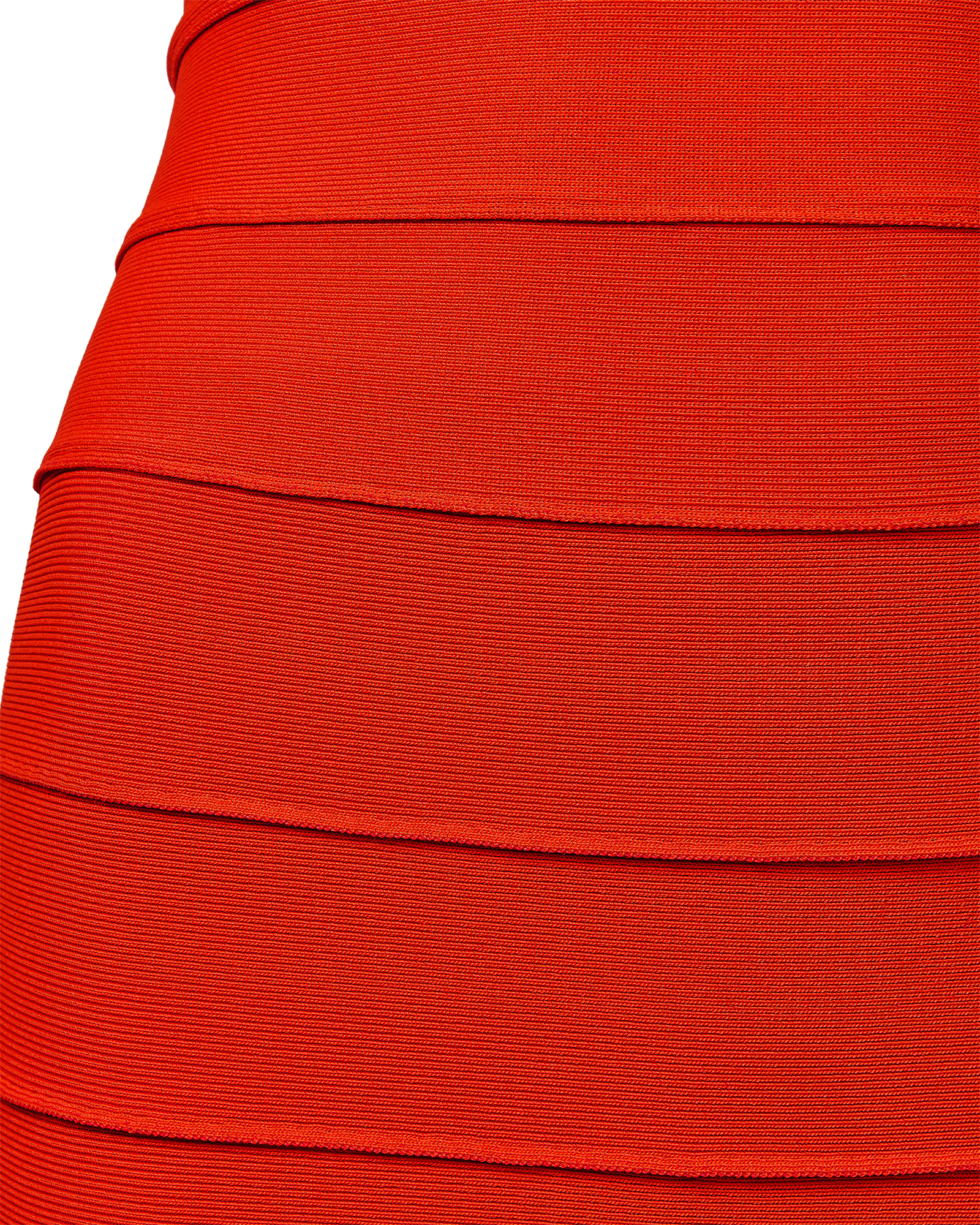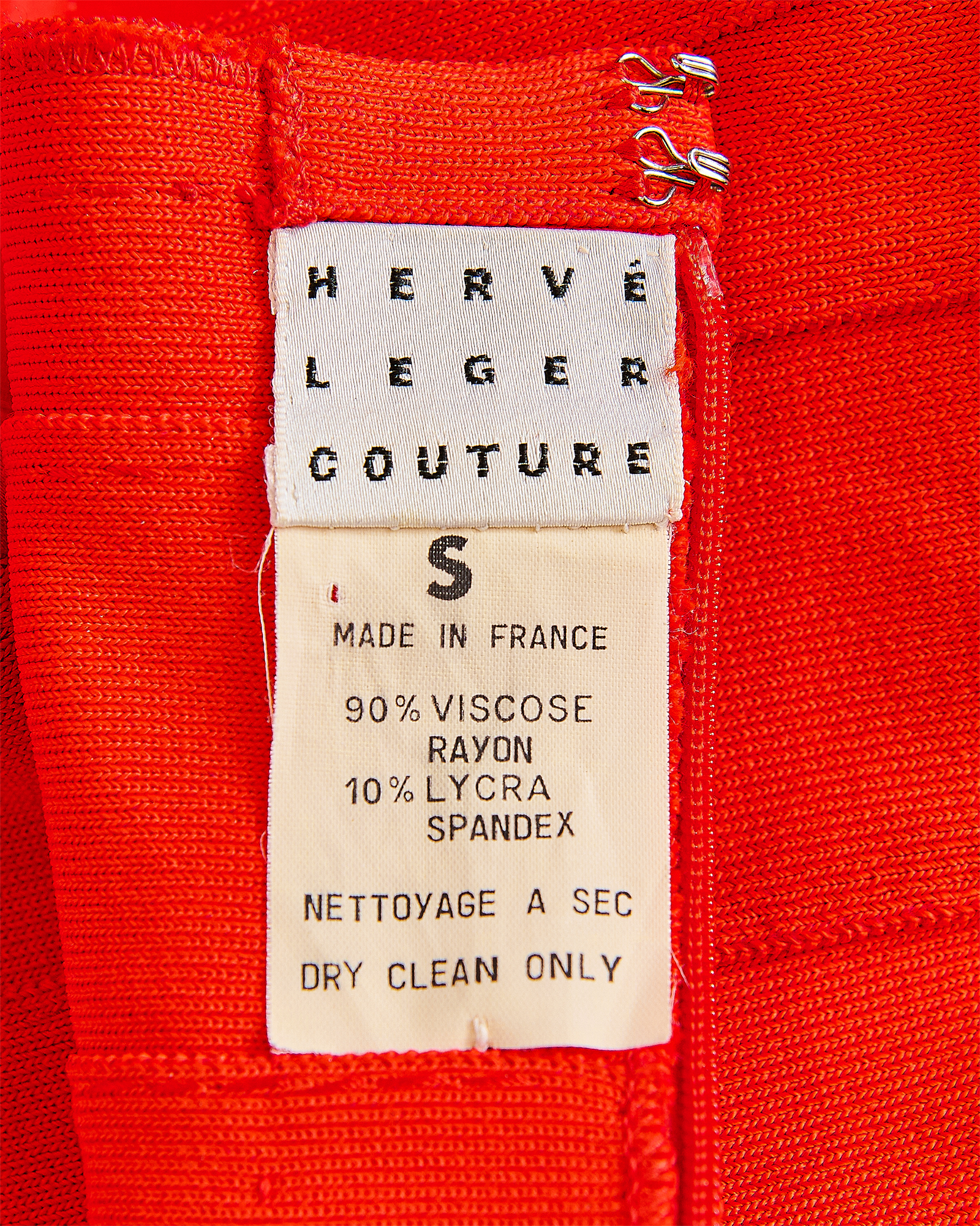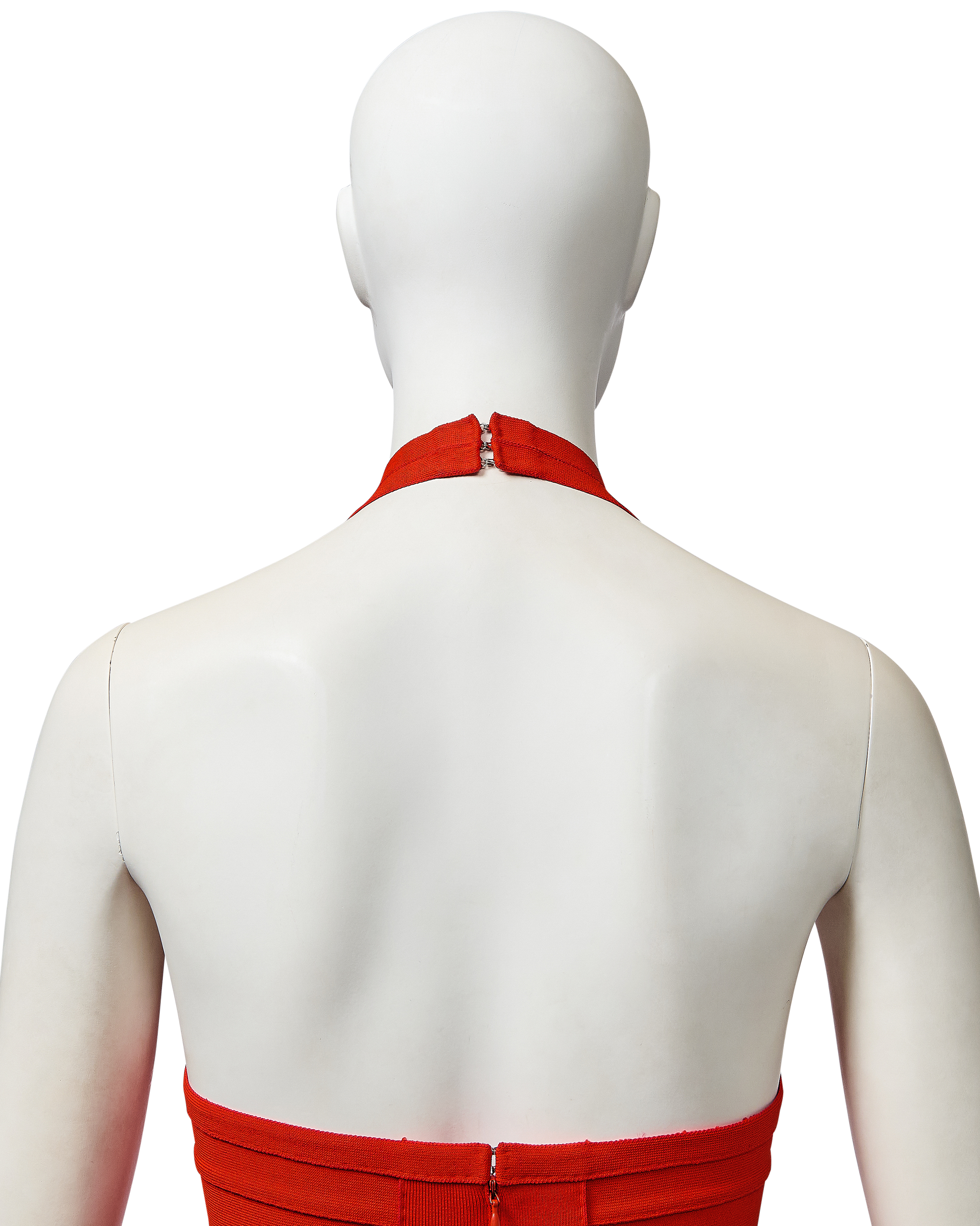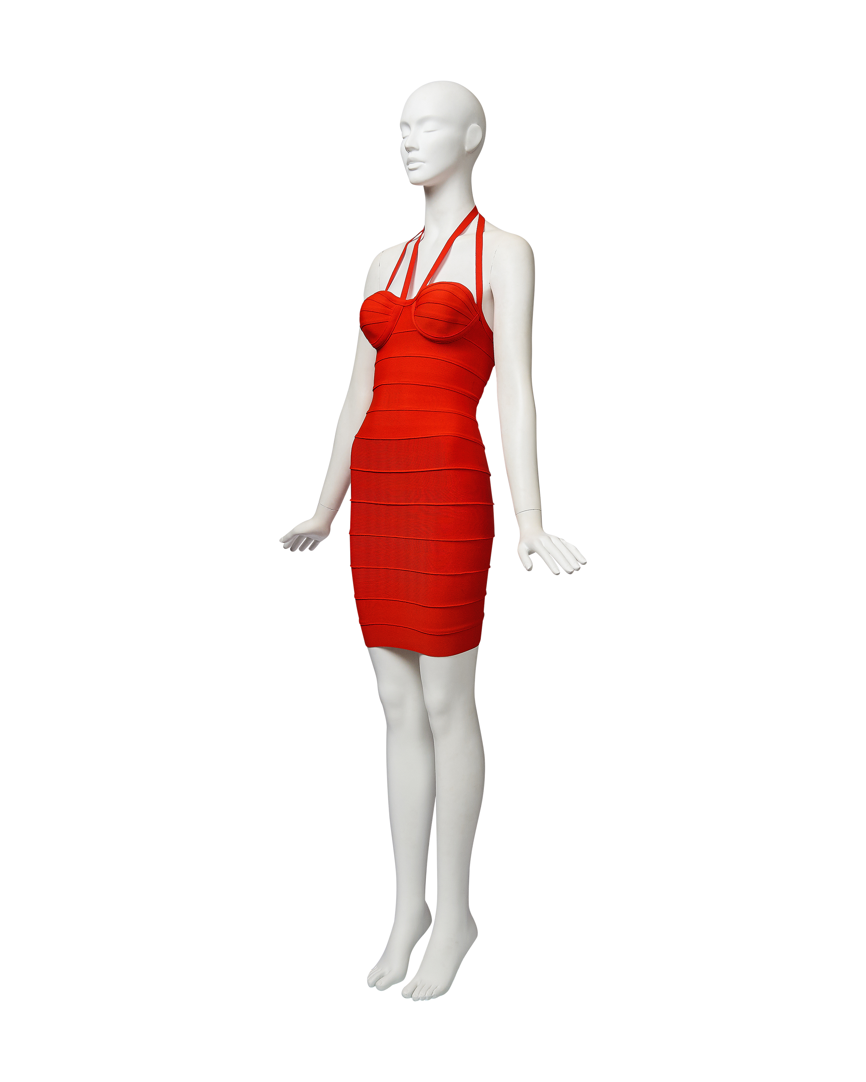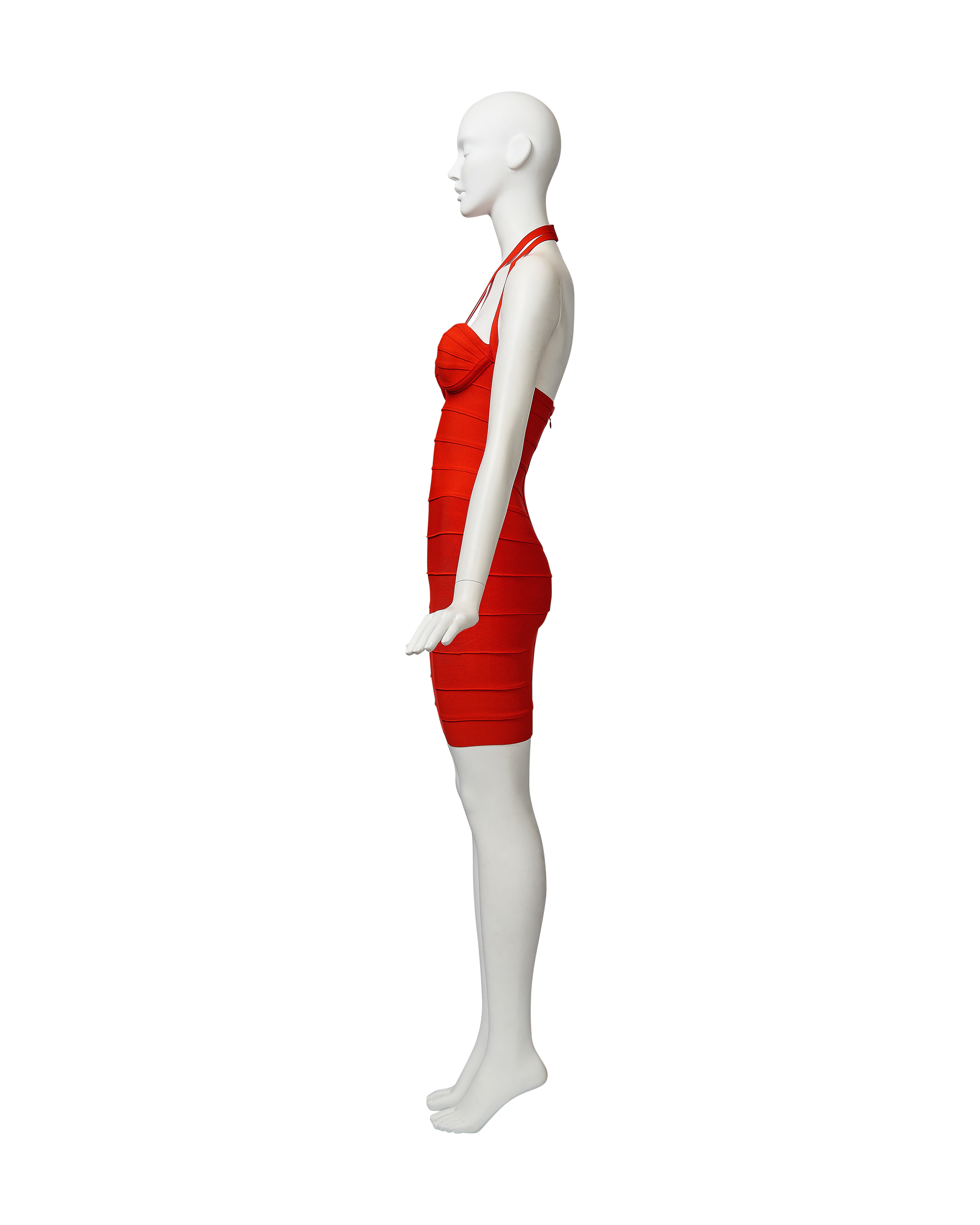 S/S 1993 Hervé Léger orange bandage mini dress. Fitted bodycon dress with halter straps and curved paneling at bust that flatters the body when worn. Hook-and-eye closures at nape of neck and concealed back zip closure. Fabric Contents: 90% Rayon and 10% Spandex blend. Boning at underbust adds structure when worn. As seen on the runway in white colorway on Eva Herzigova, one year after the signature bandage dress was first introduced. In very good vintage condition with very light spotting at front strap and right side back (noticeable only upon close inspection; has been taken to couture cleaner and arrives ready to wear).