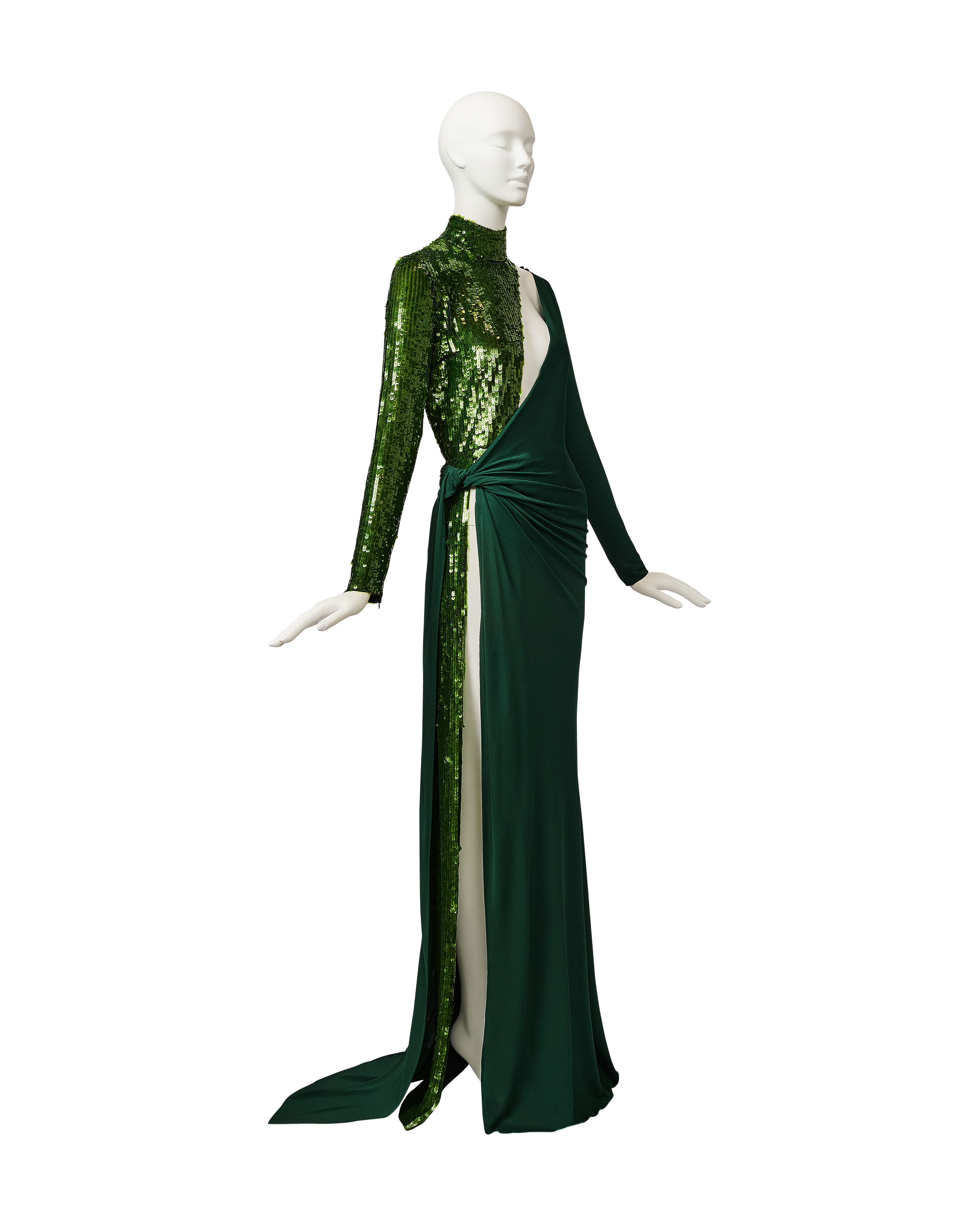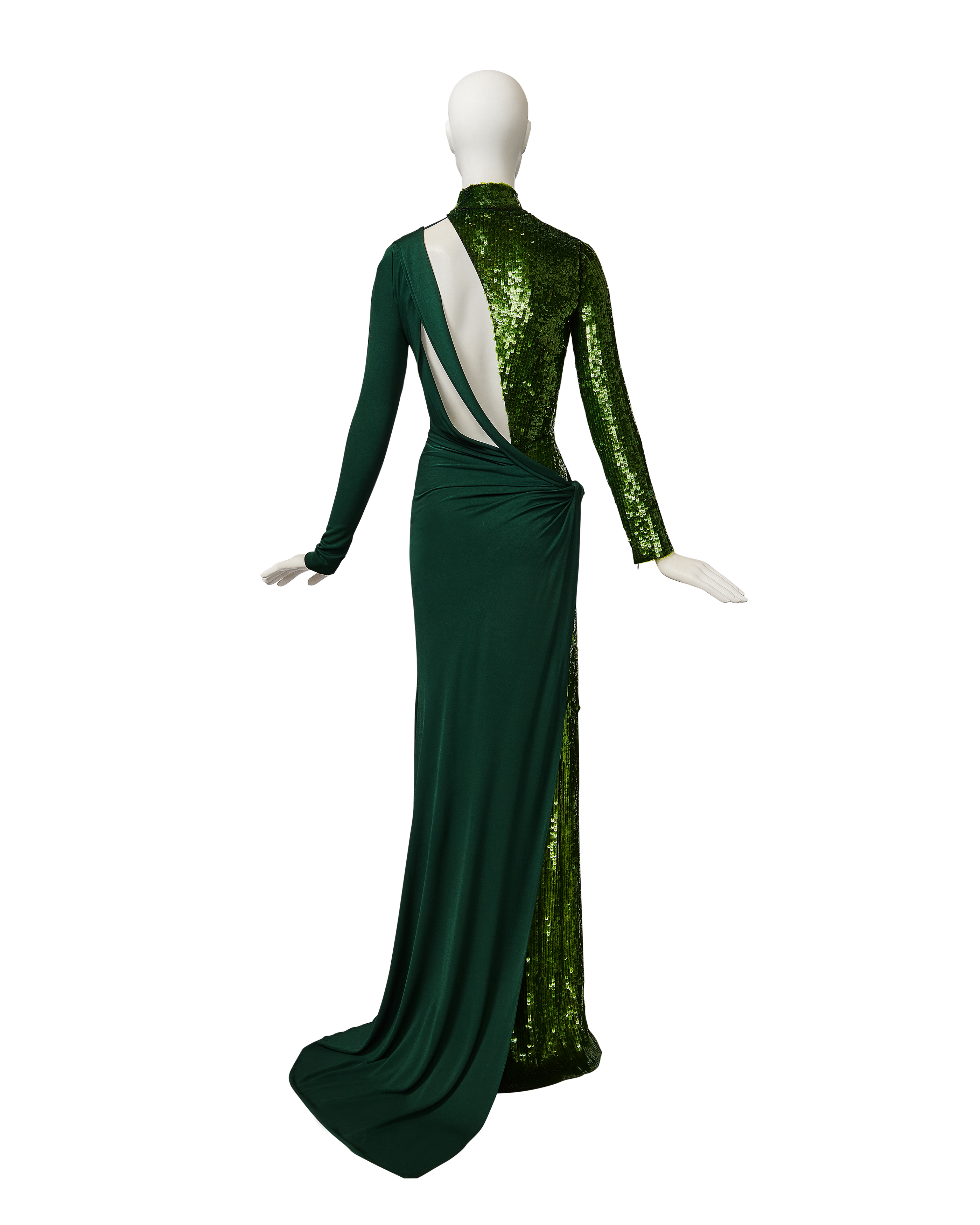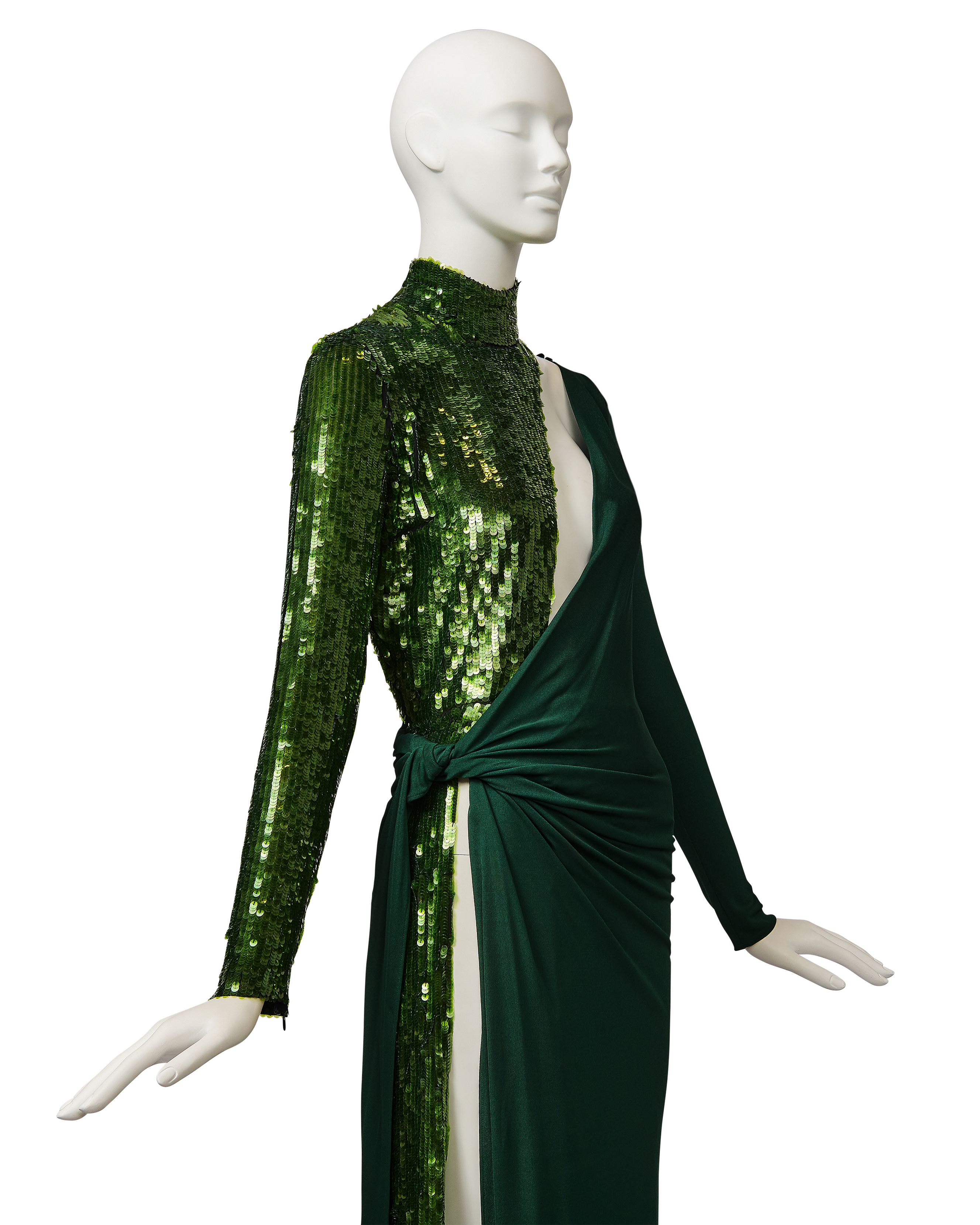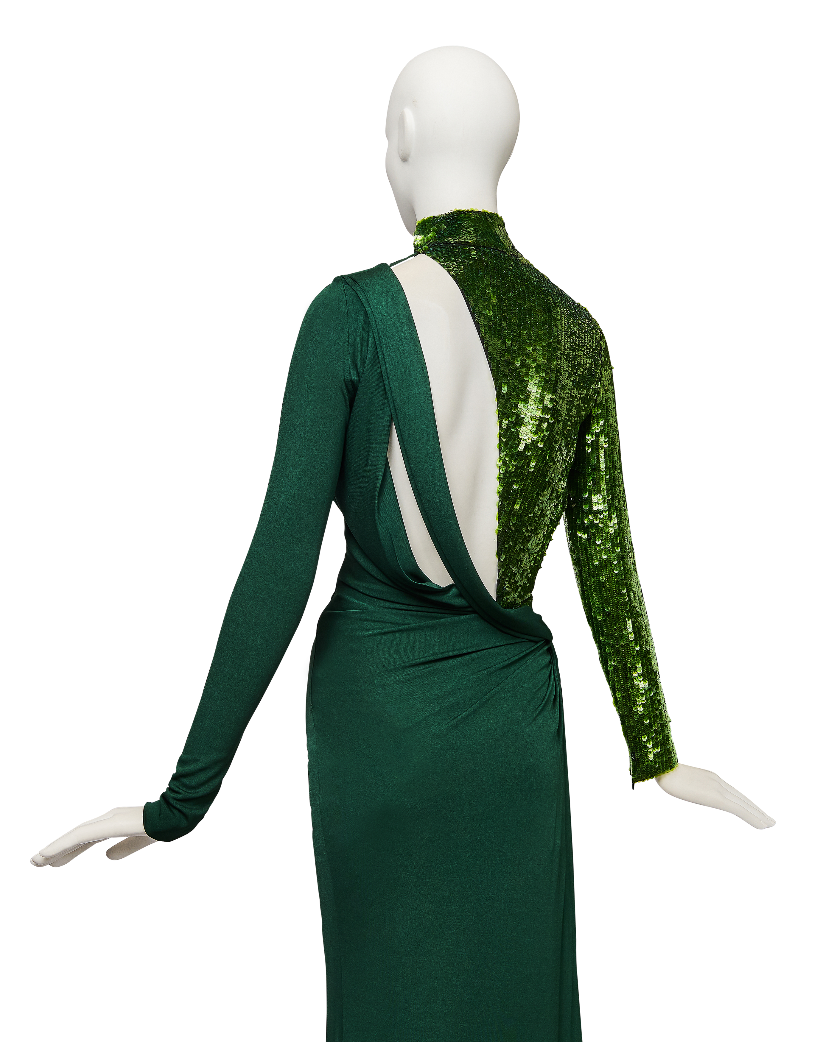 A/W 2011 Emilio Pucci green asymmetrical sequin embellished gown. Long sleeve mock neck gown with asymmetrical design, featuring one sleeve and bodice fully embellished with green sequins, in contrast to silk gathered emerald green long sleeve on left side. Concealed side zip closure and four 'Pucci' stamped button closures at collar, with zippers at wrist. Semi-open drape back. Fabric Contents: 100% Silk and 100% Rayon. As seen on the runway (Look #46) on Sigrid Agren. In very good vintage condition with very slight pulls in left side arm, slight discoloration at interior collar, and slight missing sequins at interior (unnoticeable when worn); otherwise new with original brand tags.