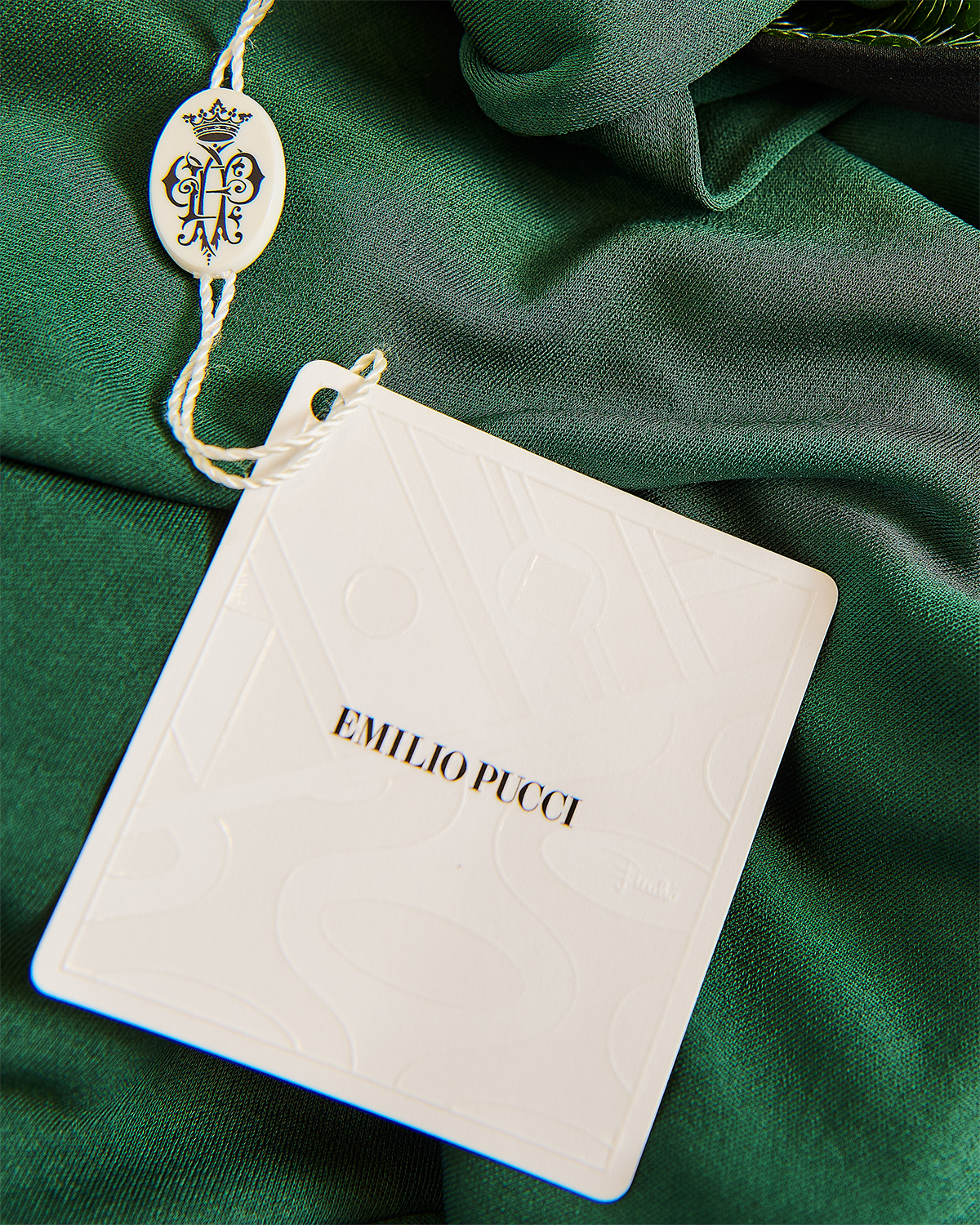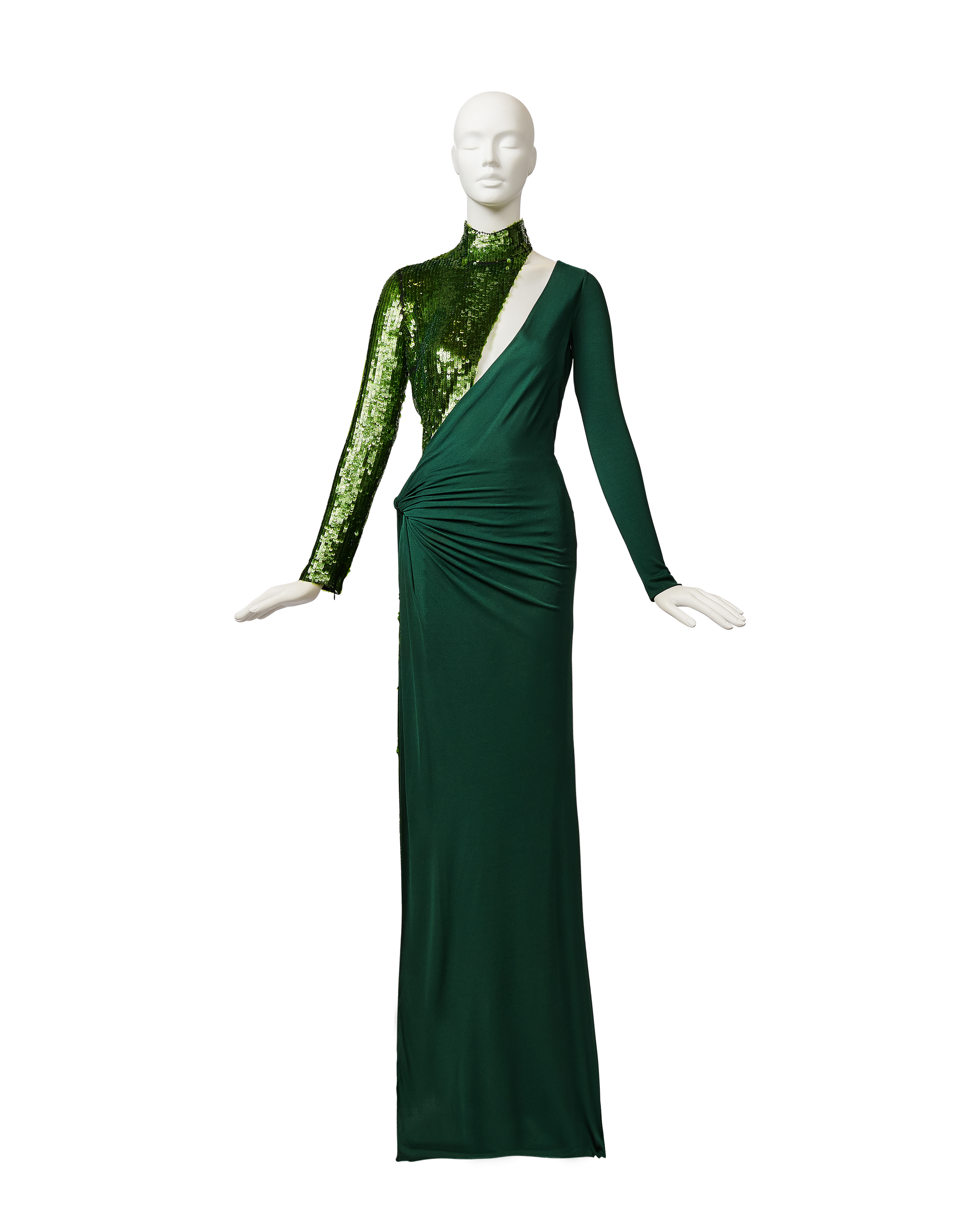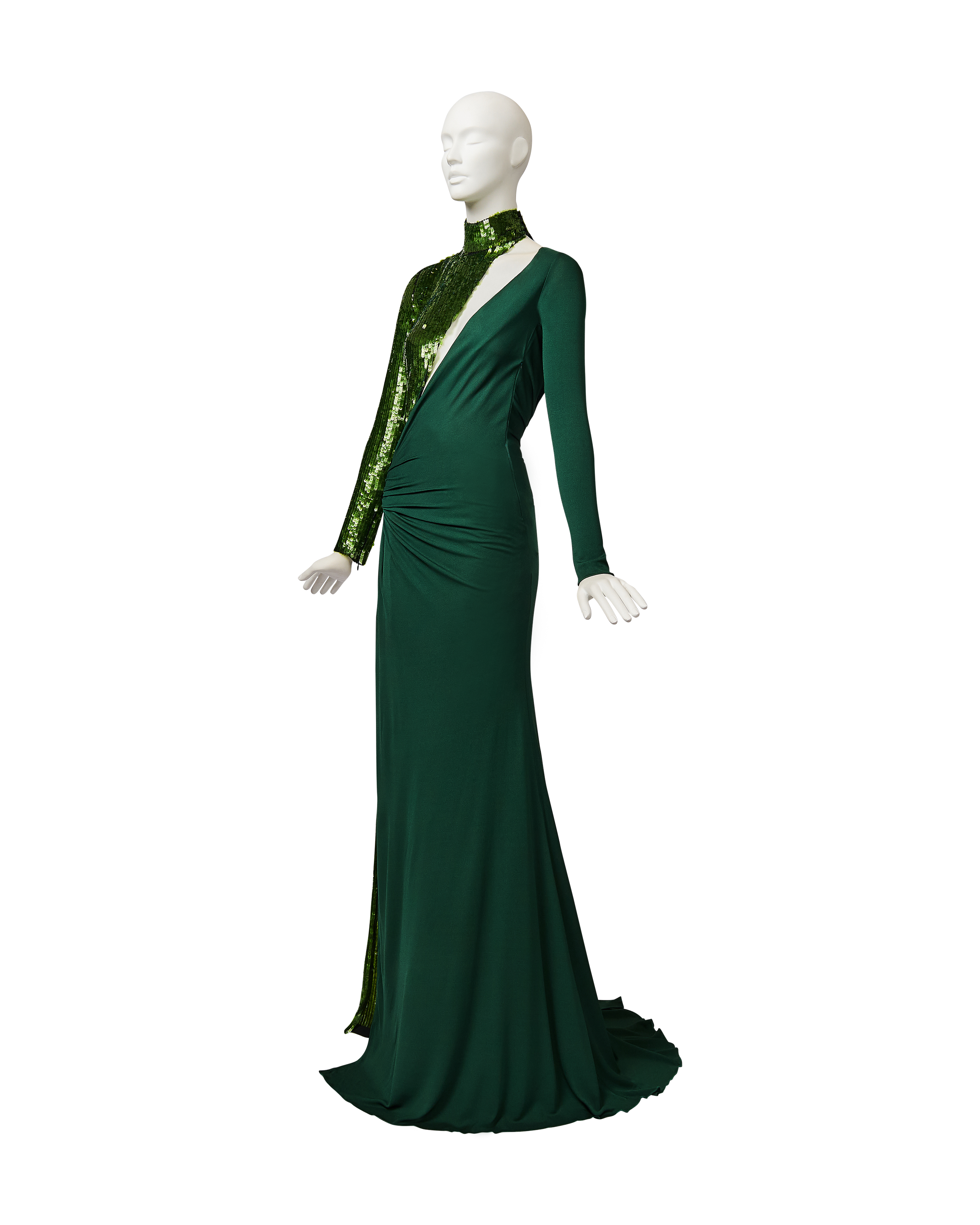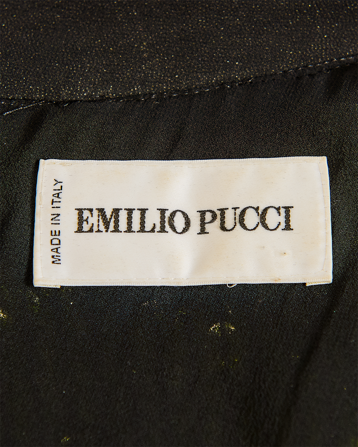 A/W 2011 Emilio Pucci green asymmetrical sequin embellished gown. Long sleeve mock neck gown with asymmetrical design, featuring one sleeve and bodice fully embellished with green sequins, in contrast to silk gathered emerald green long sleeve on left side. Concealed side zip closure and four 'Pucci' stamped button closures at collar, with zippers at wrist. Semi-open drape back. Fabric Contents: 100% Silk and 100% Rayon. As seen on the runway (Look #46) on Sigrid Agren. In very good vintage condition with very slight pulls in left side arm, slight discoloration at interior collar, and slight missing sequins at interior (unnoticeable when worn); otherwise new with original brand tags.