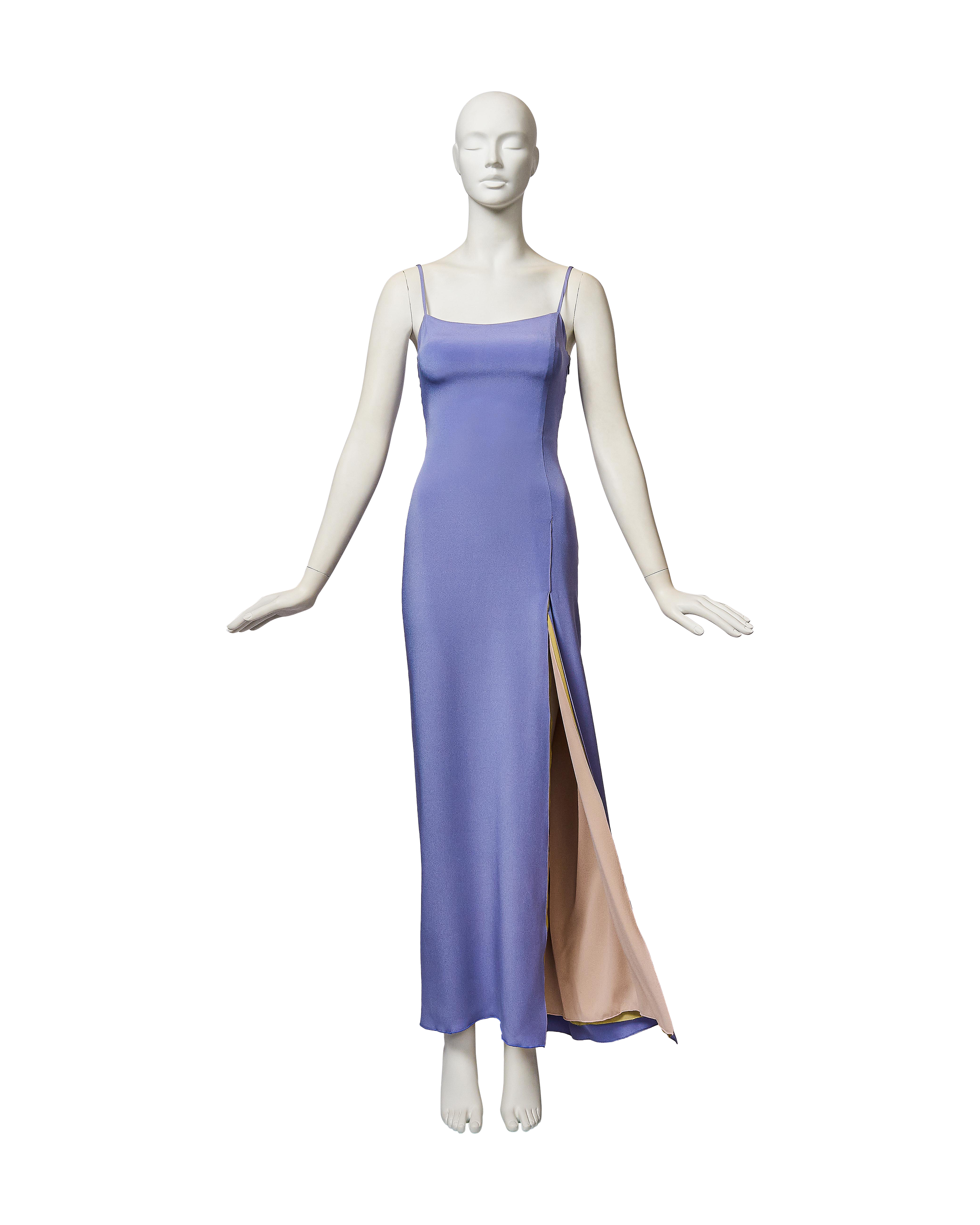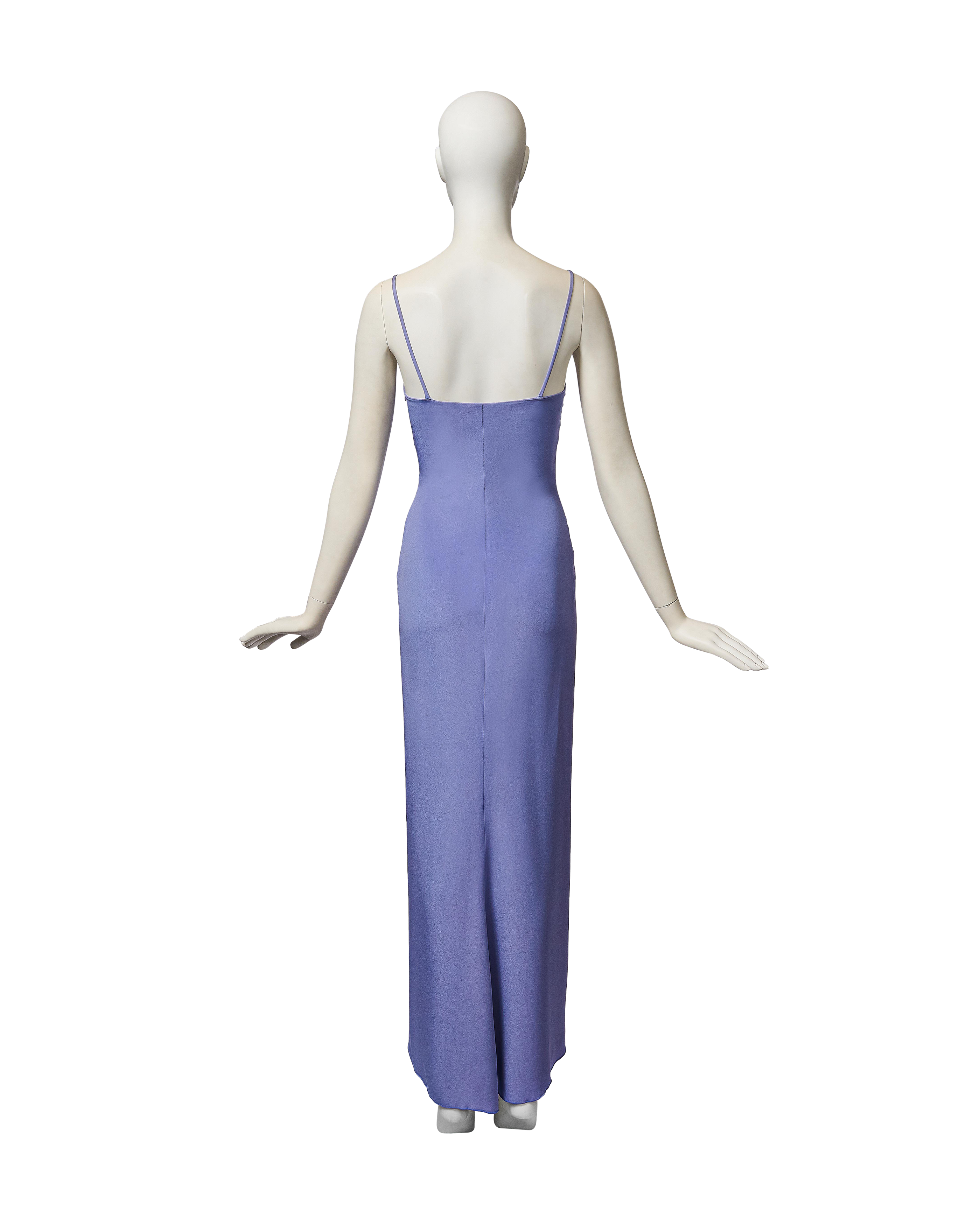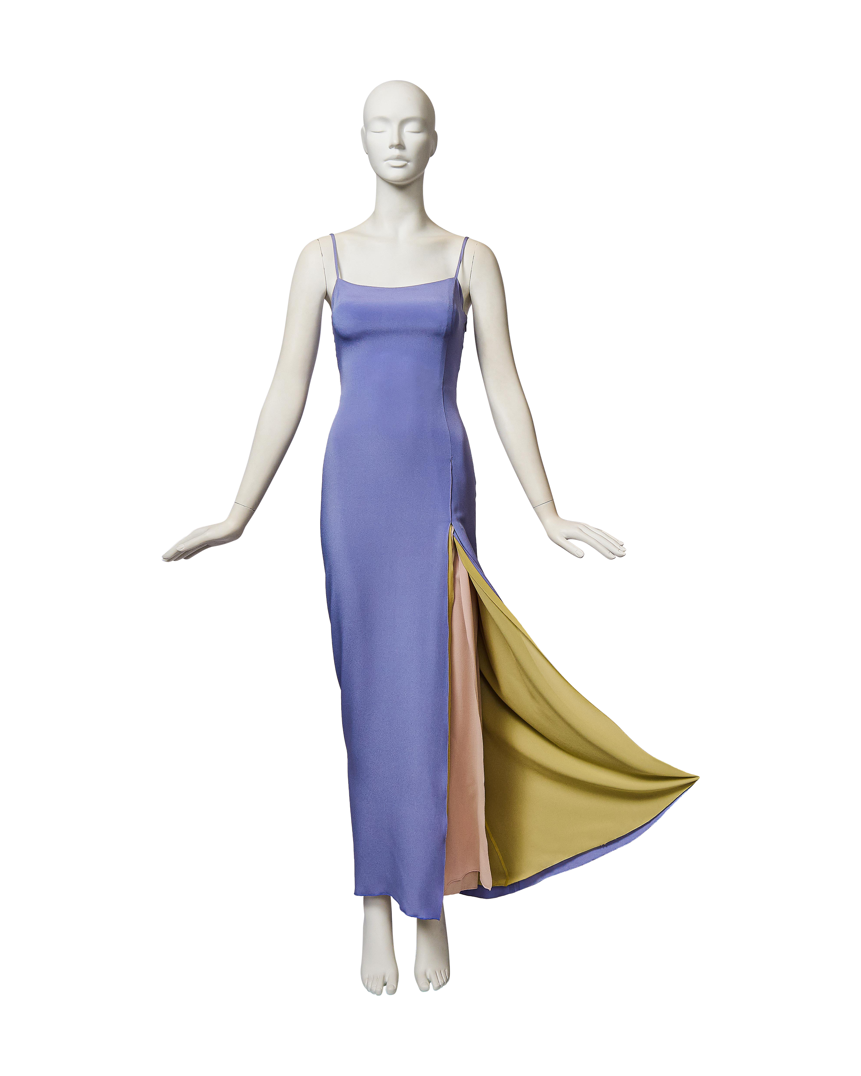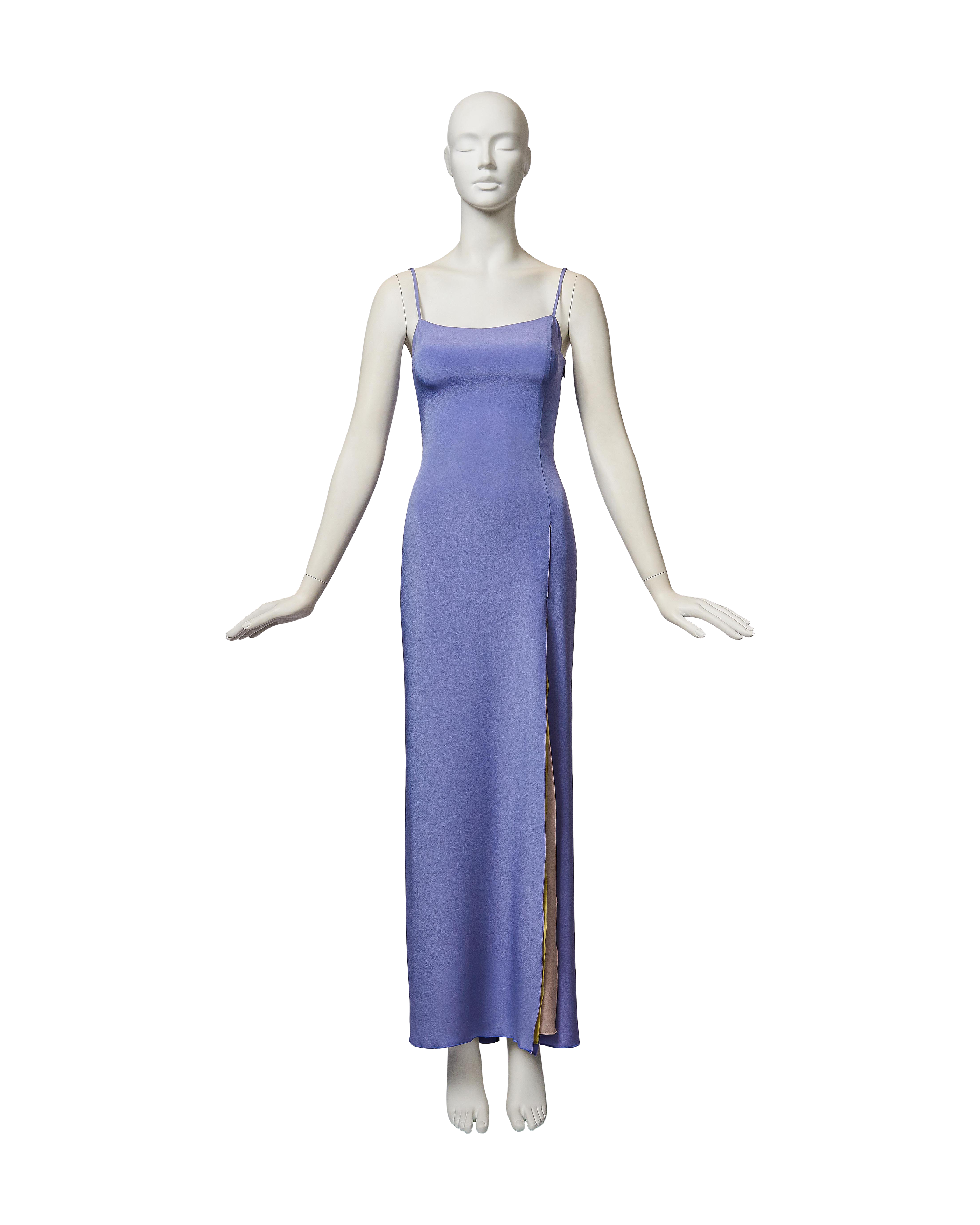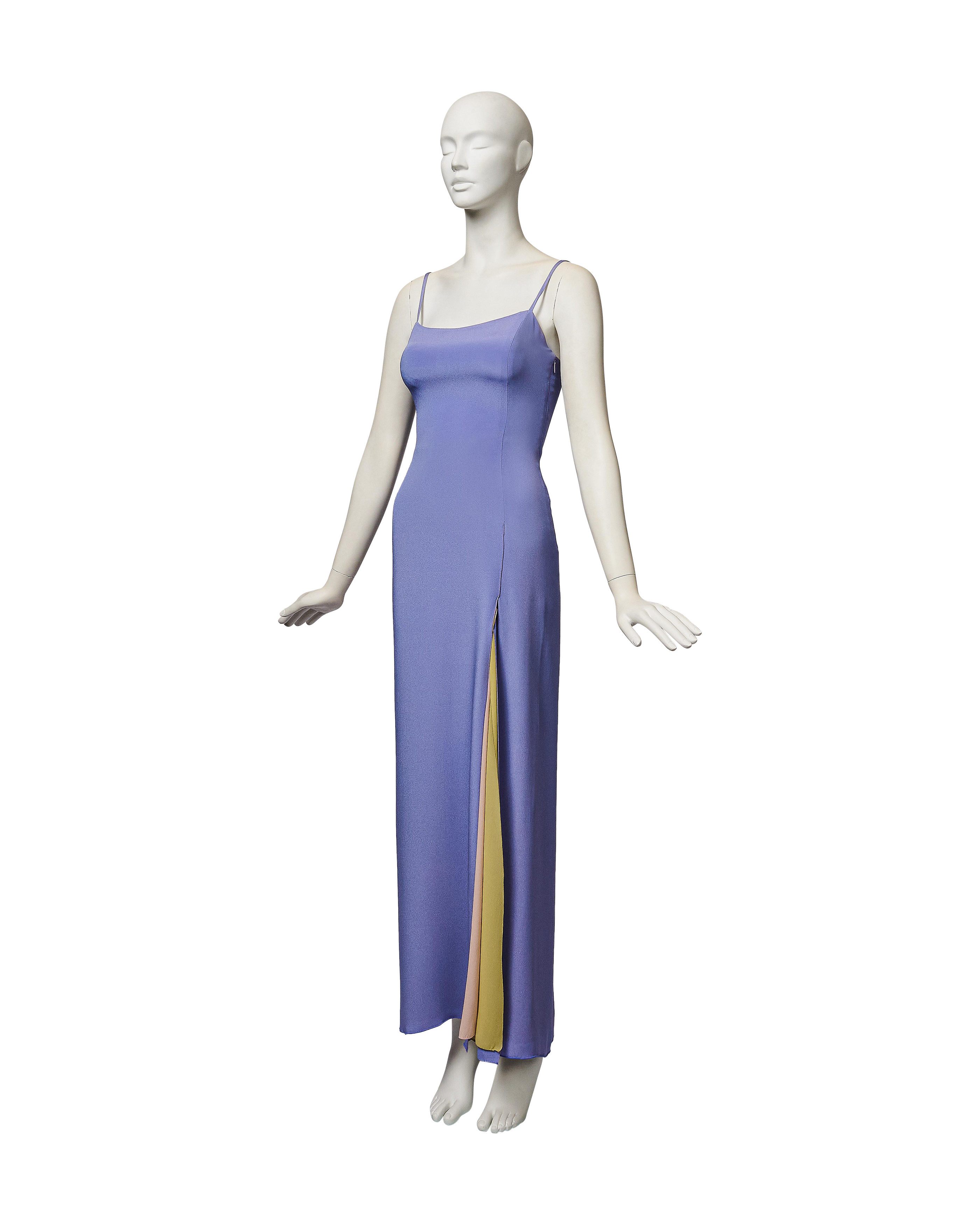 S/S 1998 Valentino purple gown with multicolor side slit. Sleeveless slip gown with fitted waist and high front-side slit, featuring multicolor mauve and yellow interior layered paneling that create beautiful contrast when in motion. Concealed side zip closure and built-in padded bra cups (removable as desired). As seen on the runway on Ling Tan, and featured in the ad campaign. In very good vintage condition with very faint underarm discoloration and small run at center front of bust and back (unnoticeable when worn except upon very close inspection).