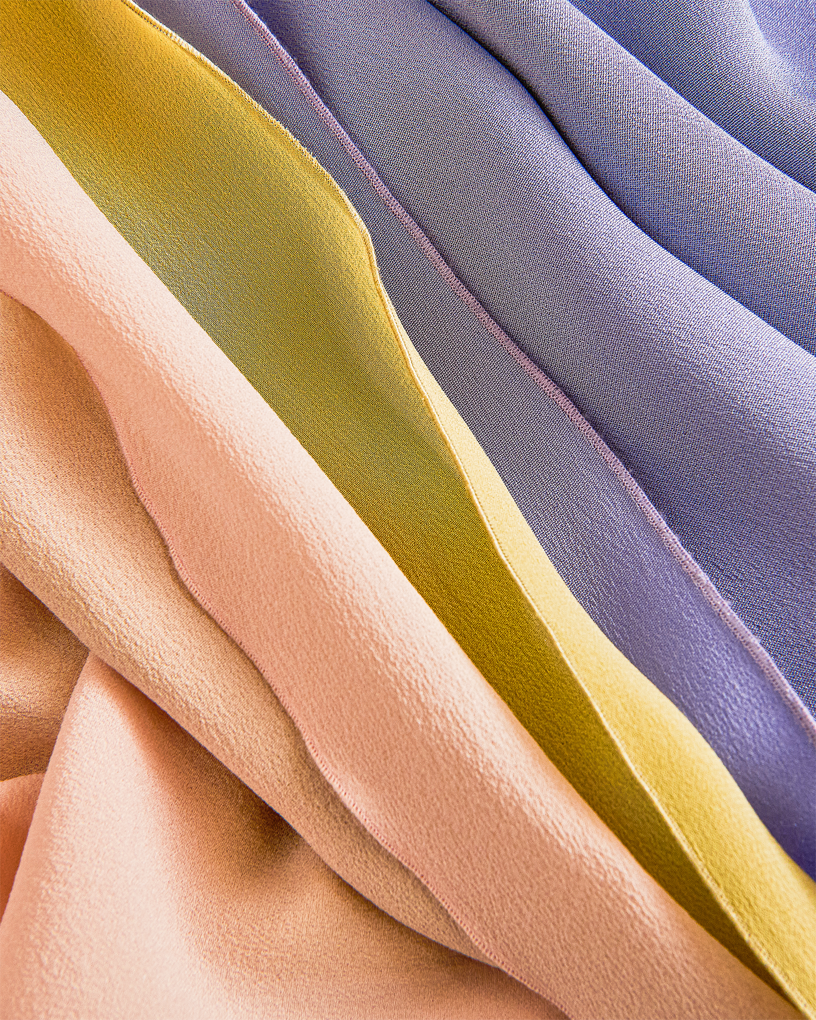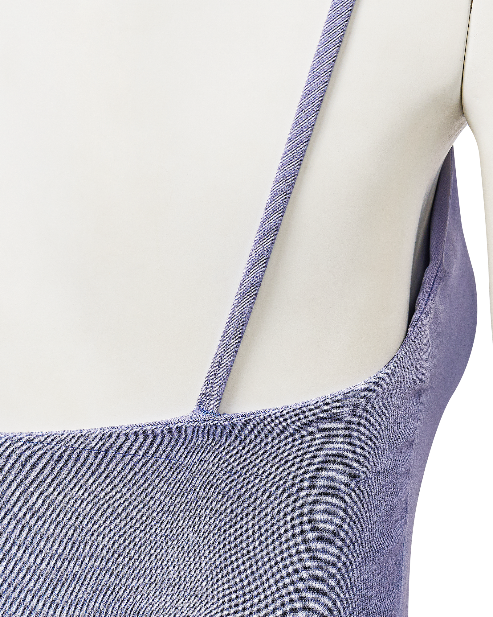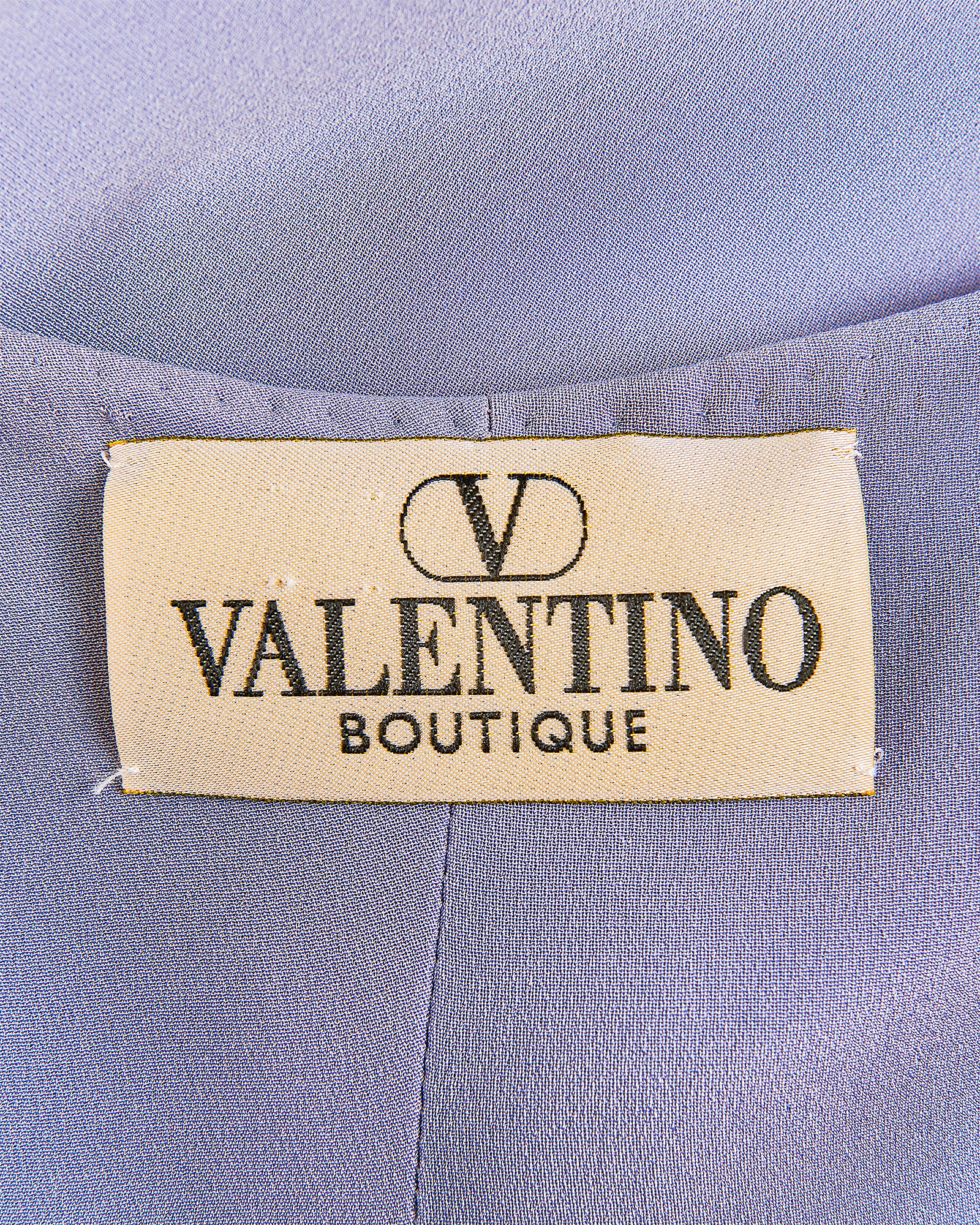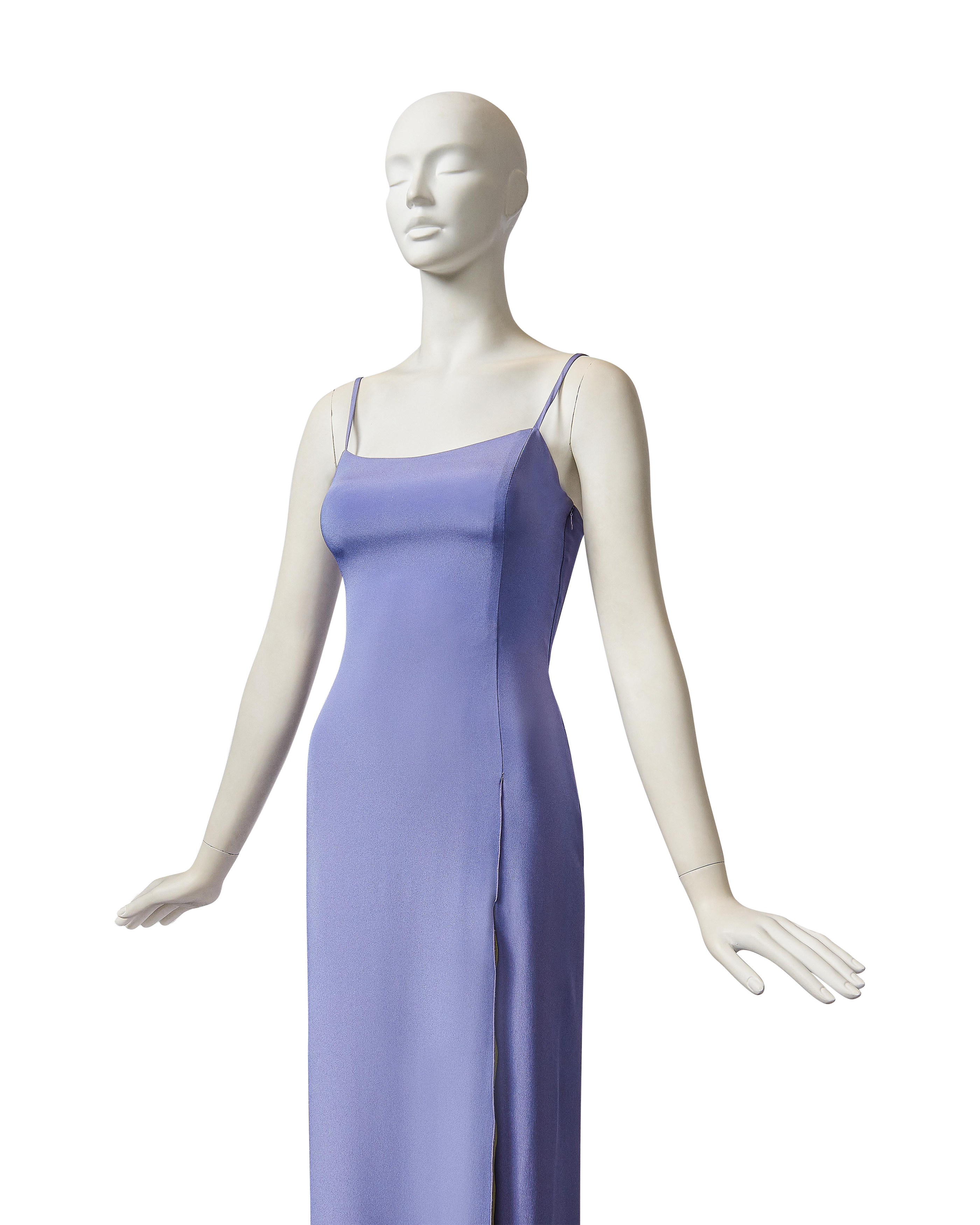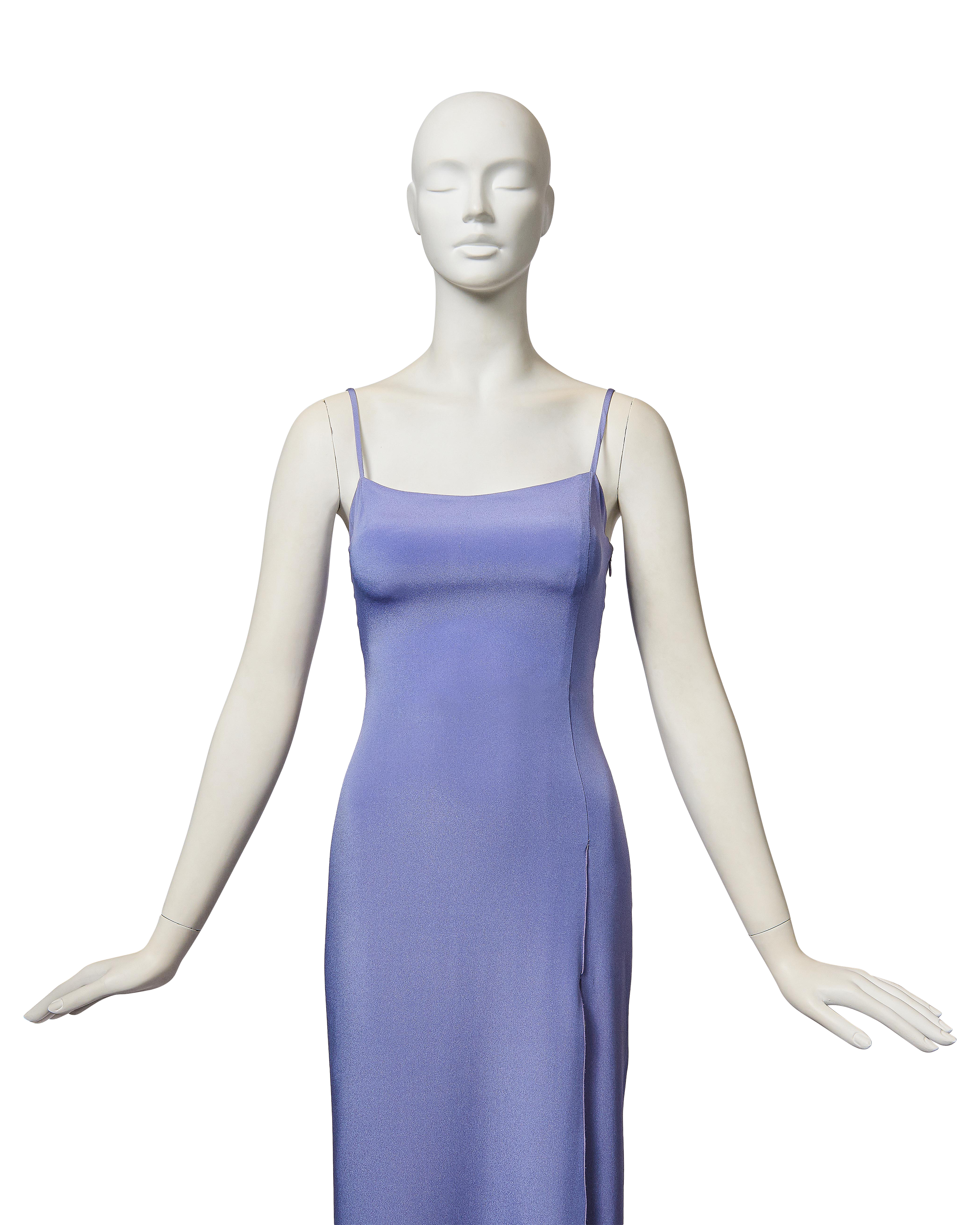 S/S 1998 Valentino purple gown with multicolor side slit. Sleeveless slip gown with fitted waist and high front-side slit, featuring multicolor mauve and yellow interior layered paneling that create beautiful contrast when in motion. Concealed side zip closure and built-in padded bra cups (removable as desired). As seen on the runway on Ling Tan, and featured in the ad campaign. In very good vintage condition with very faint underarm discoloration and small run at center front of bust and back (unnoticeable when worn except upon very close inspection).
