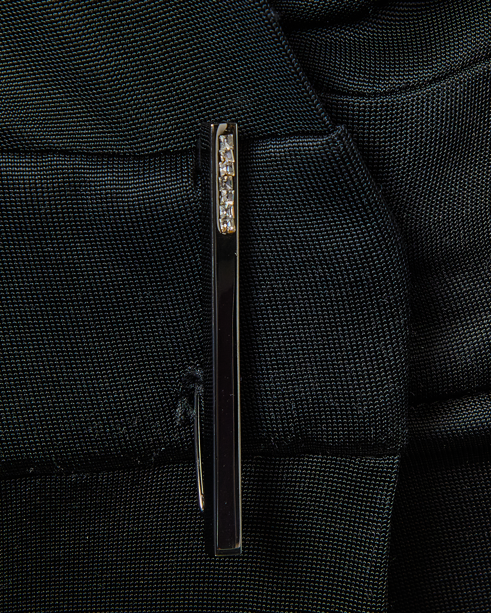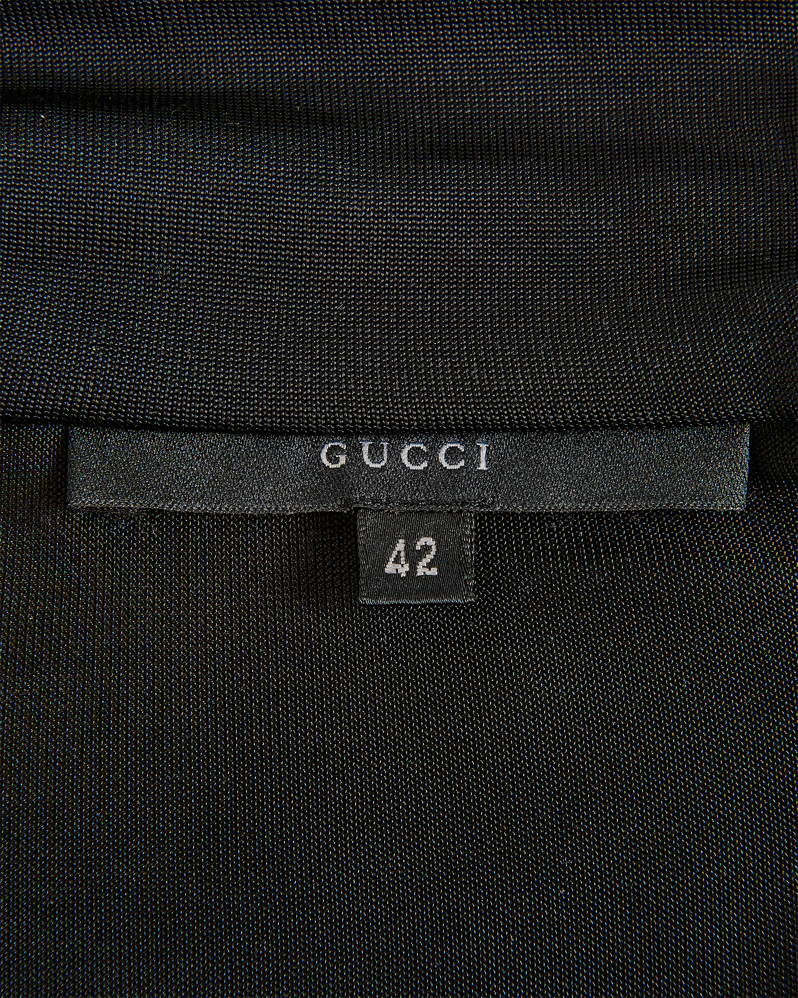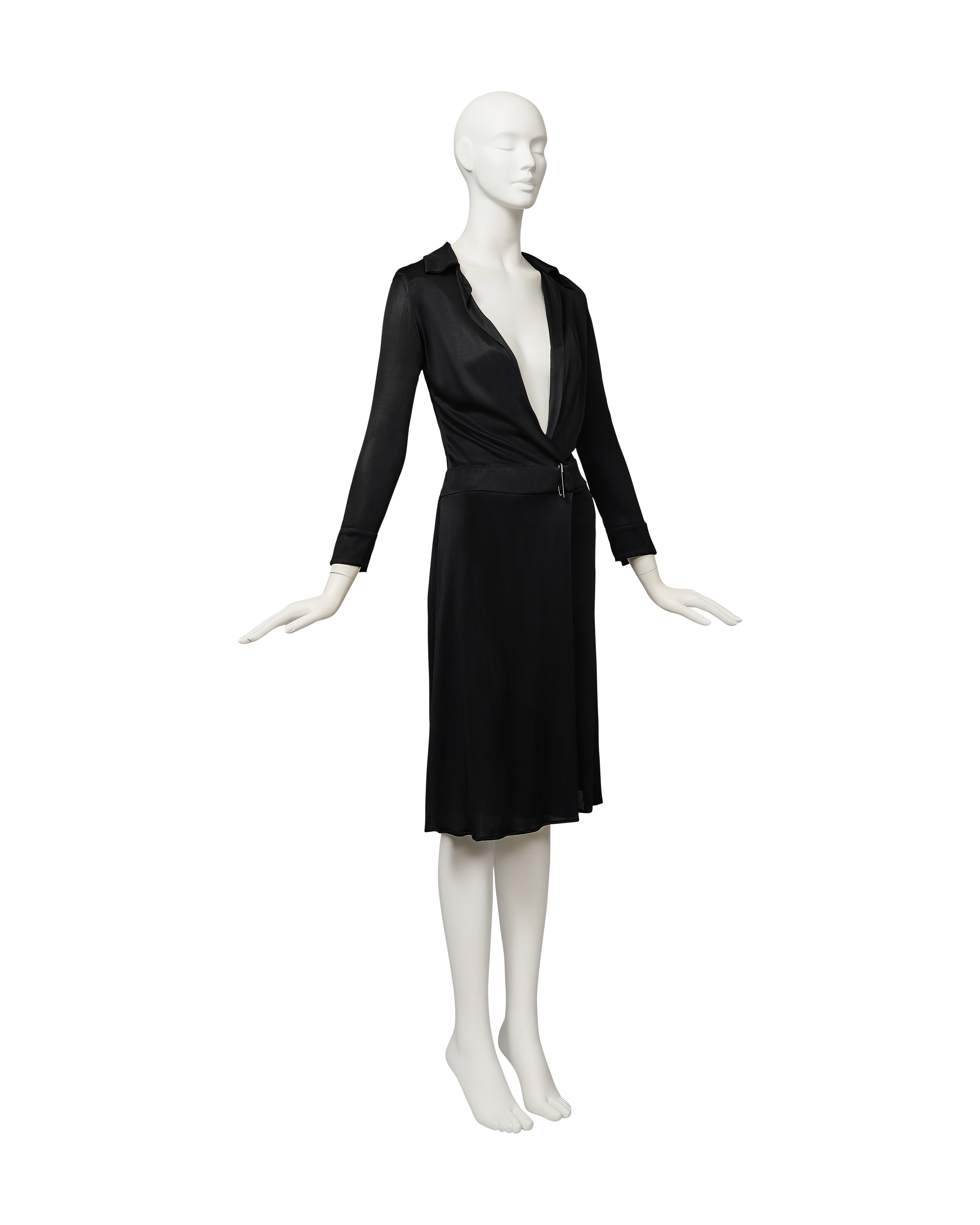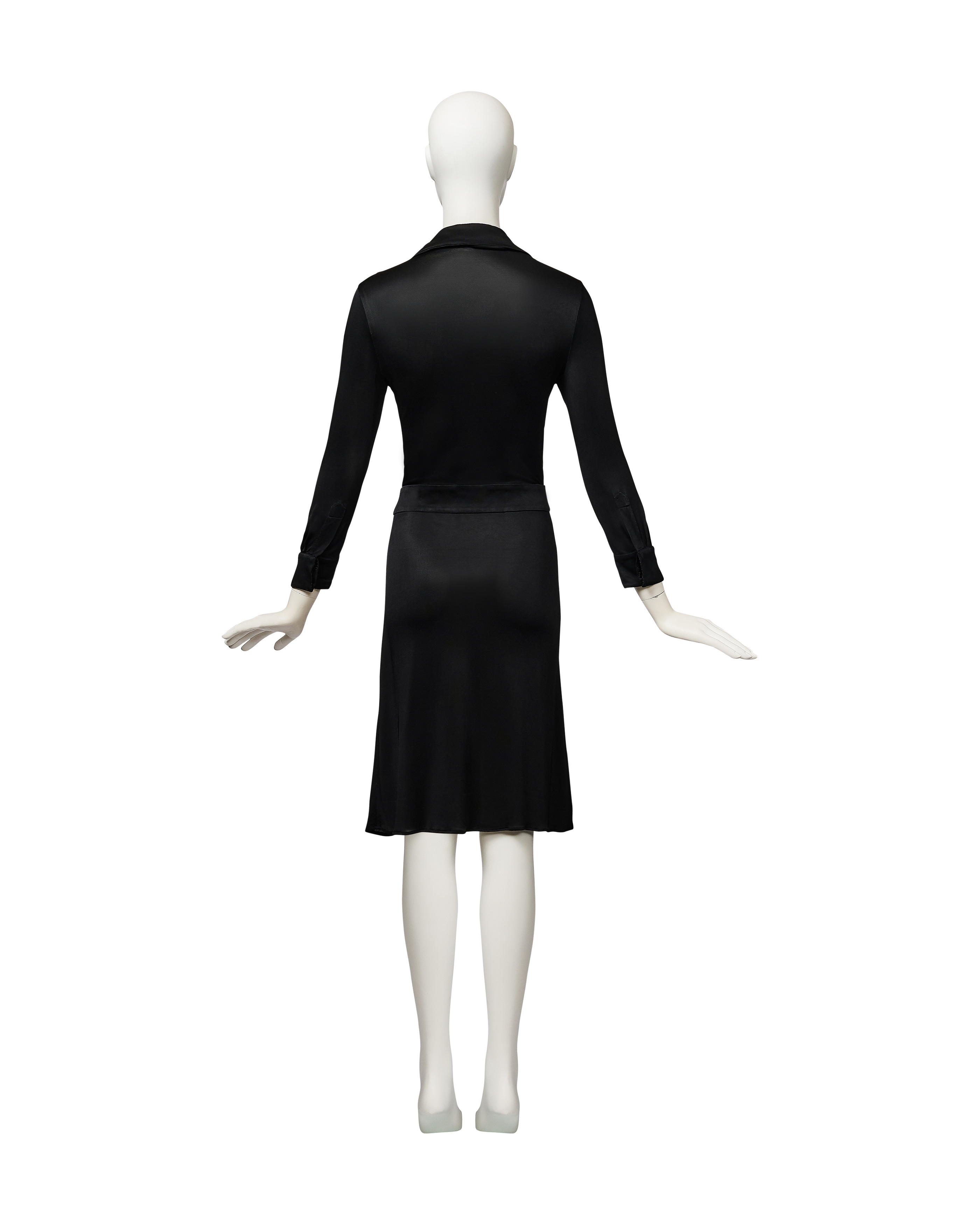 S/S 2000 Gucci by Tom Ford long sleeve plunge black silk jersey dress. Collared long sleeve above-knee wrap dress with plunge neckline, featuring gunmetal silver-tone front clasp with rhinestone embellishments. Interior snap wrap closures and slightly cropped three-quarter length sleeves. Fabric Contents: 100% Rayon (lightweight stretch jersey with very slight sheerness when worn). As seen on the runway (Look #14) on Maggie Rizer, and featured in the ad campaign. In very good vintage condition with light wear throughout; slight wear at hardware that is unnoticeable when worn.