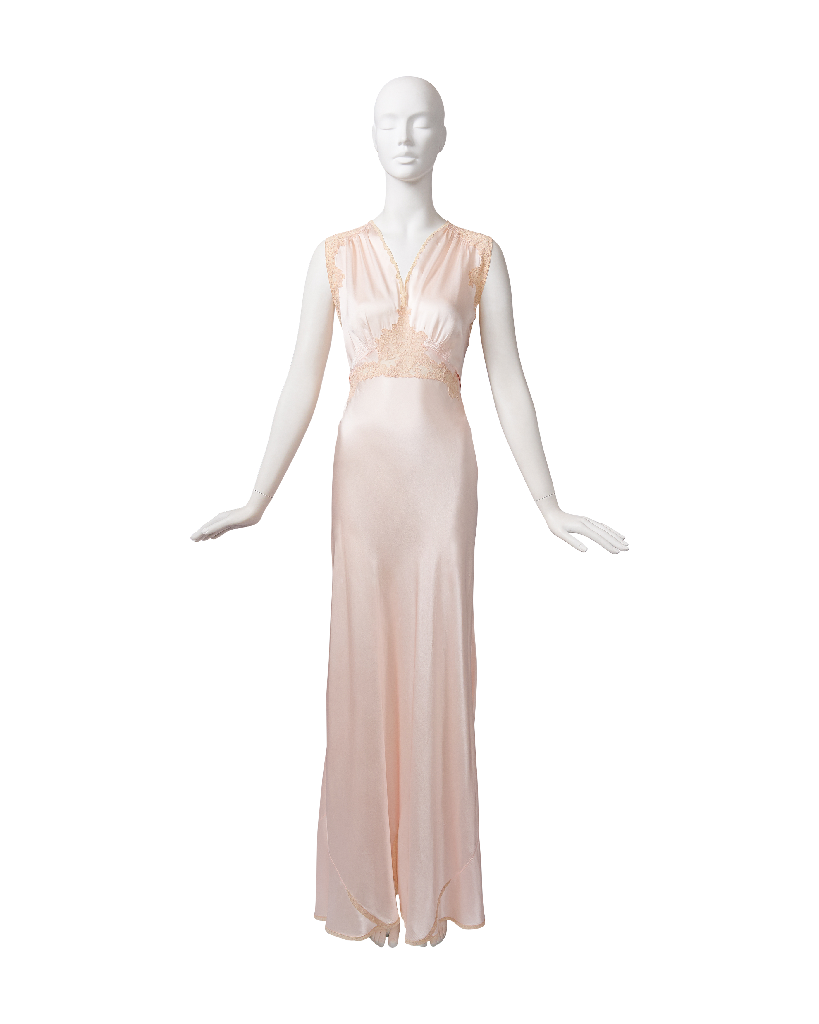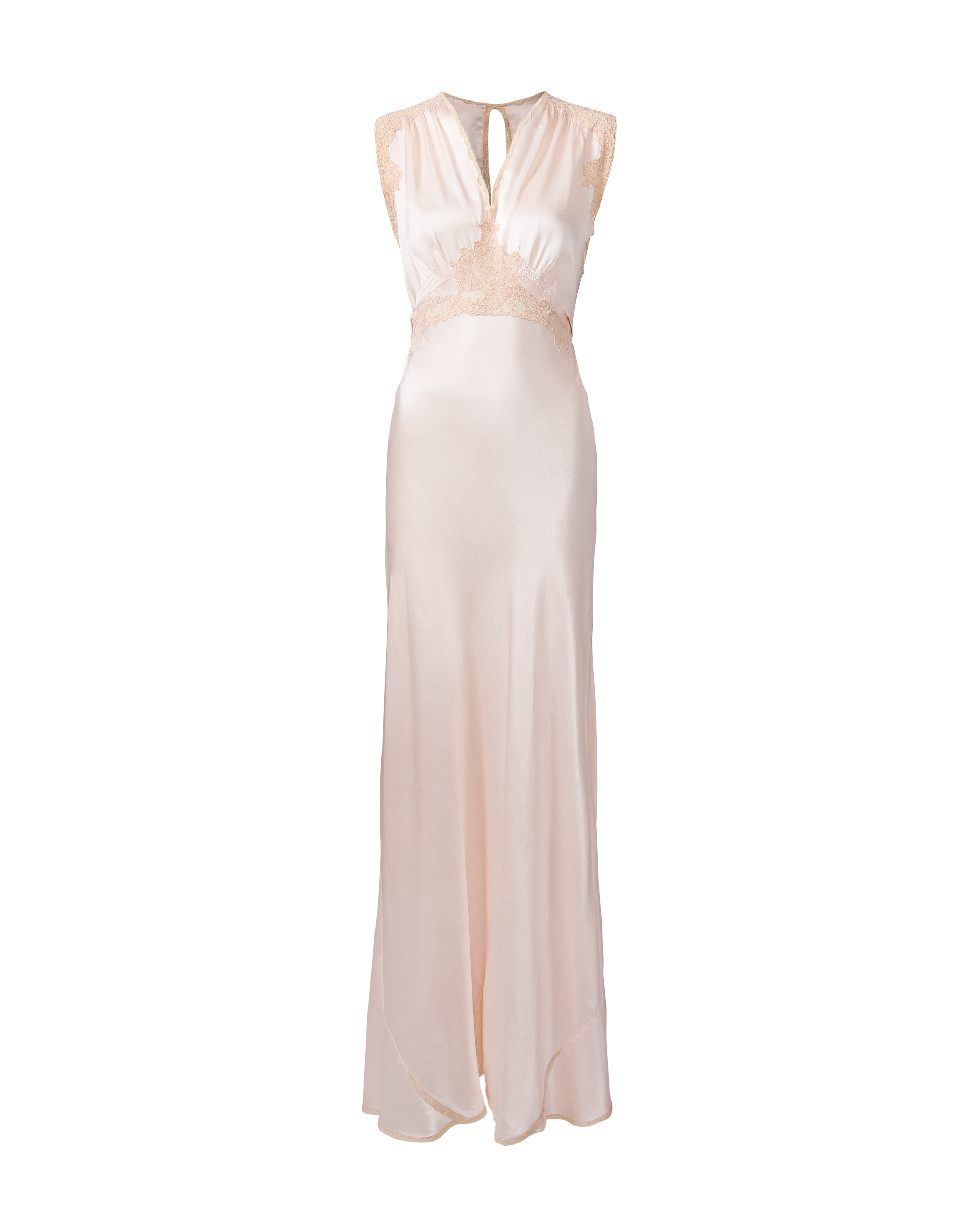 1930's Special Vintage very light pink slip gown with peach lace detailing. Sleeveless v-neck dress with contrasting semi-sheer dark peach / tan lace paneling at waist and trim. Bias cut dress with ribbon tie closures at back waist and small keyhole opening at back. Very slight center front slit. In very good vintage condition with light wear throughout consistent with age, including faint spotting at back shoulder (faintly visible when worn); has been taken to couture cleaner and arrives ready to wear.