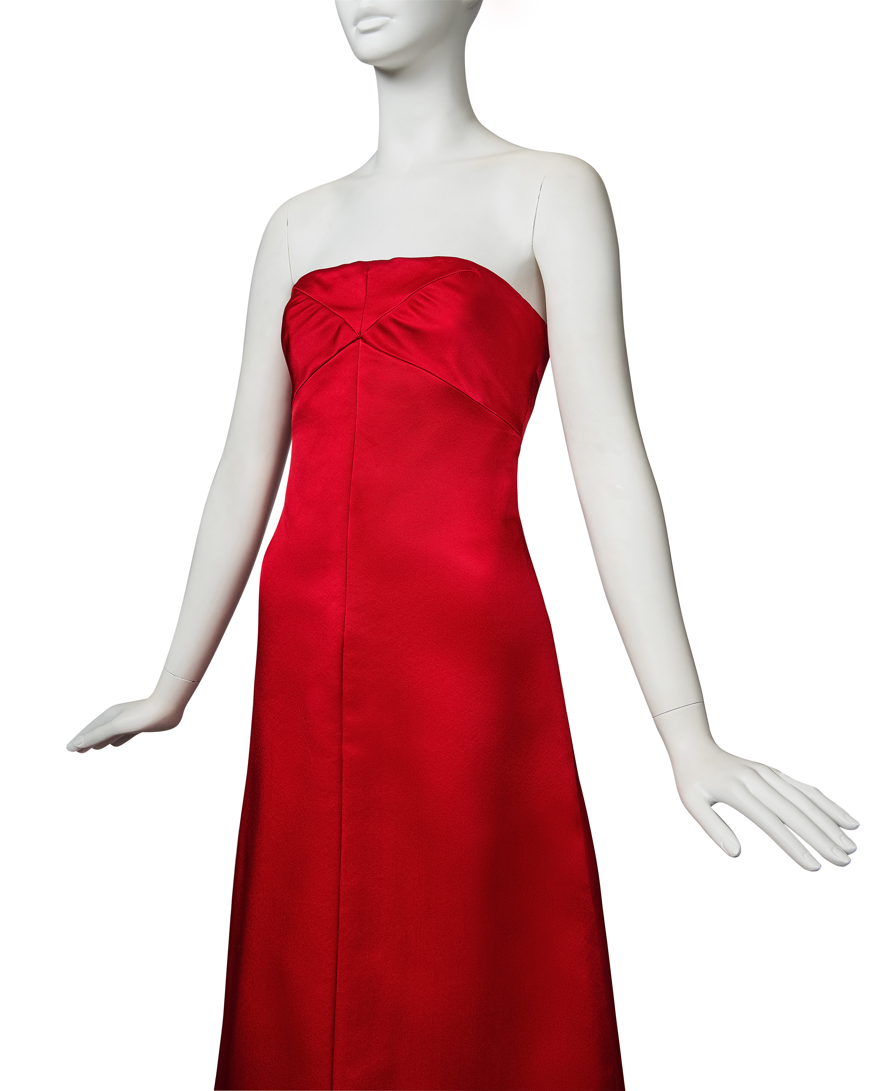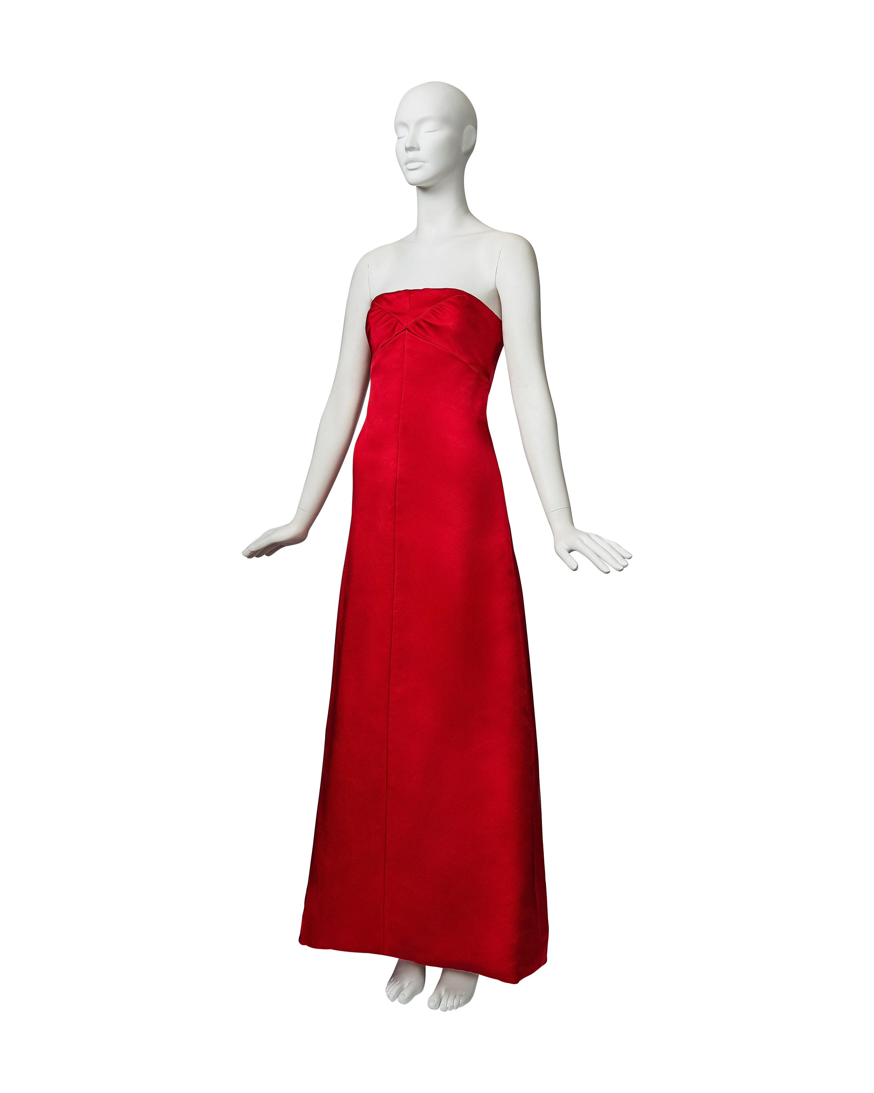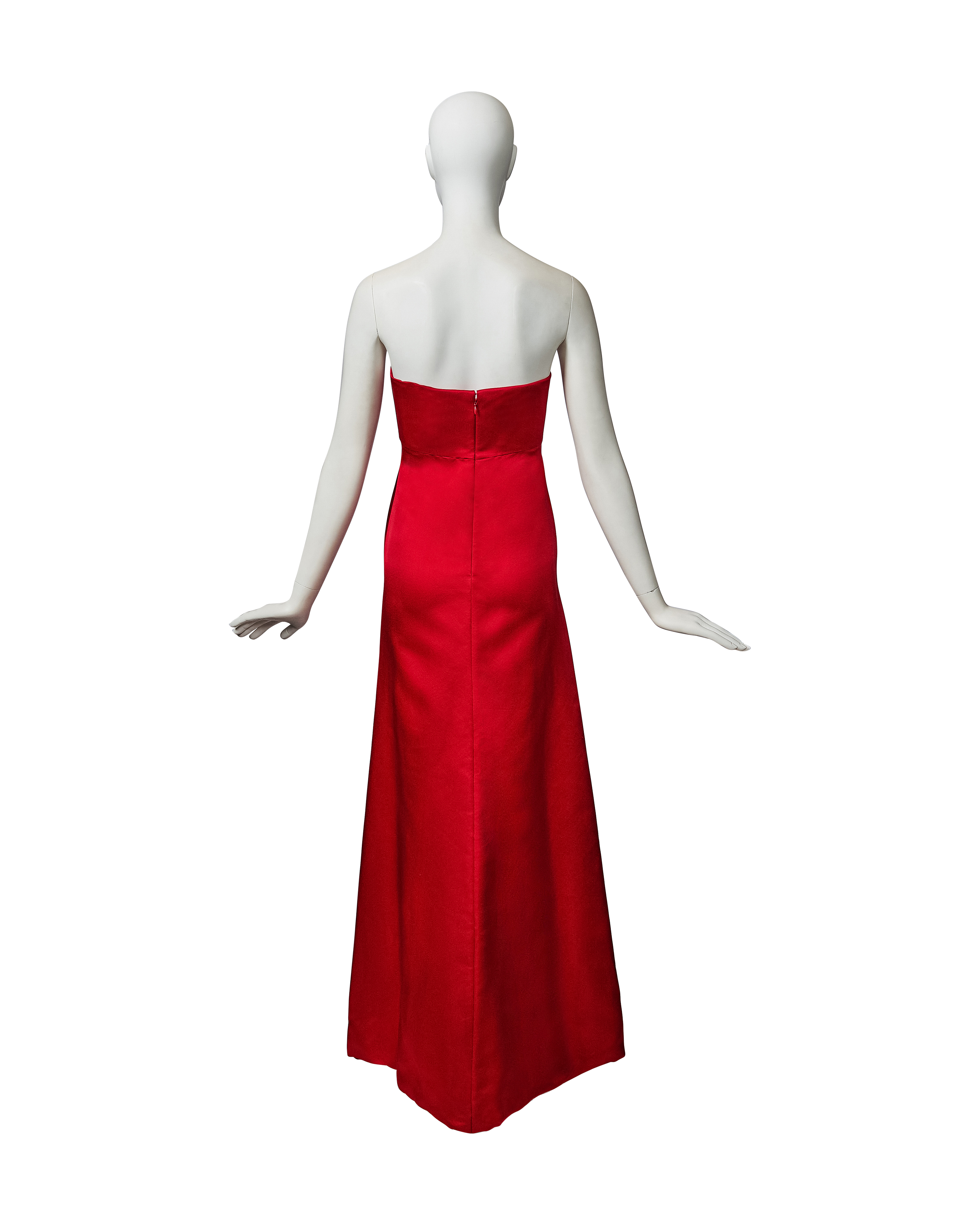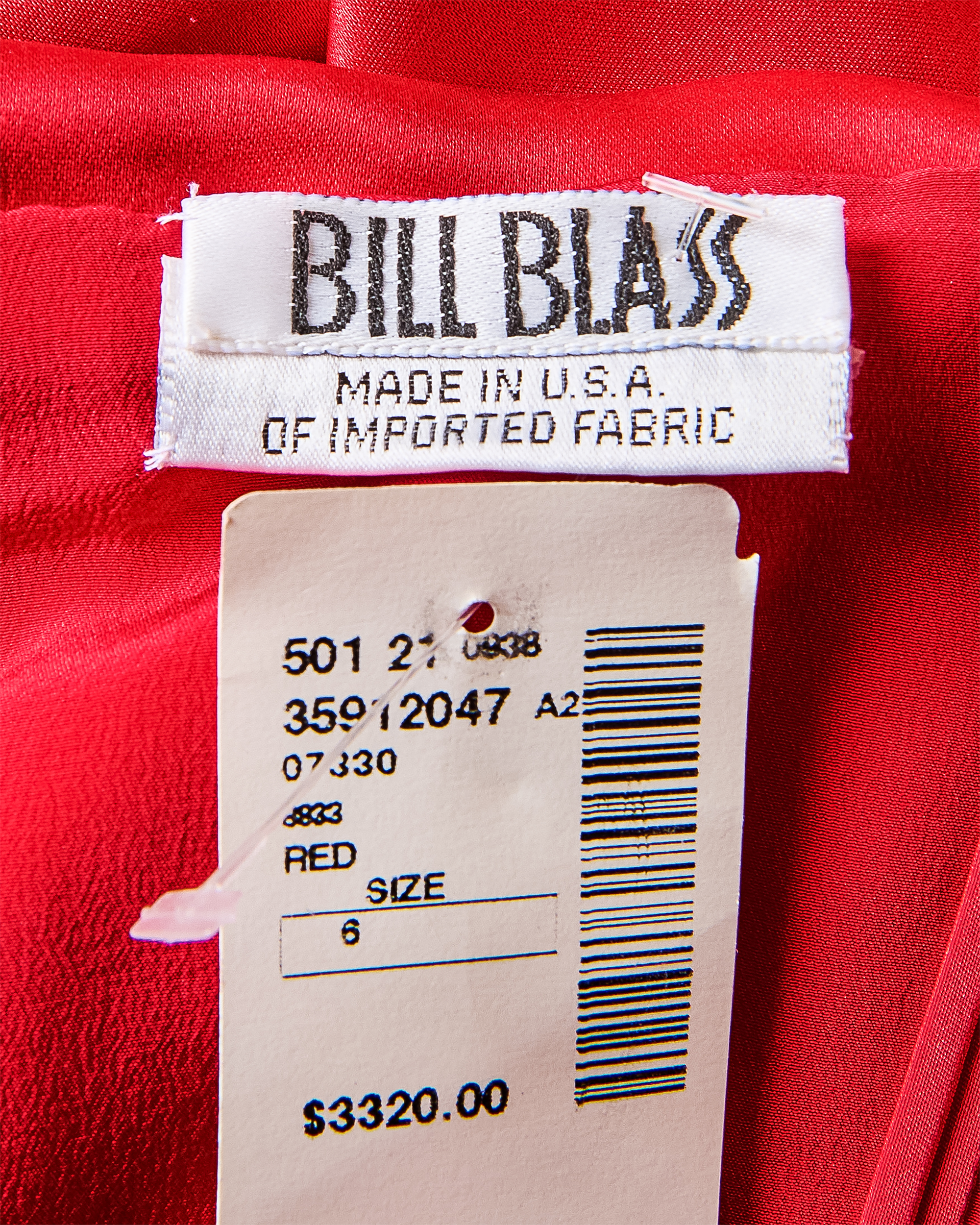 1970's Bill Blass cherry red strapless A-line gown. Features geometric curved paneling at bust and slight A-line silhouette. Concealed back zip closure and built-in corset with boning at sides. New with original brand tags (retailed for $3,320.00 originally). In very good vintage condition with light wear at hemline.