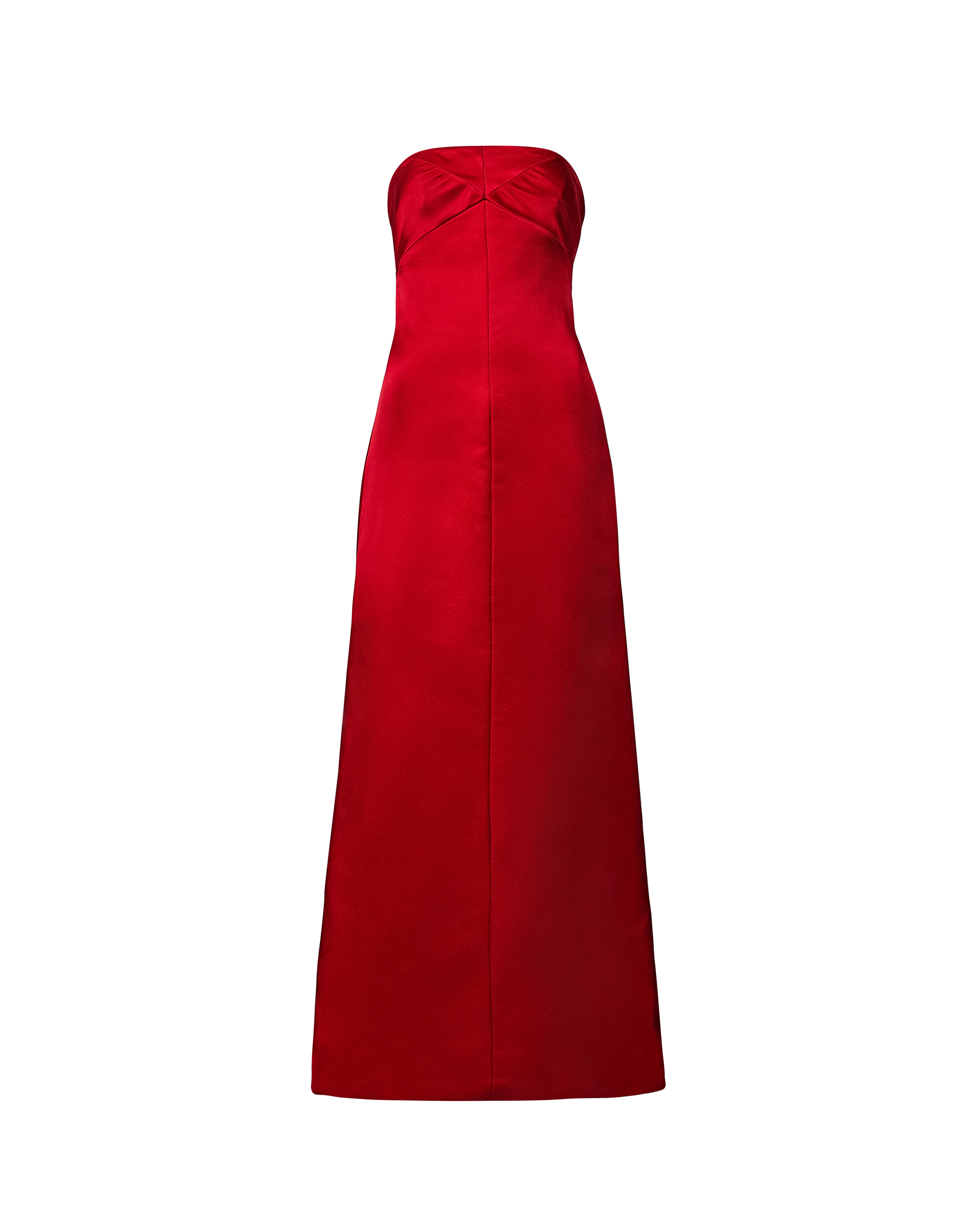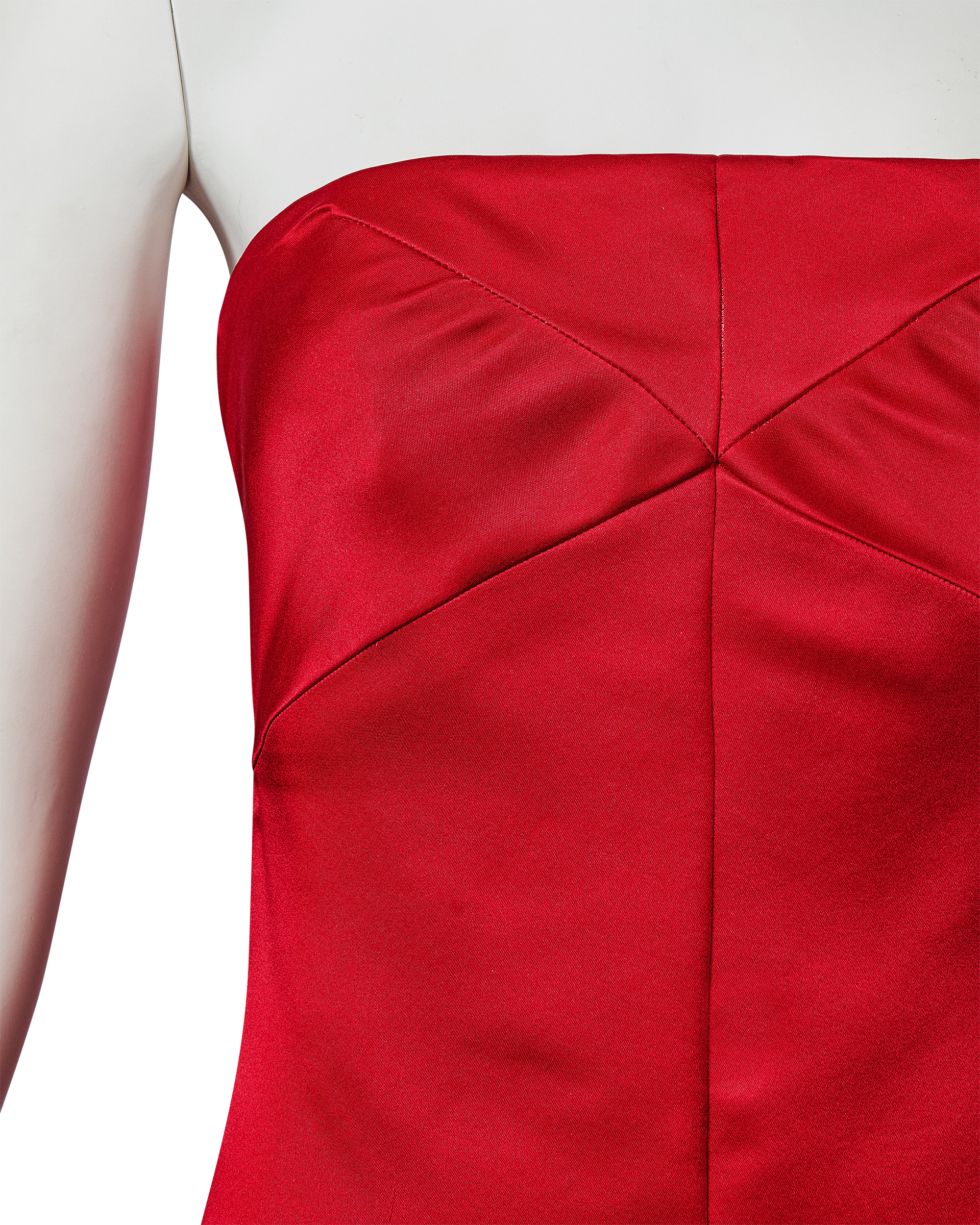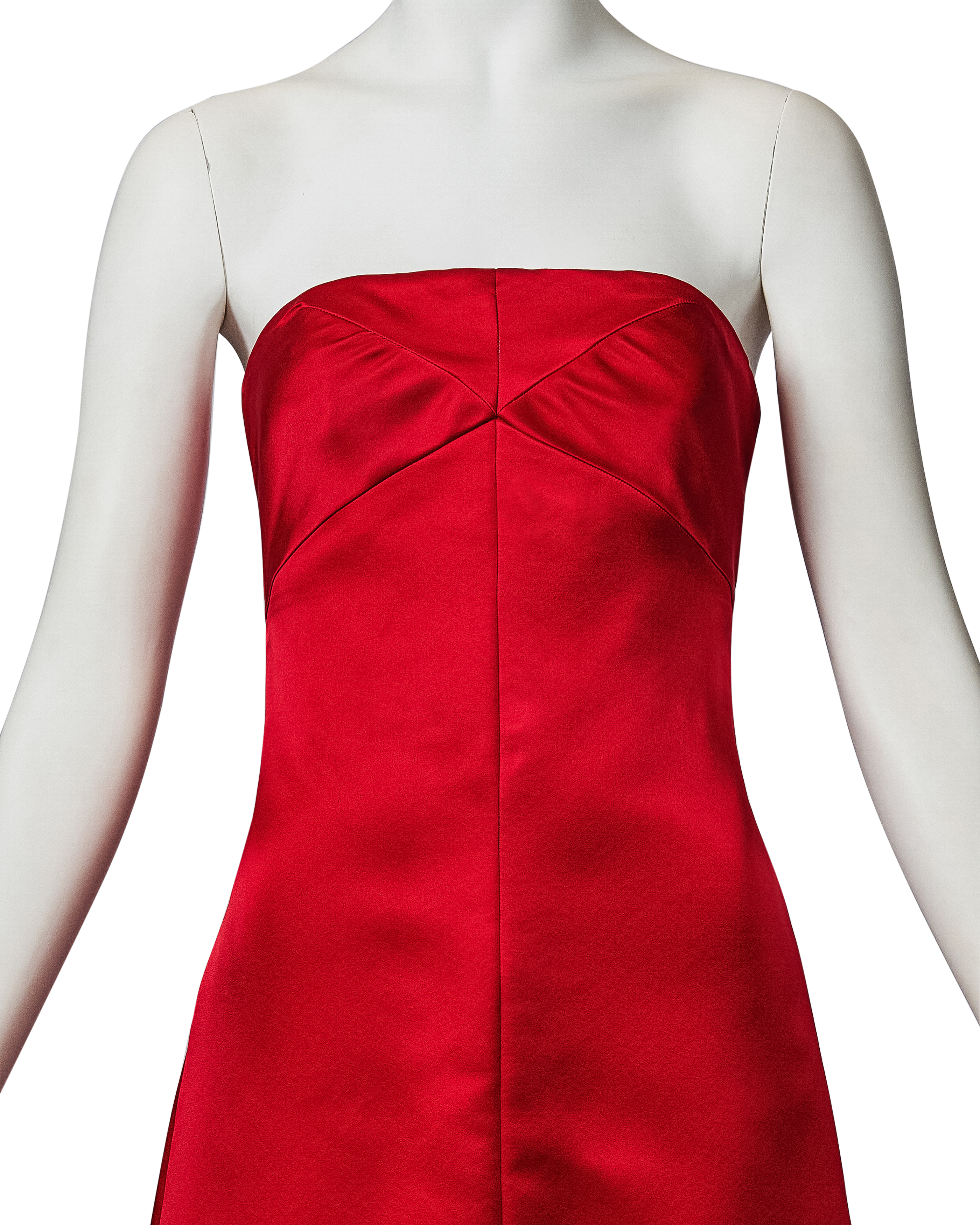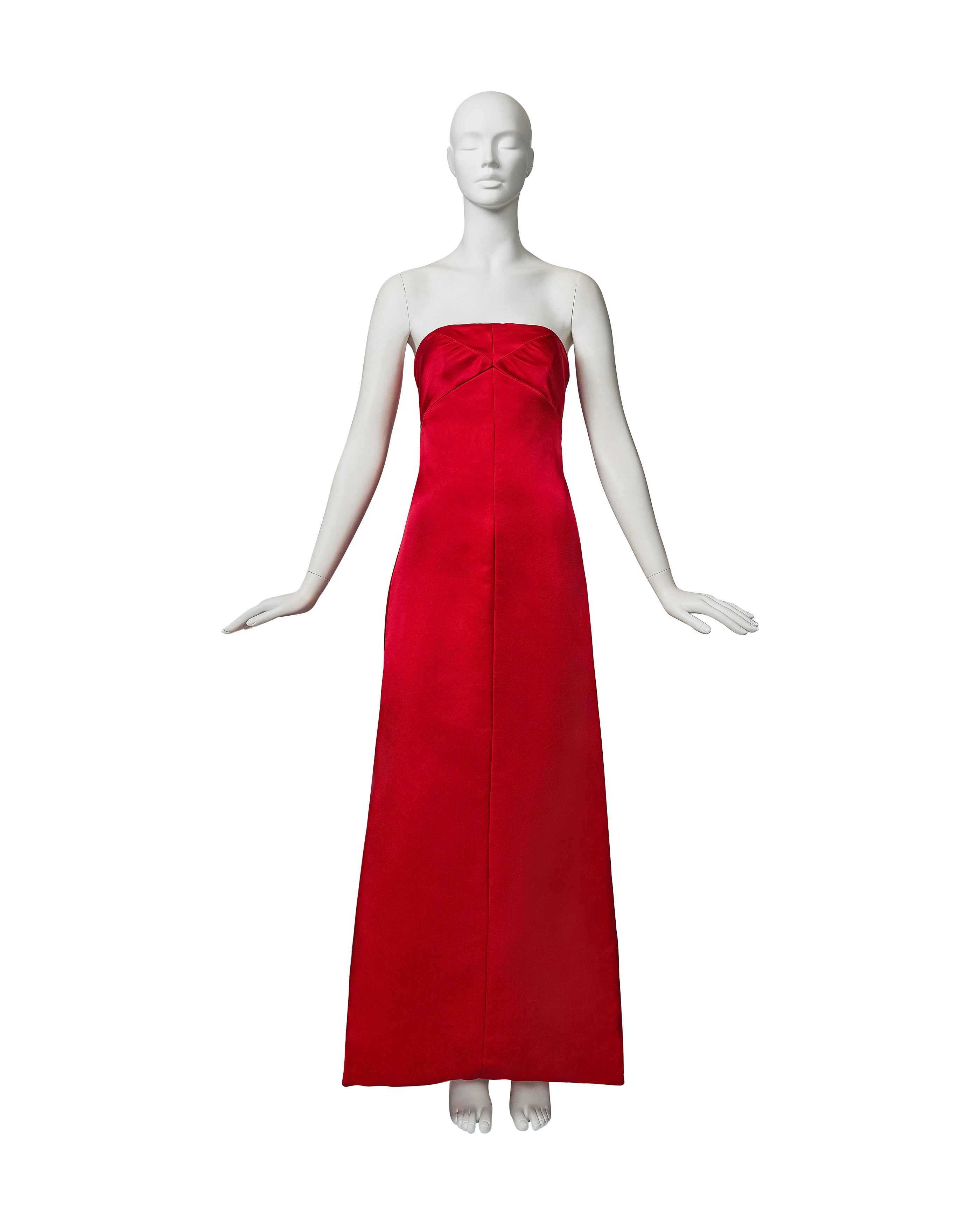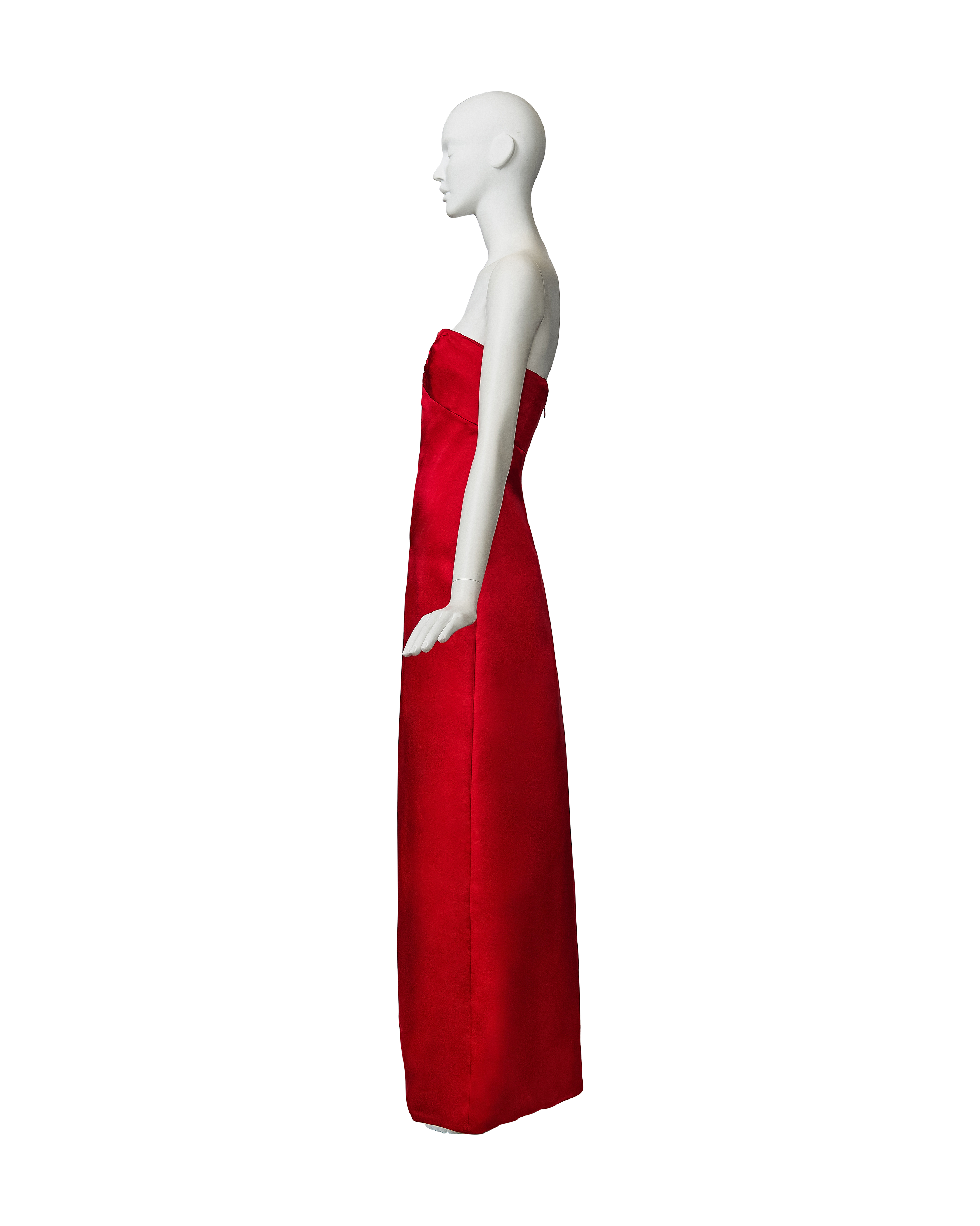 1970's Bill Blass cherry red strapless A-line gown. Features geometric curved paneling at bust and slight A-line silhouette. Concealed back zip closure and built-in corset with boning at sides. New with original brand tags (retailed for $3,320.00 originally). In very good vintage condition with light wear at hemline.