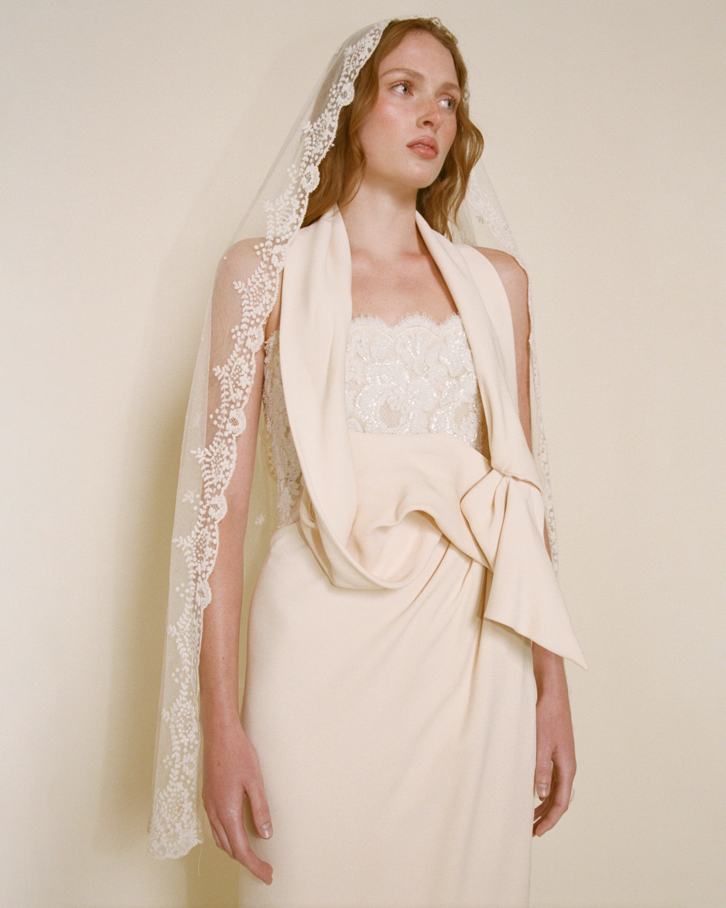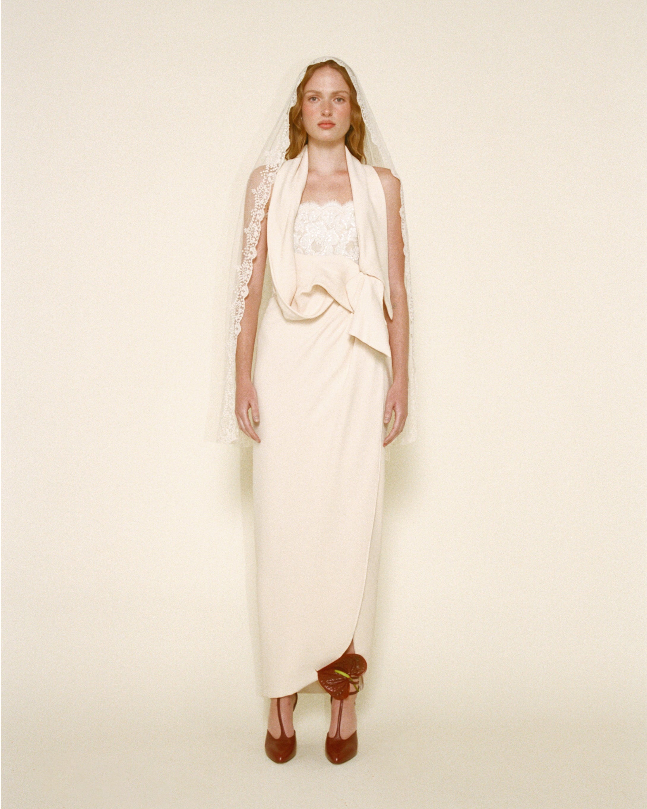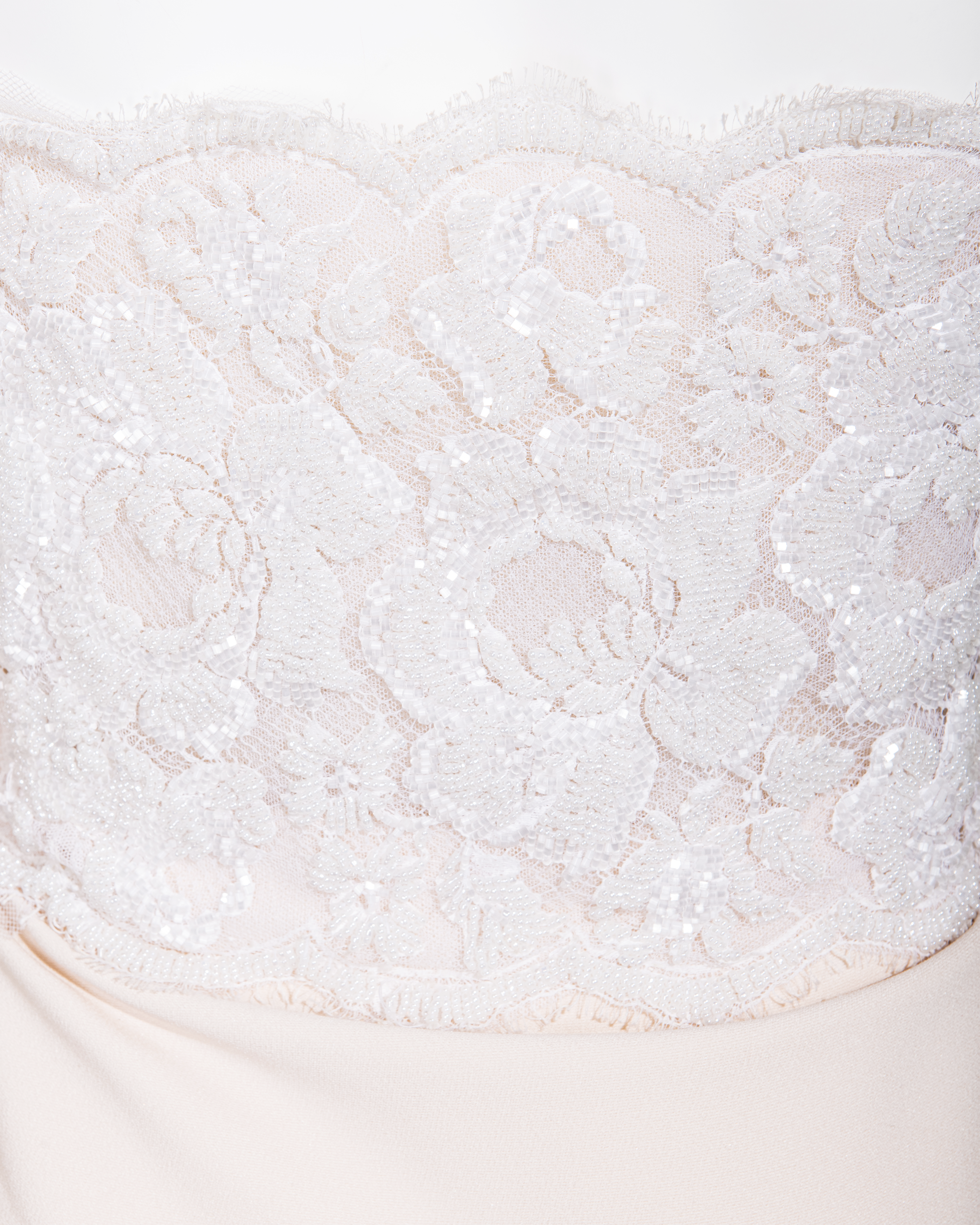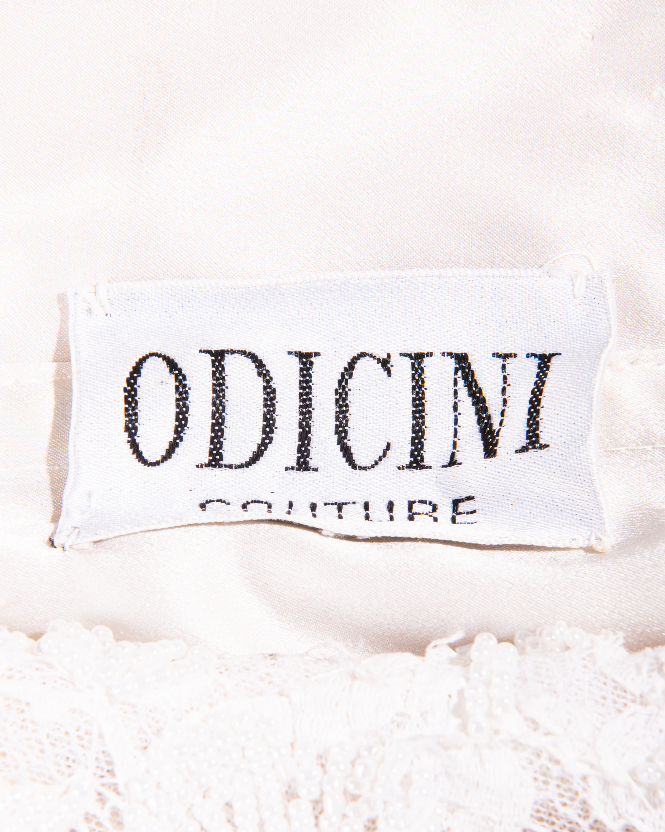1980's Odicini Haute Couture ecru floral embellished silk gown. Strapless embellished bustier upper featuring iridescent white floral pattern embellishments and lace trim, with draped collar and semi-open front wrap skirt with side button and hook-and-eye closures. Built-in corset with boning and internal snap closures layered underneath waist. In very good vintage condition with light wear throughout; has been taken to couture cleaner and arrives ready to wear.