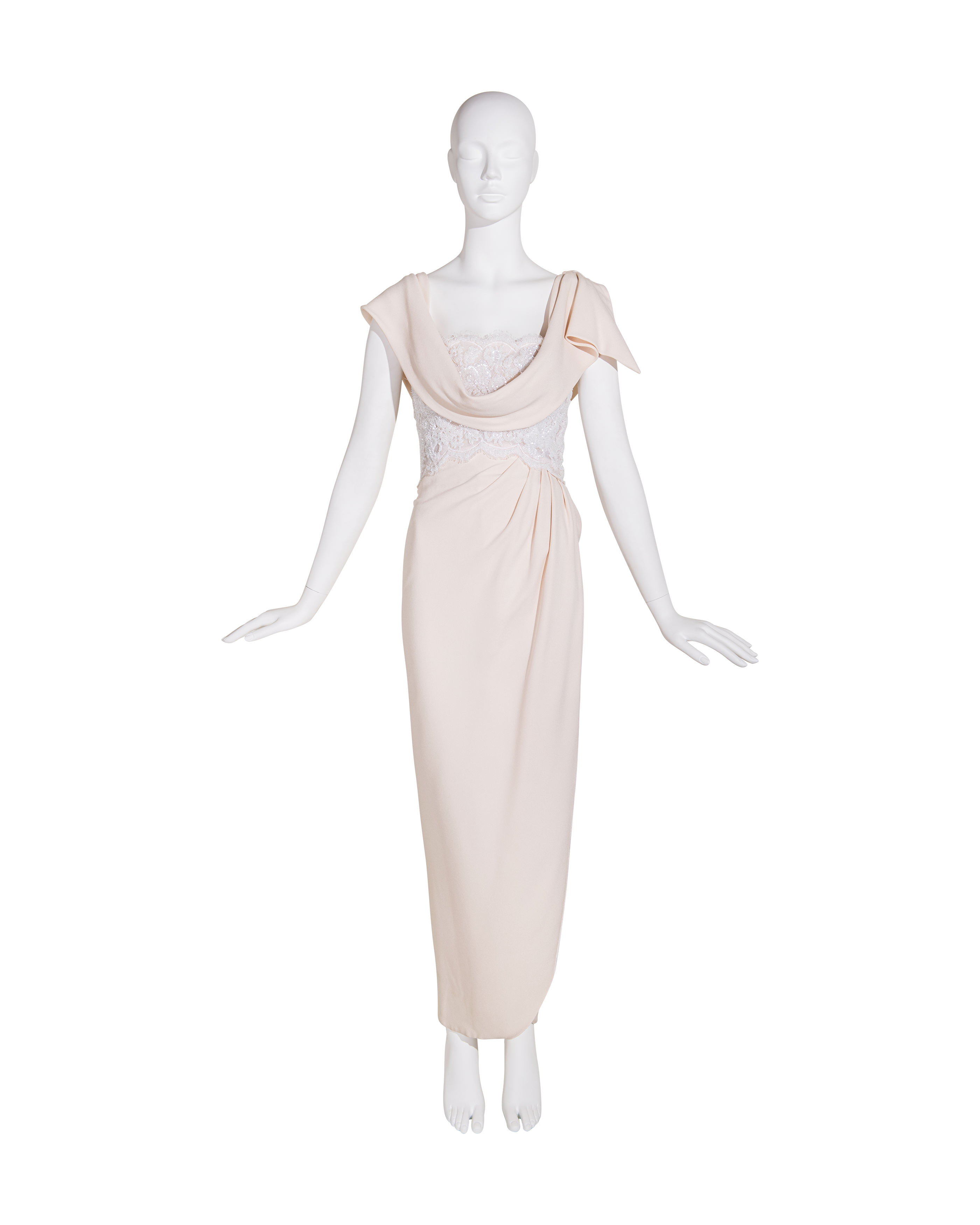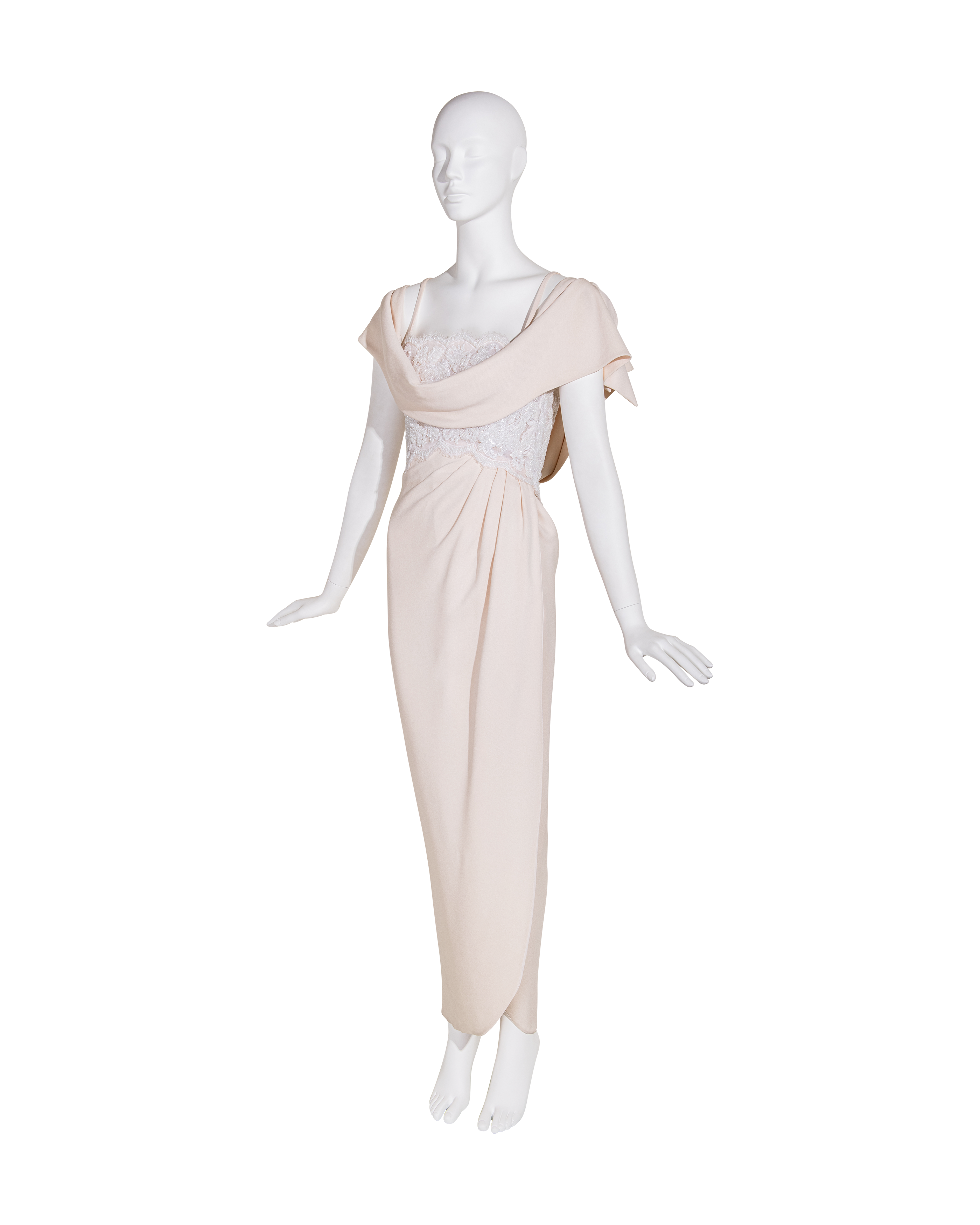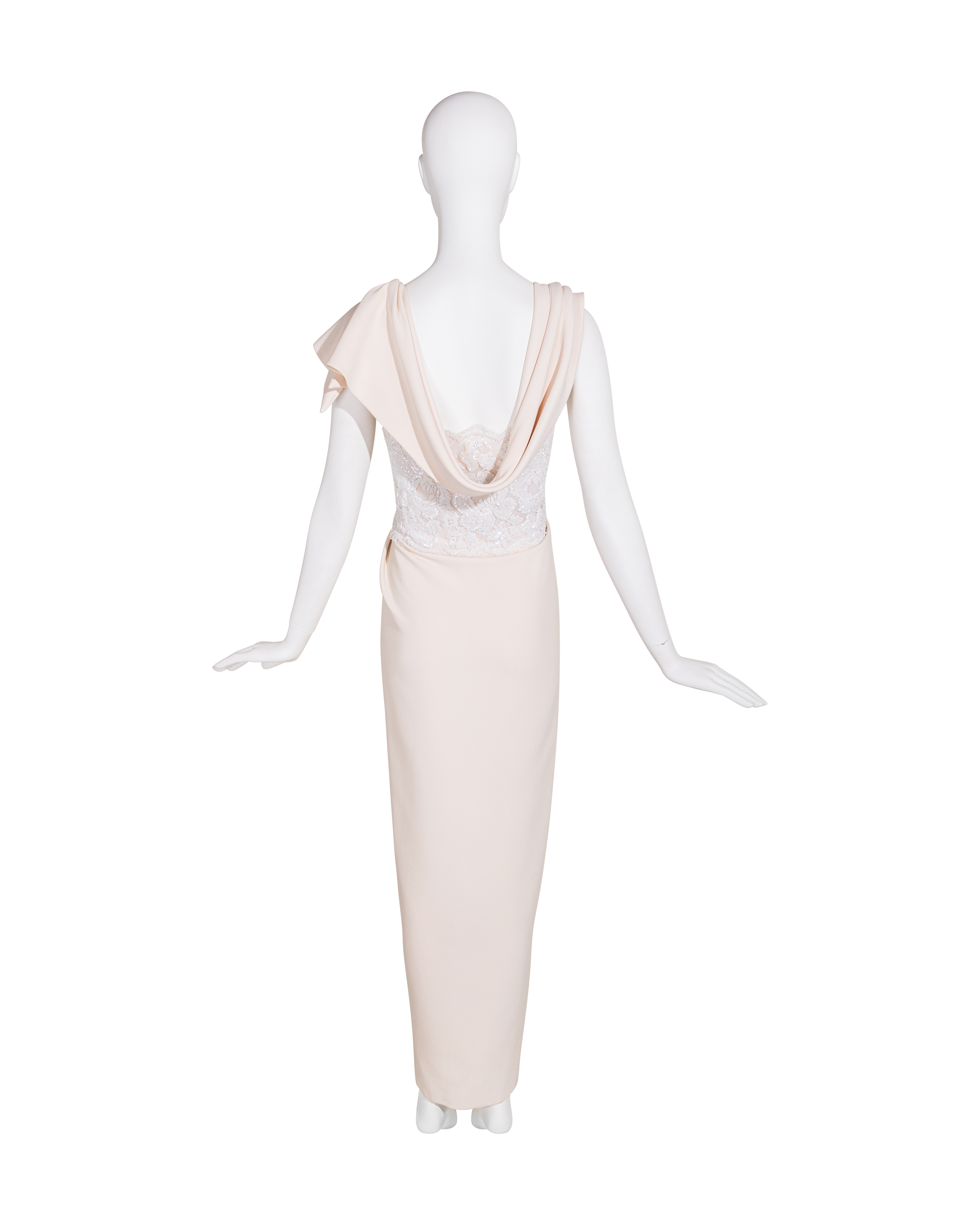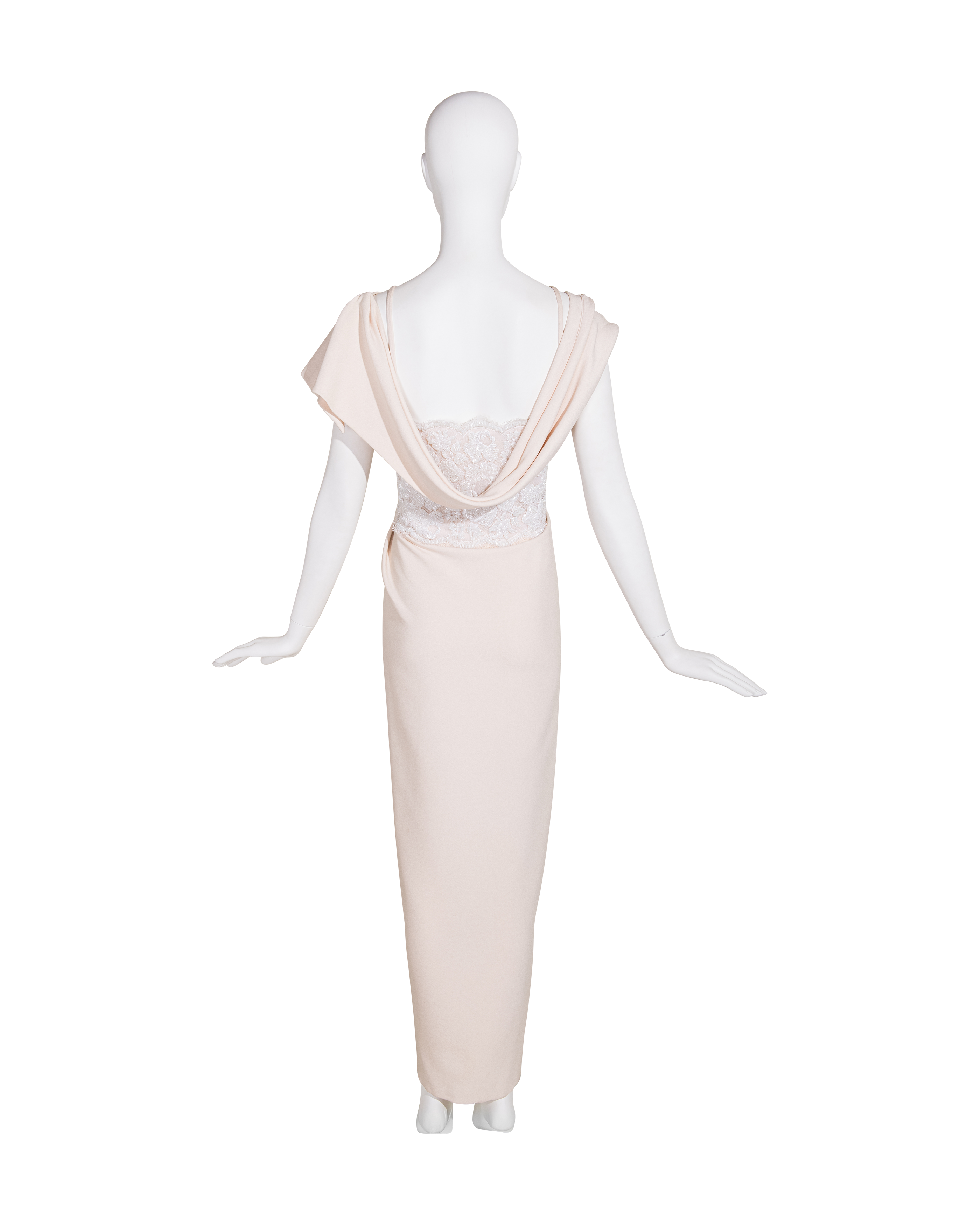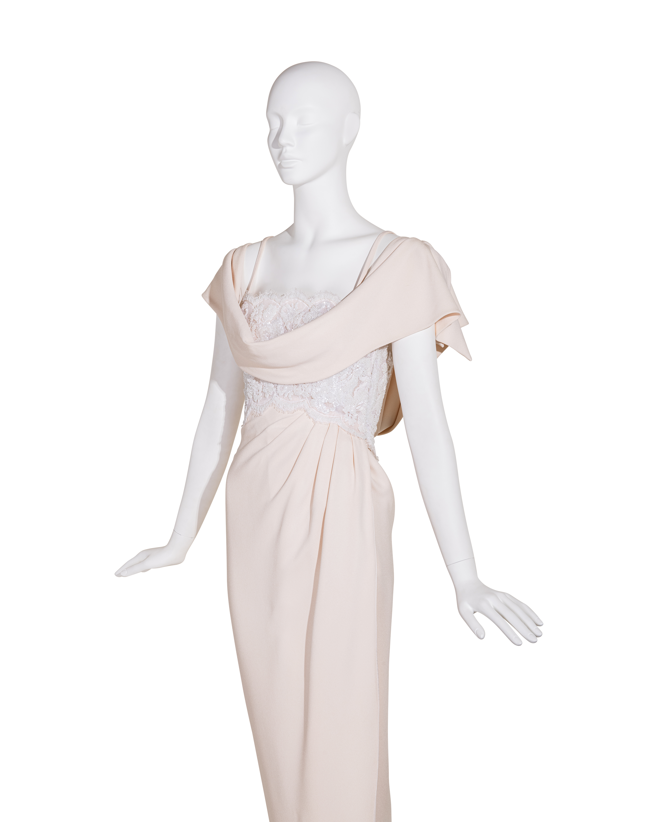 1980's Haute Couture Ecru Floral Embroidered Silk Gown